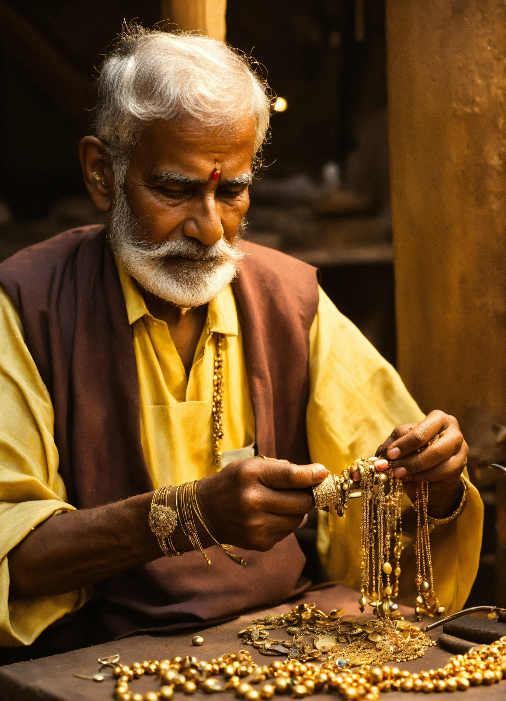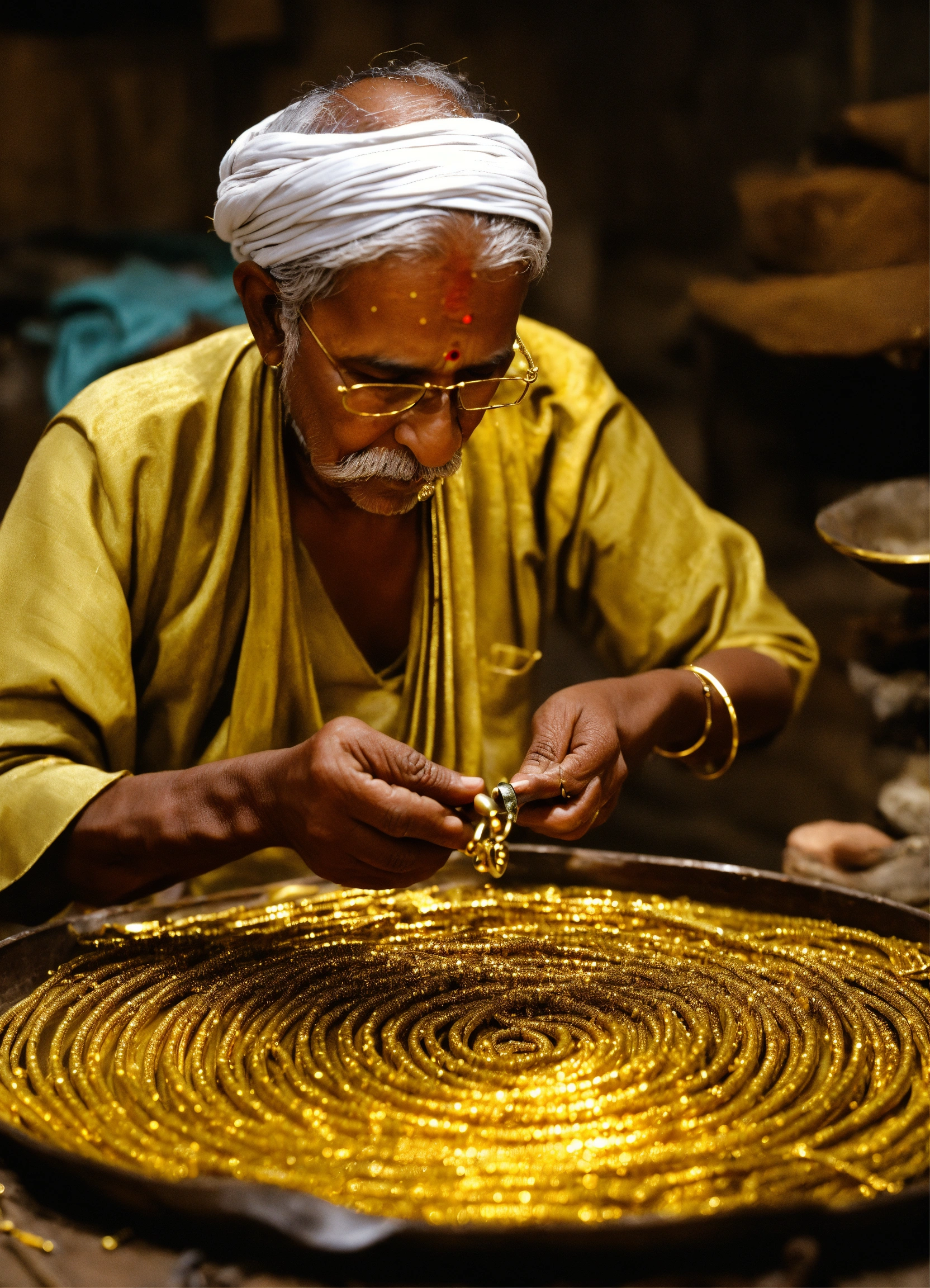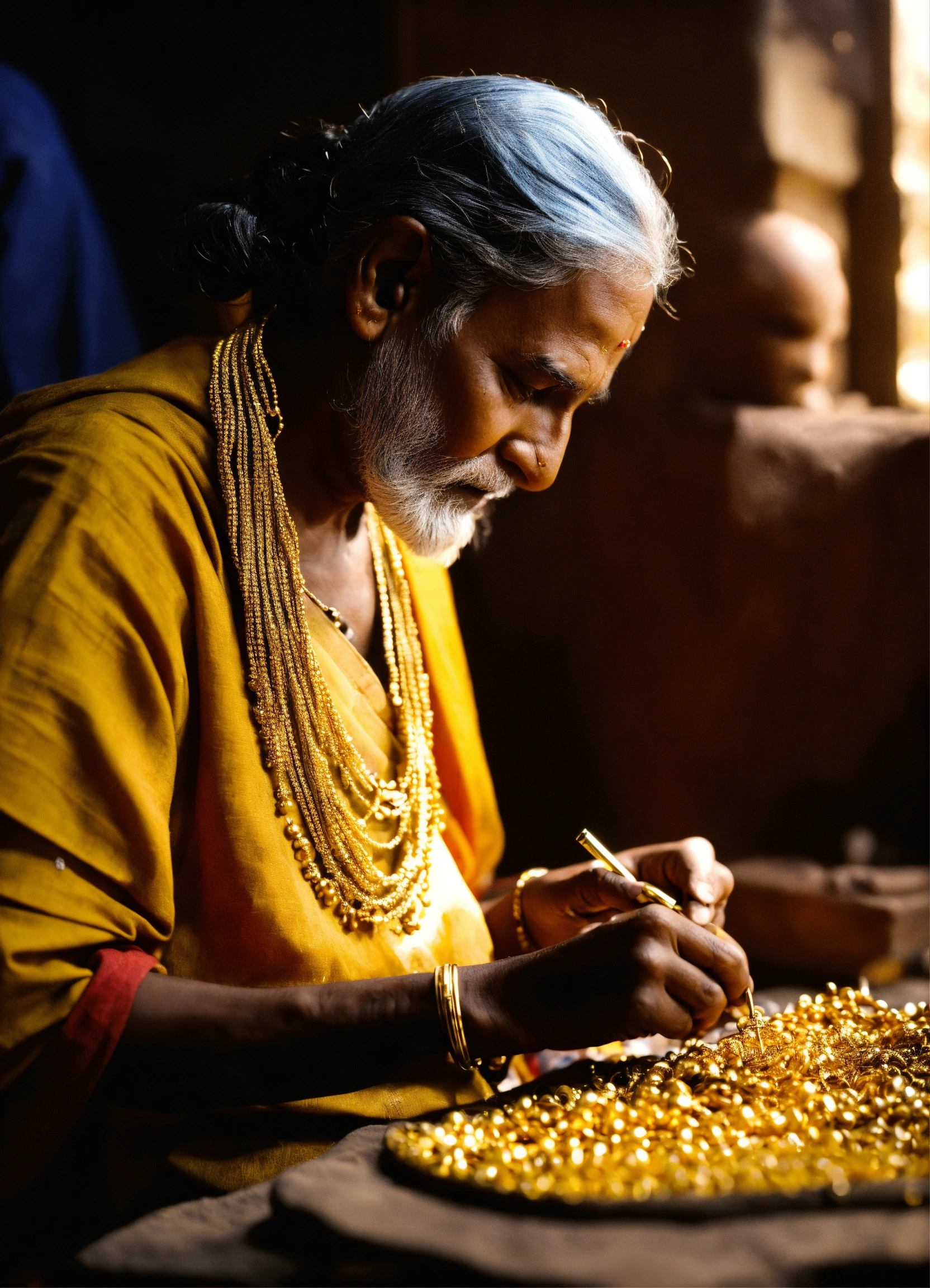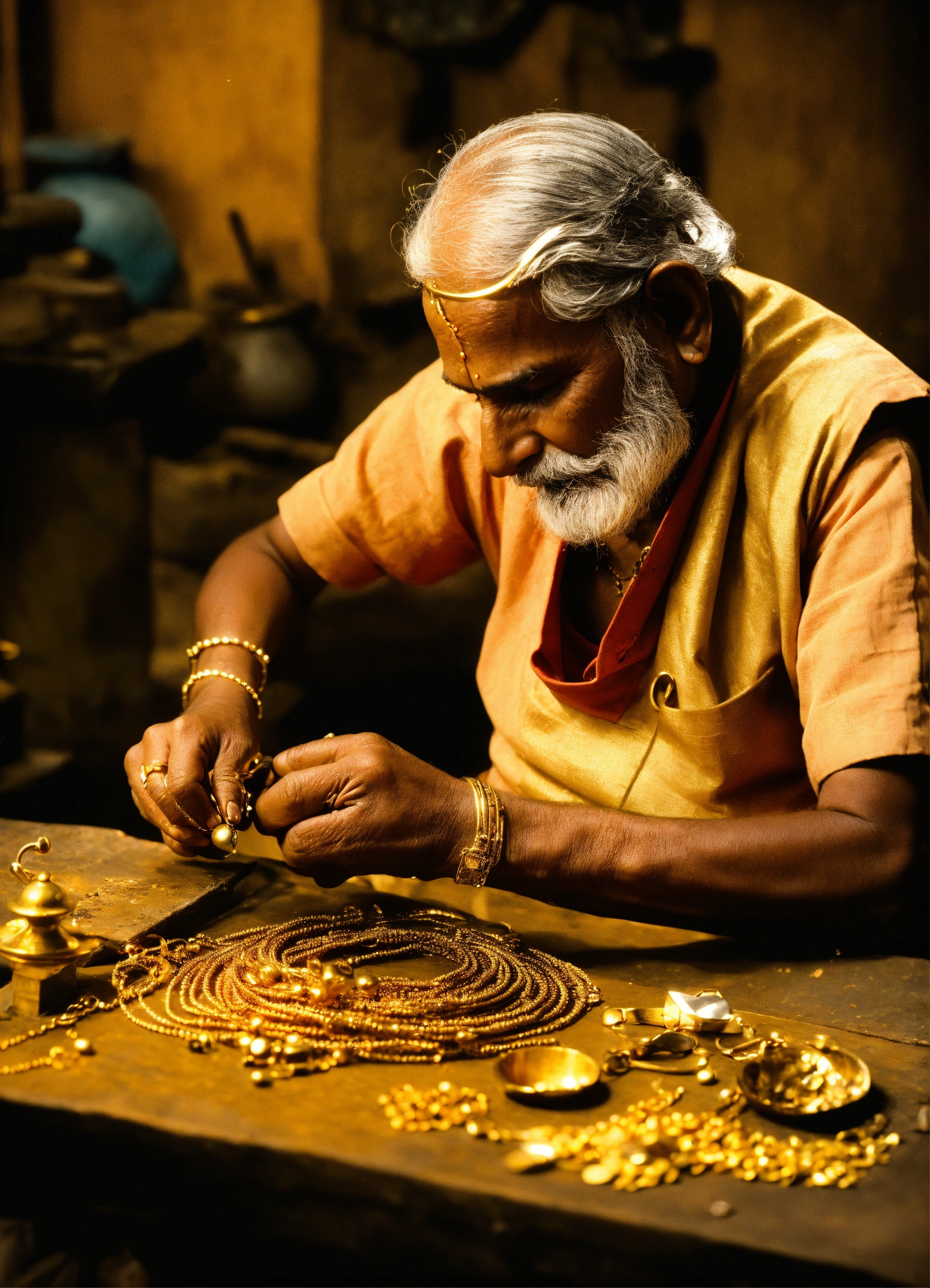 Old goldsmith of india working to make golden jewellery from medieval age