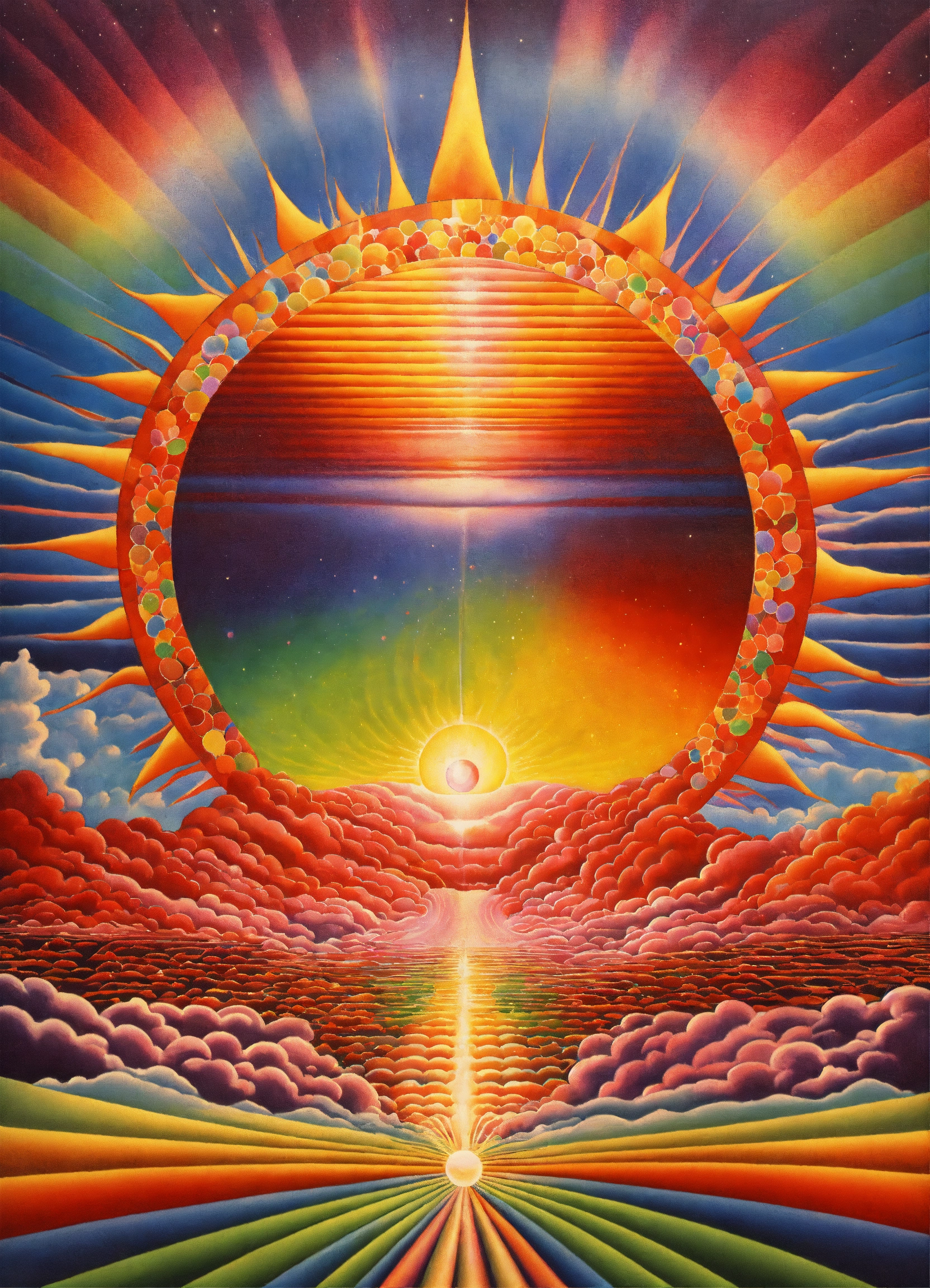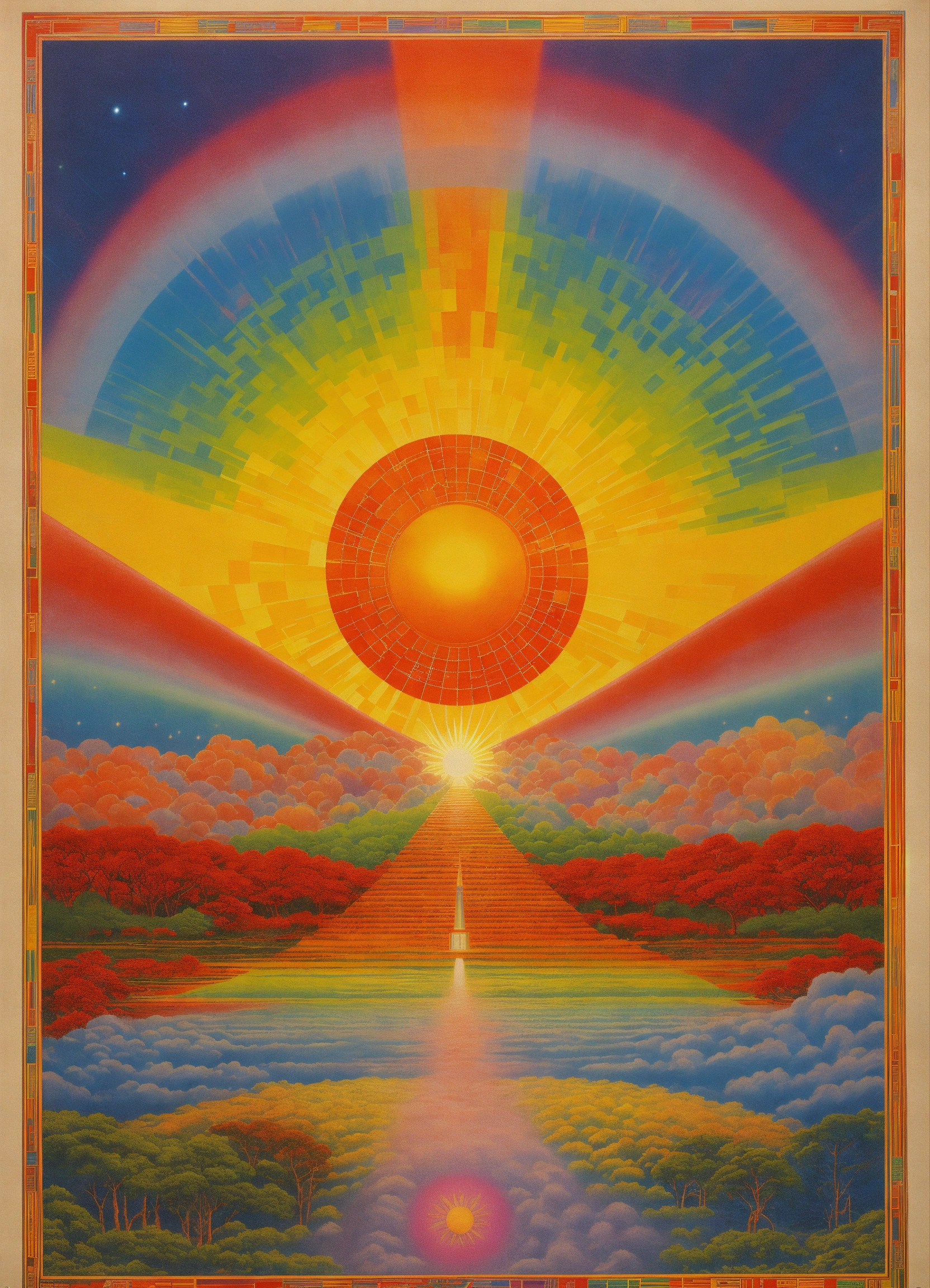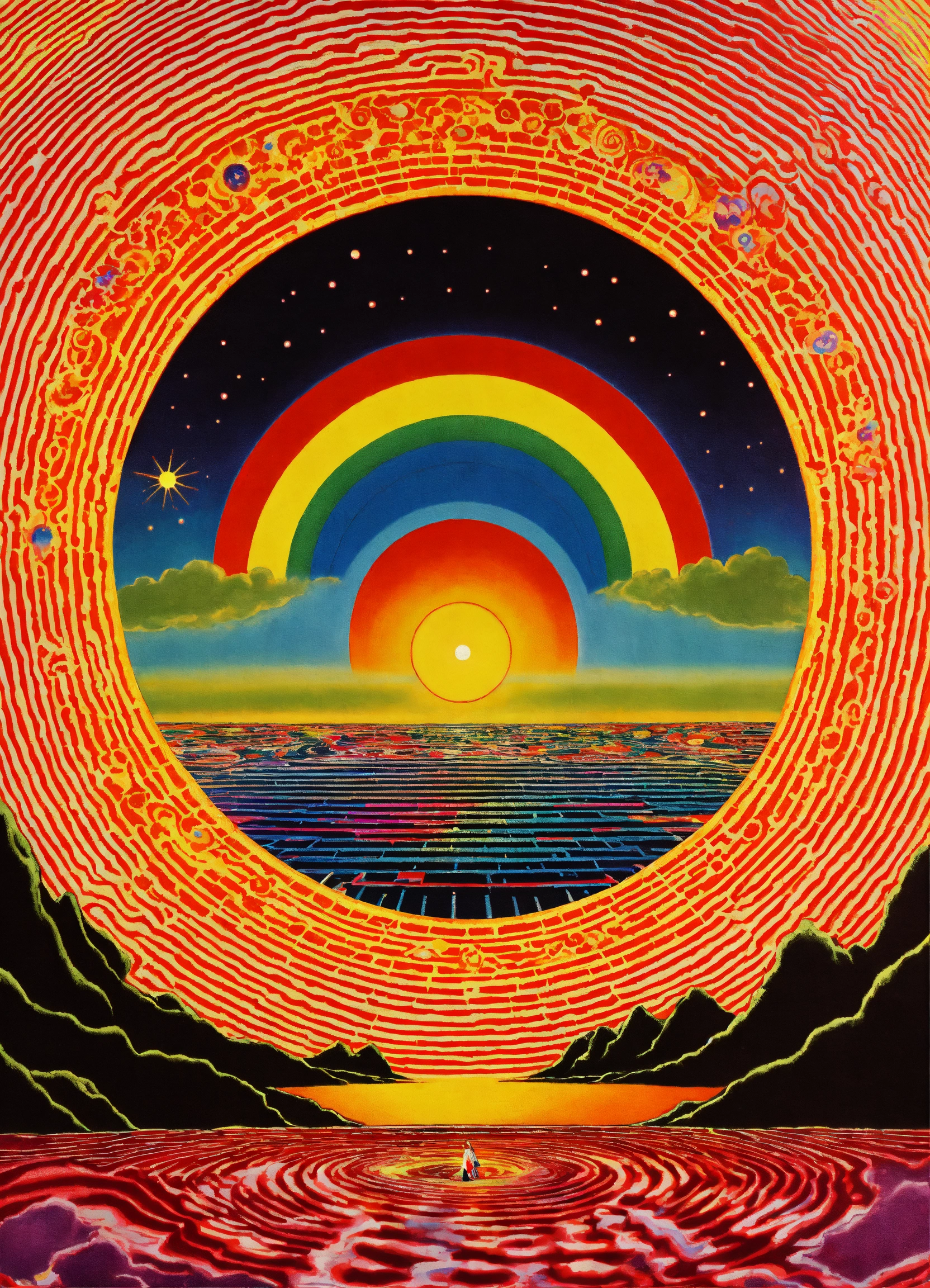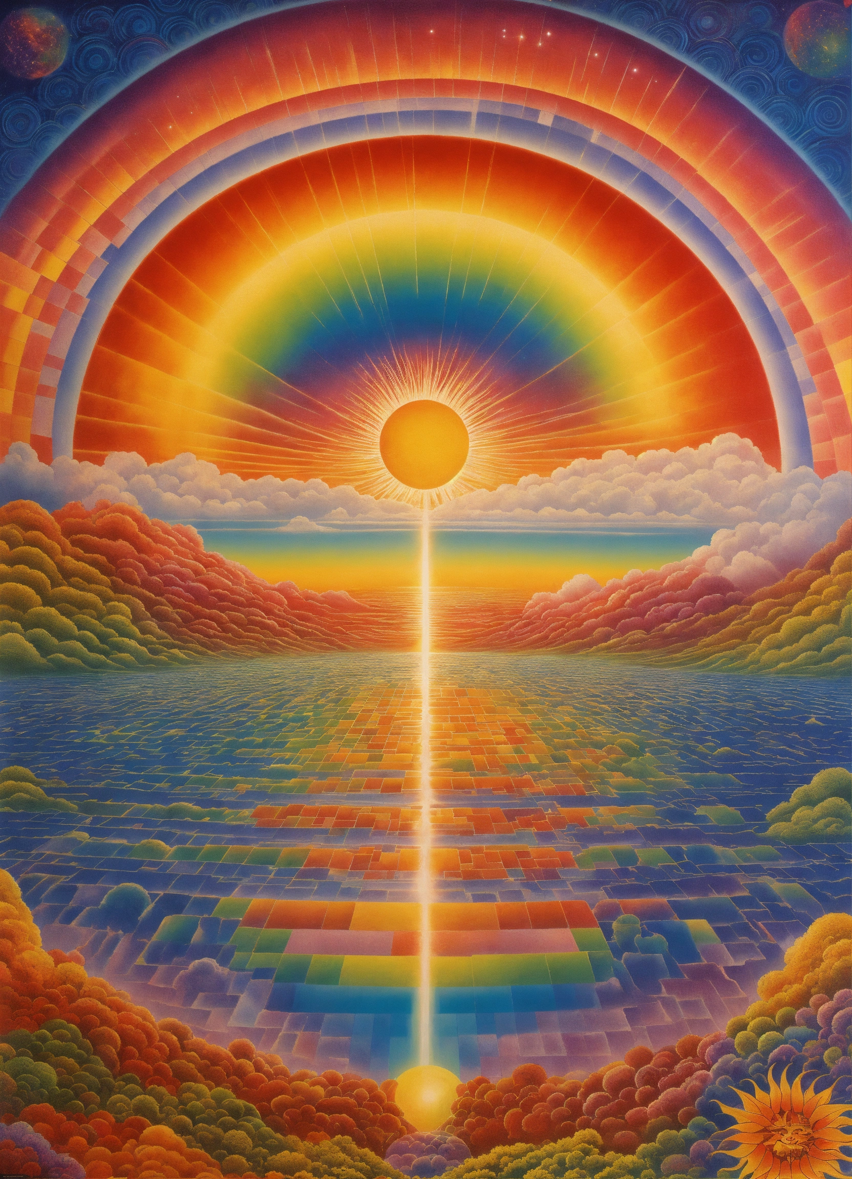 Japanese vintage poster, oriental, gigantic rainbow sun, dream dimension, psychedelic, nebula, cosmic frontier, rainbow checkerboard patterns by alex grey
