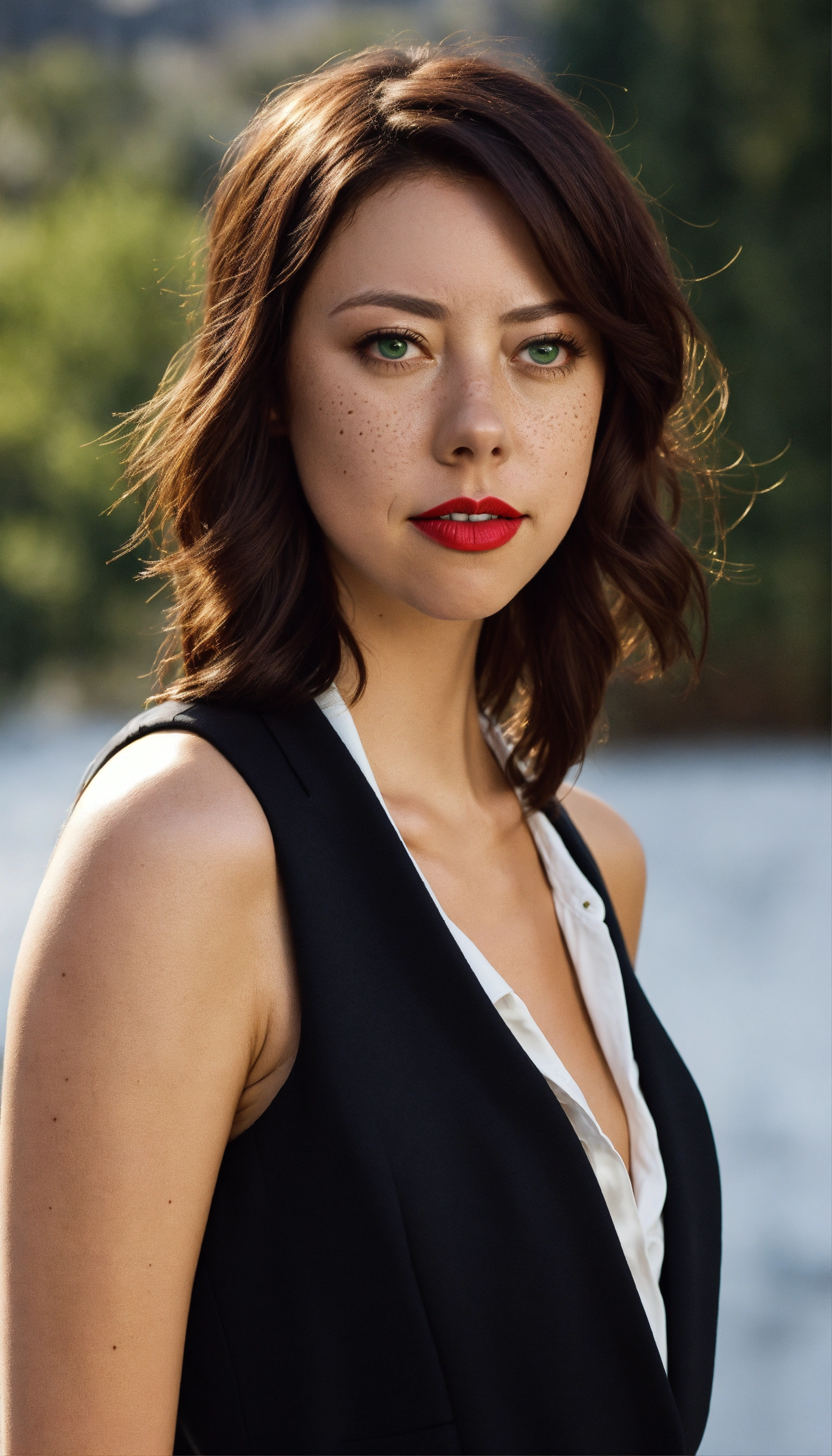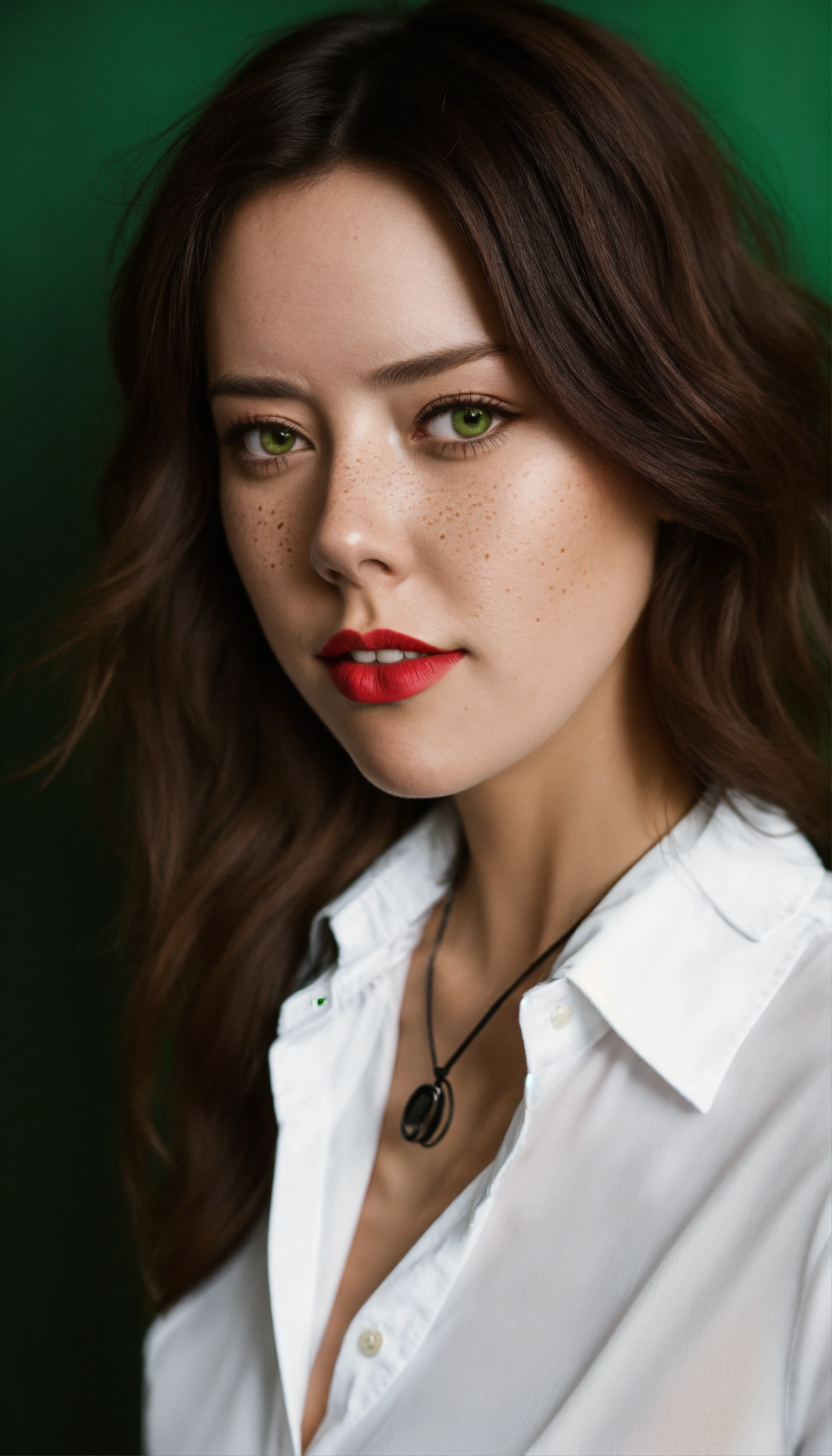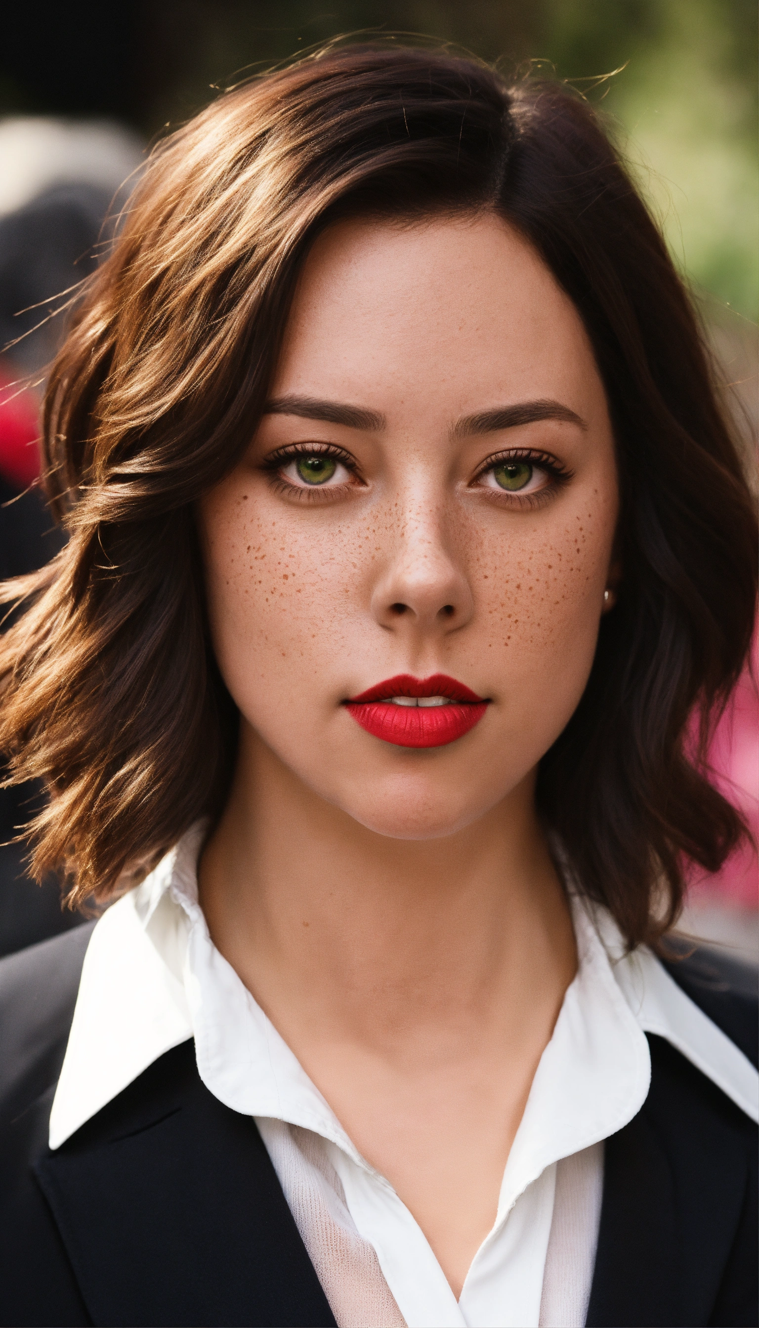 Aubrey plaza photographic portrait of a woman with neck lengthened, untied dark red hair, greater bust, tight shirt, wide bust, she has green eyes, freckles on her face and red lipstick, form-fitting, curve-hugging, snug, tailored, close-cut, sculpted, defined, pronounced curves, shapely, casual, relaxed, laid-back, undone, informal, nonchalant, easygoing, disheveled, carefree, unbuttoned, unstructured, effortless, she wears a black suit jacket with a white shirt and black tie. her head is triangle shaped, preppy, elite, well-dressed, polished, sophisticated, form-fitting shirt, stylish, prestigious, private school attire, layered, hosiery, affluent, knee-high socks, upscale, traditional