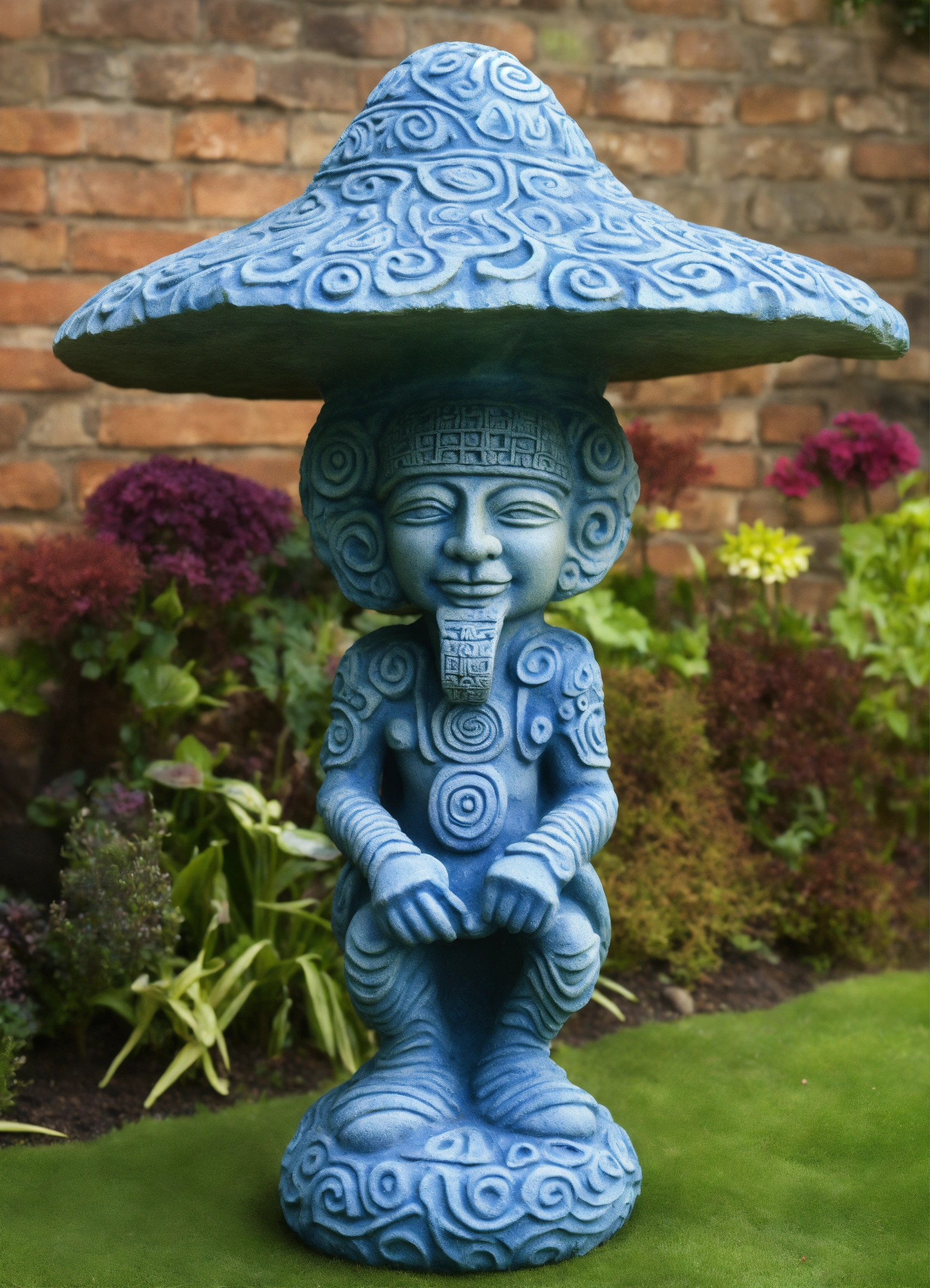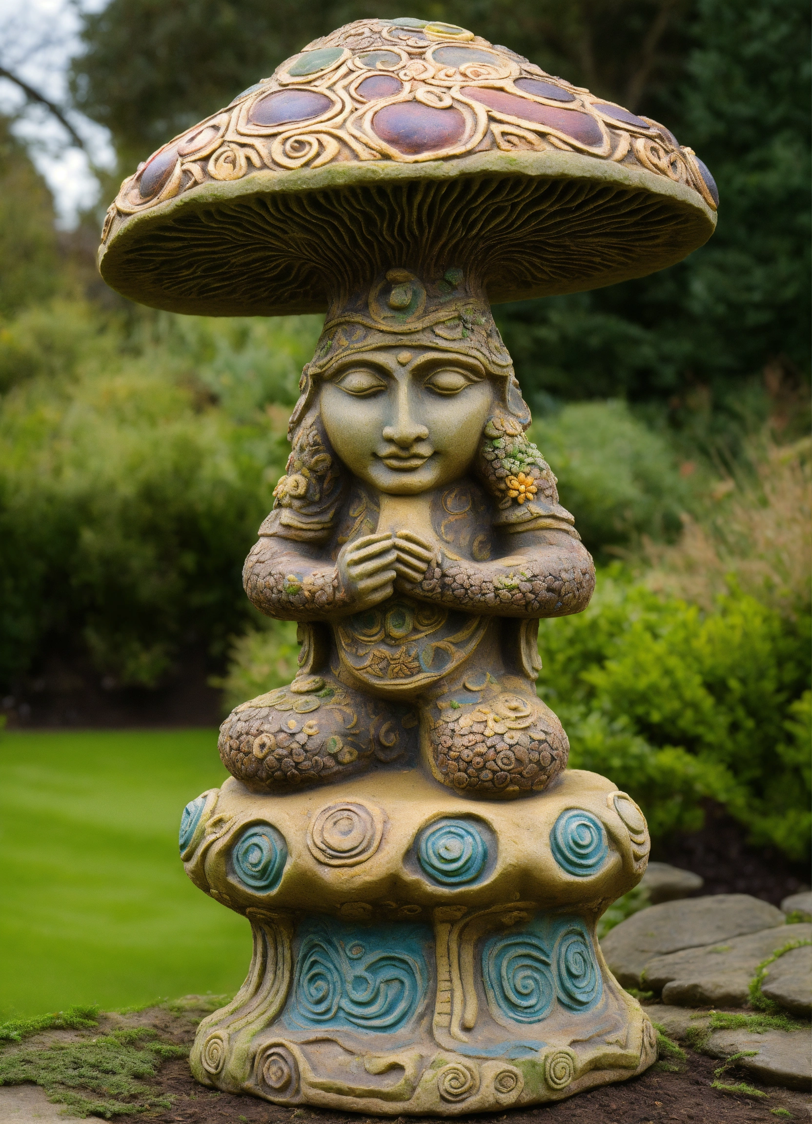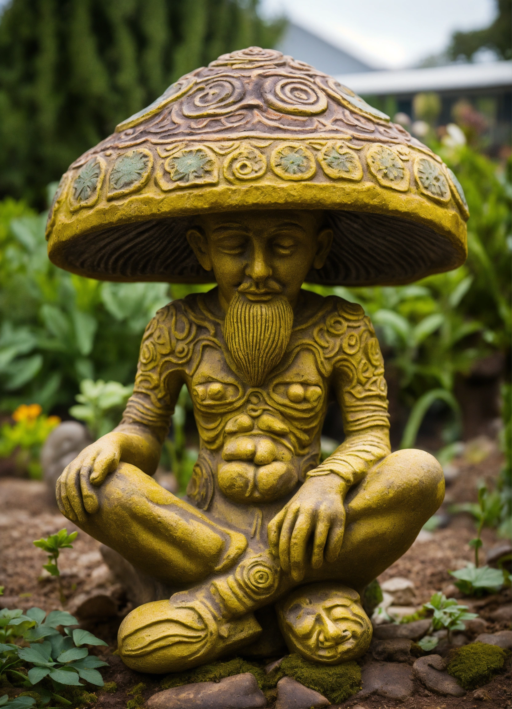 Ancient stone mushroom man deity sculpted garden ornament in the style of alex grey