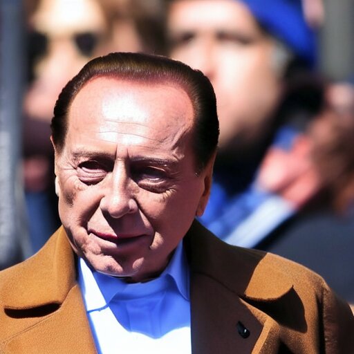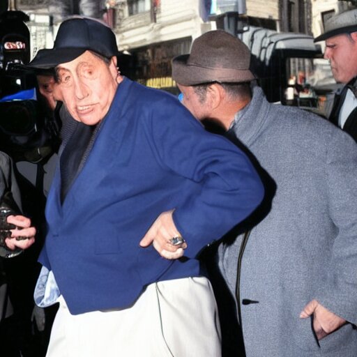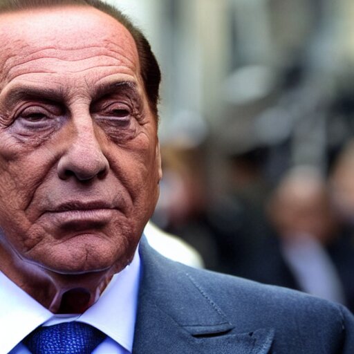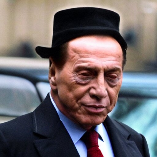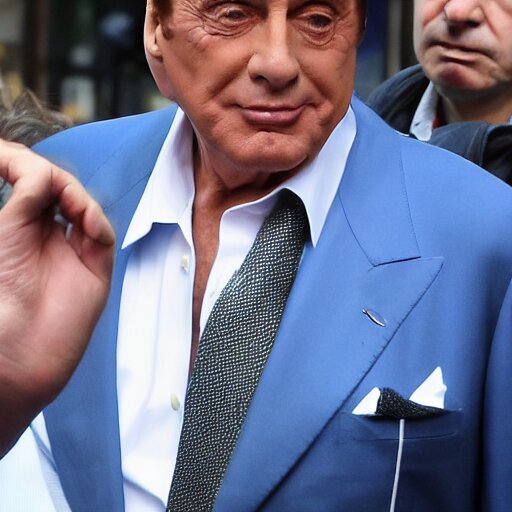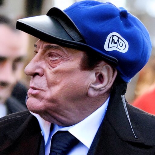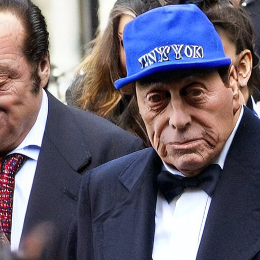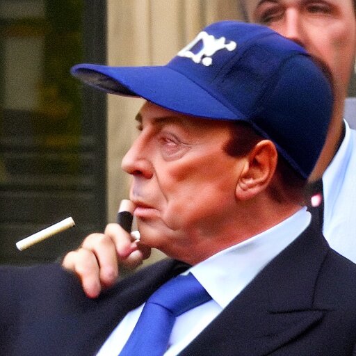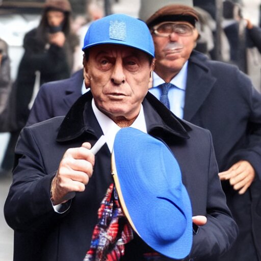 Silvio berlusconi with a blue ny hat and 16 cigarettes in his eyes, photo, paparazzi, hd, high quality