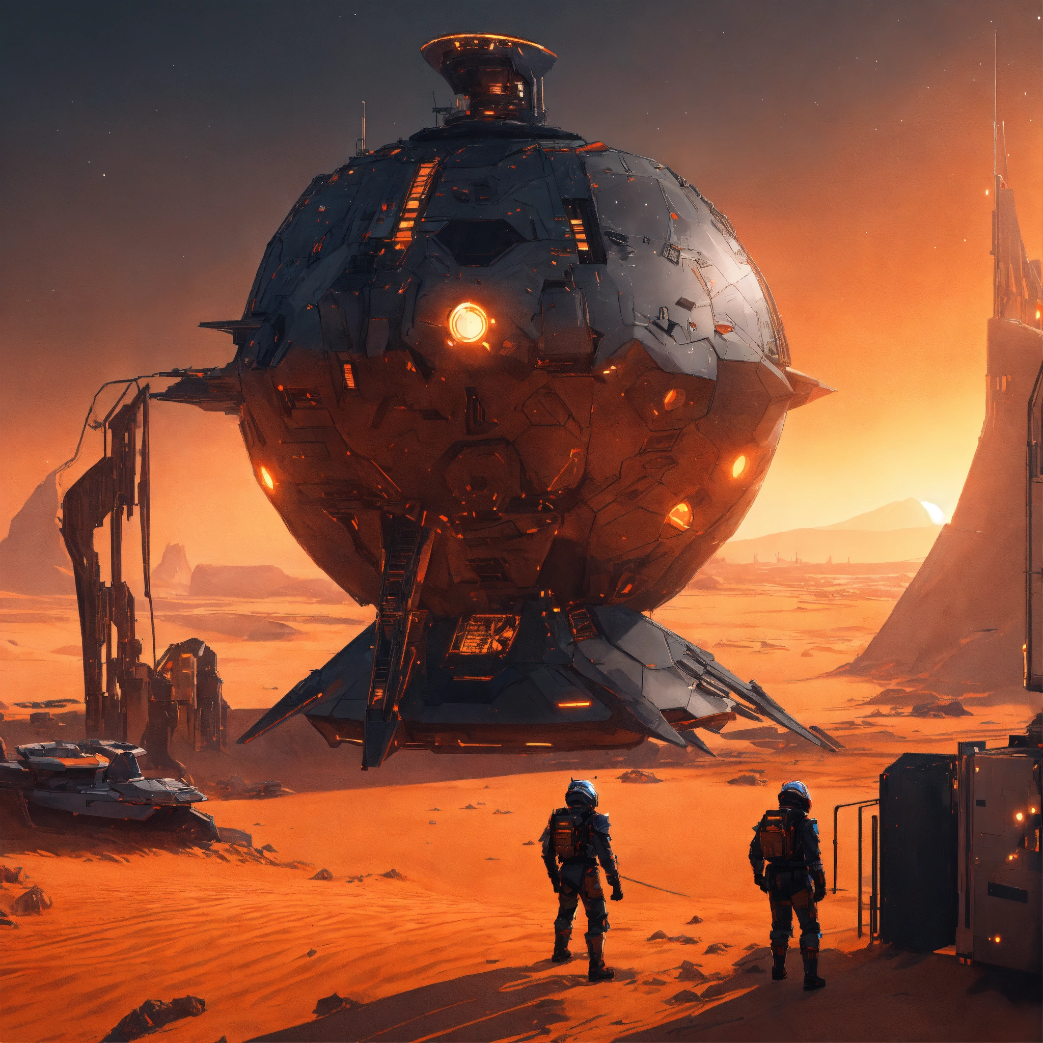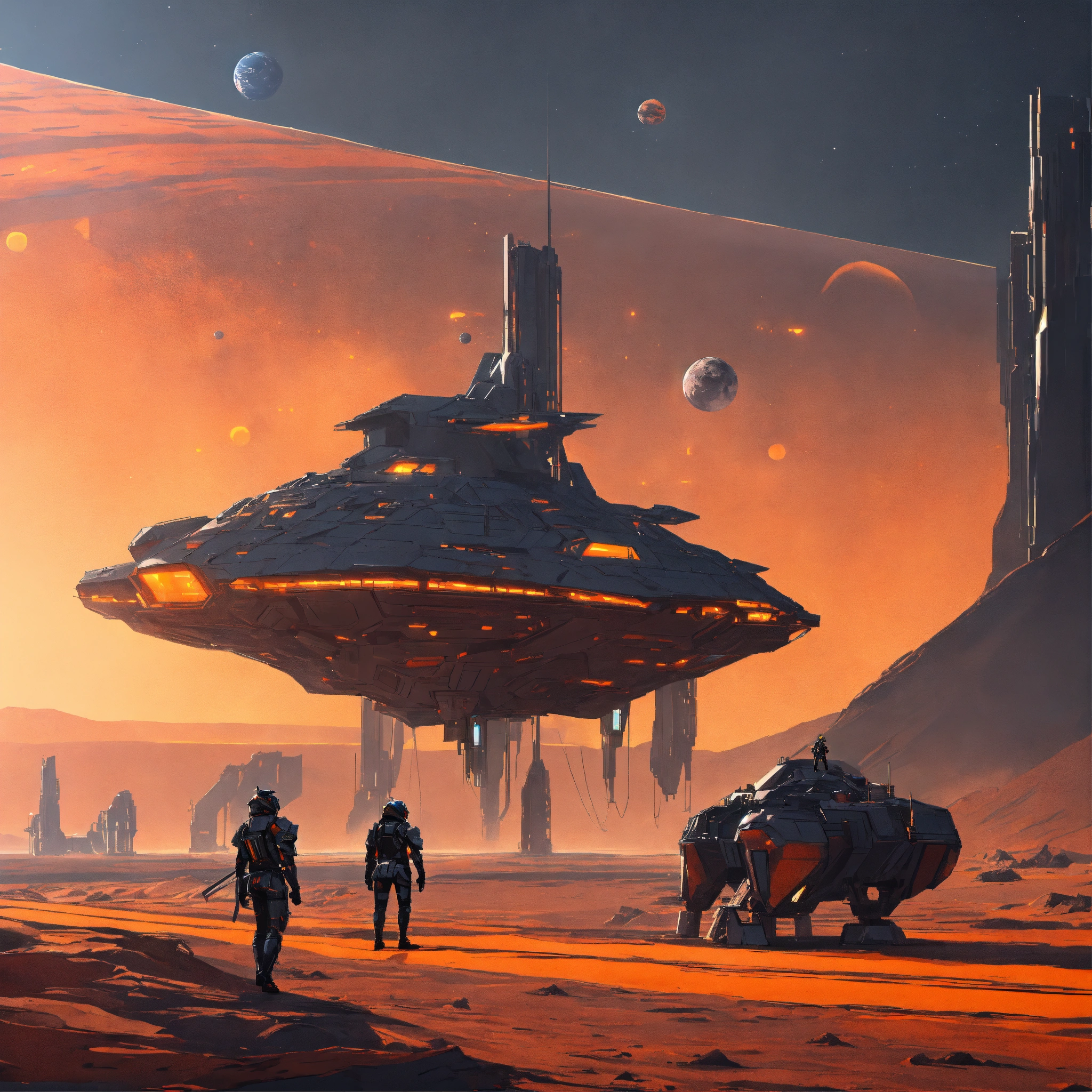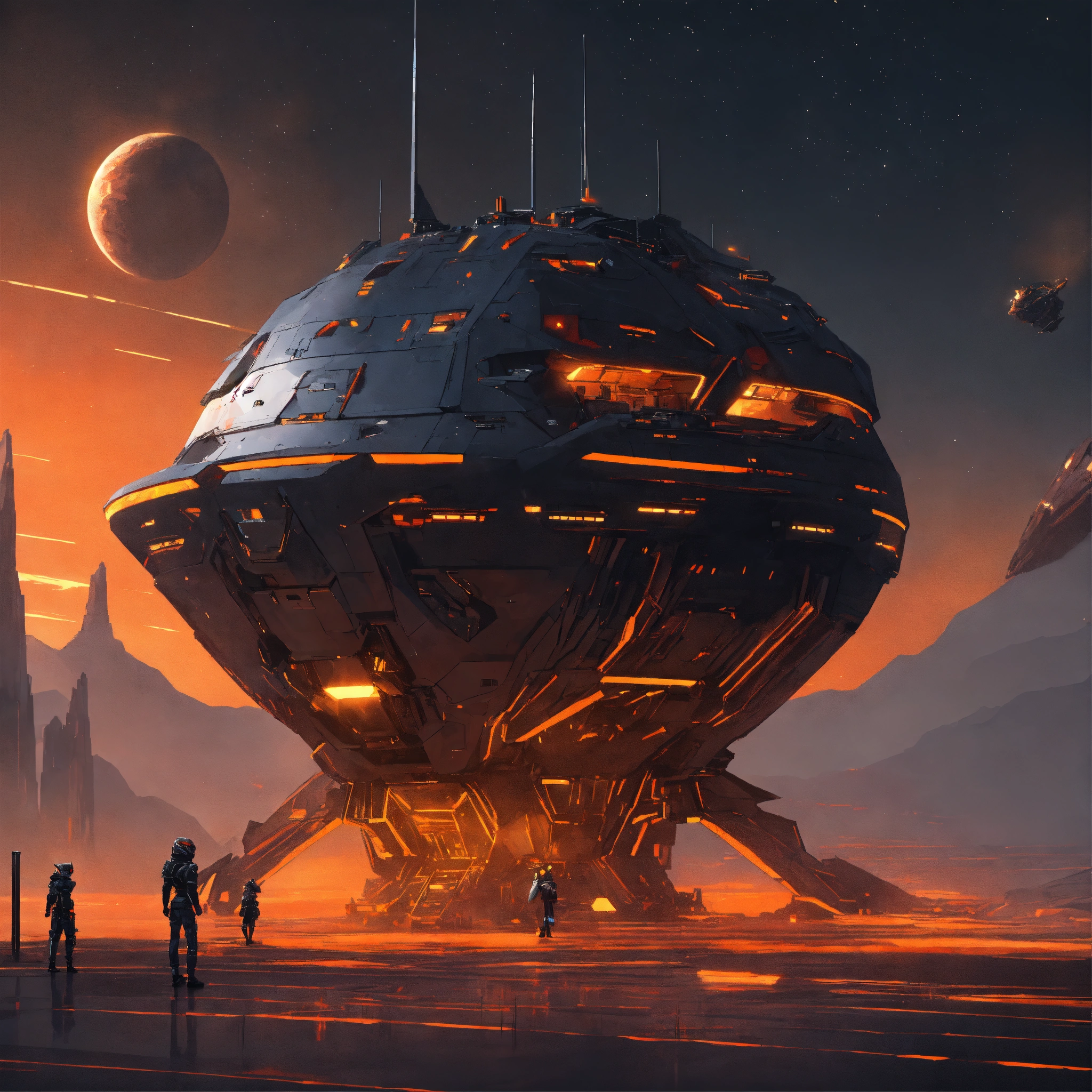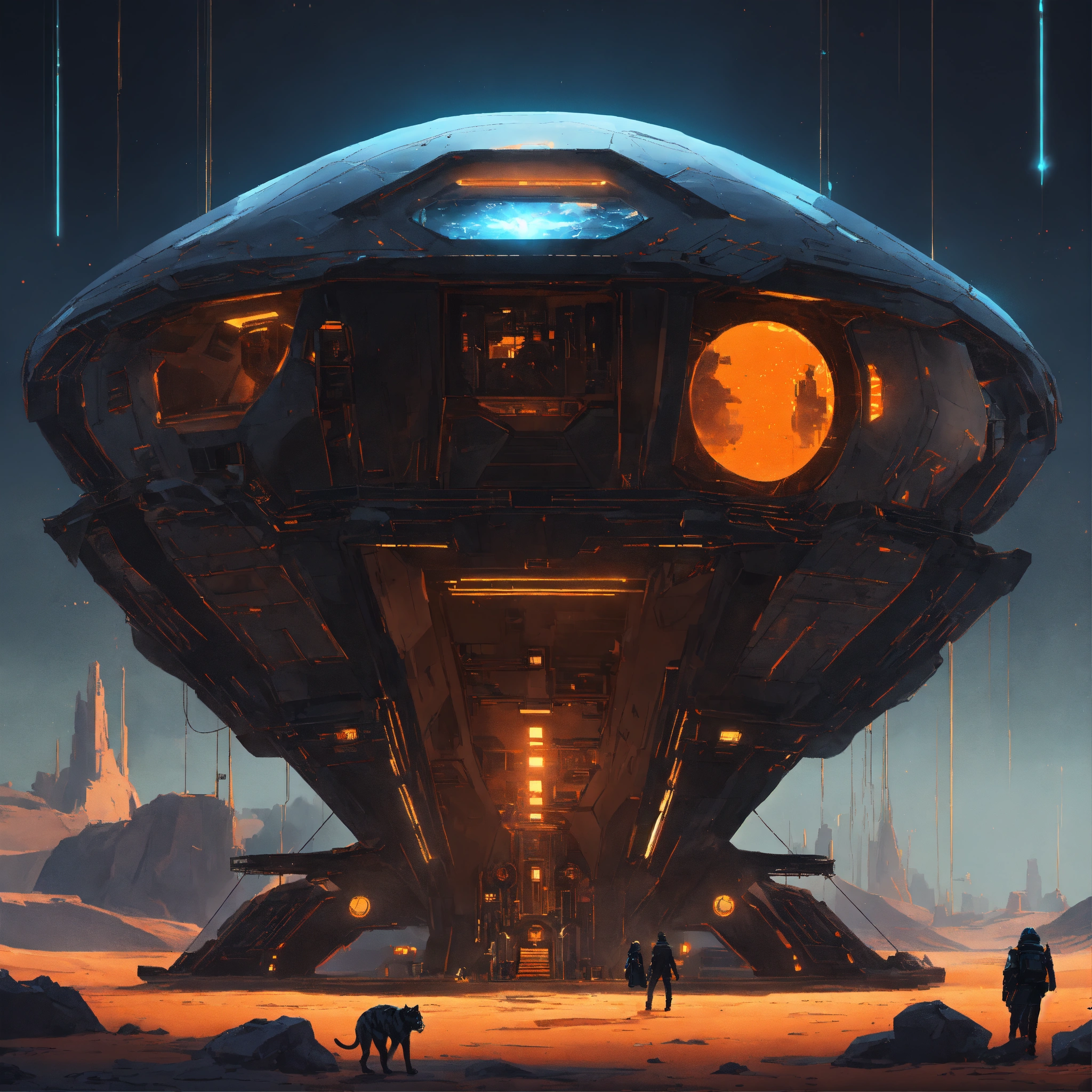 A desert planet, jagged structures, a panther shaped spaceship, small humanoids getting ready to board, the ship is black glass with grey windows and orange glowing seems and lights. abstract style anime art, 8k