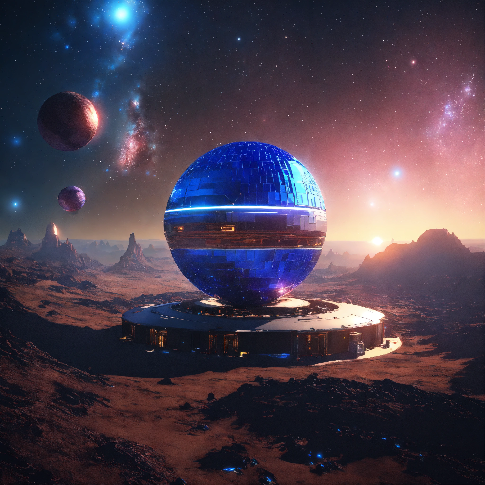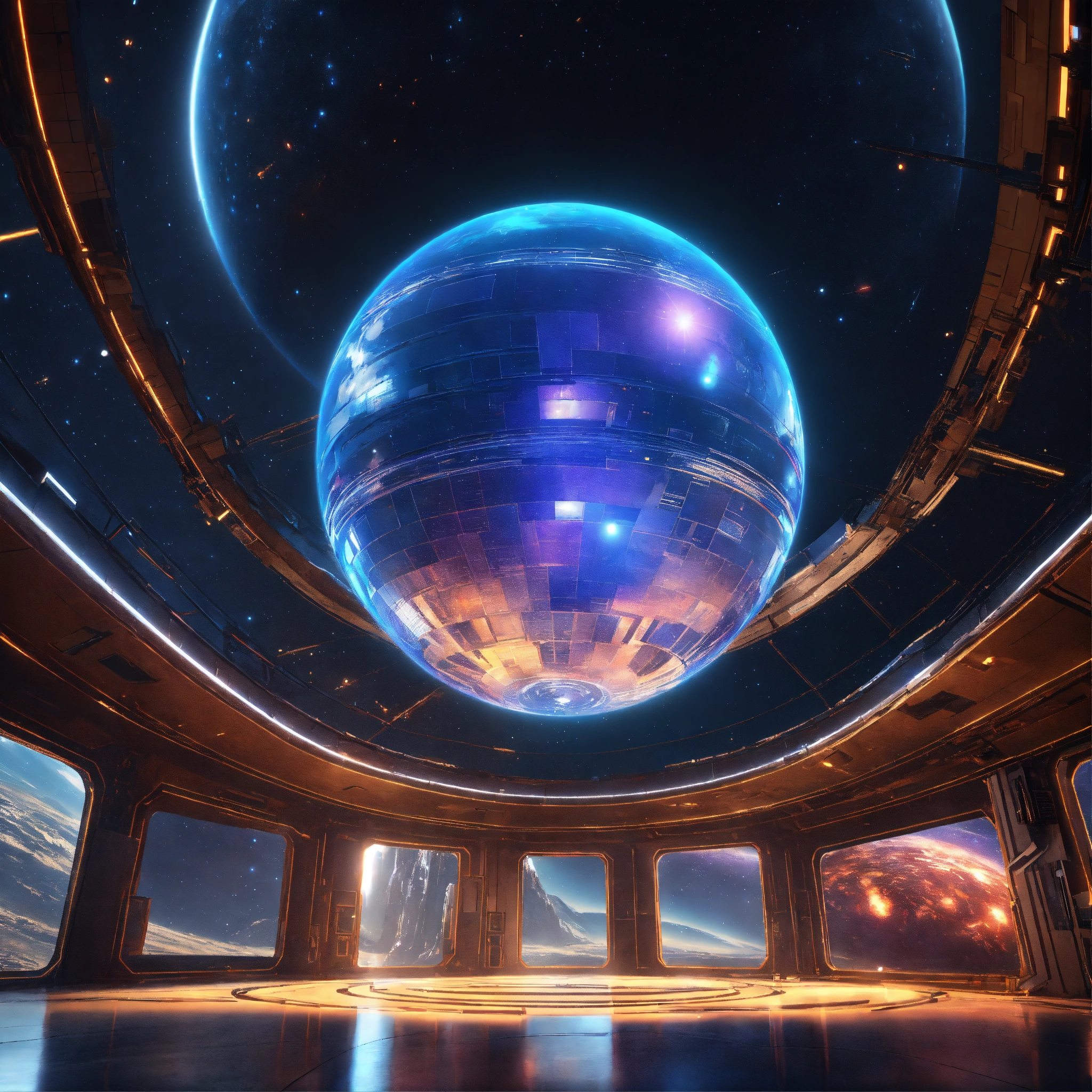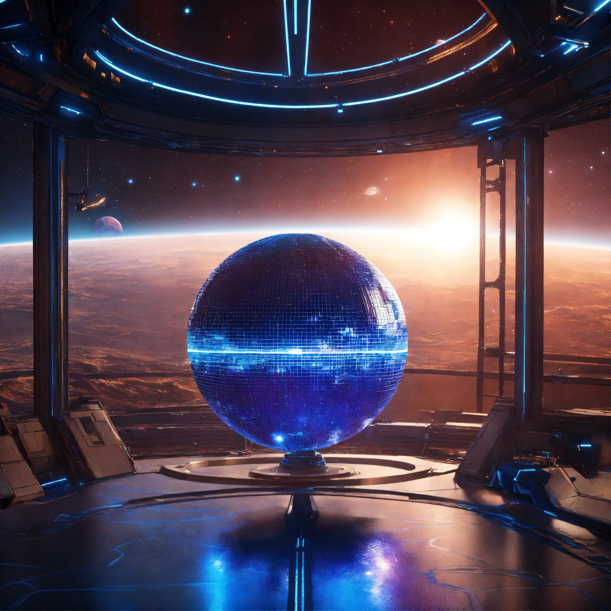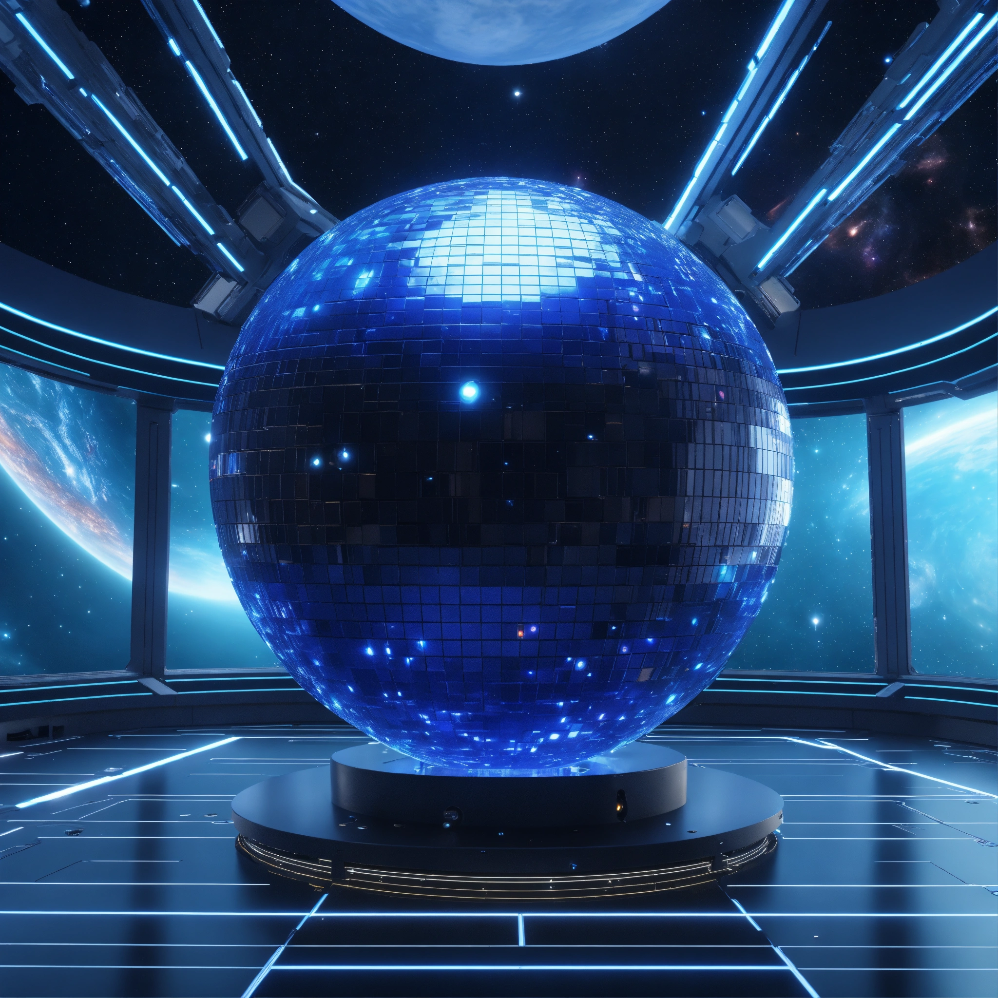 Artificial planet that looks like a blue disco ball orbiting in space at the outer rim of the galaxy, lots of windows and docking bays, 8k, realistic, unreal engine
