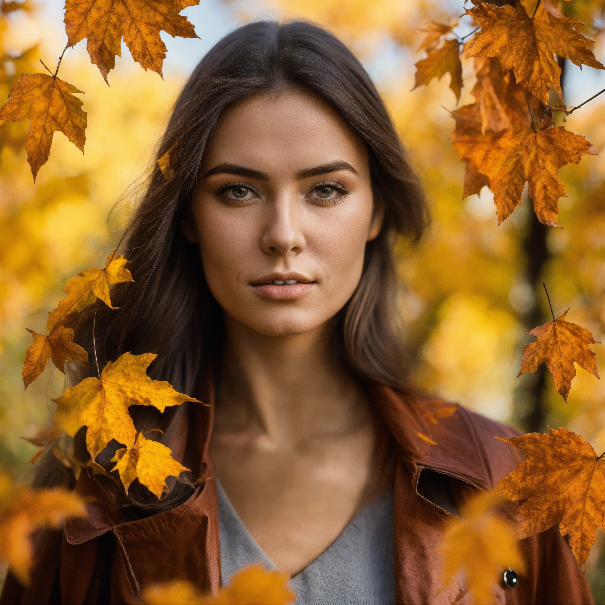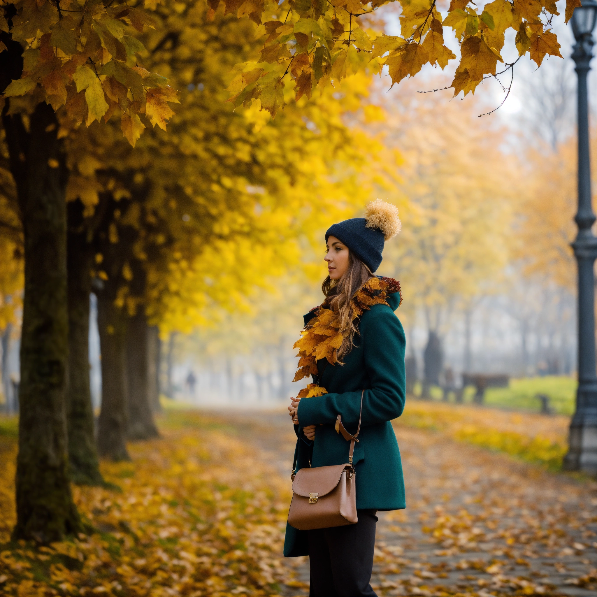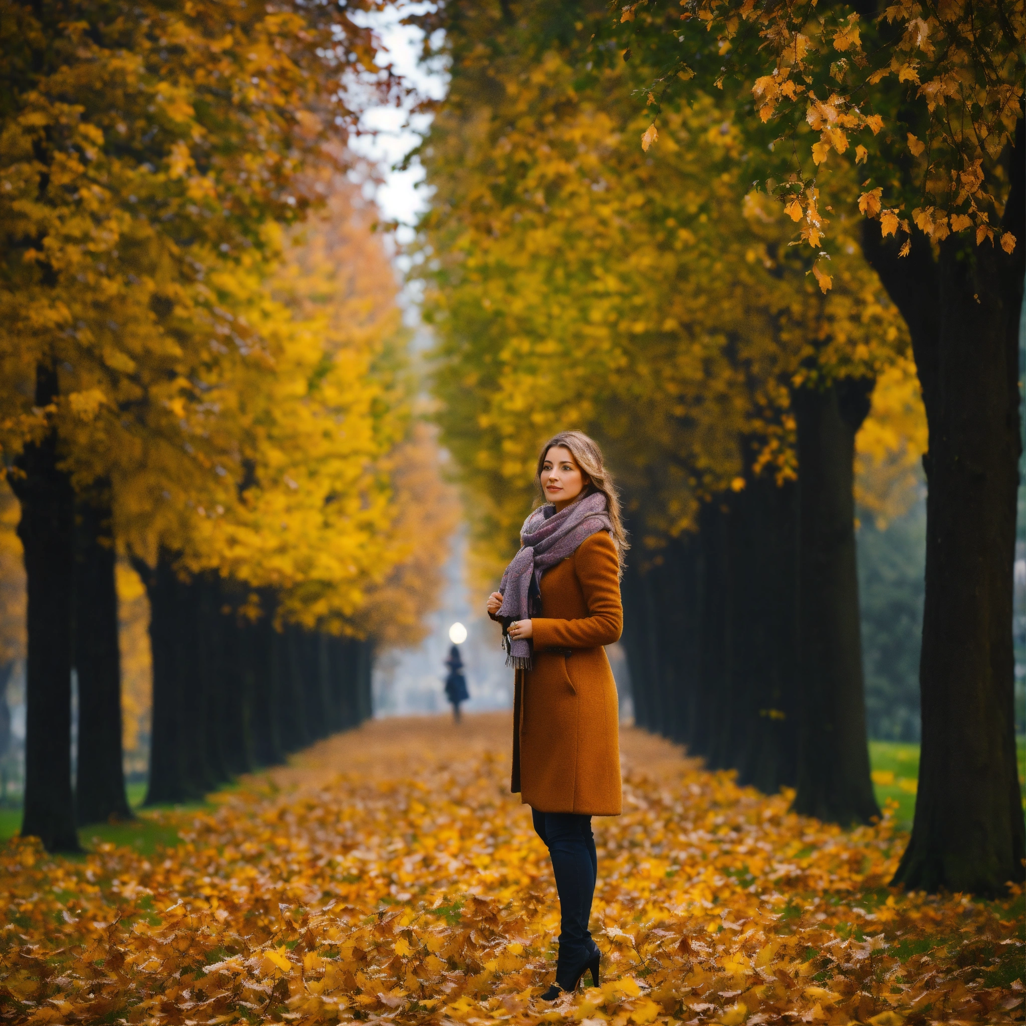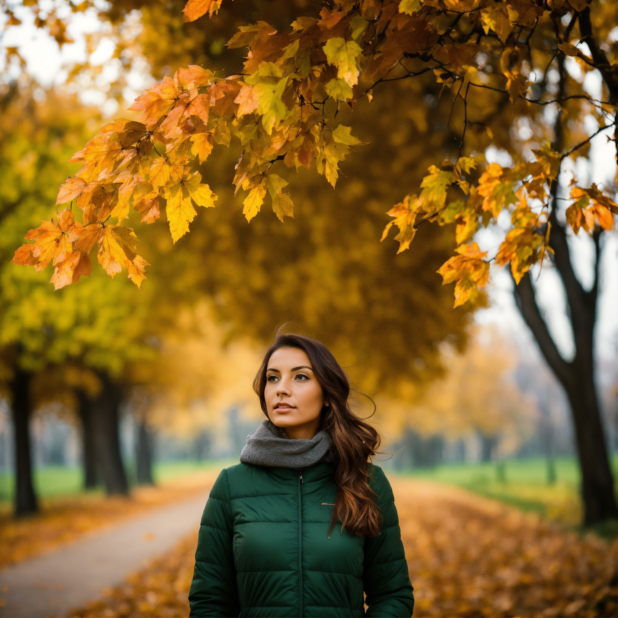 Autunno con foglie e una donna con il viso ben visibile in primo piano che si avvia a camminare lungo il viale alberato i