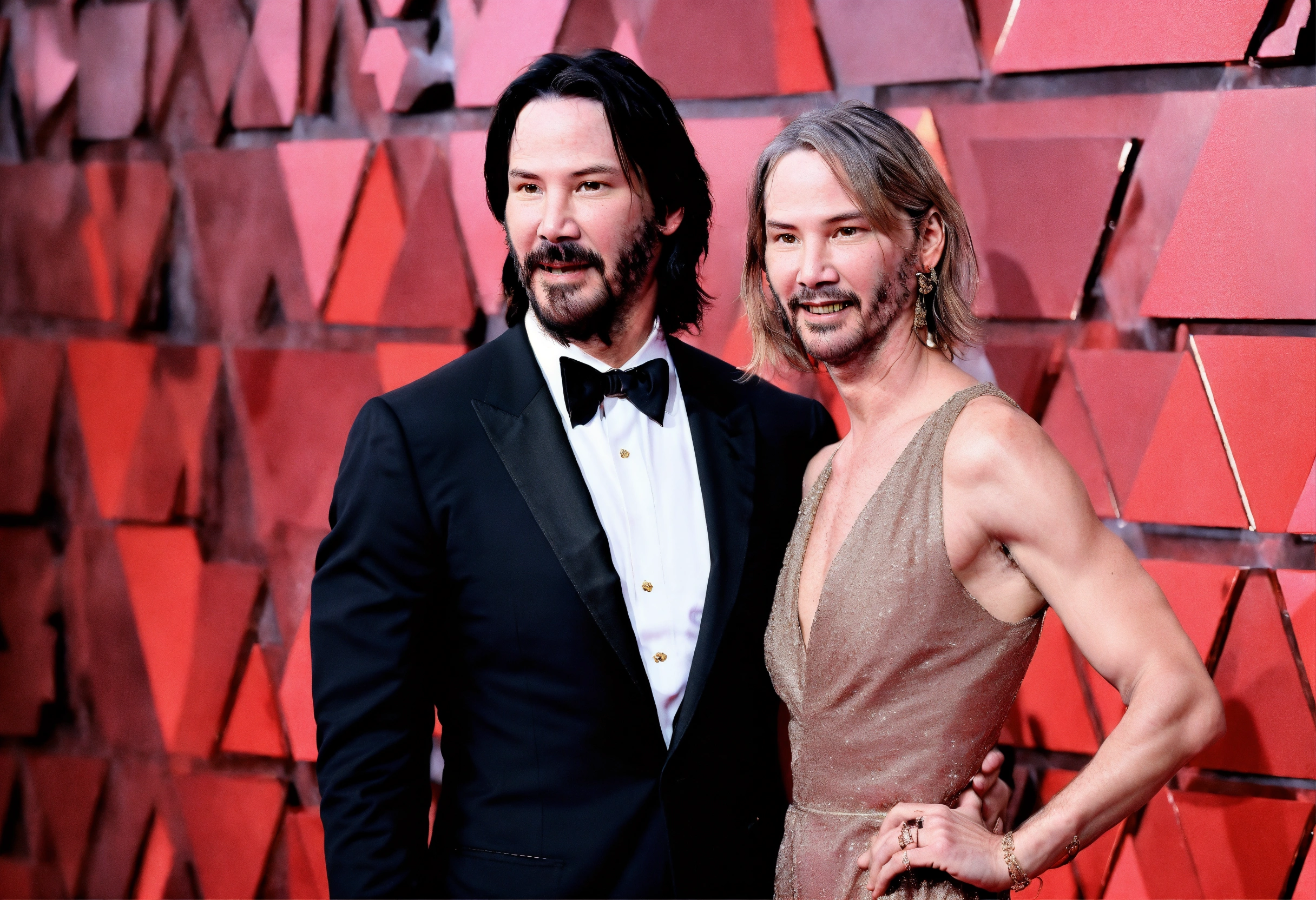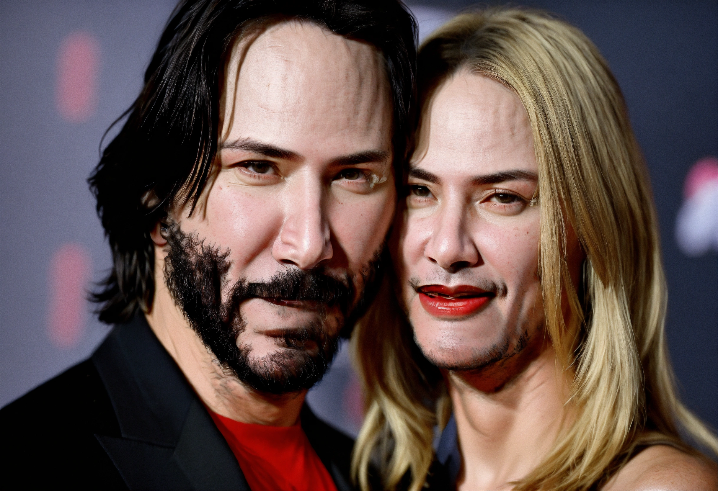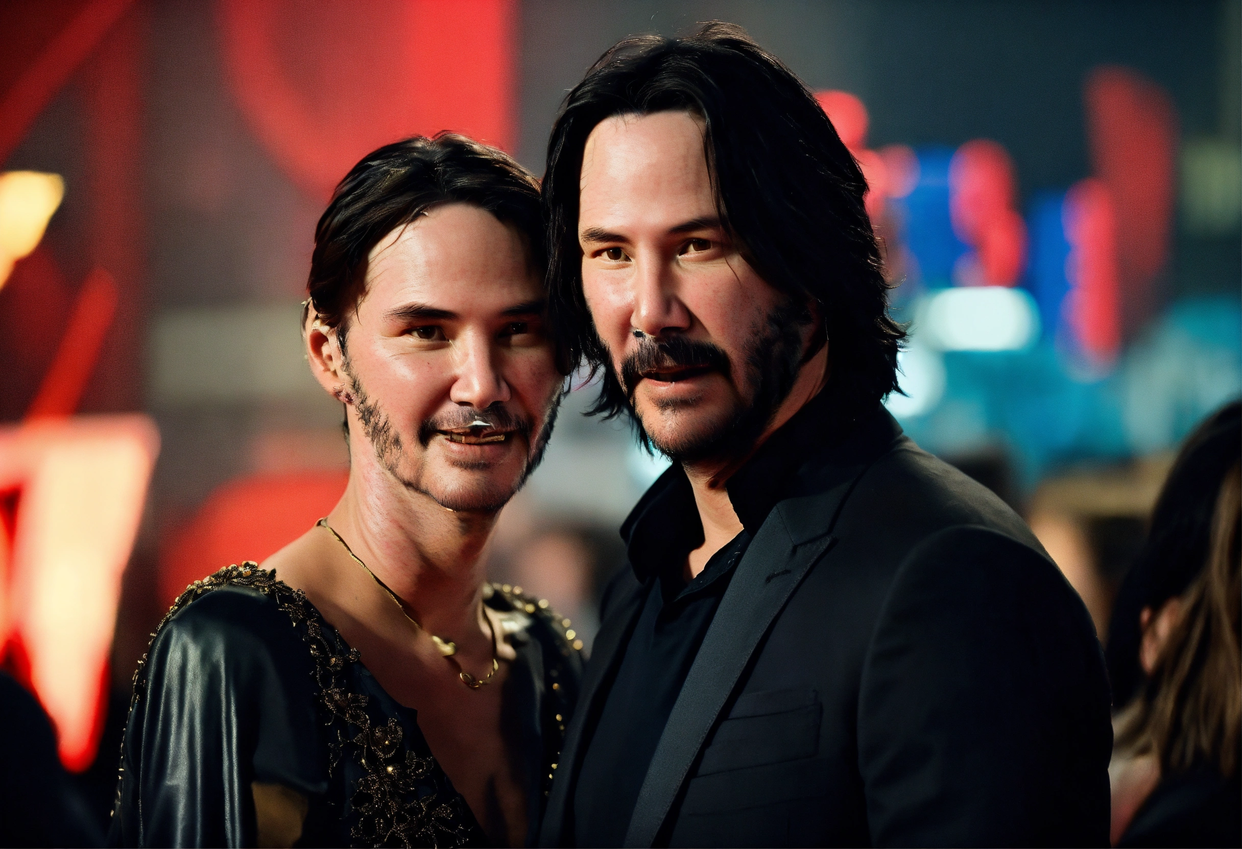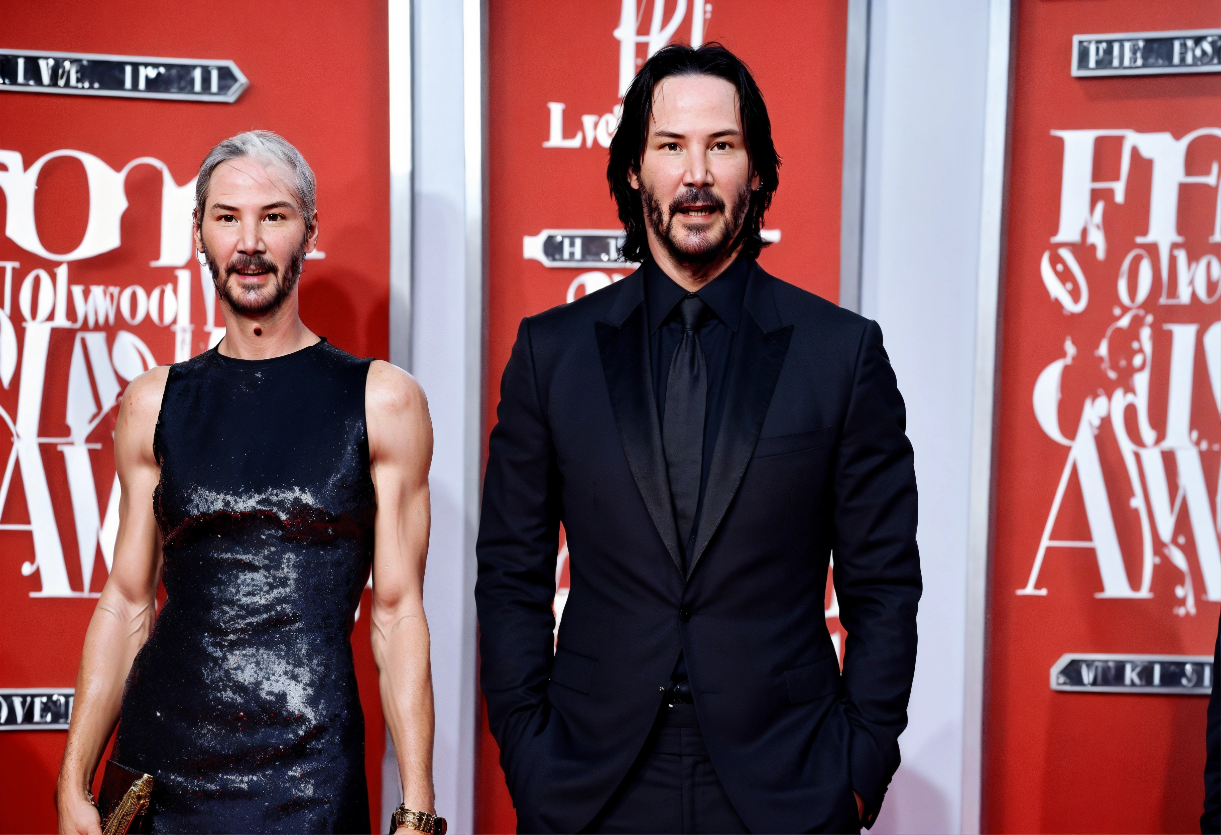 Image prompt 1 create image alexandra grant and keanu reeves together. show them on the red carpet, looking confident and happy. highlight the words "hollywood love" image.