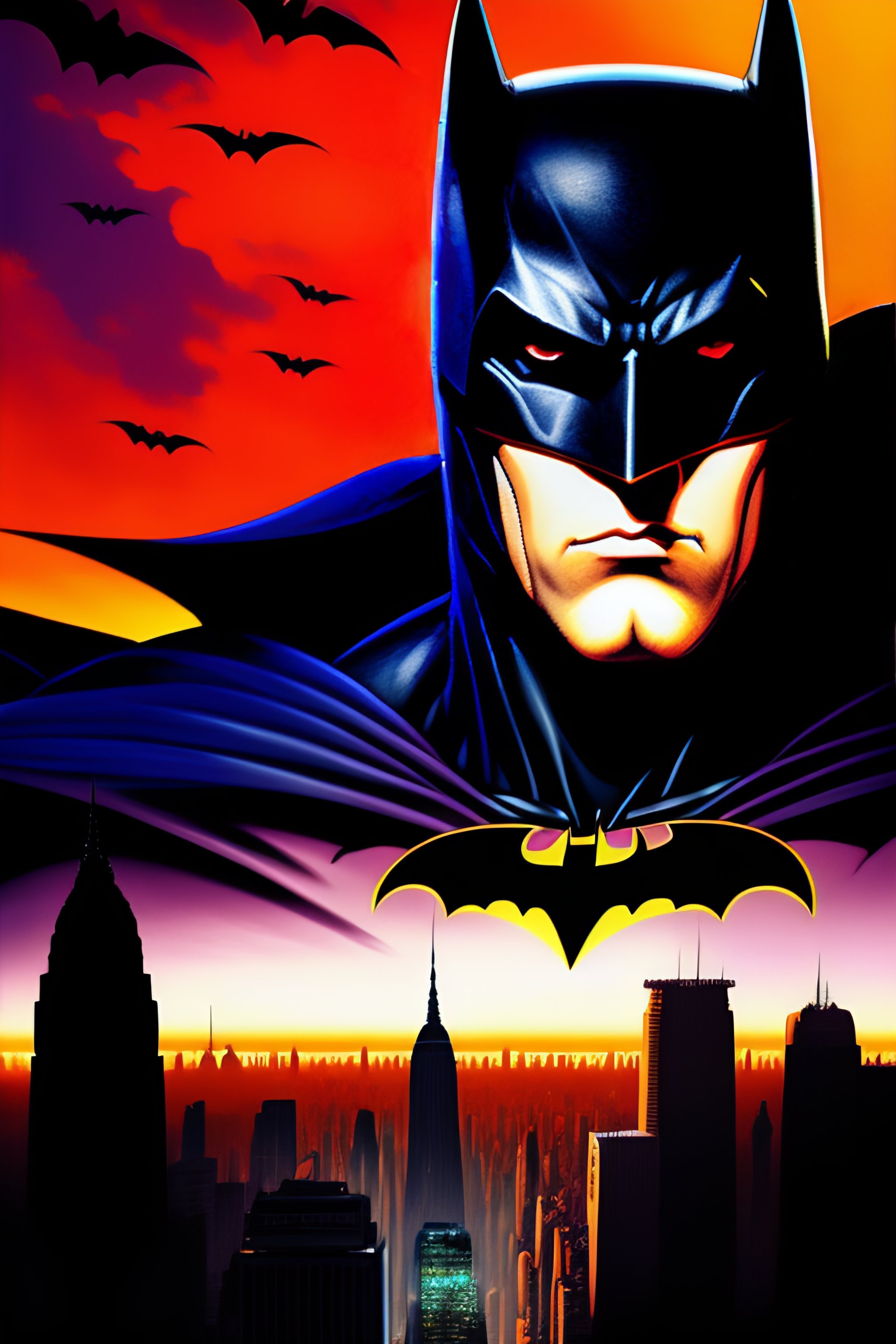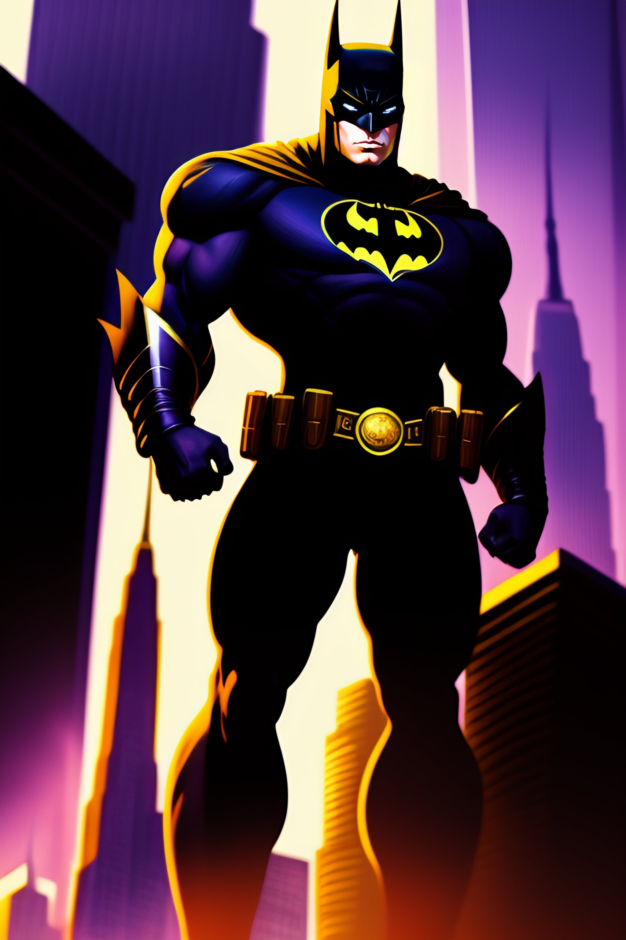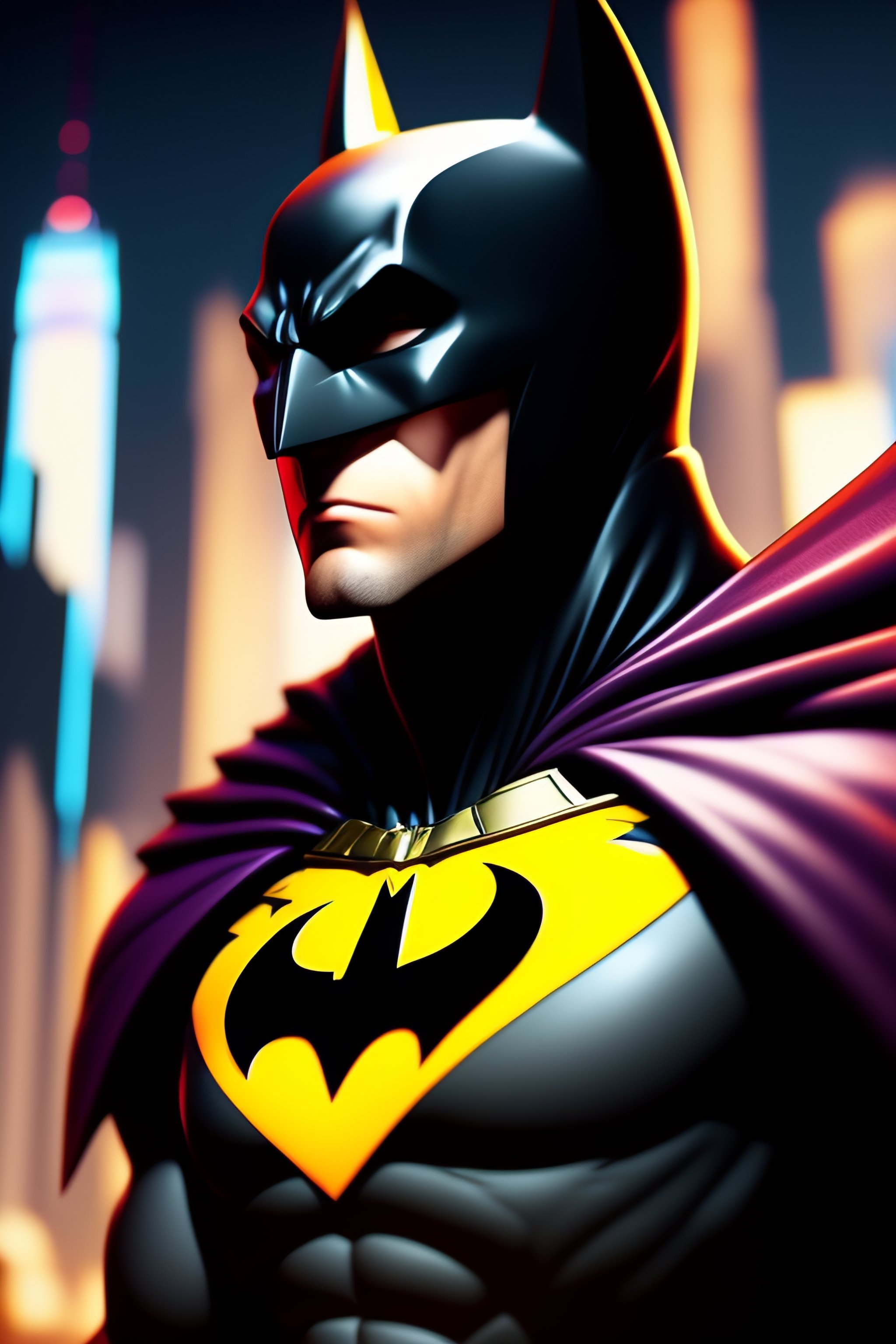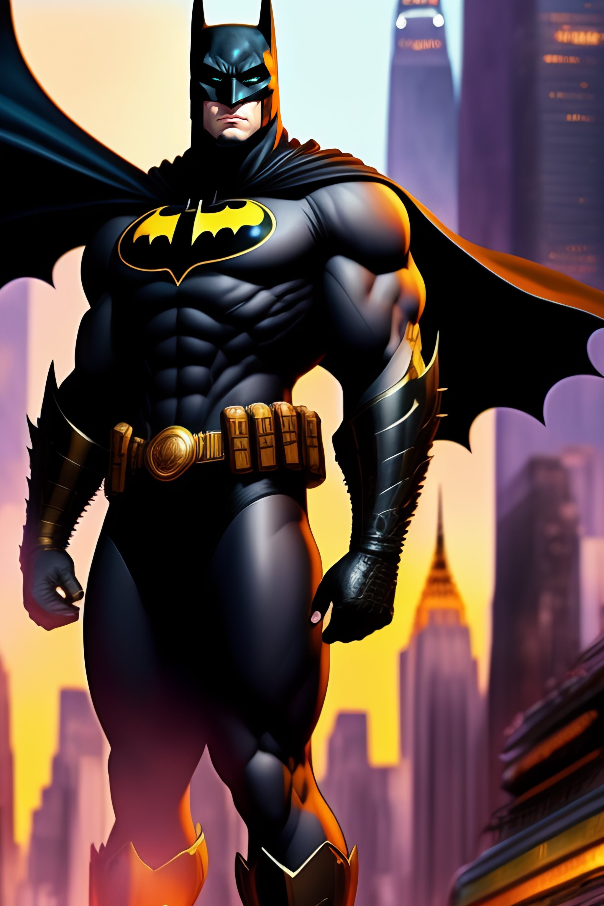 Batman, anime style, african, high detail, dystopian, muted colours, sharp, background is a battle ridden new york city blurred