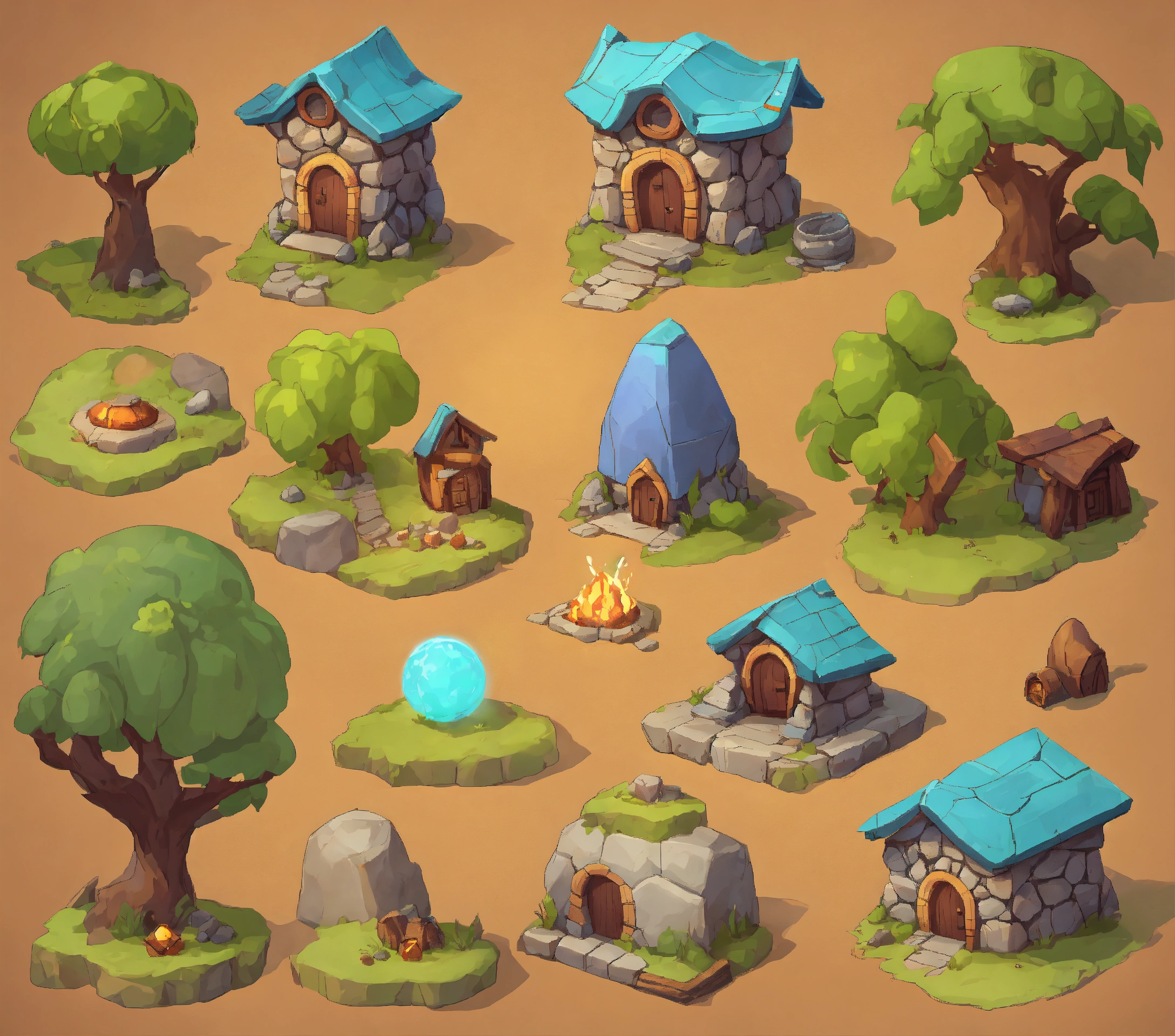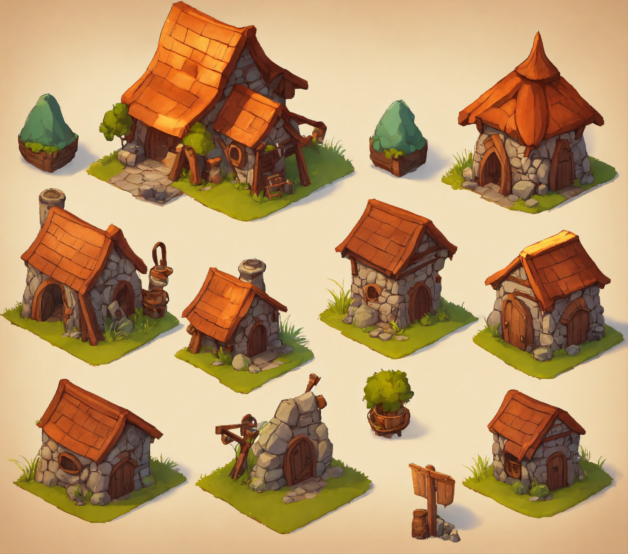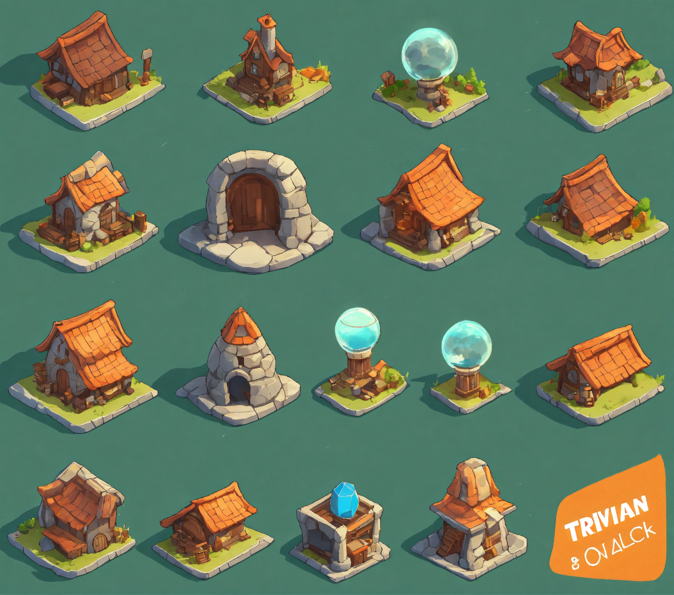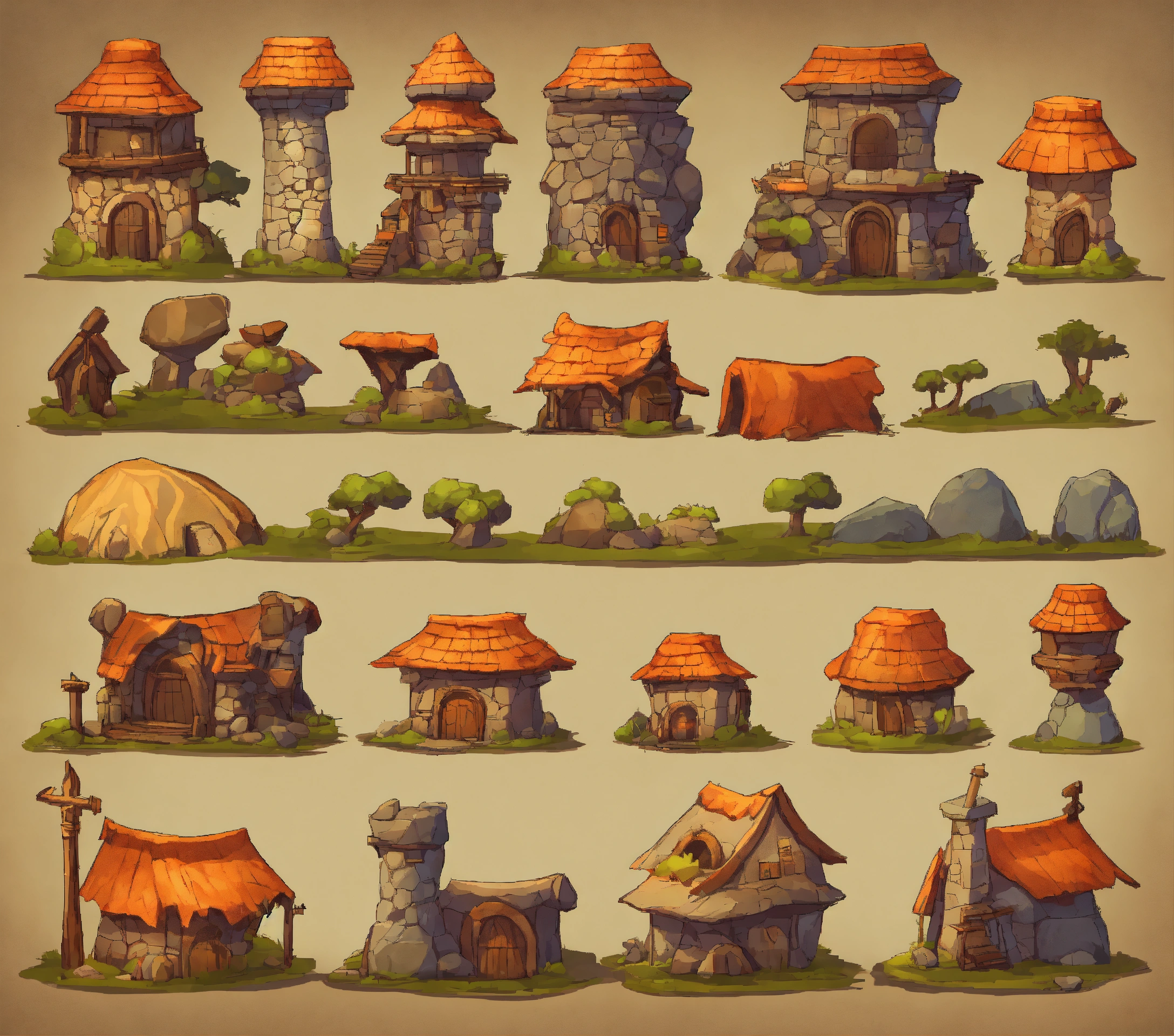 Cartoon pack of building assets for a game like trivian but in a medieval, stone age and futuristic style