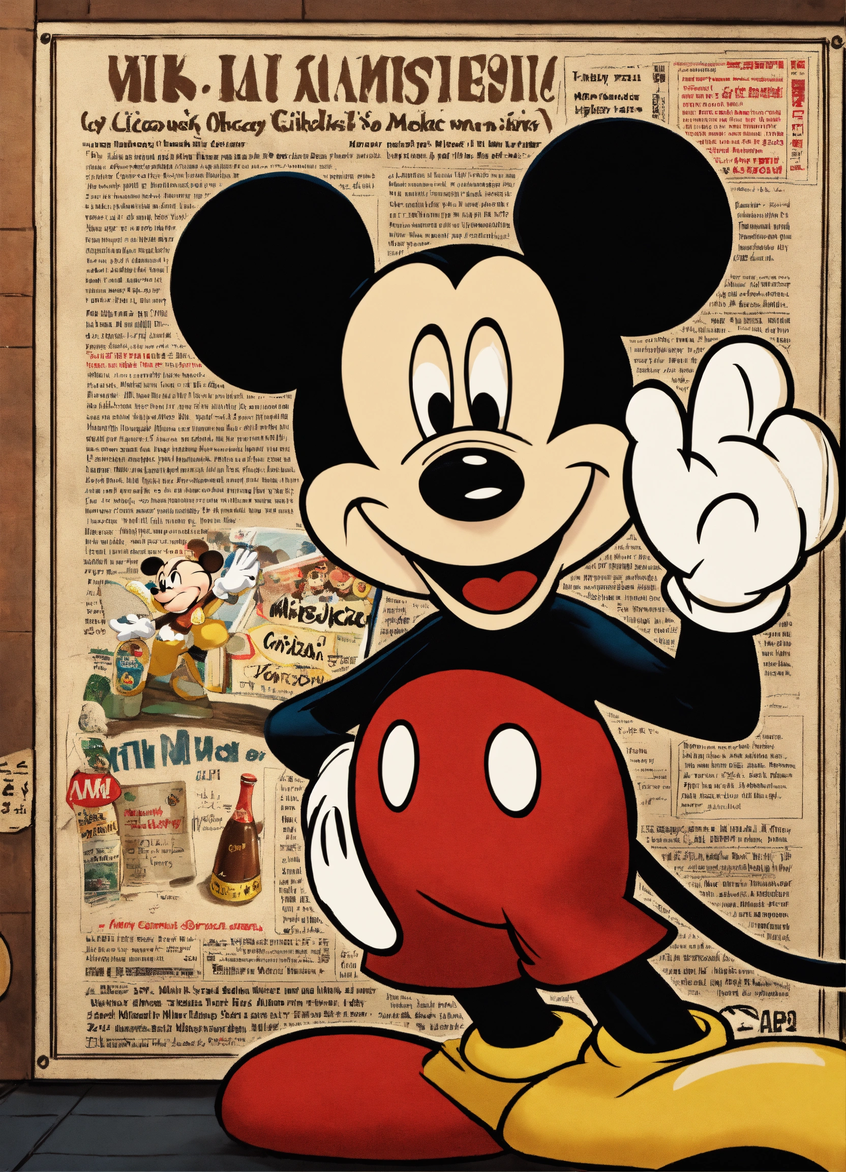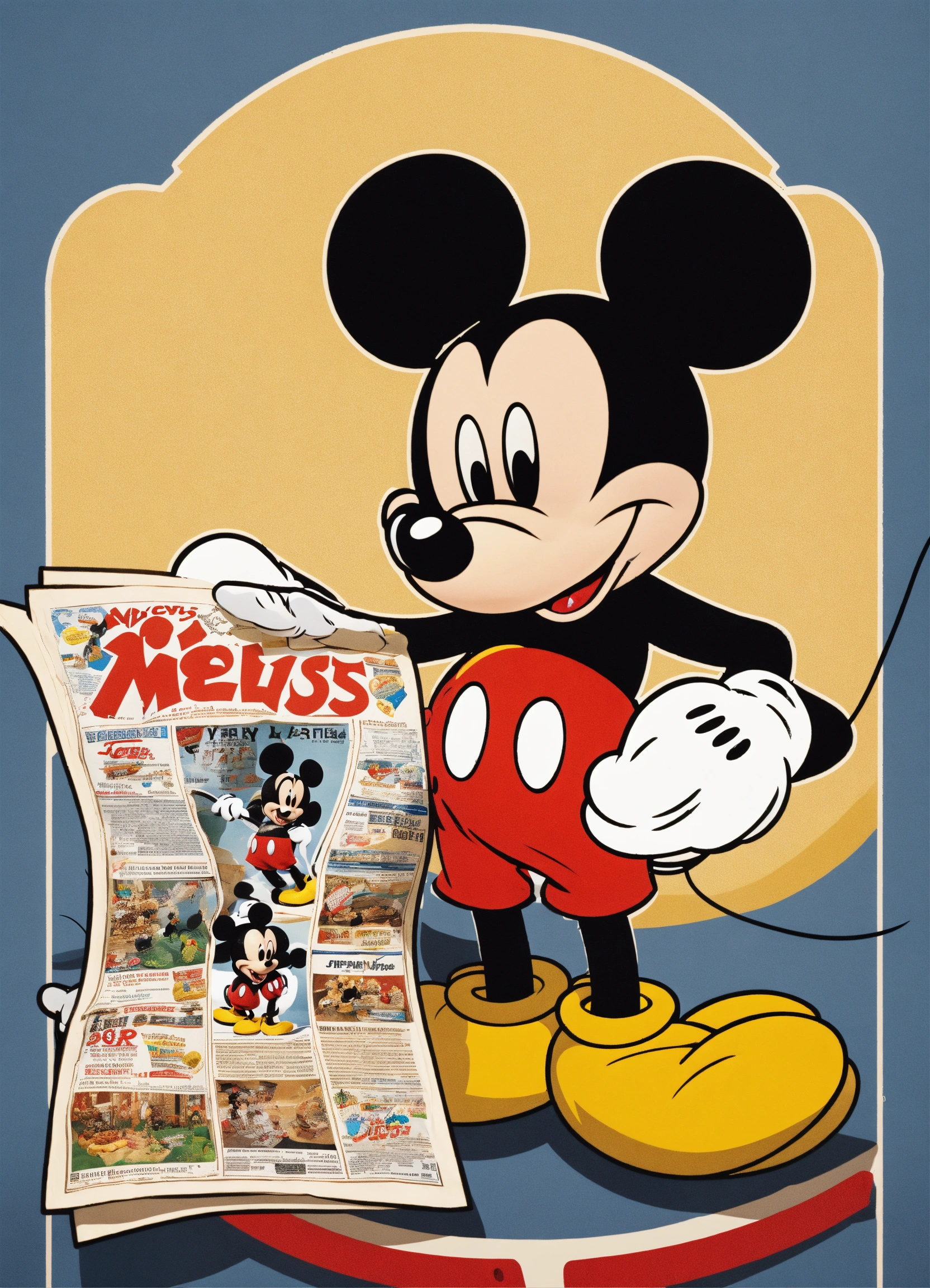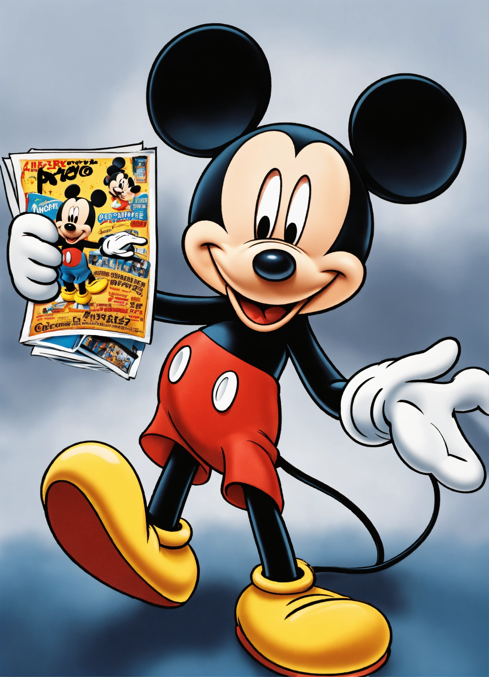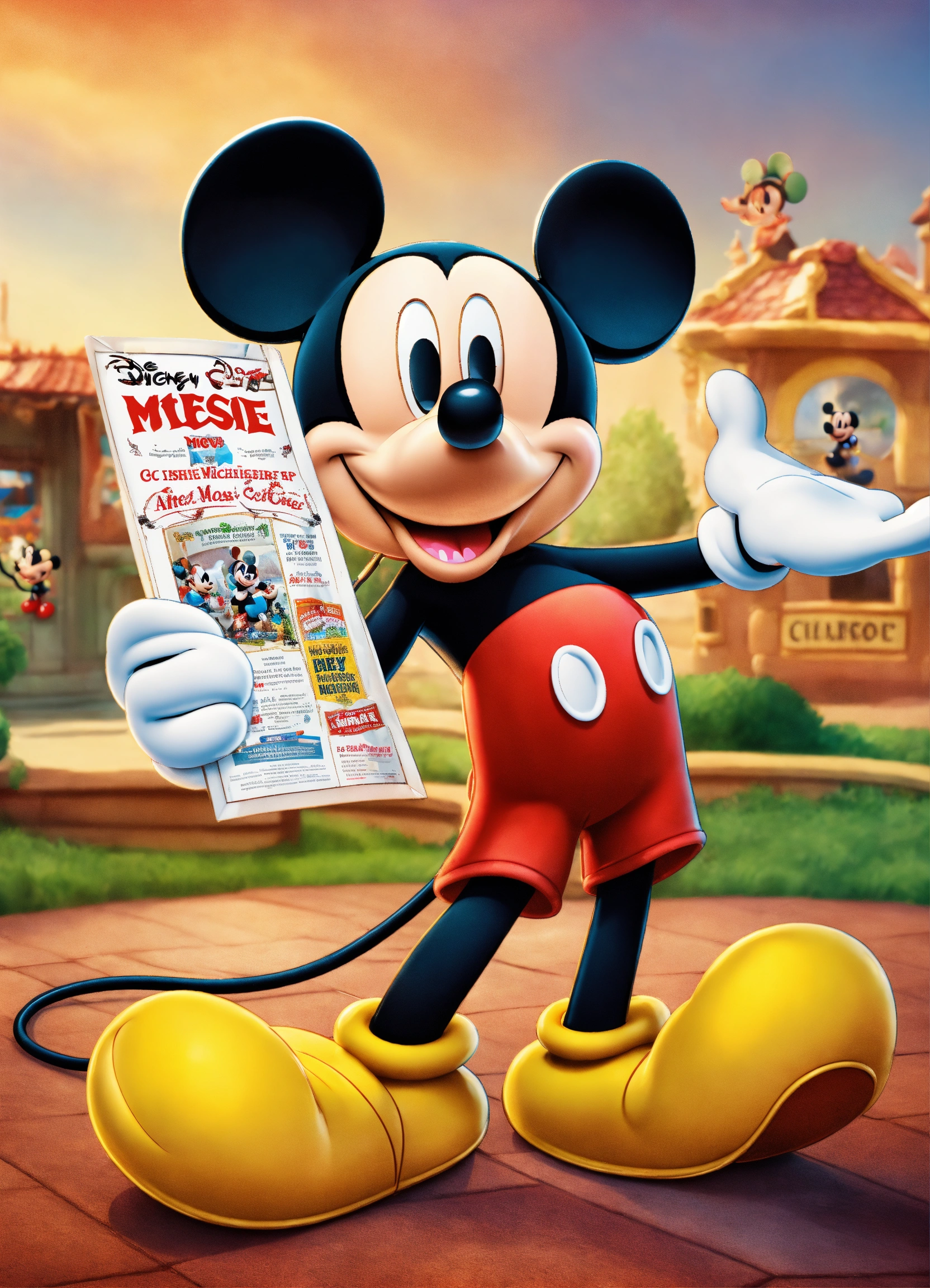 Mickey mouse is holding an advertisement in his hands