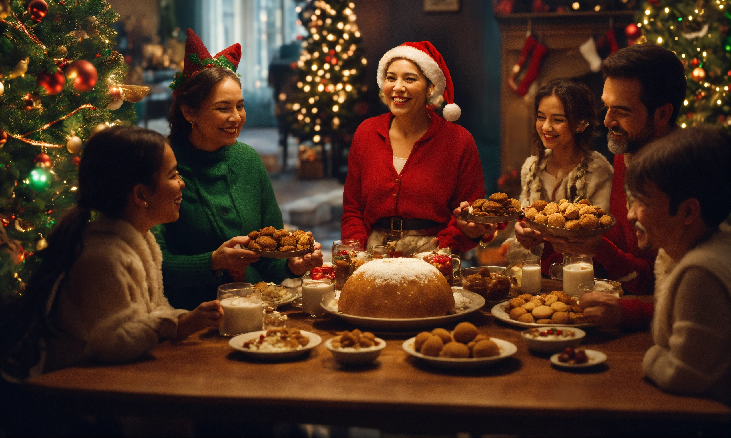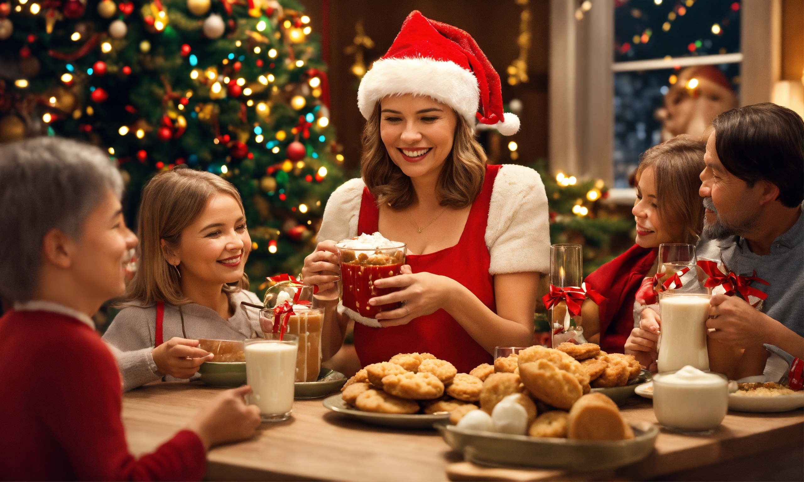 Create a magical realism movie poster featuring a 30-year-old woman wearing a christmas hat, cradling a glass of milk. she should dominate 70% of the image. in the bottom section, depict a family of 15 people. in the center, an elderly man with a white beard should stand out, and on either side, portray the rest of the family members in festive christmas attire, all smiling and sharing traditional holiday foods like buñuelos, natilla, milk, and hot beverages. the image should be in 4k resolution, in a 32 aspect ratio, resembling scenes from a movie. aim for an ultrarealistic 8k cinematic quality.