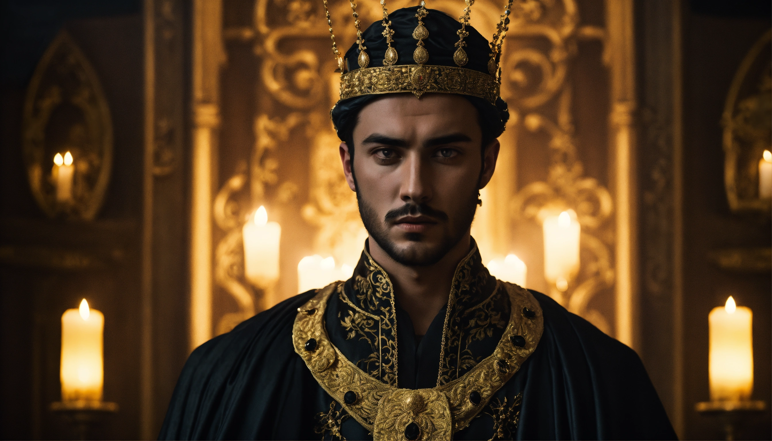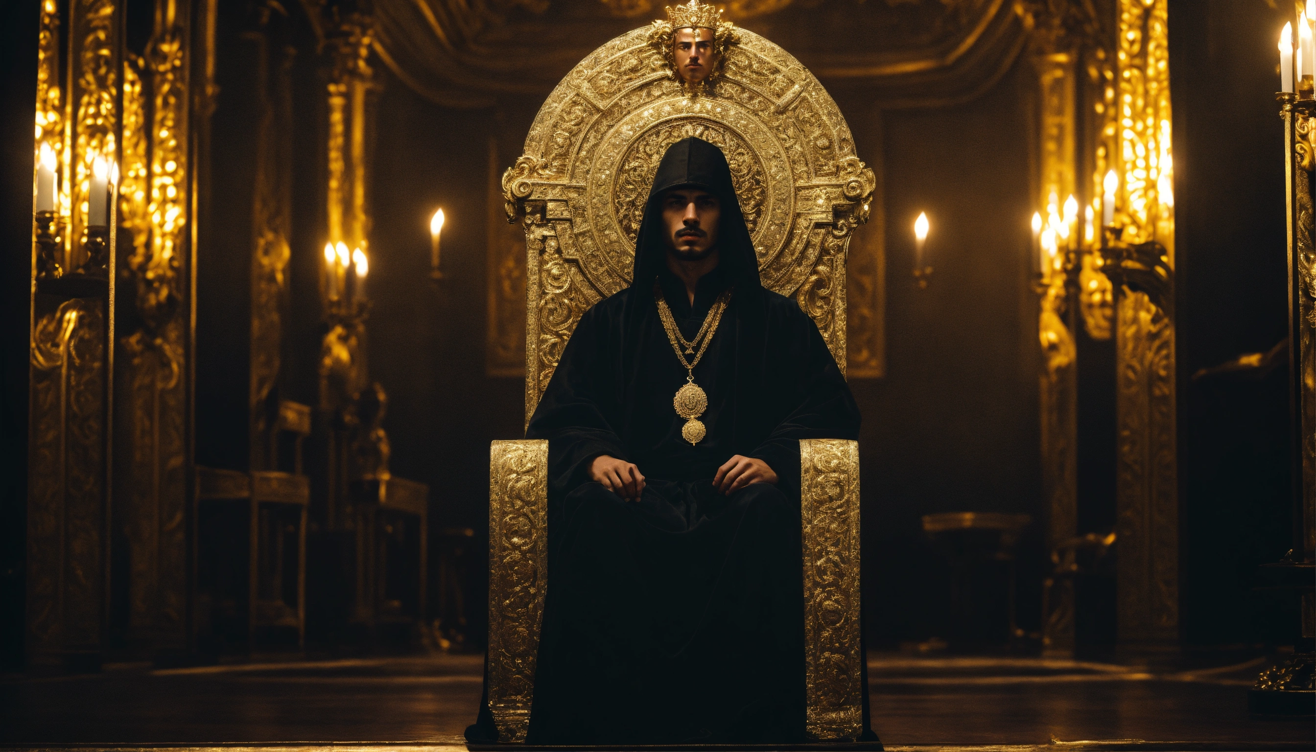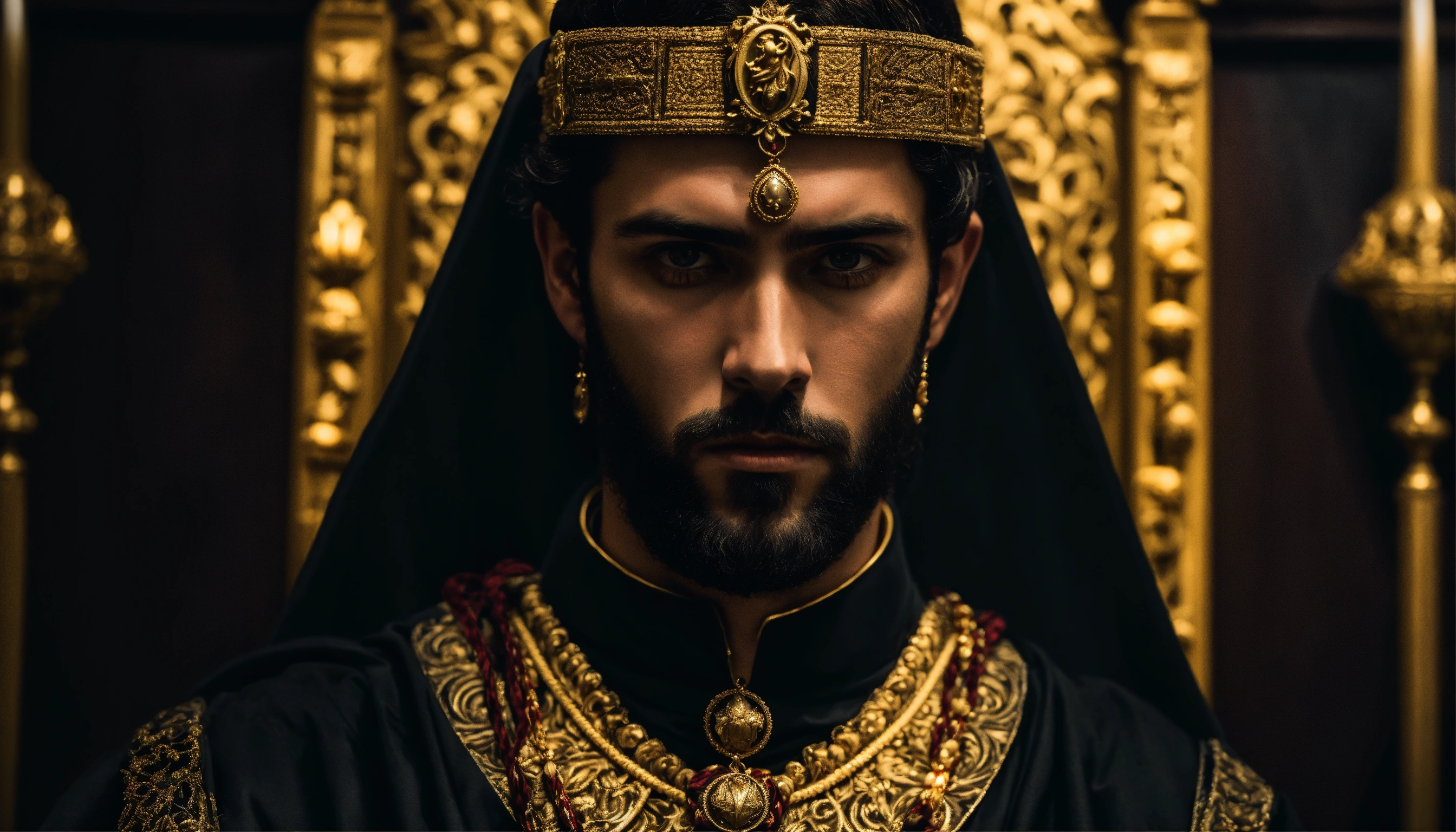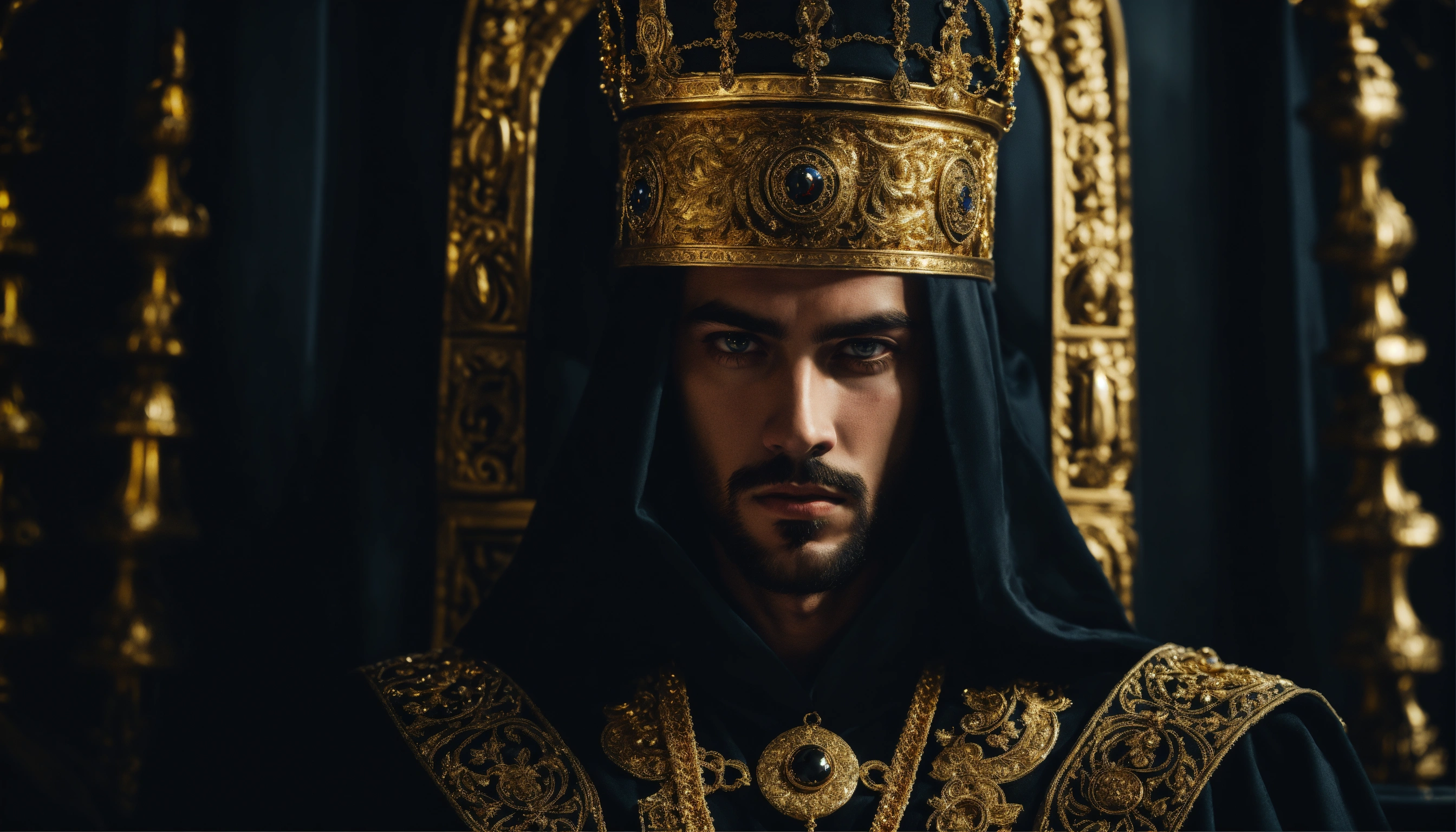 Dark, mysterious and dramatic headshot of a young handsome byzantine tyrannical ruler with hypnotic eyes wearing black ceremonial robes and ornate gold jewellery in a sinister, dimly-lit throne room.