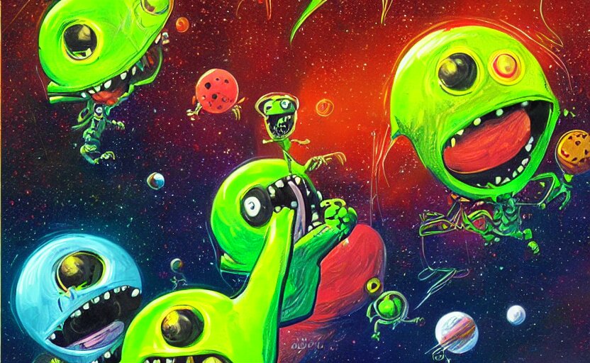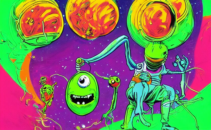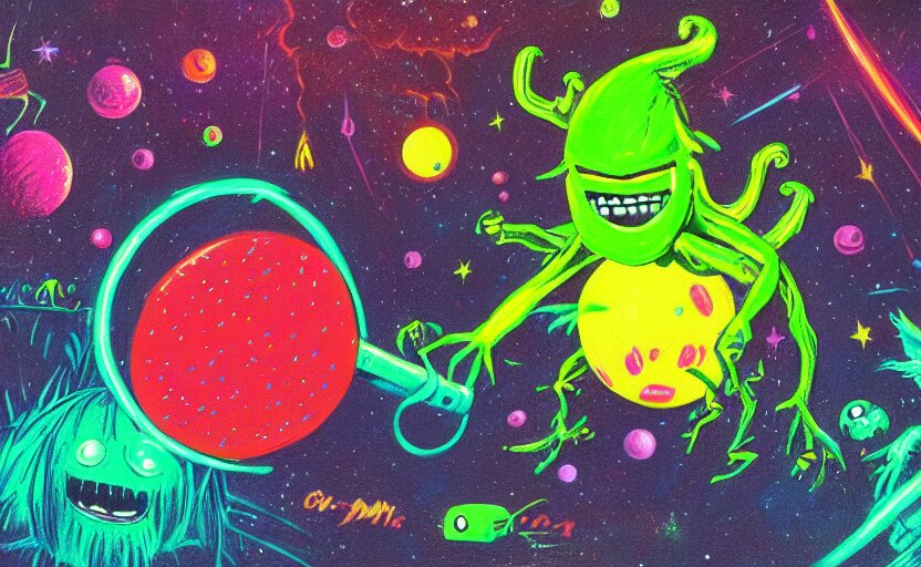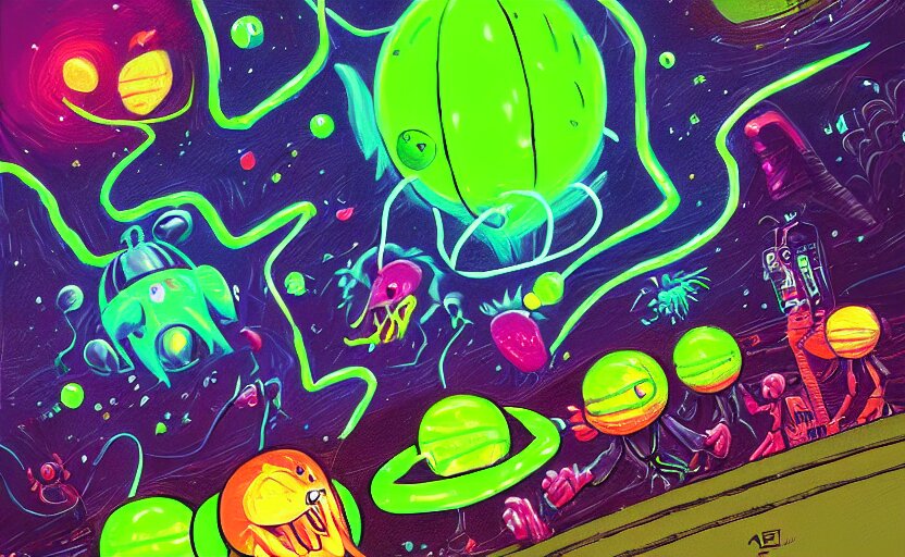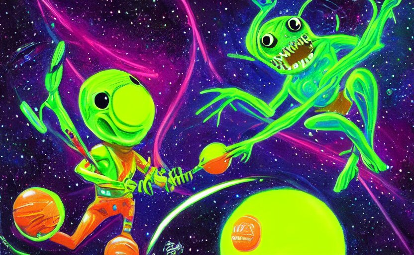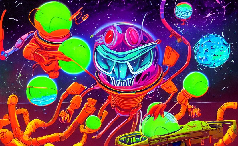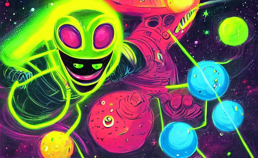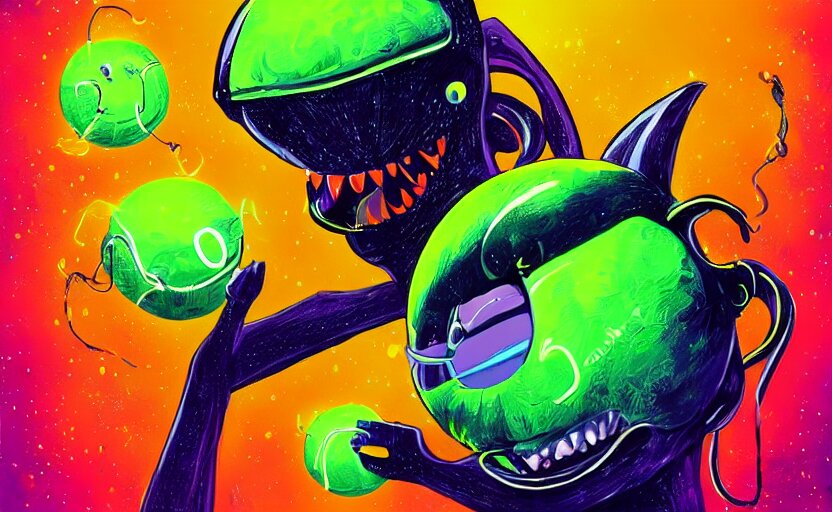 Alien tennis ball monsters in space, colorful neon, digital art, fantasy, magic, chalk, trending on artstation, ultra detailed, professional illustration by basil gogos
