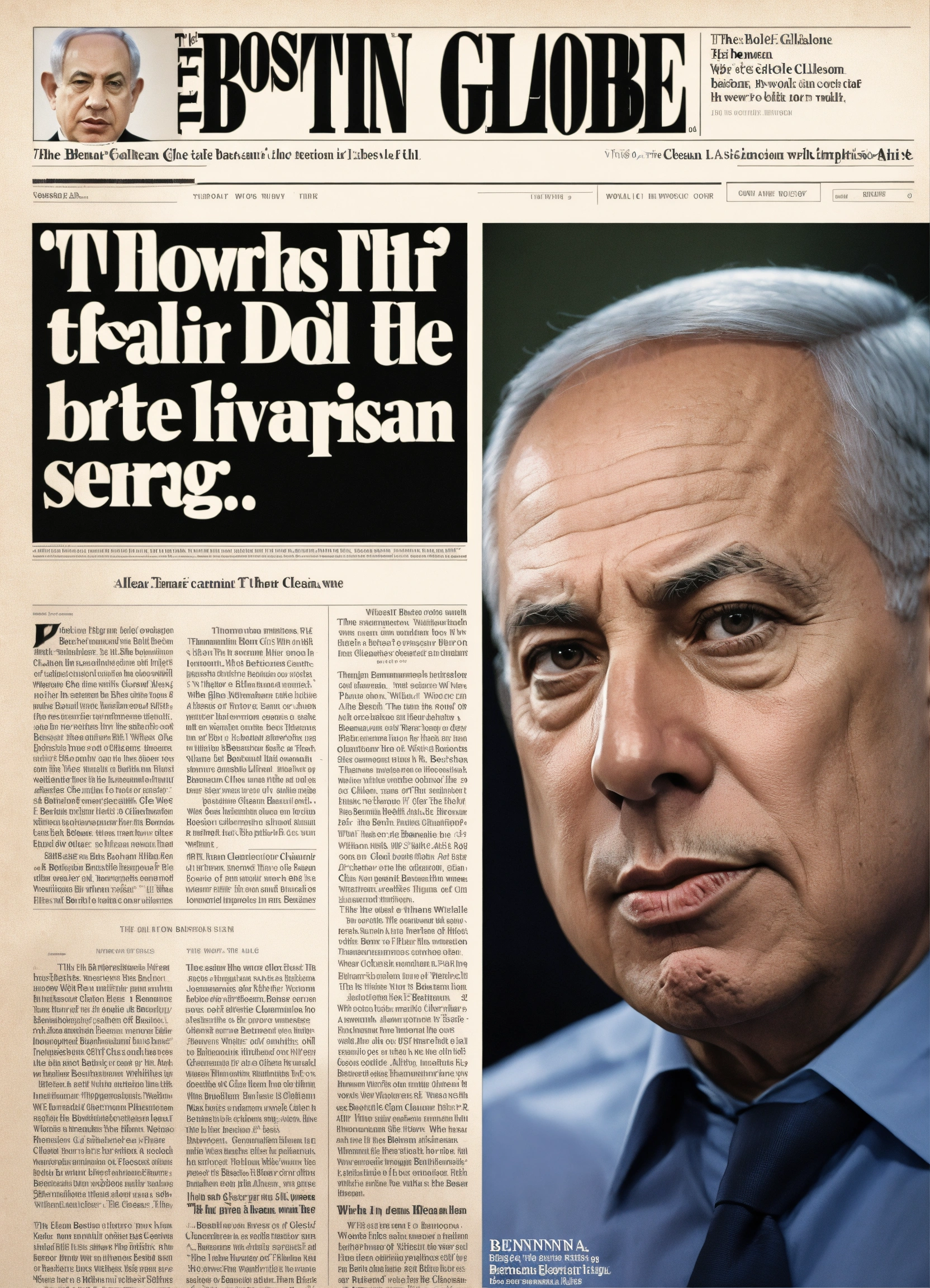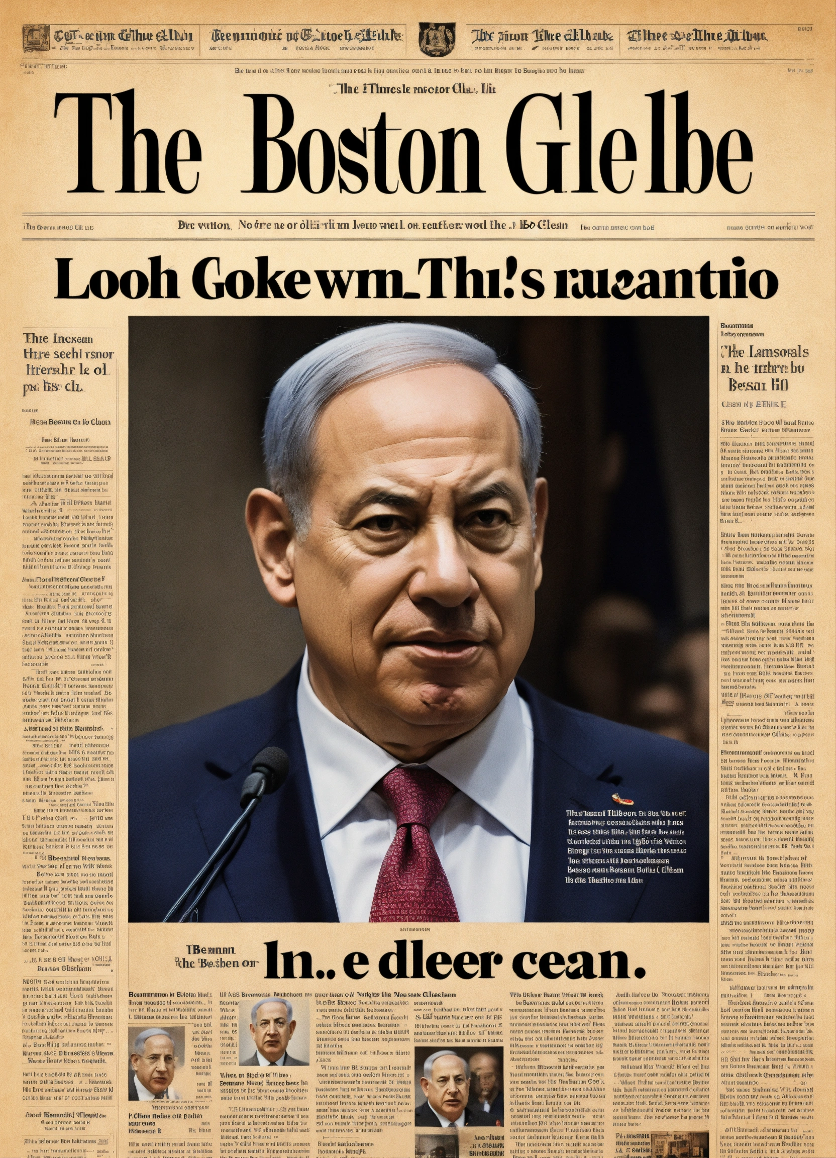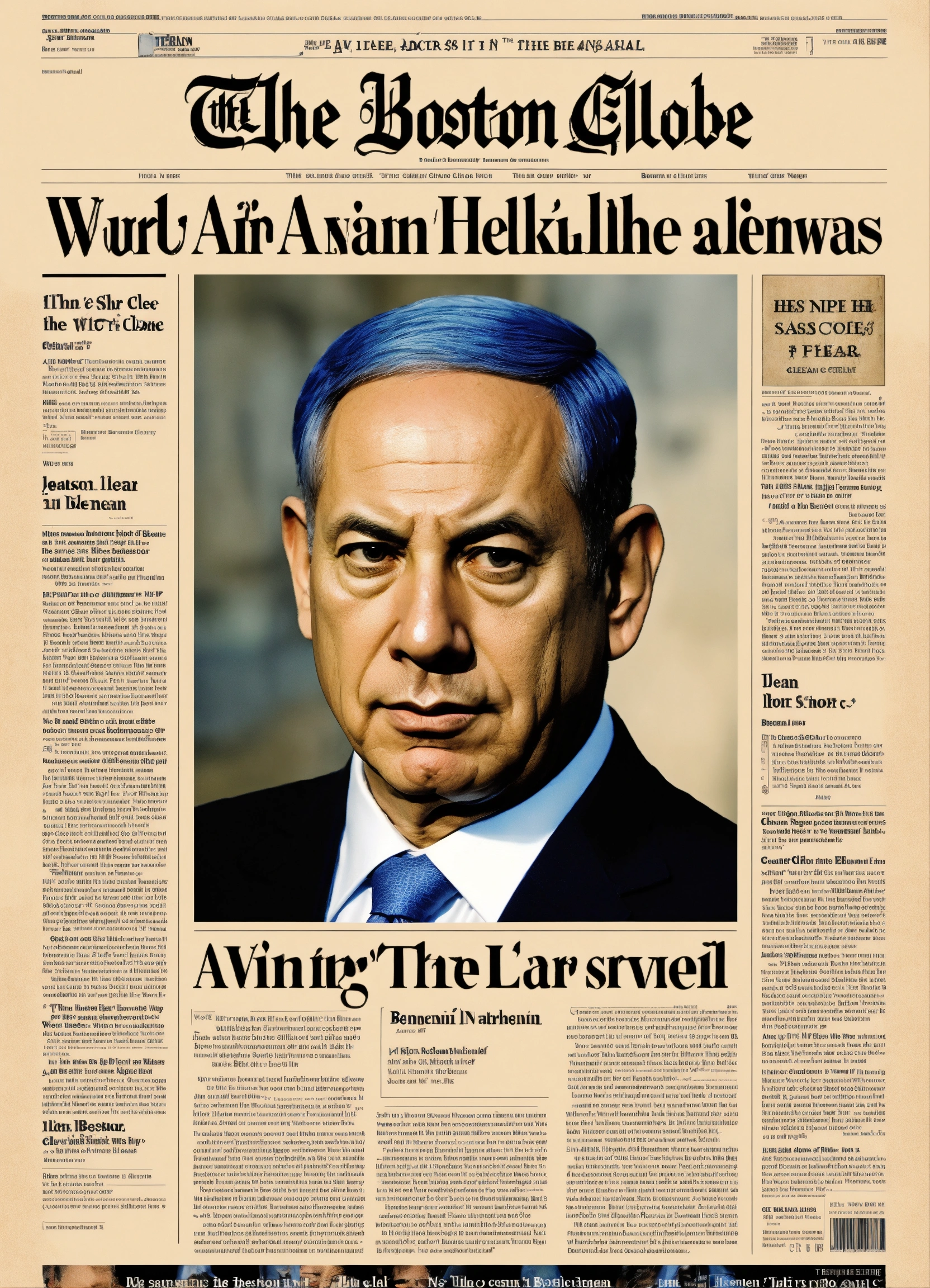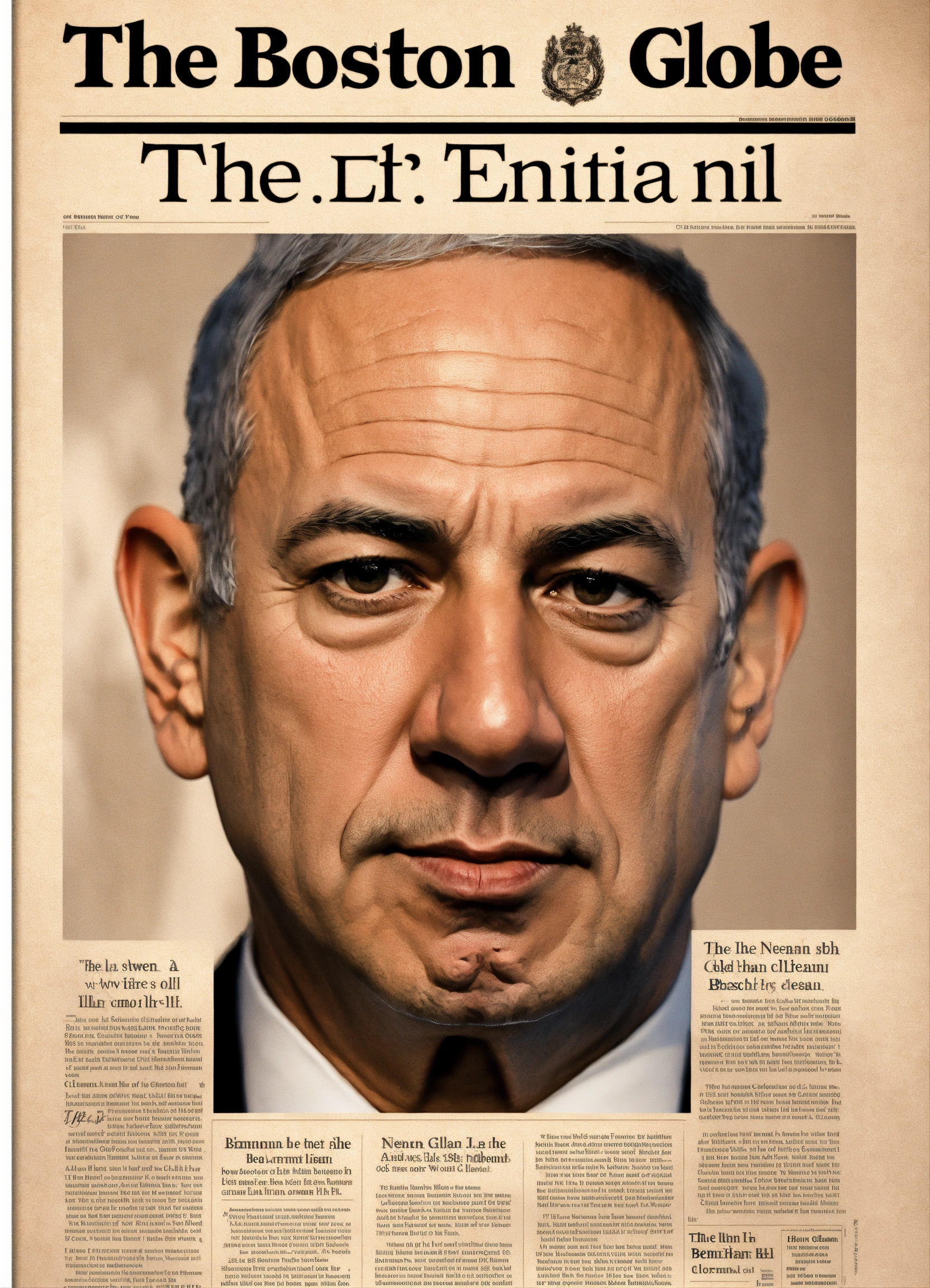 "the boston globe" front page of benjamin netanyahu, looking troubled, old, detached, photo realistic, high detailed, detailed face, article's text saying the word "the liar", clean, typography