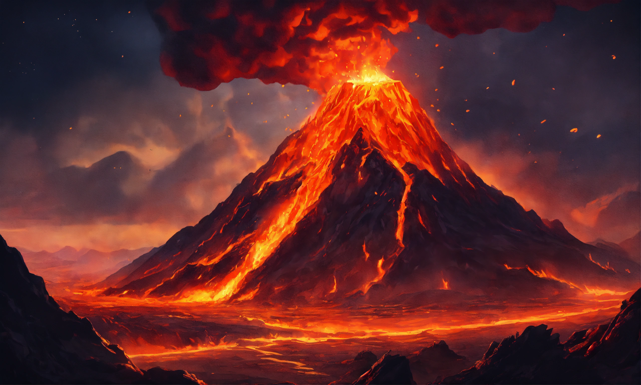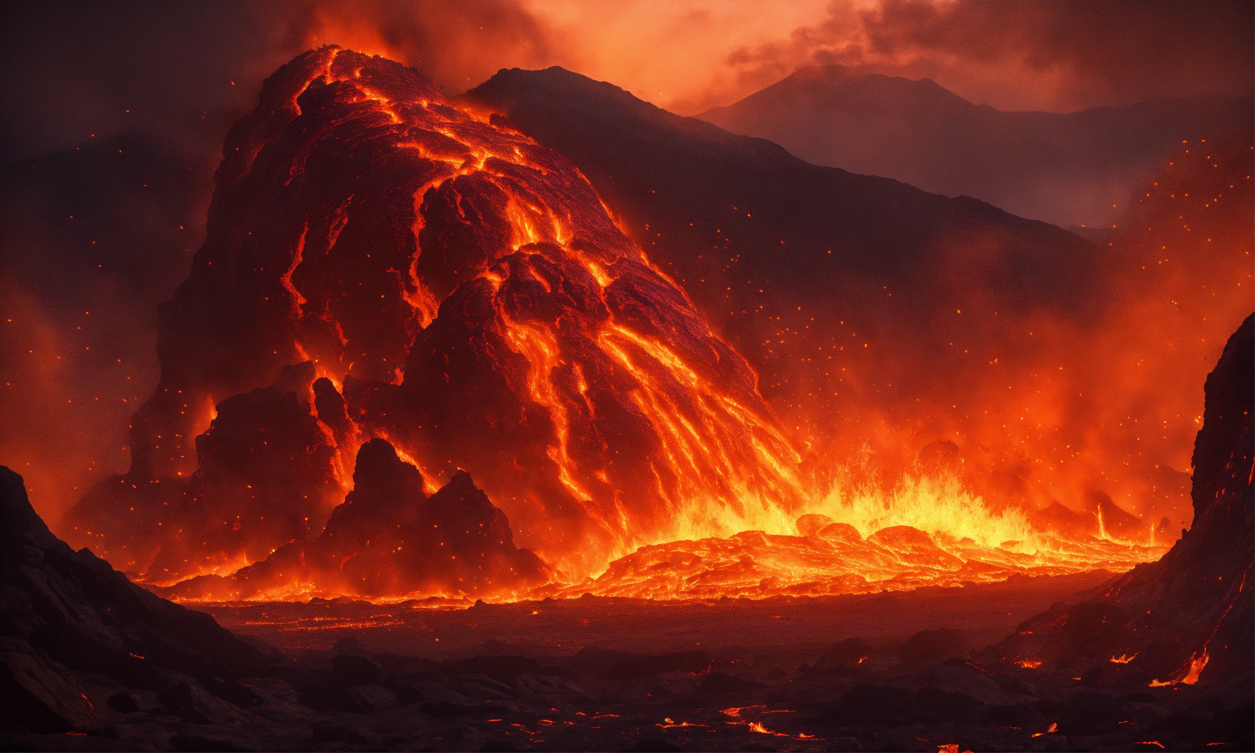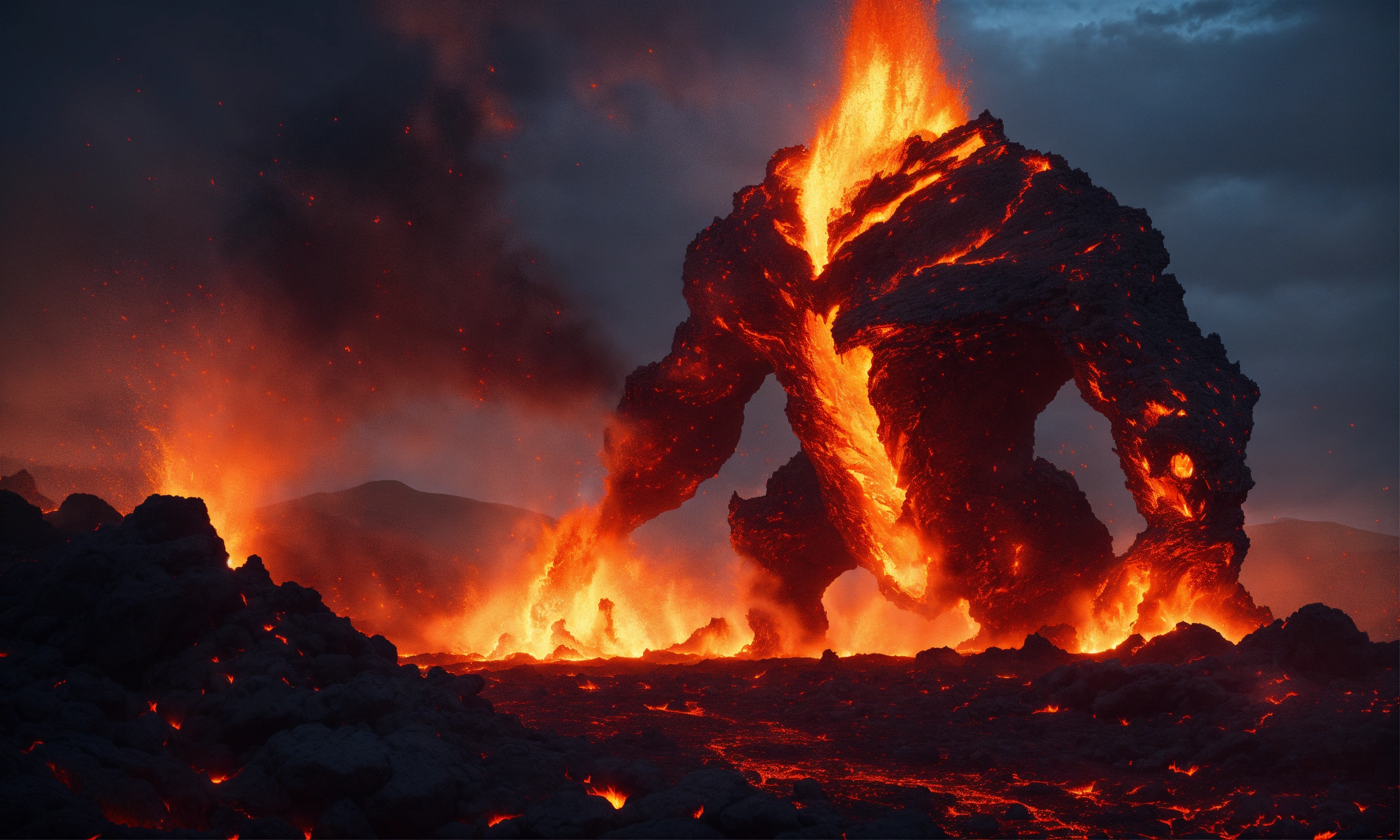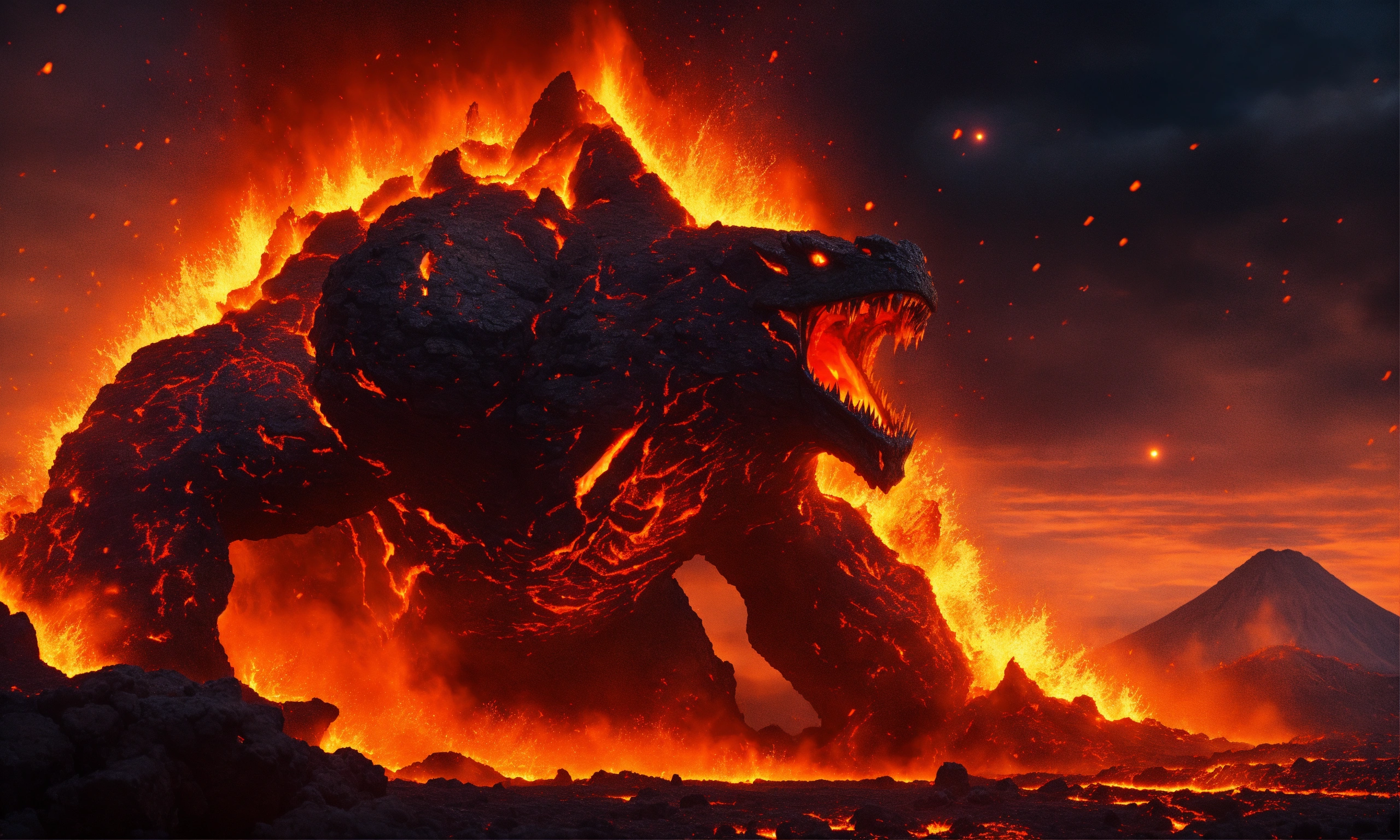 Massive lava monster destroying the landscape, coming out of a volcano, screaming, hurling molten rocks, at night time