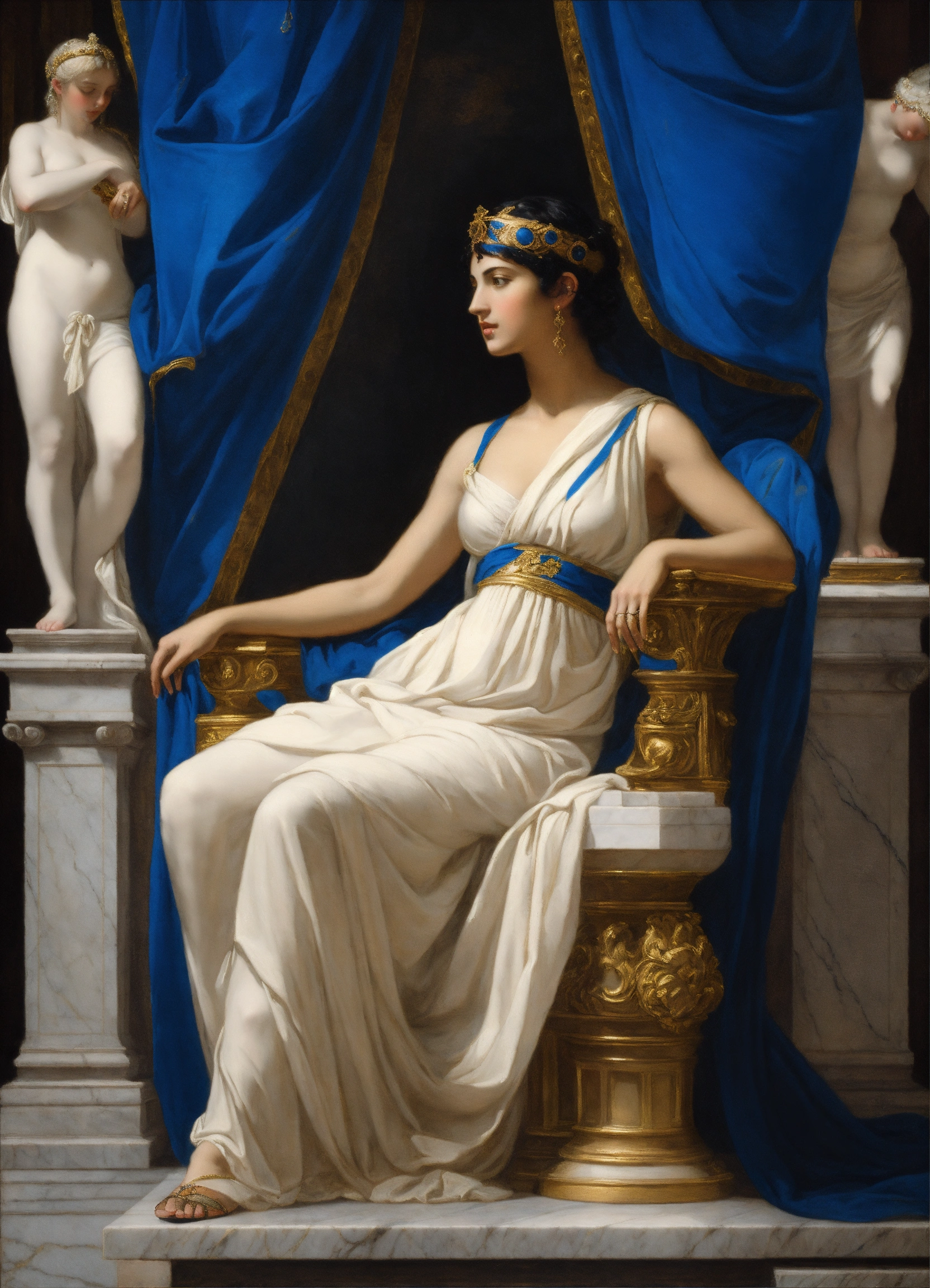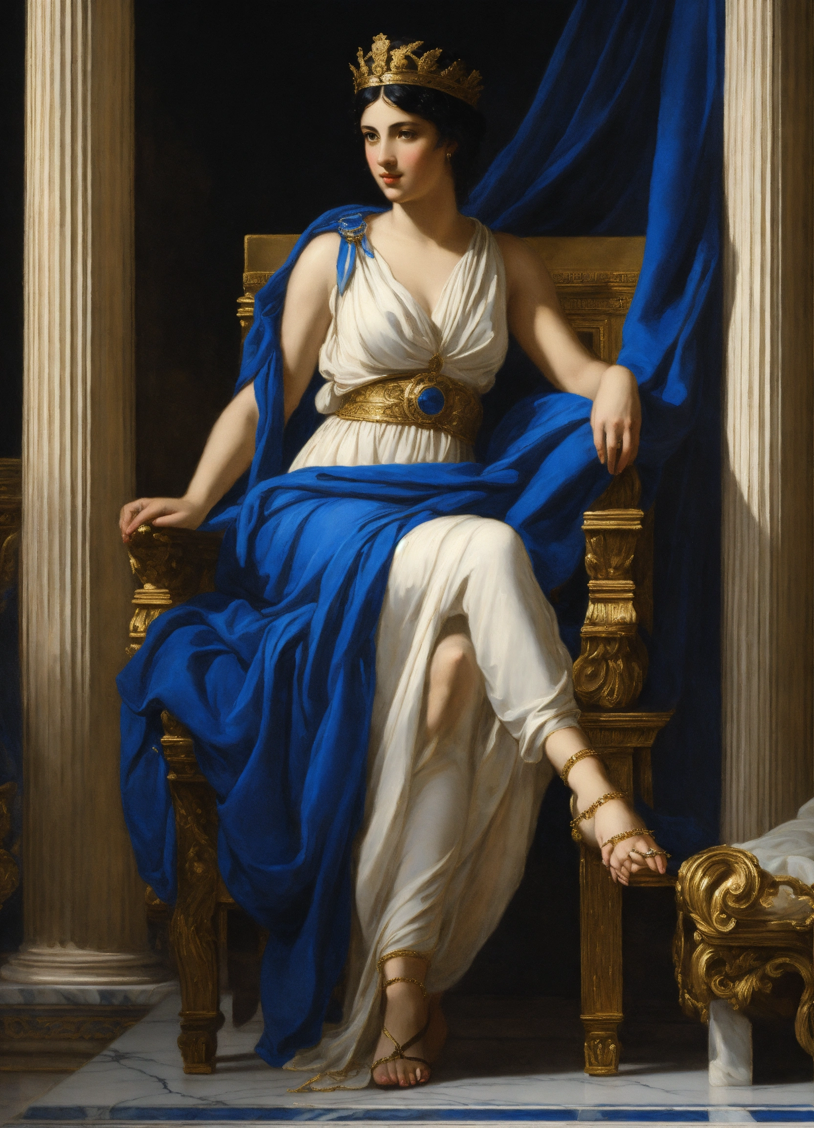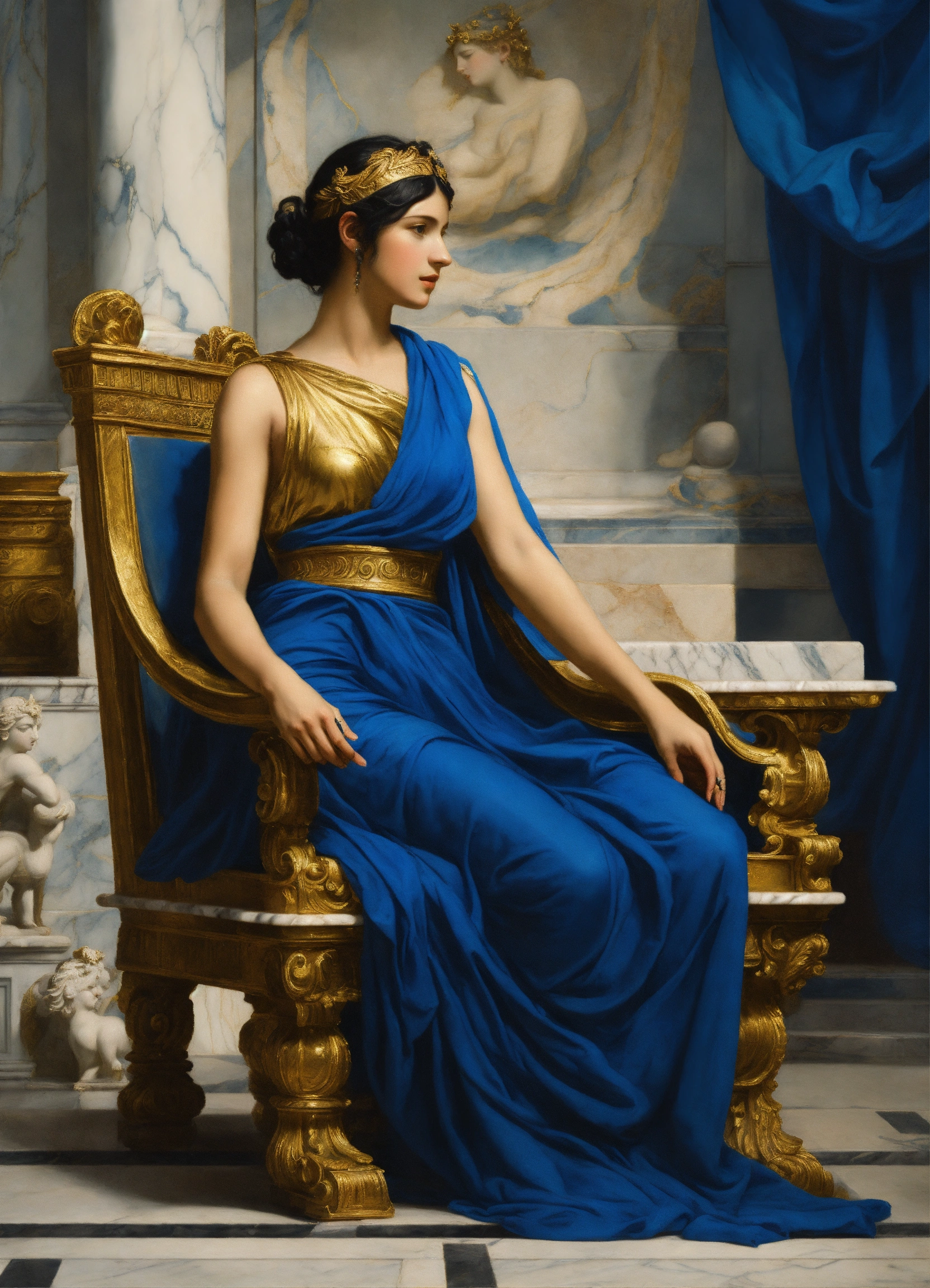 Neoclassical art, neoclassical painting, full body, hera, greek goddess, enticing woman, black hair, royal blue toga, marble throne