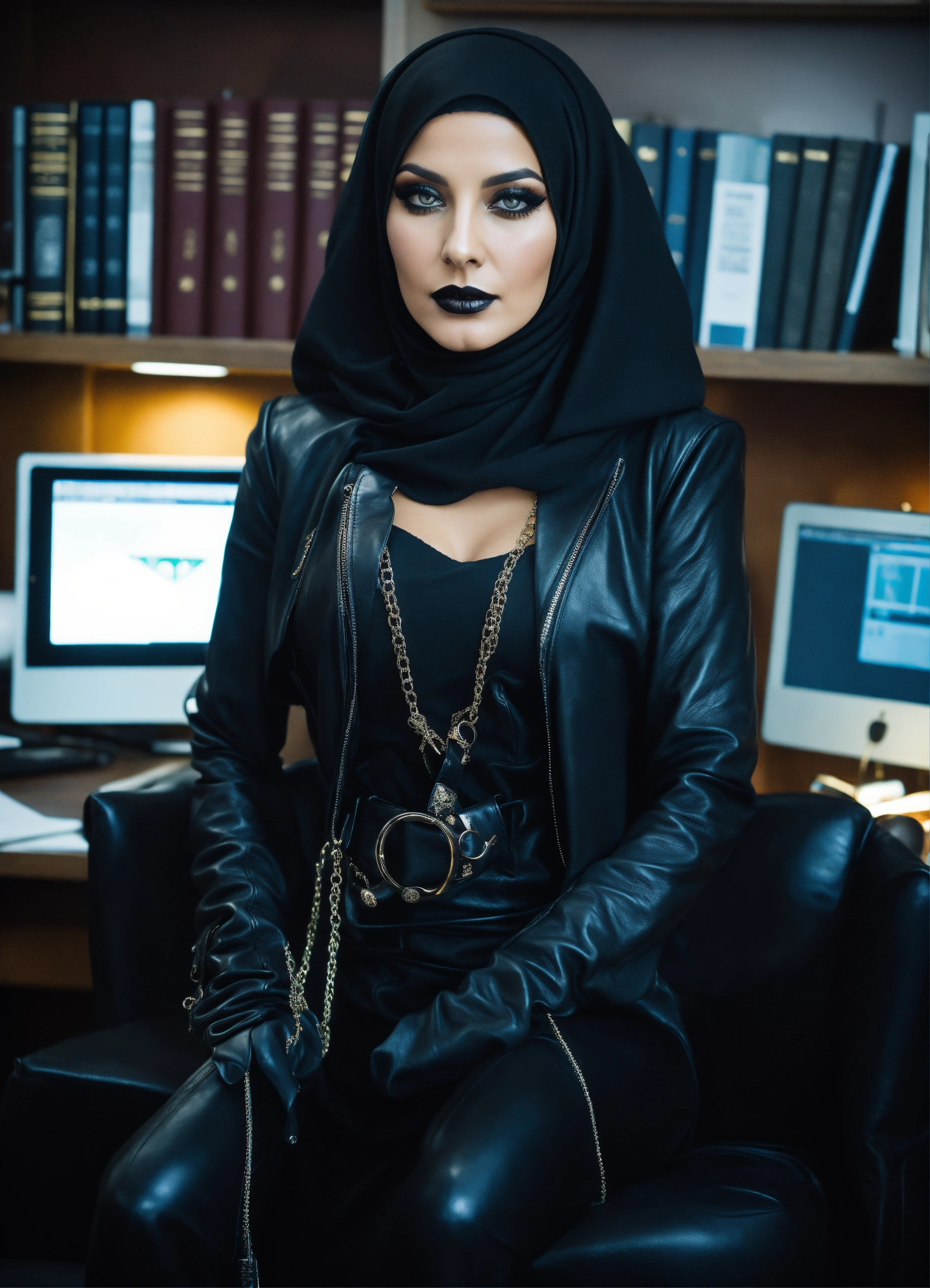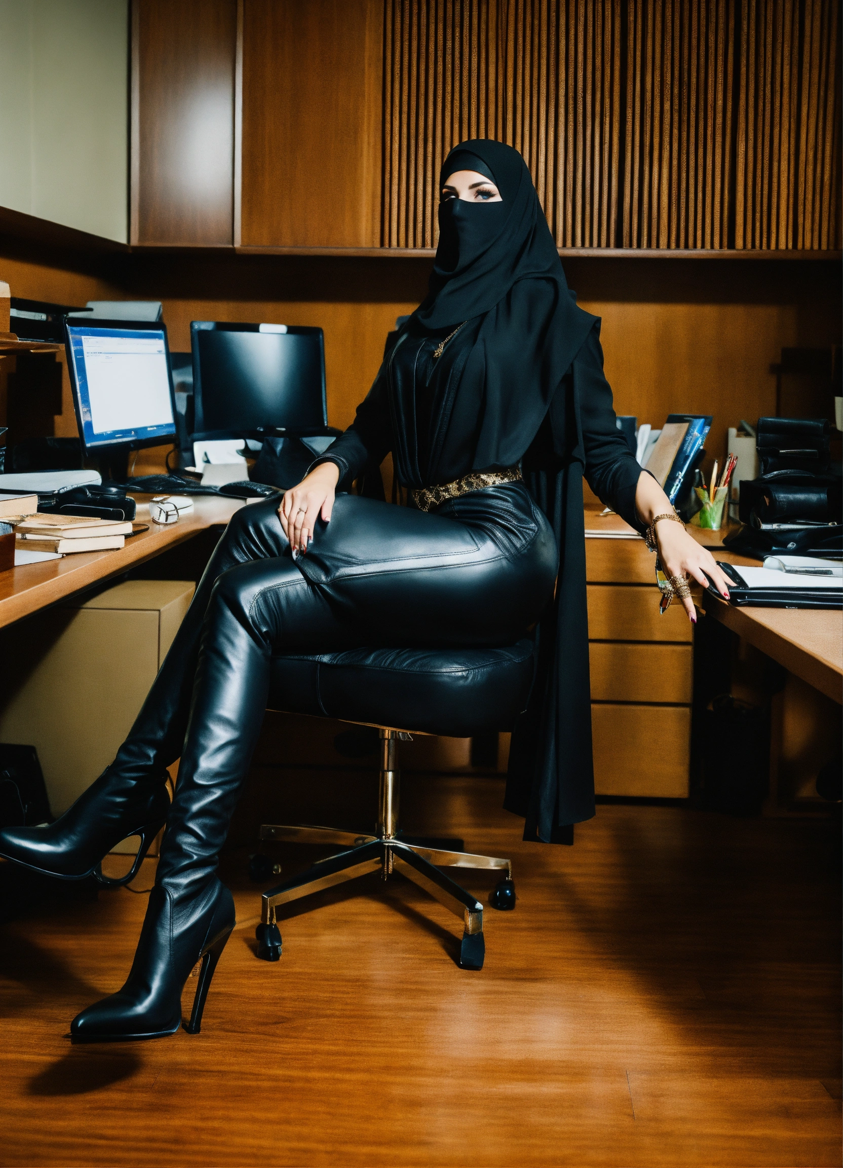 Occult satanic sorceress in office suite wearing a black leather hijab niquab, only her hypnotic eyes showing, black leather high heeled boots & blacl leather jobs, hypnotizng in her office