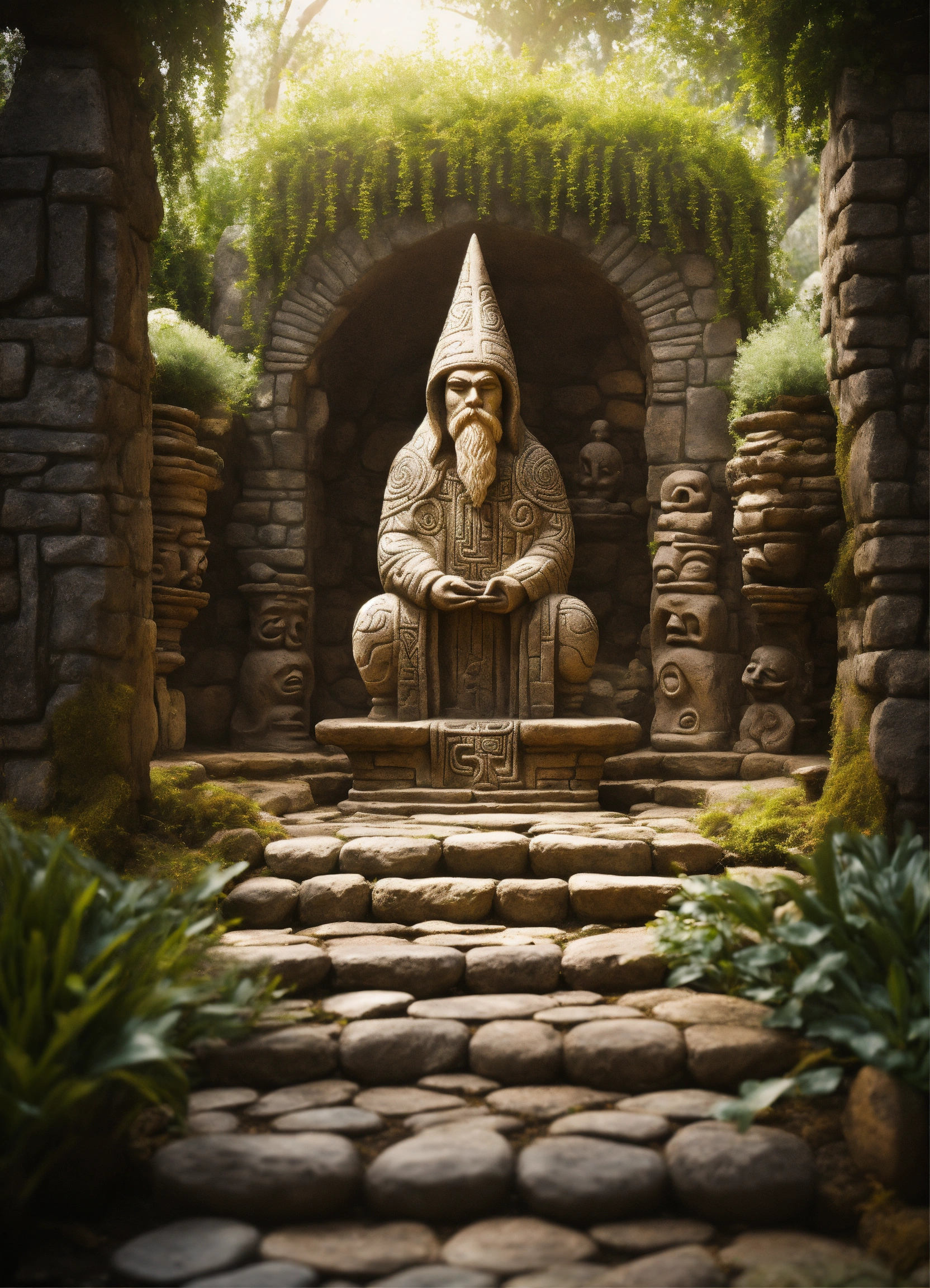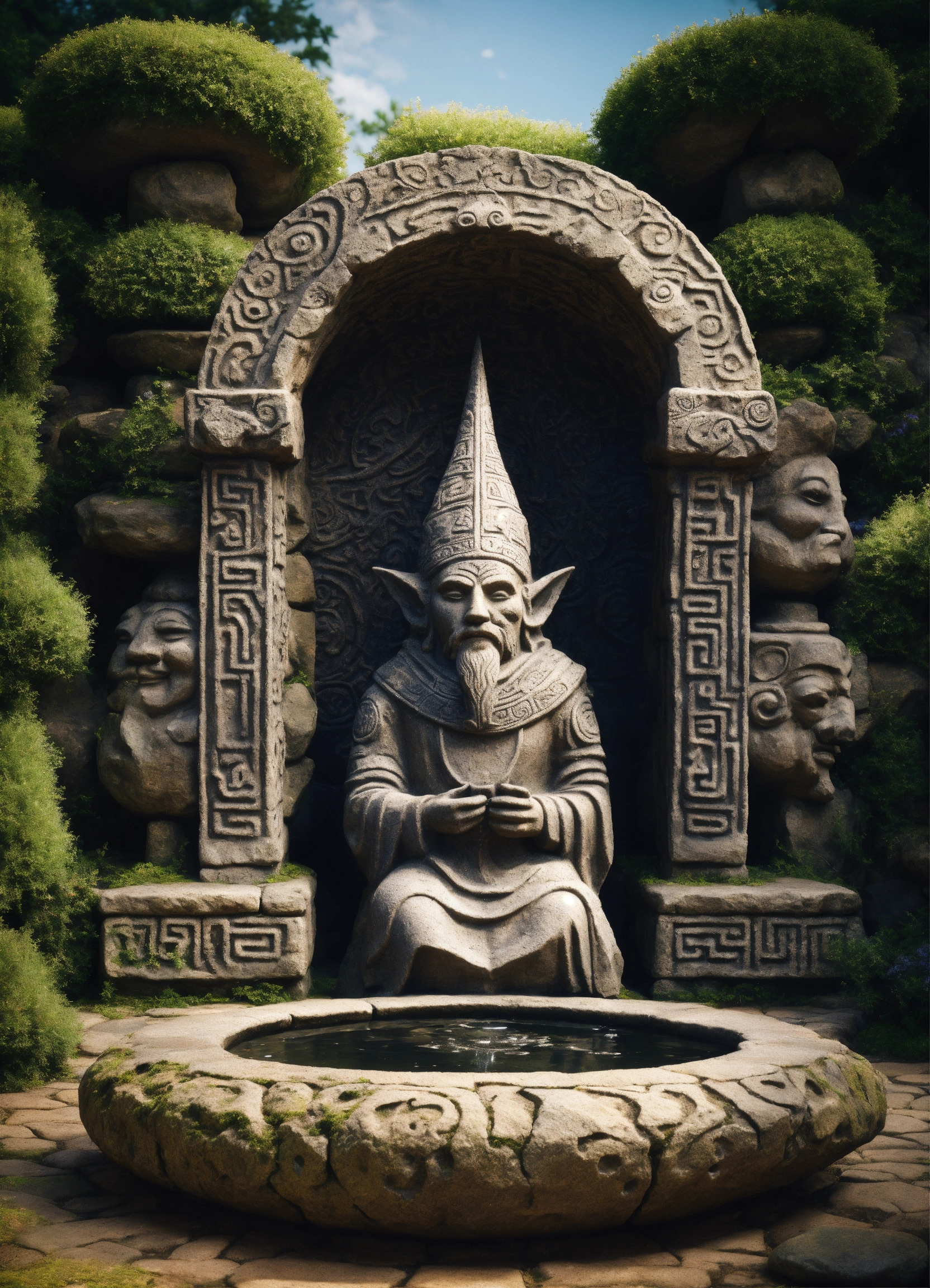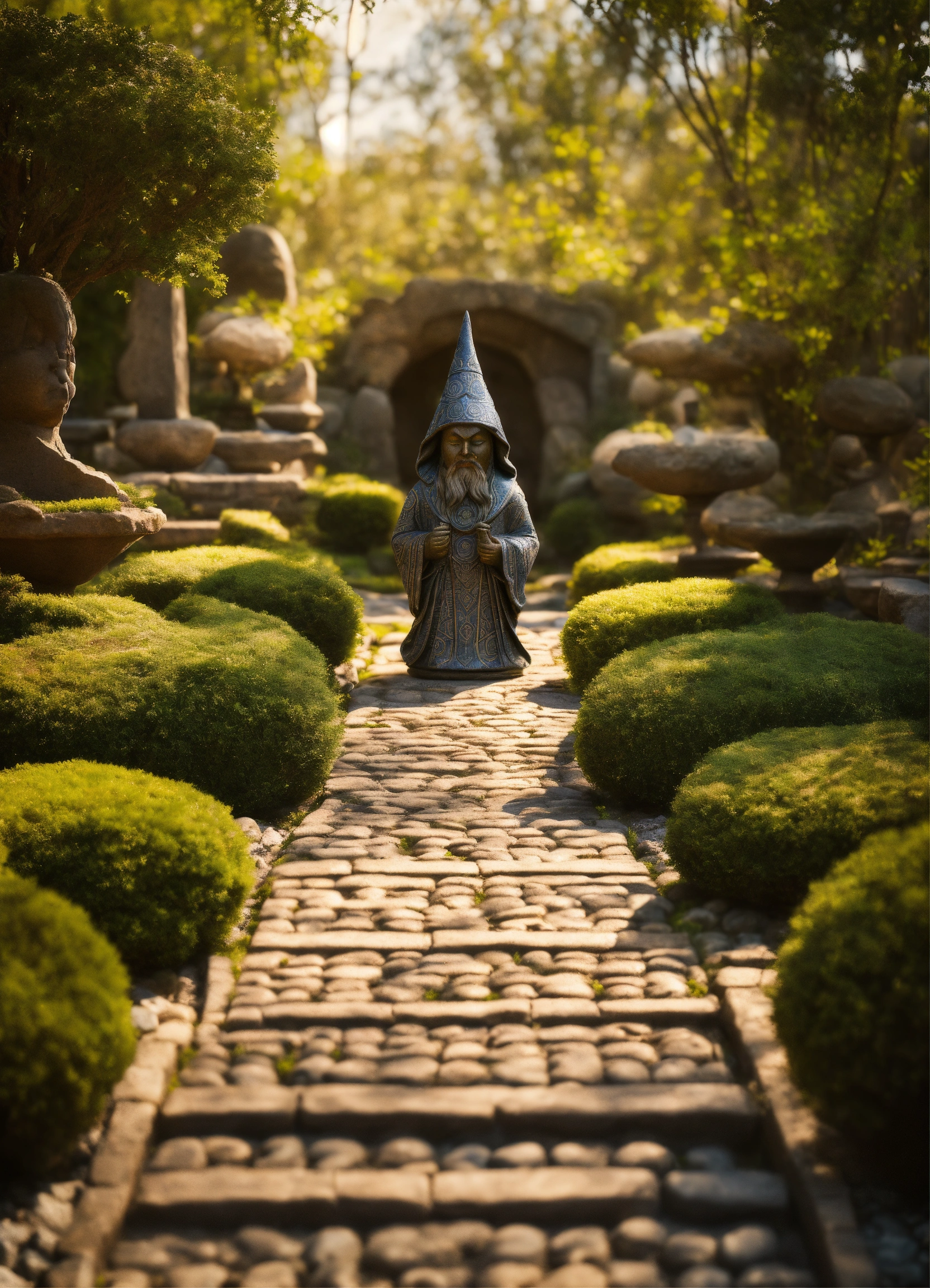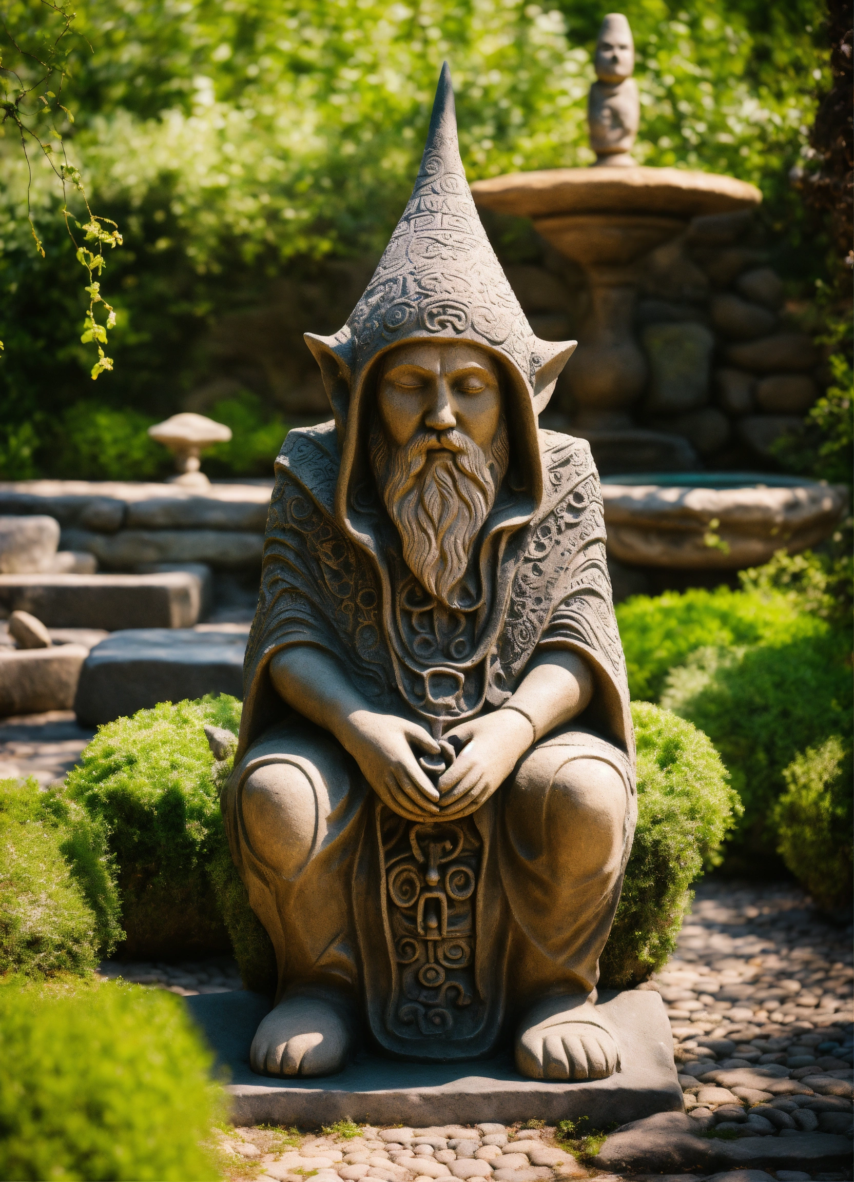 An ancient spiritual hooded gnome, stone pathway rock garden.sculptured . style of alex grey, giger.unreal engine.totem sculptures. patterned stone pathway, labyrinth.courtyard.meditative.water feature