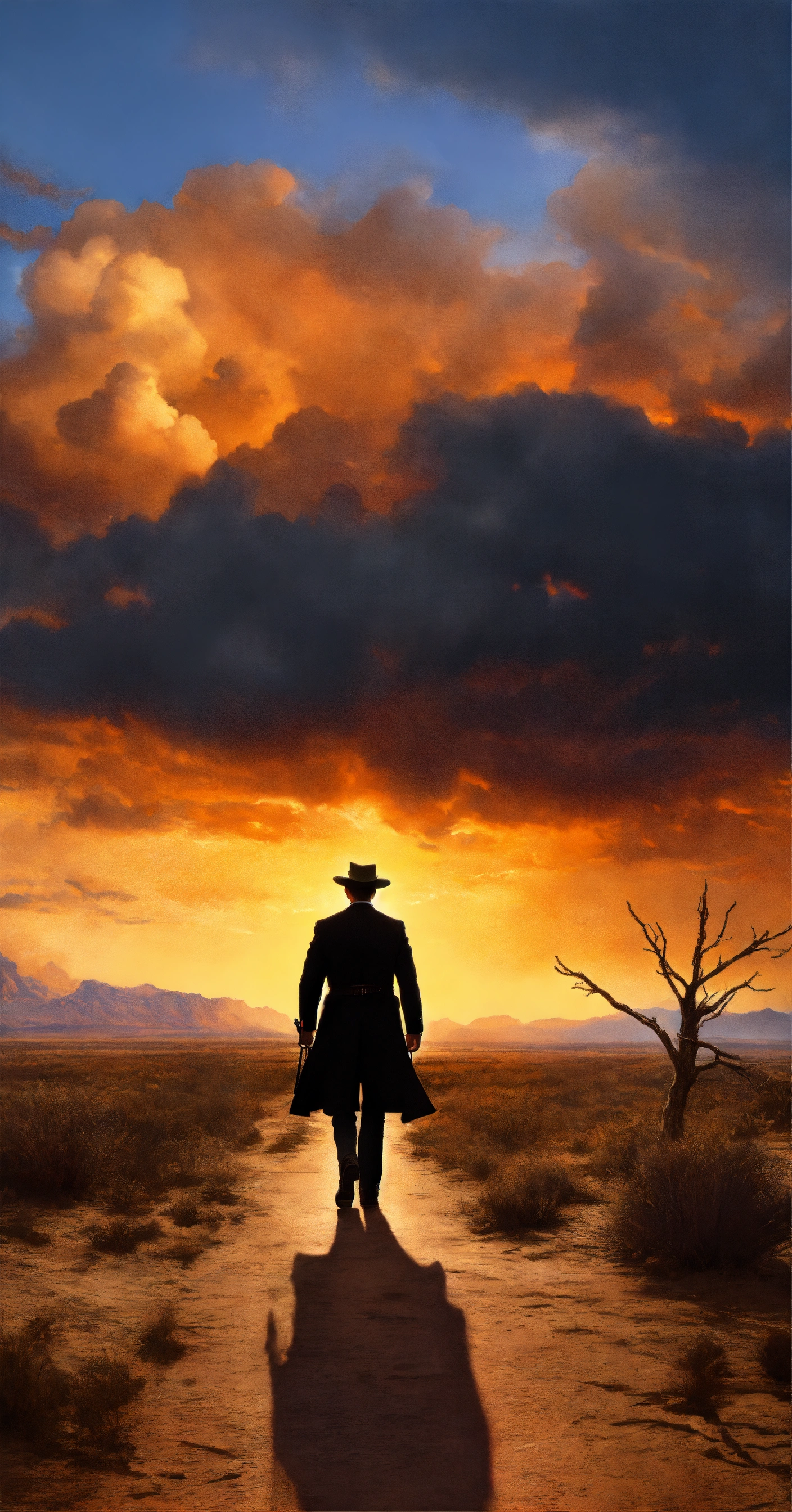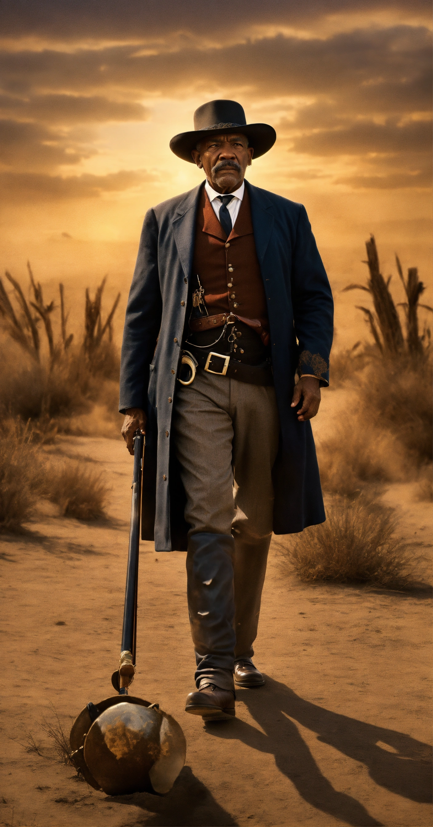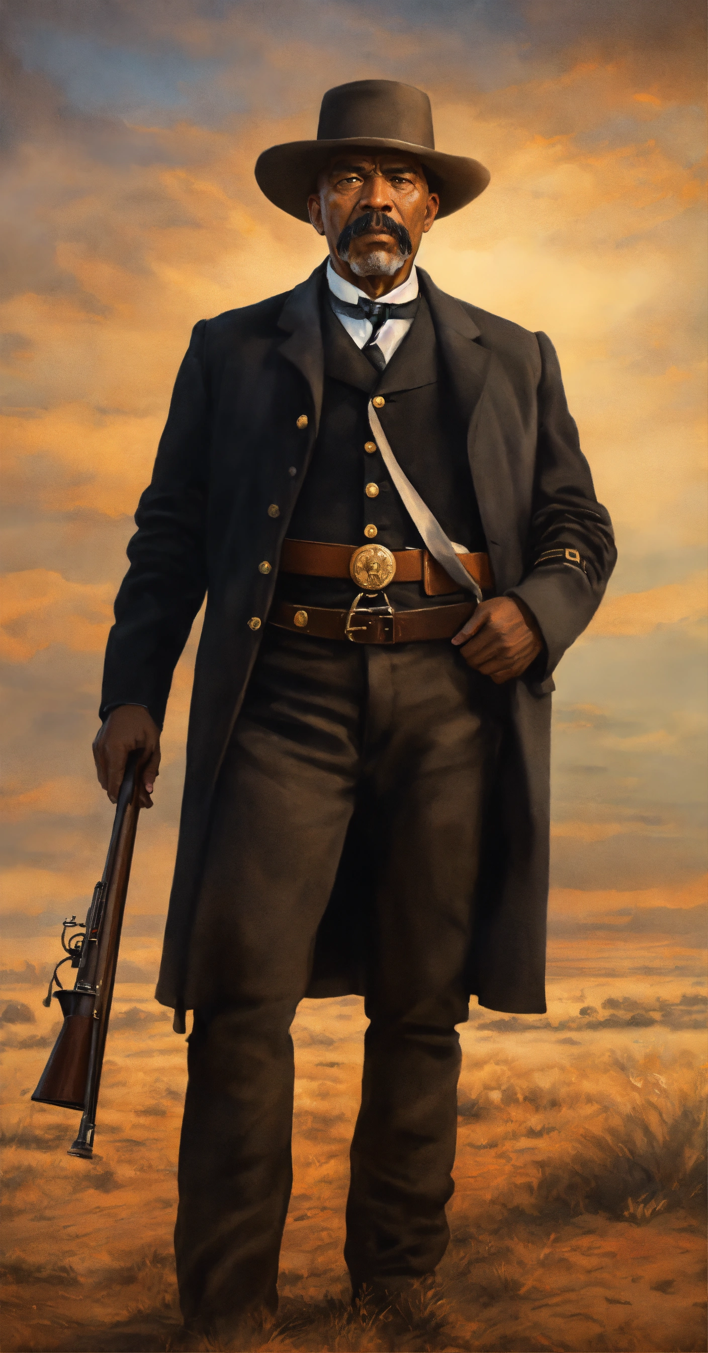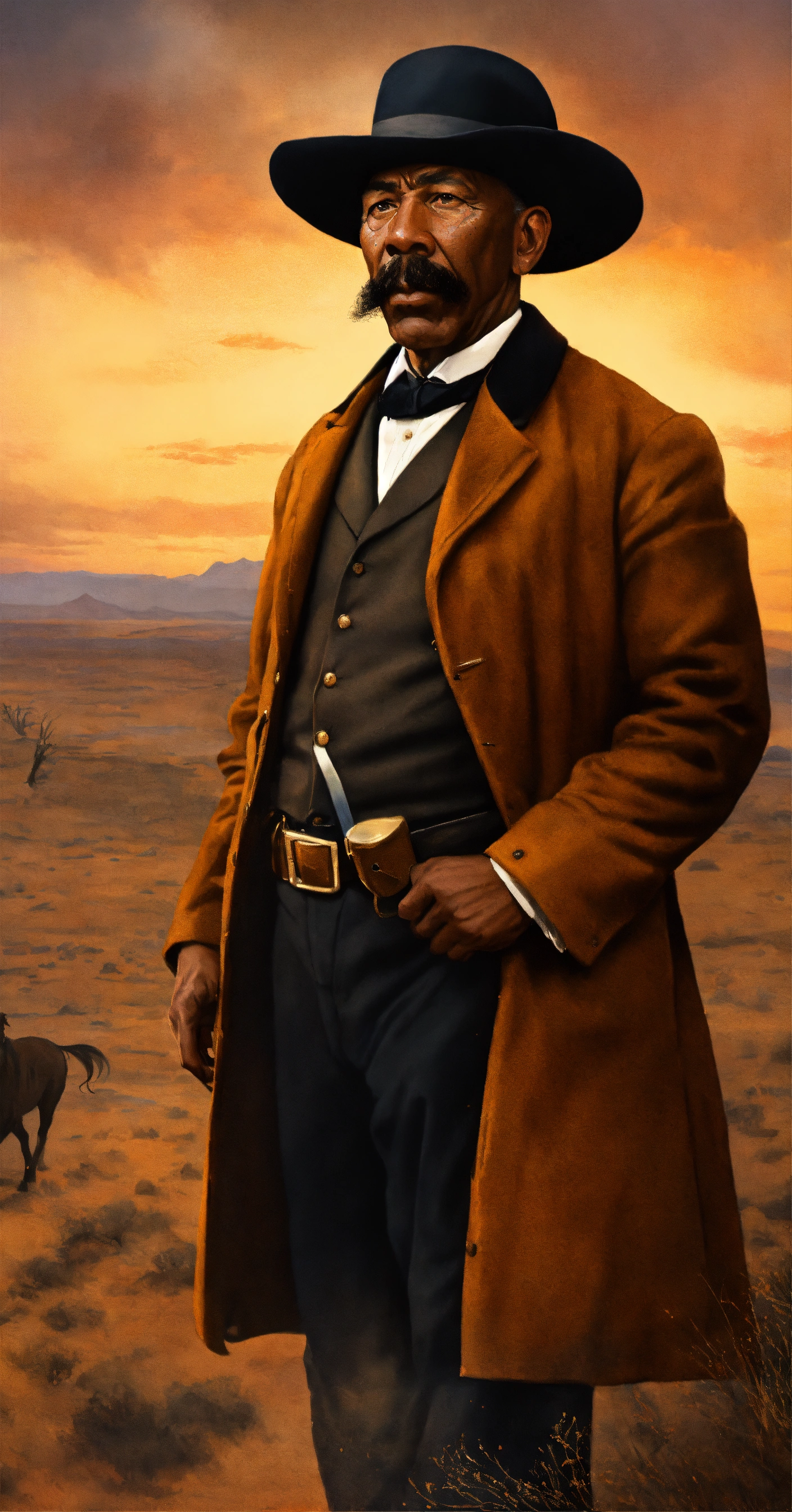 A powerful, hyper-realistic, atmospheric and cinematographic image illustrating an aged bass reeves, looking into the horizon, leaving an indelible mark on the world, symbolizing the enduring impact of one man's extraordinary journey.