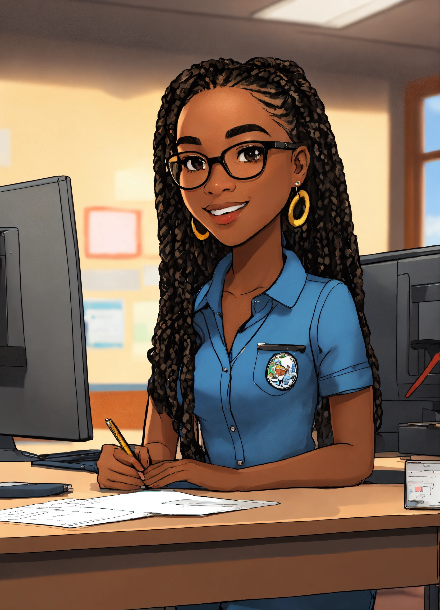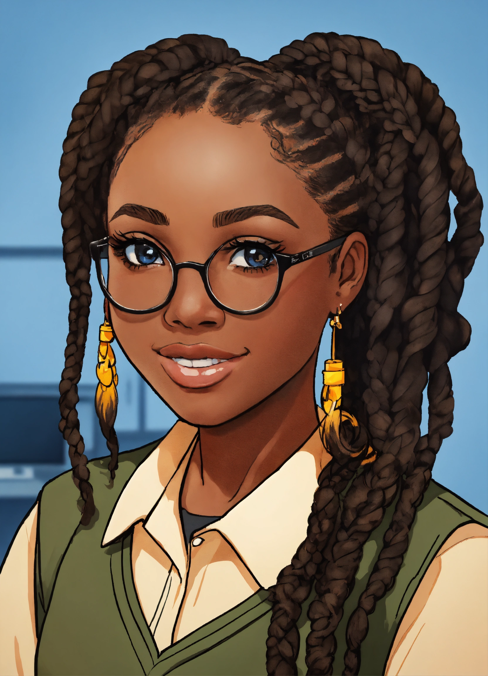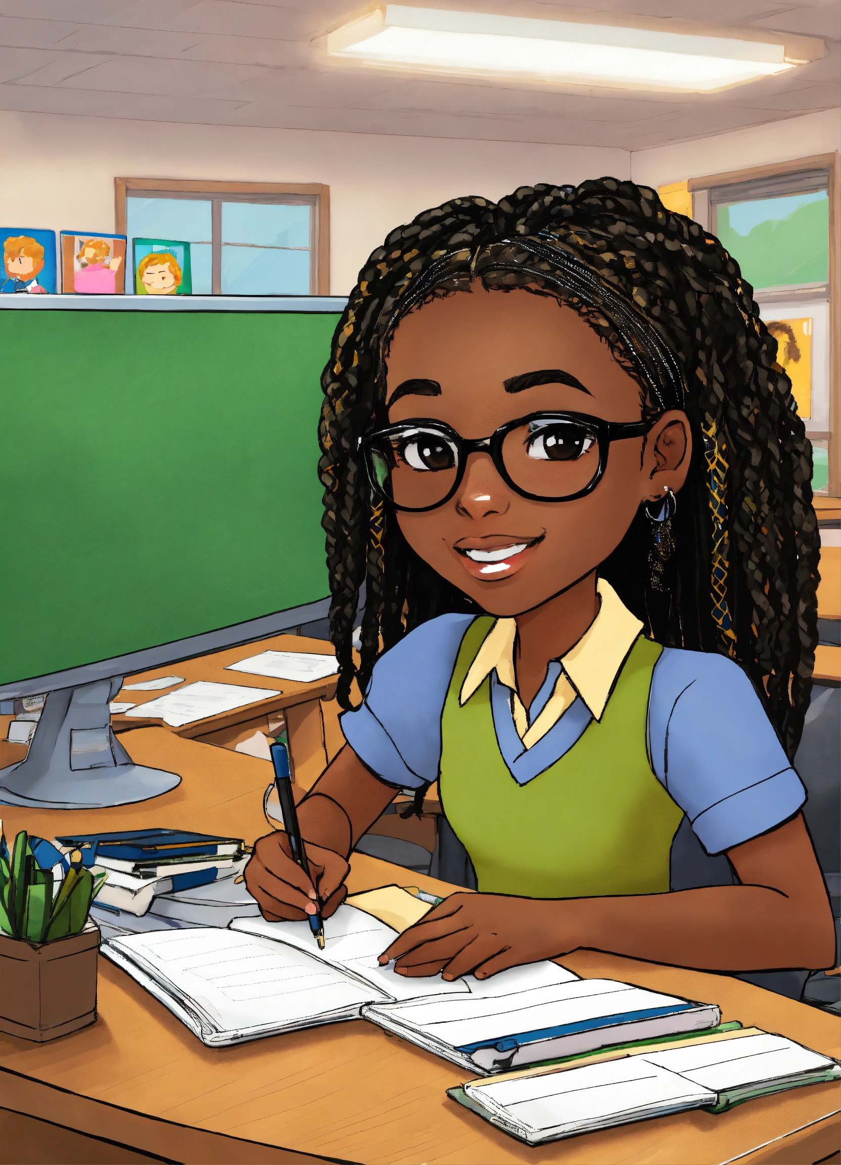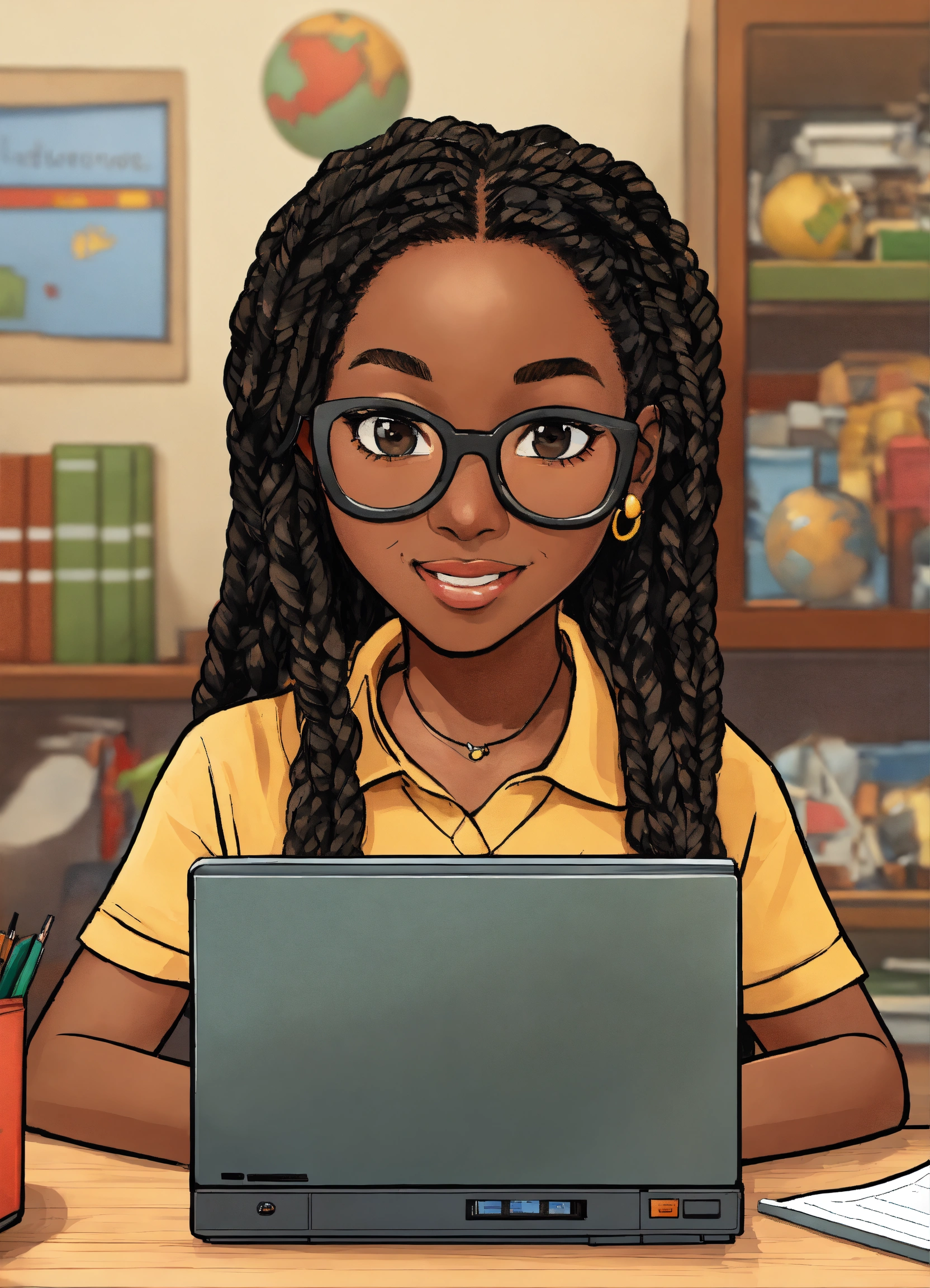Generate an artistic representation of a chibi-style young african american teacher with distinctive black and blonde braids and long locs, exuding a warm and inviting demeanor. place the teacher at a substantial white desk in the center of a middle school classroom. the classroom should be filled with an array of laptops on each desk, creating a technologically enriched learning environment. ensure that the artwork is realistic and has a resolution of 32k.