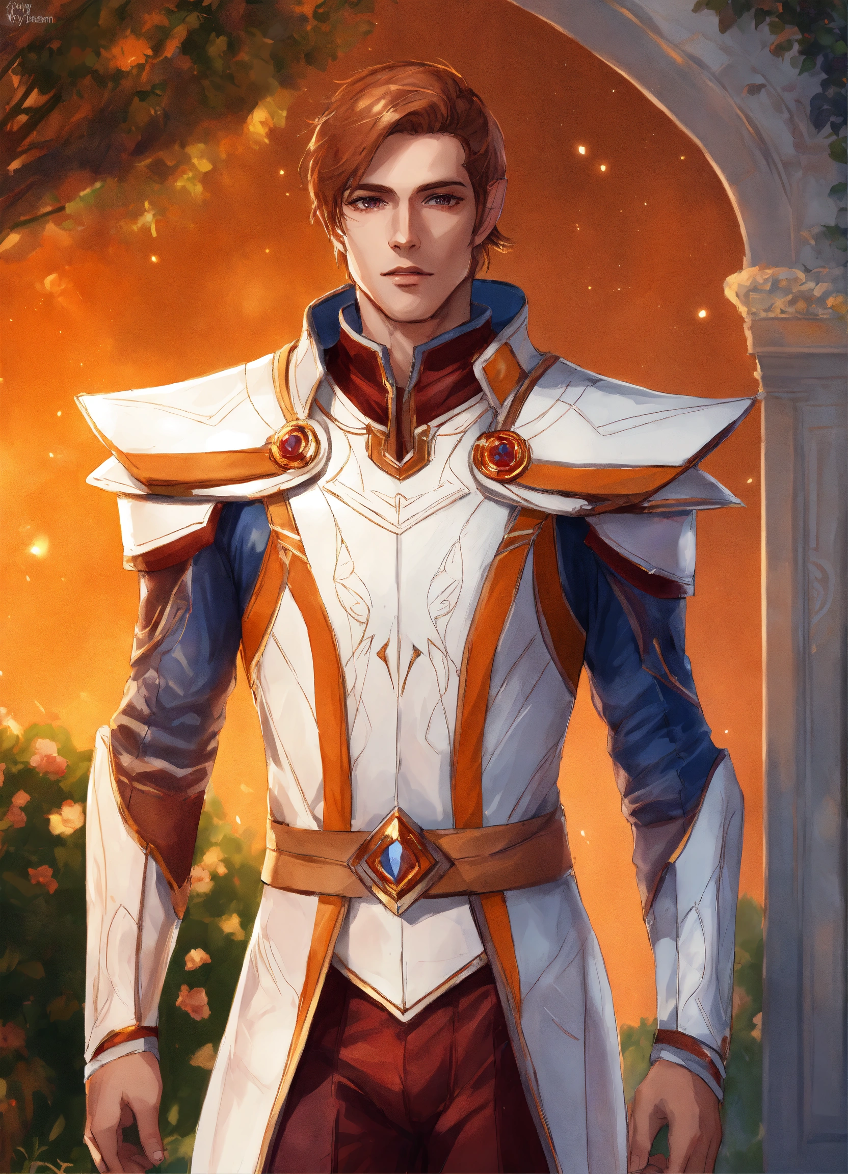 Drawing of a sci fi high elf, space, palace, white cybernetic leather royal outfit with orange and maroon trim, elf, male, handsome, 22 years old, brown hair, standing in a garden