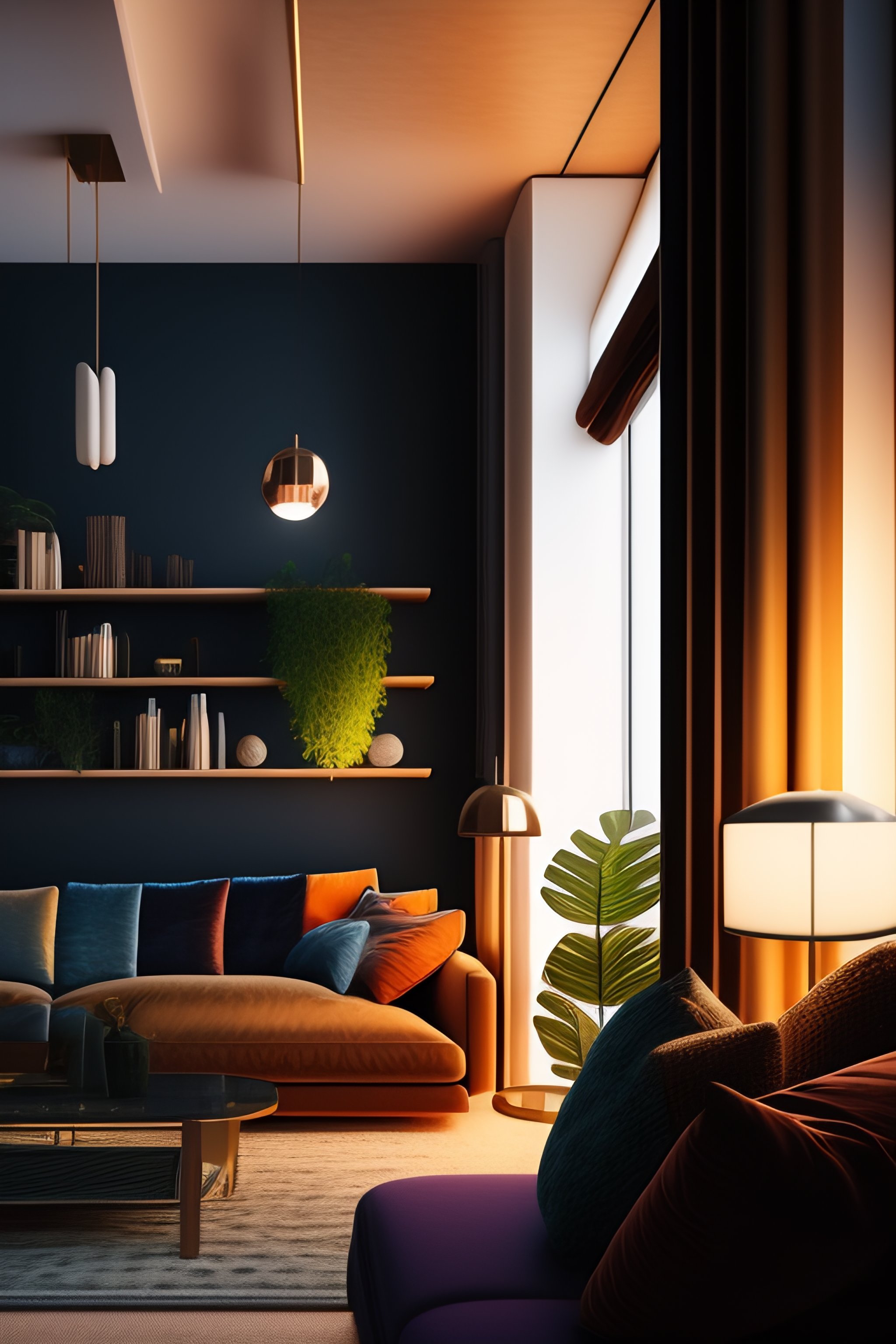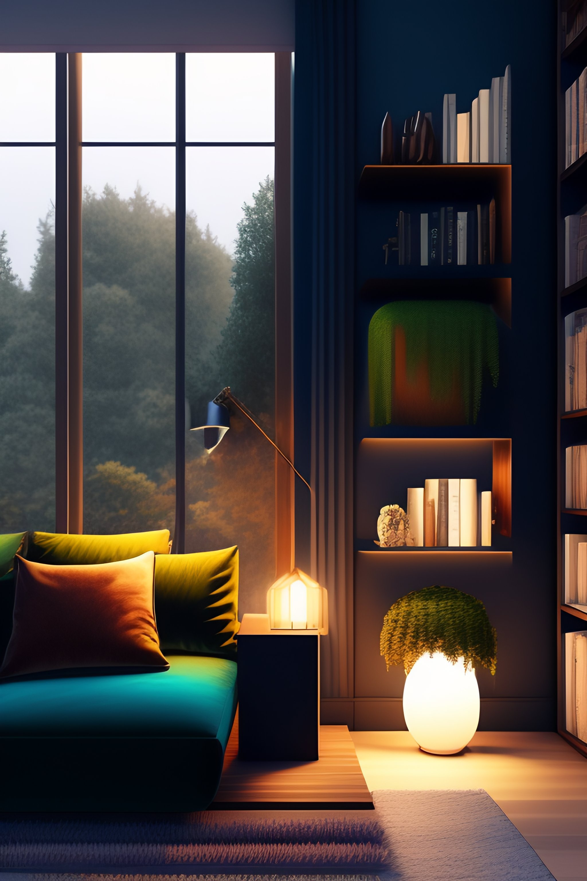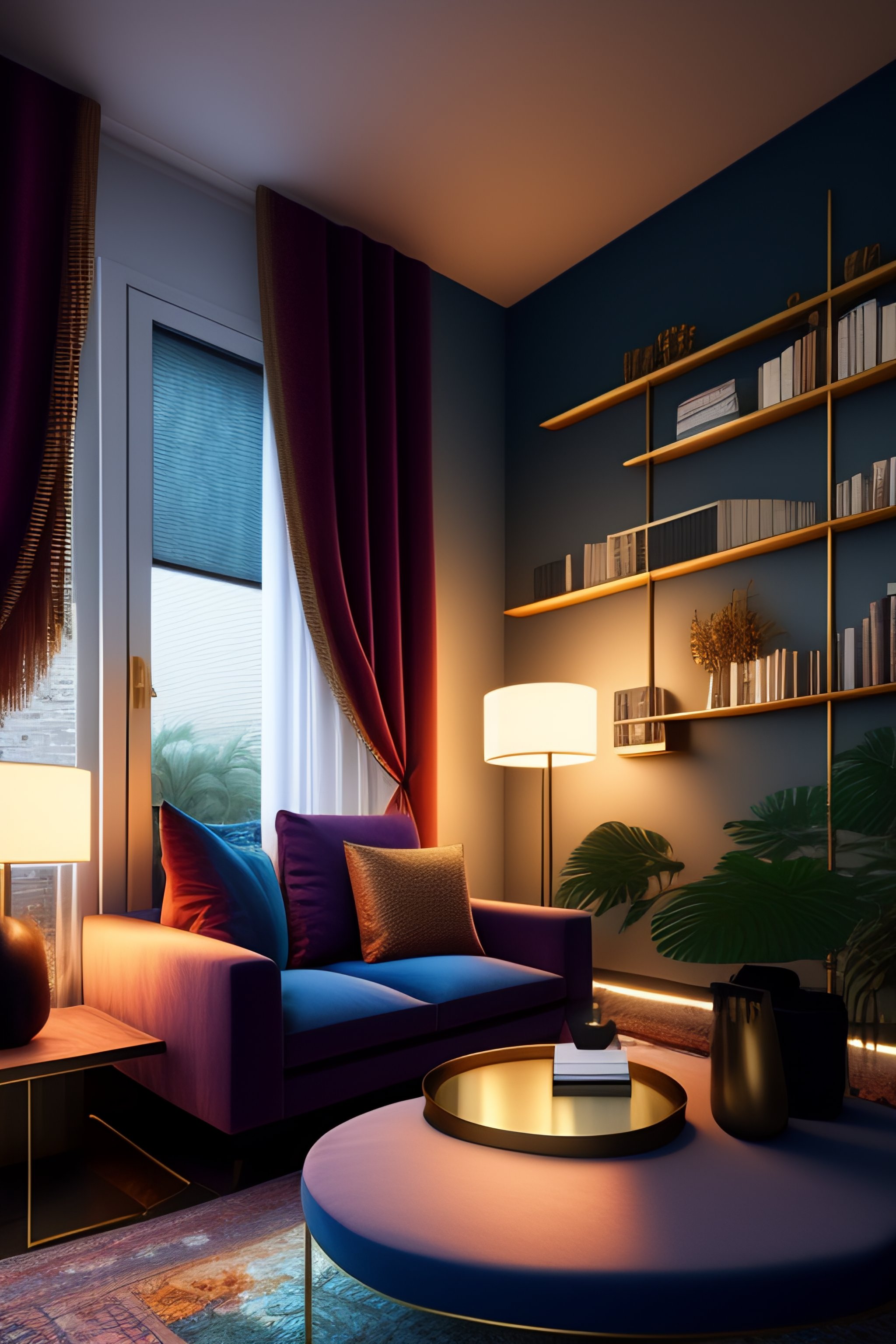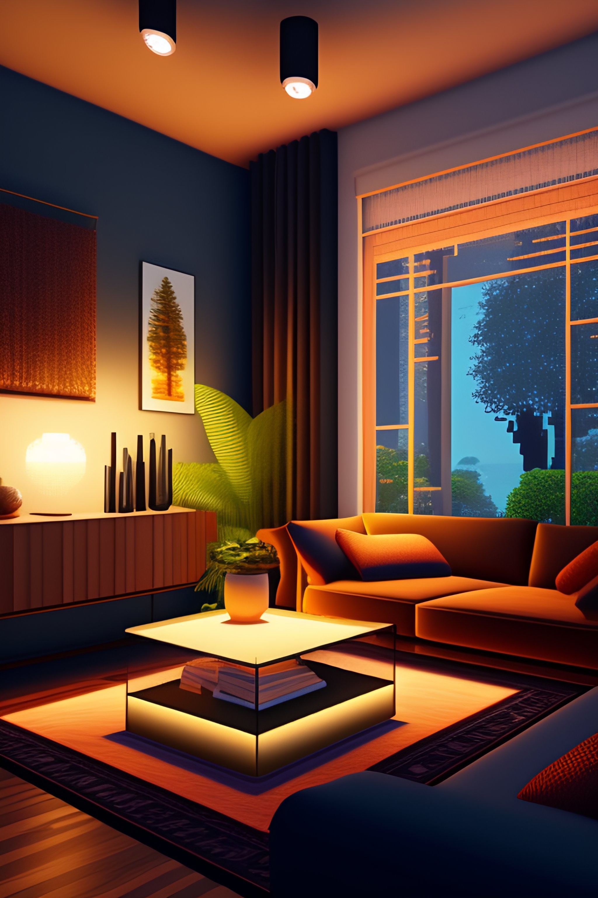Pixel art, atmospheric, award winning interior design living room, dusk, cozy and, fabrics and textiles, colorful accents, brass, copper, secluded, many light sources, lamps, hardwood floors, book shelf, couch, desk, balcony door, plants