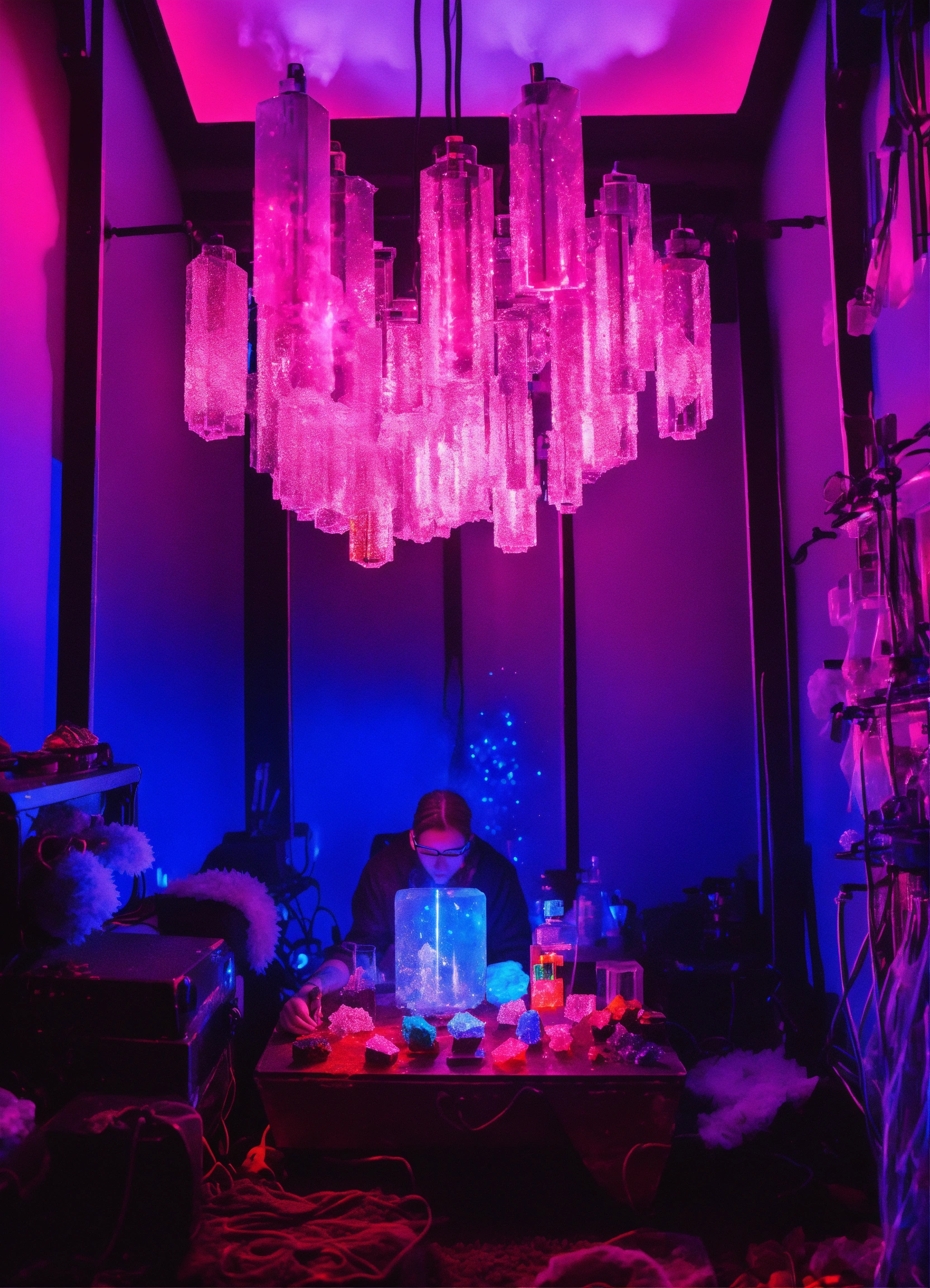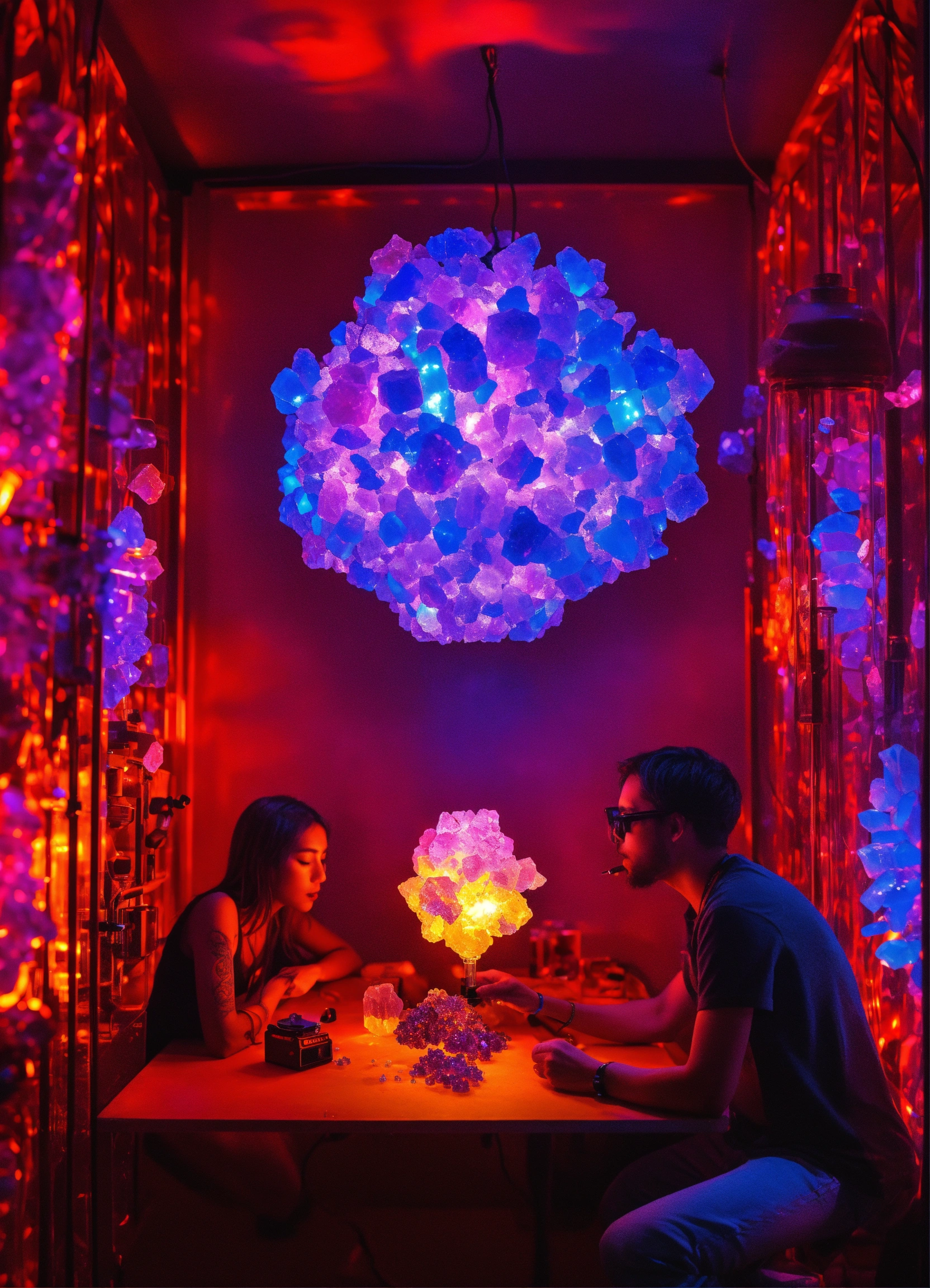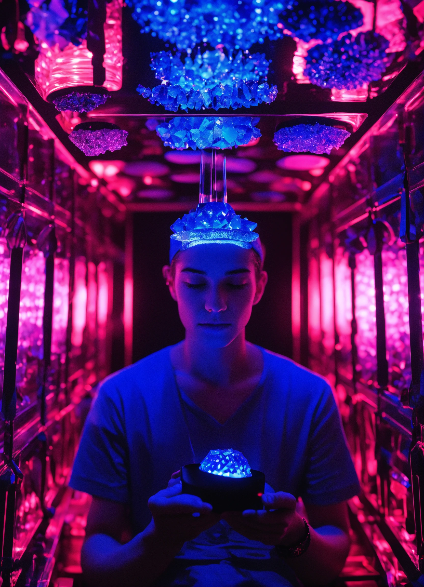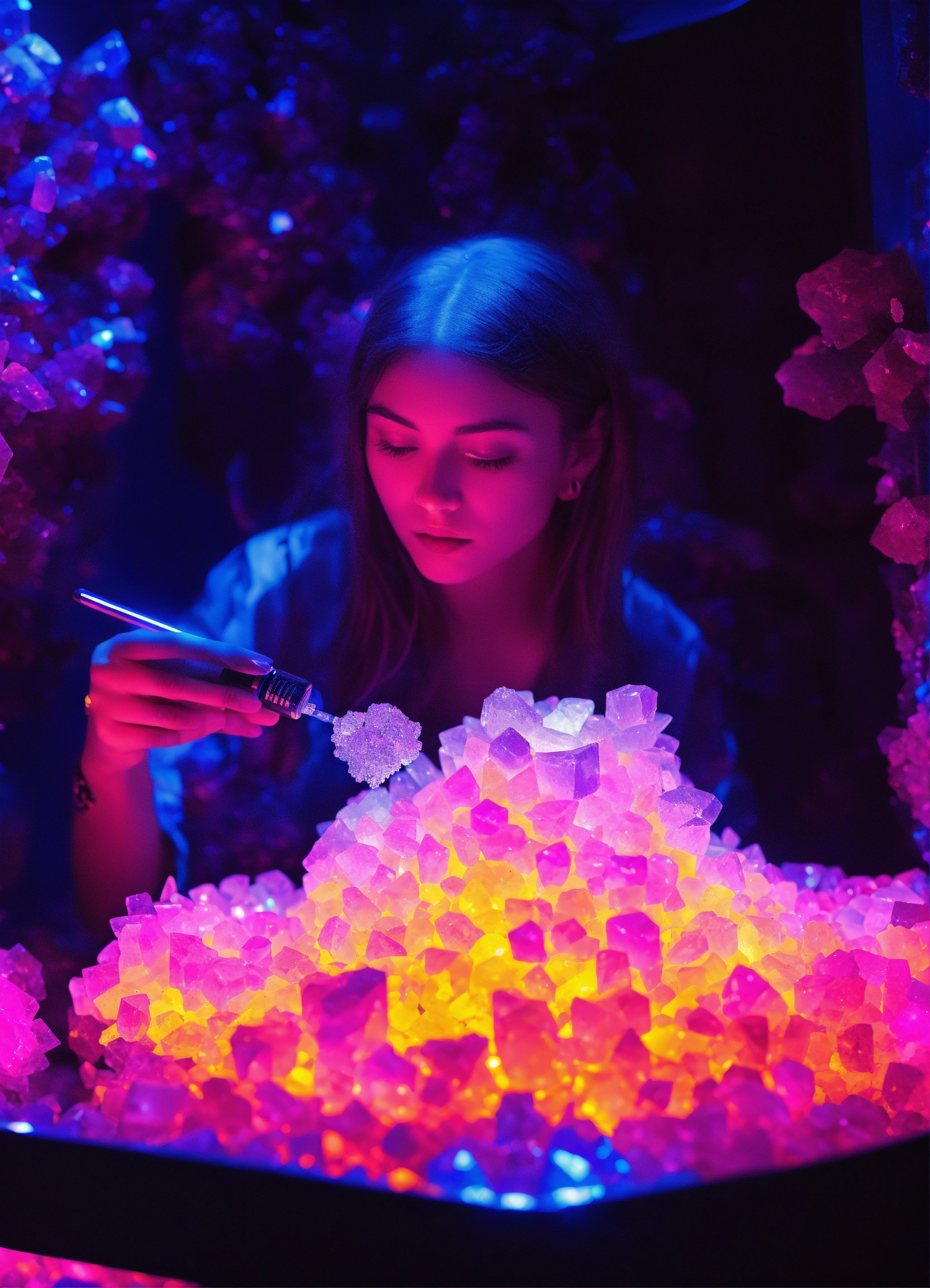 A sapphire individual consuming dmt crystals in a metal vaporizer in a dmt black light neon room experiencing crystal dmt neon ascension