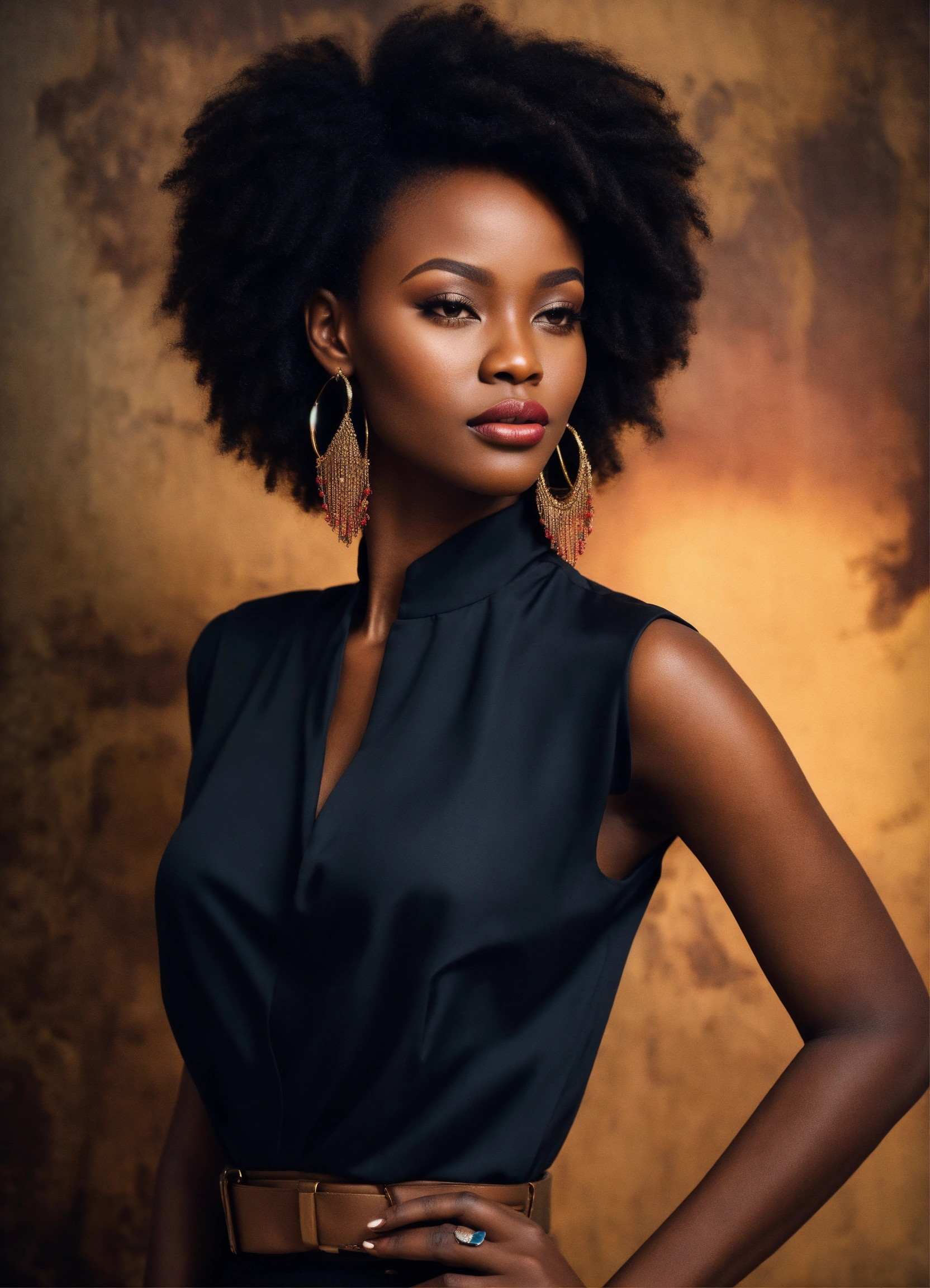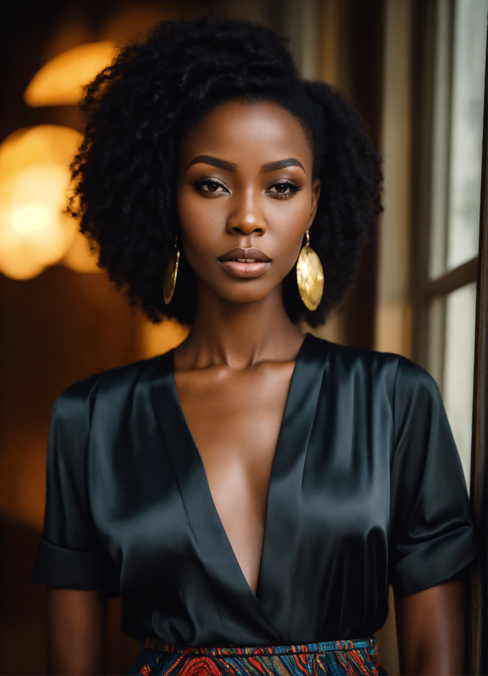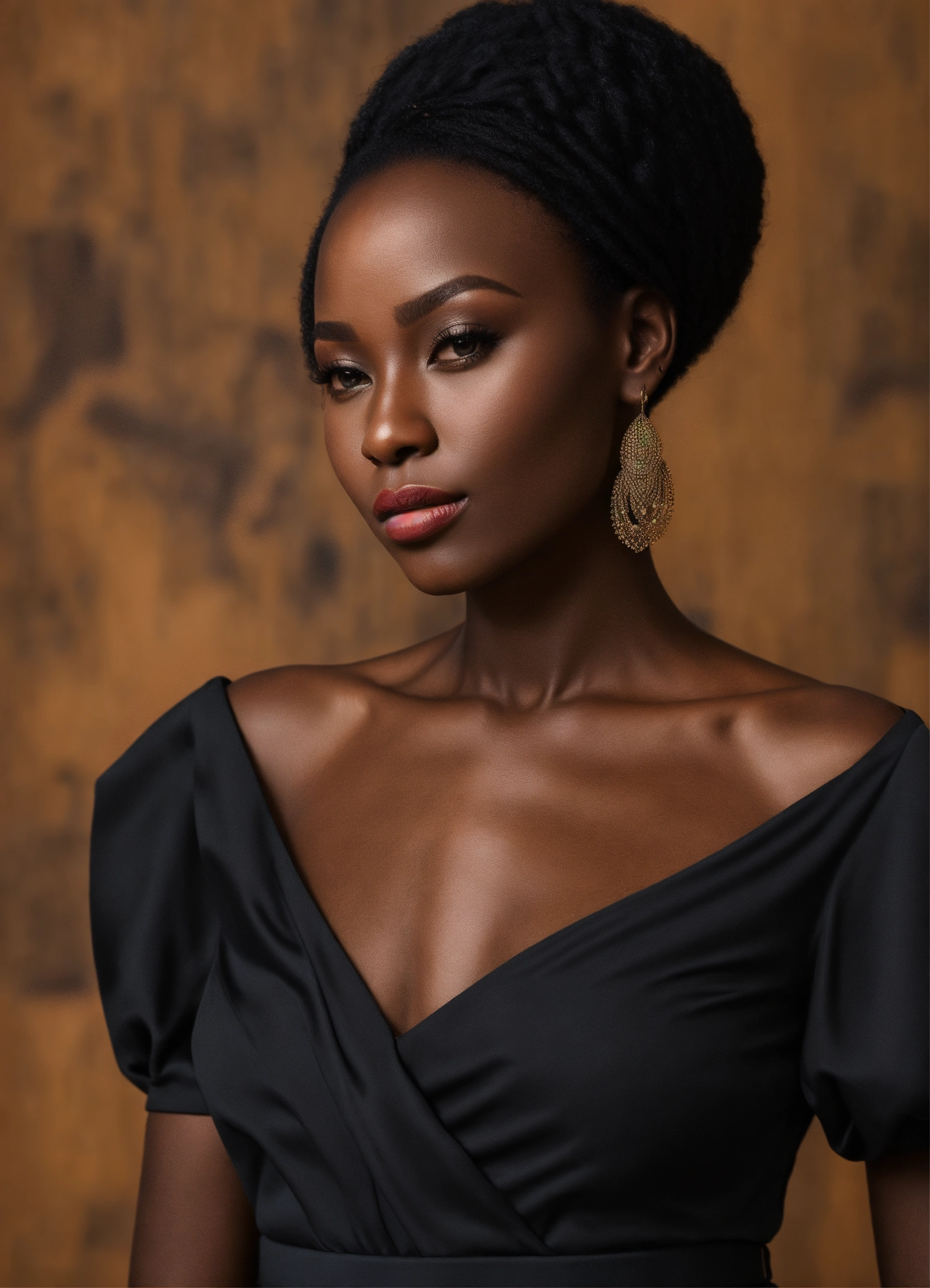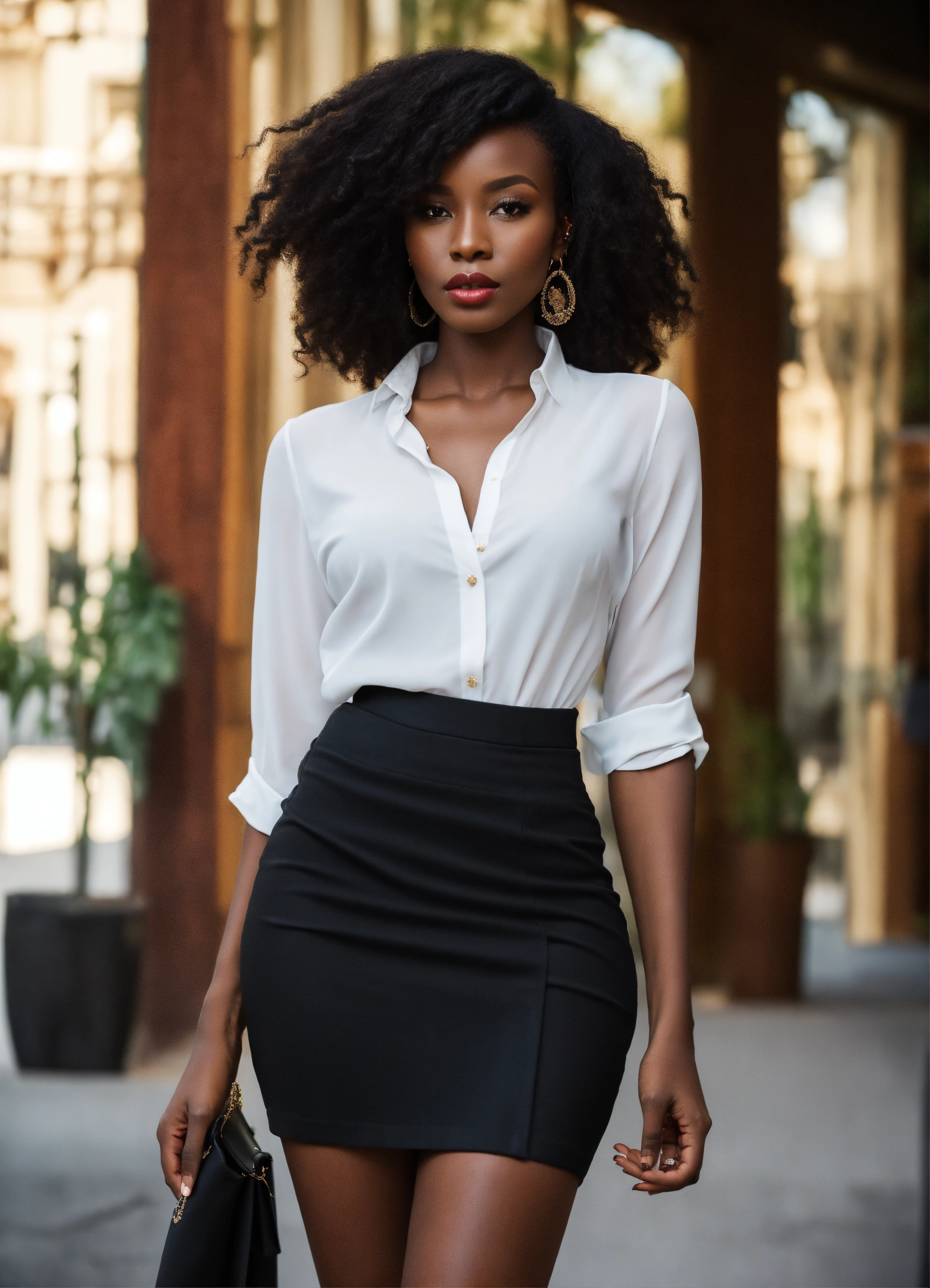 A stunning adult dark african woman, with a tall slim figure, shoulder-length hair, high cheekbones, full lips, slim nose alluring aura. dressed in a stylish black skirt and blouse