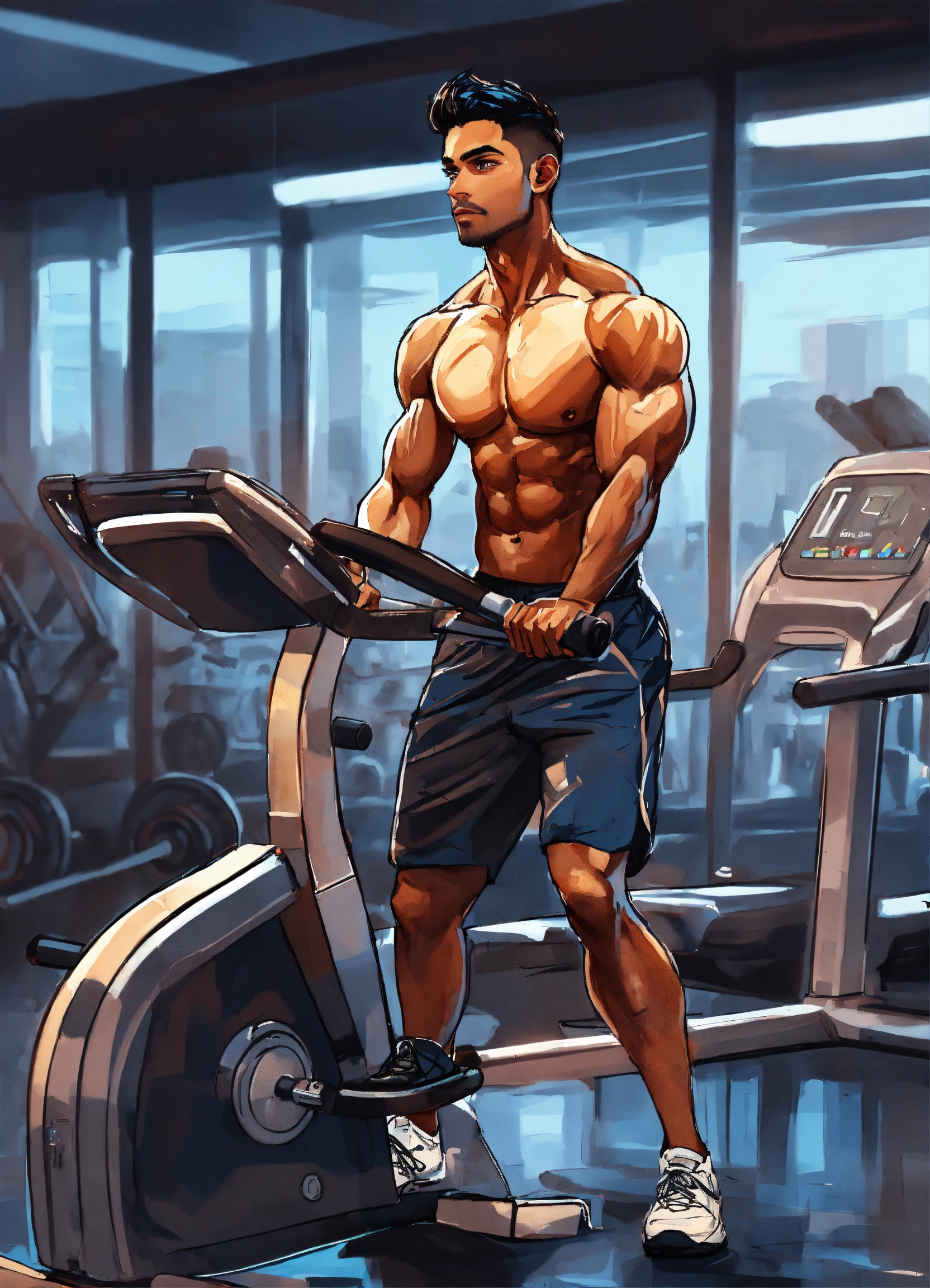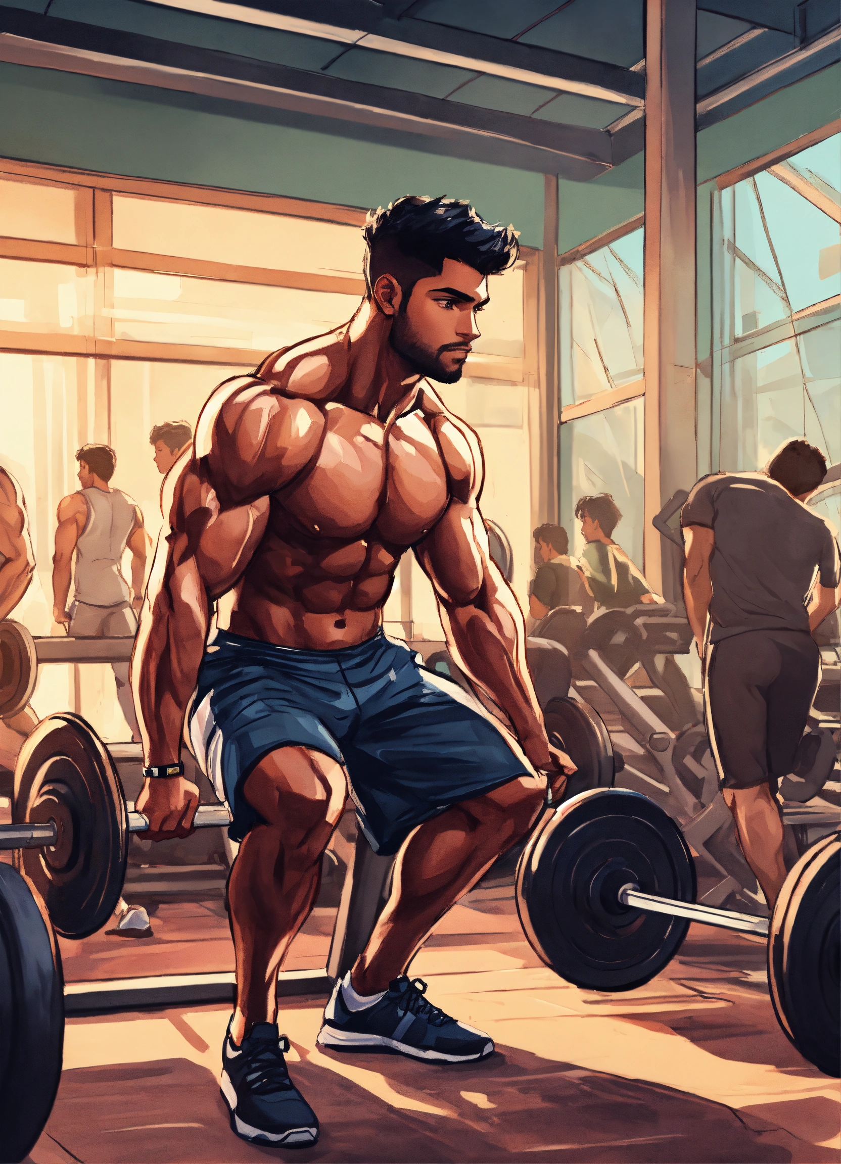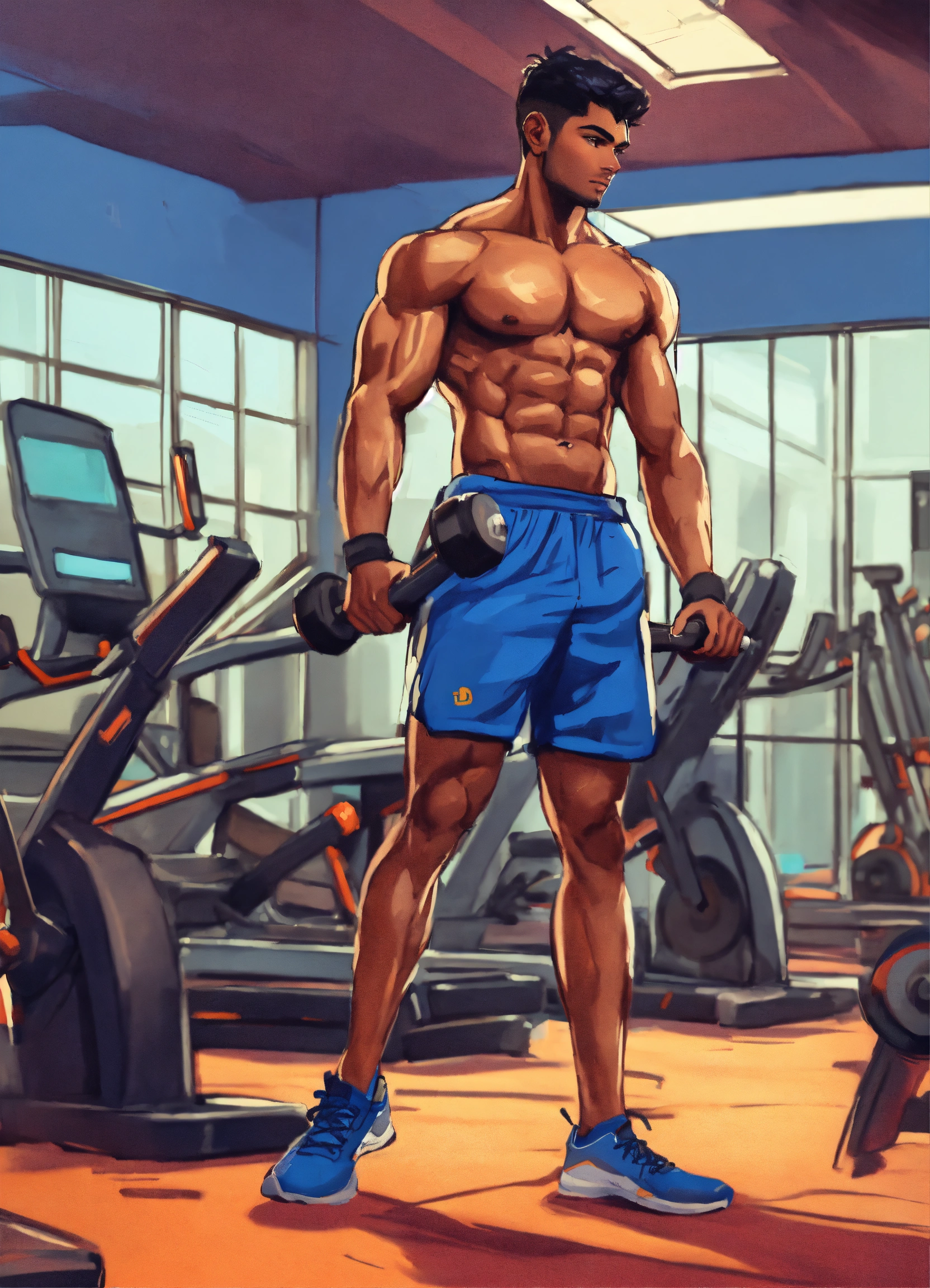 A hand drawn painting of a young muscular indian young man exercising in a modern gym, the gym is filled with equipment and a few other men and women working out, 8k, sharp, highly detailed, vibrant, vivid
