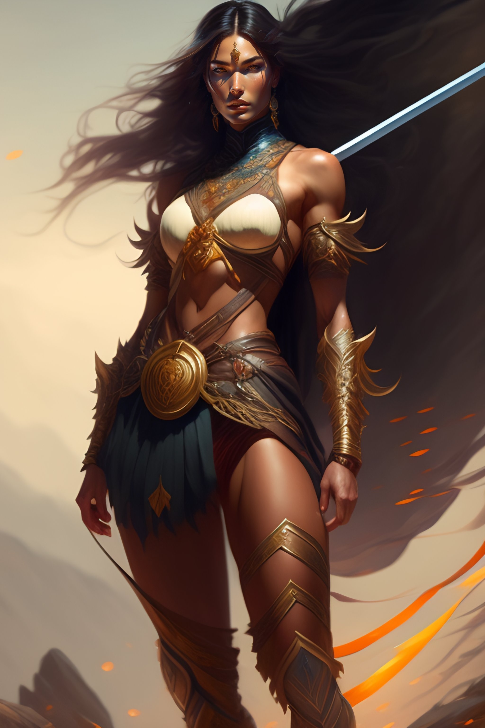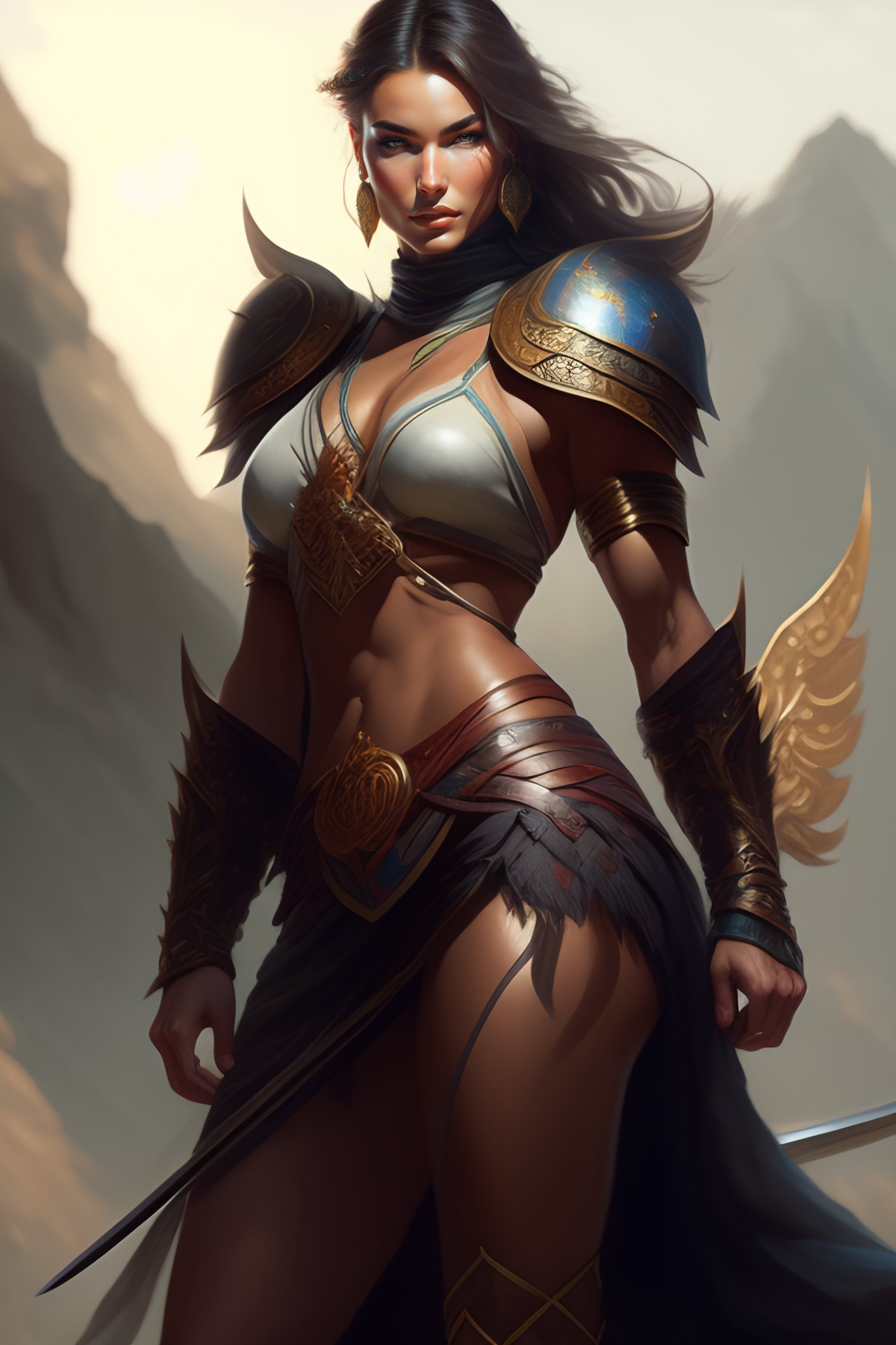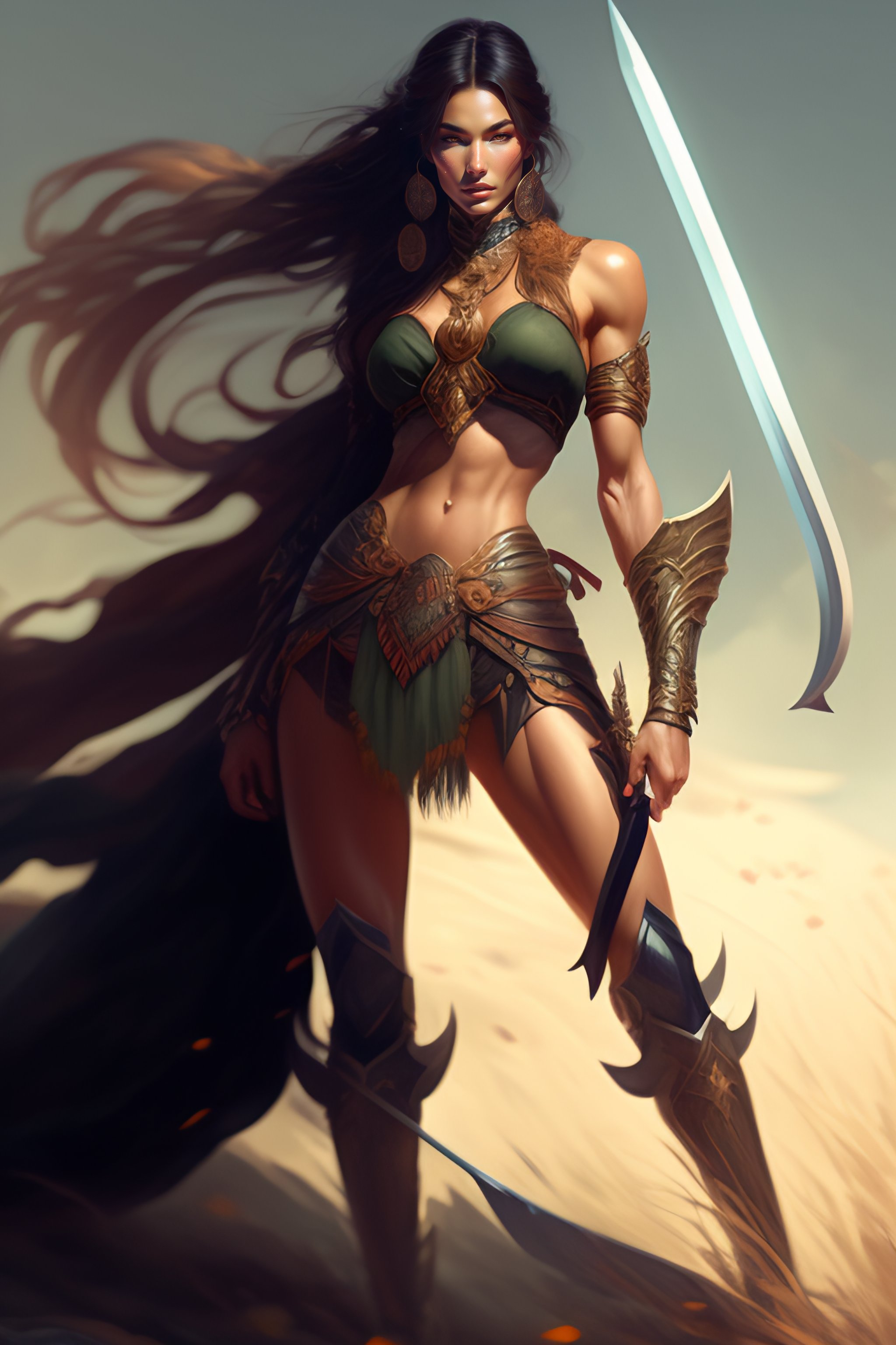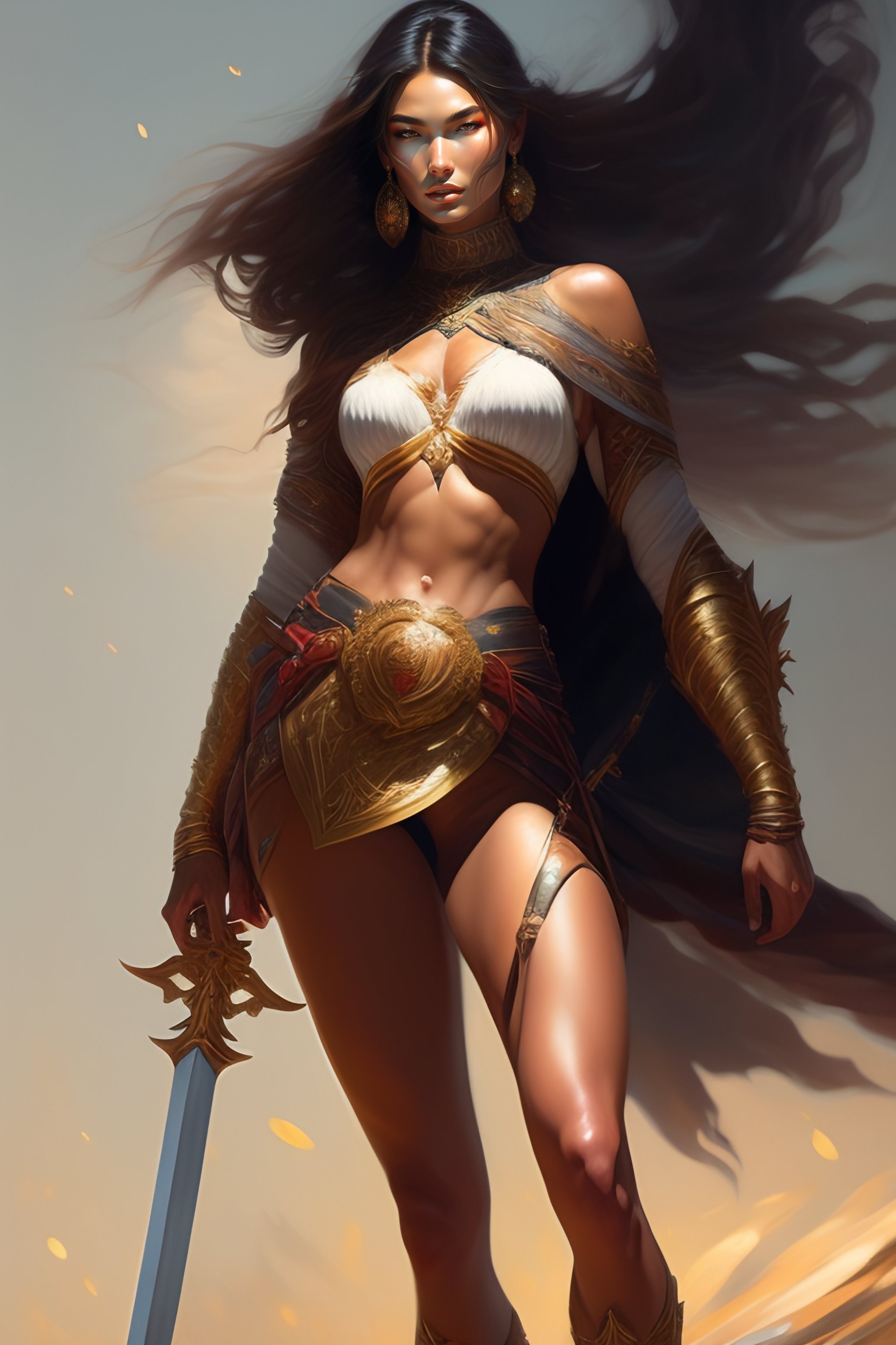 Full body potrait of muscular lily aldridge as rugged warrior sparying sword in air, muscular legs and six abs, highly detailed, digital painting, artstation, concept art, smooth, sharp focus, illustration, art by tian zi and wlop and alphonse mucha