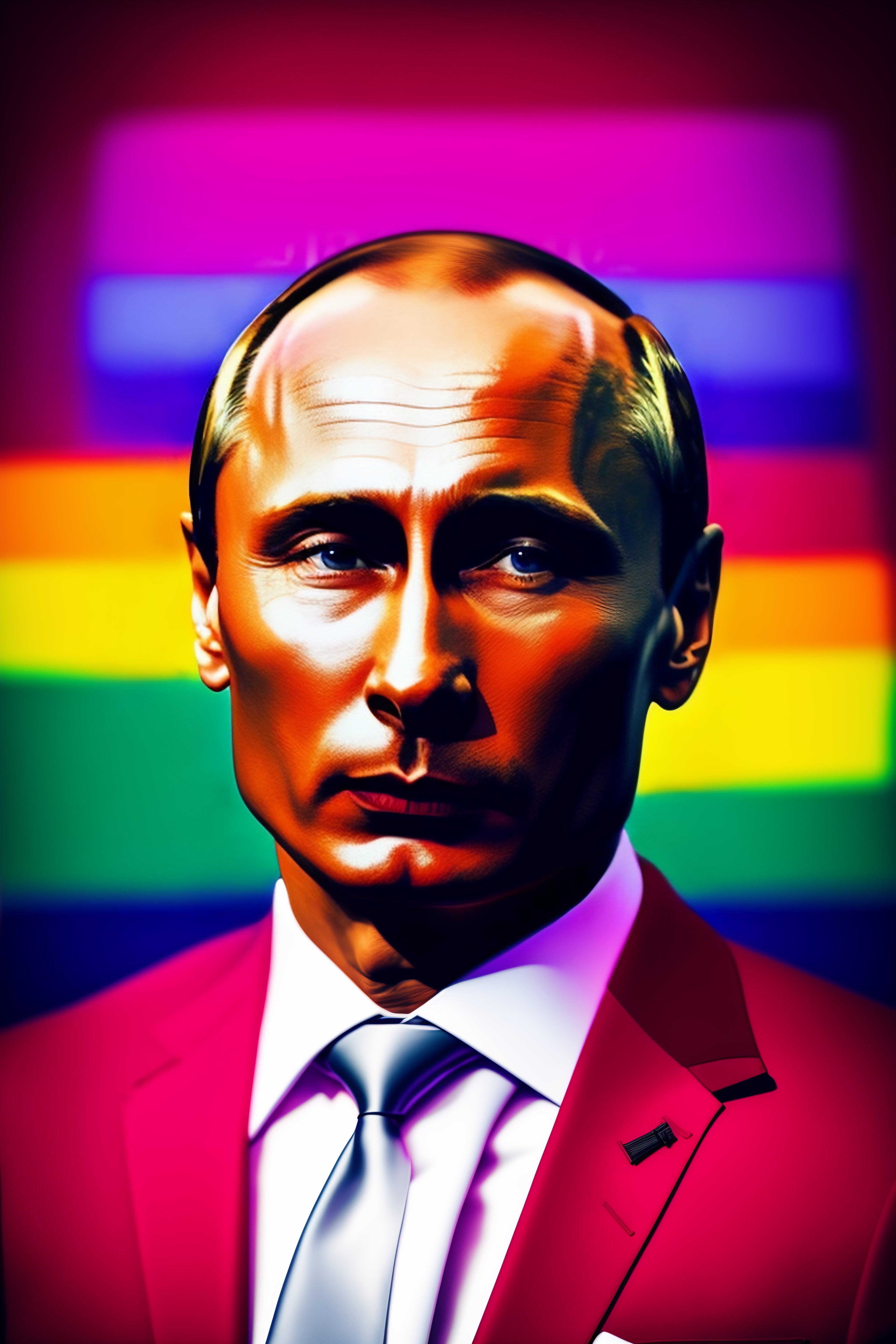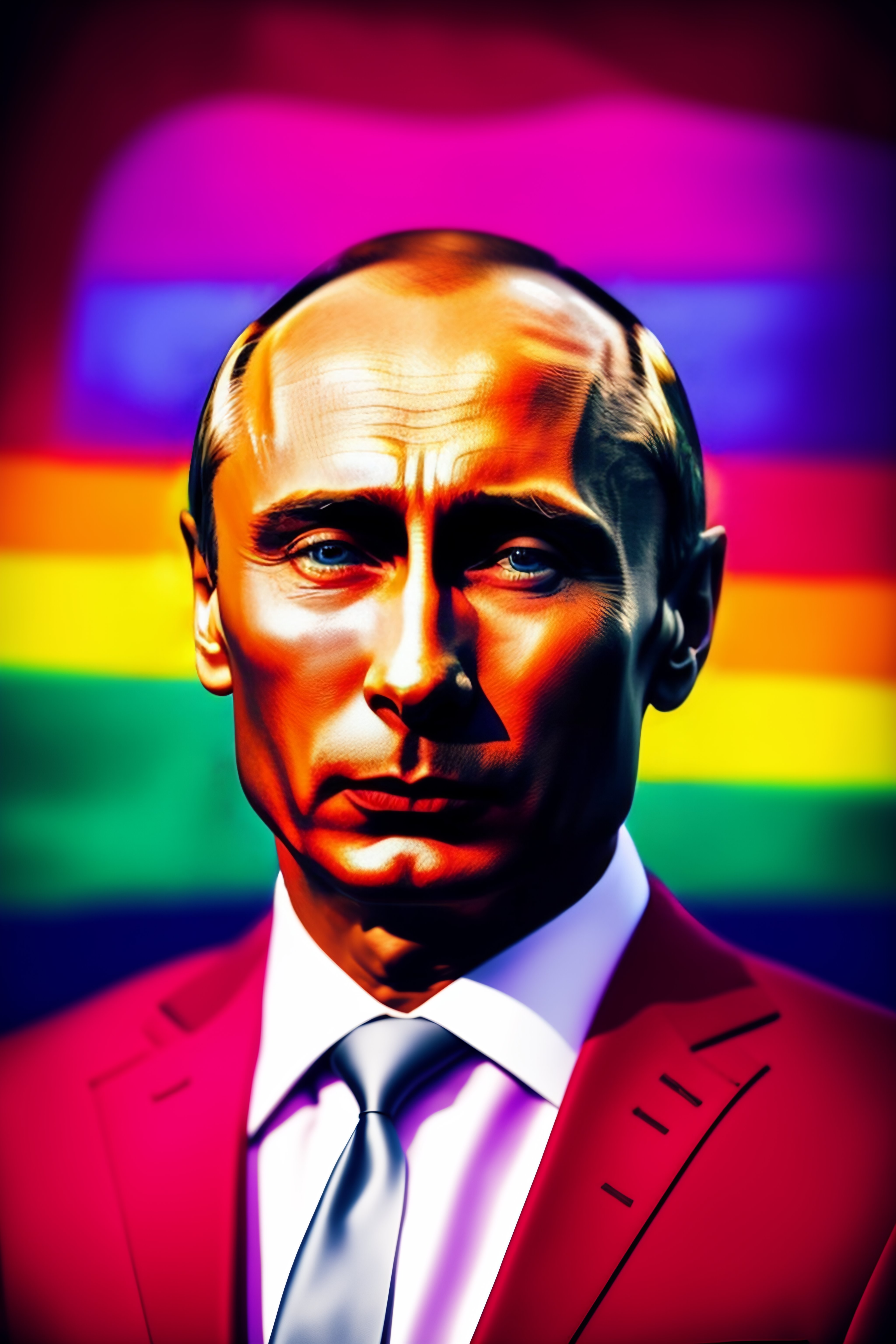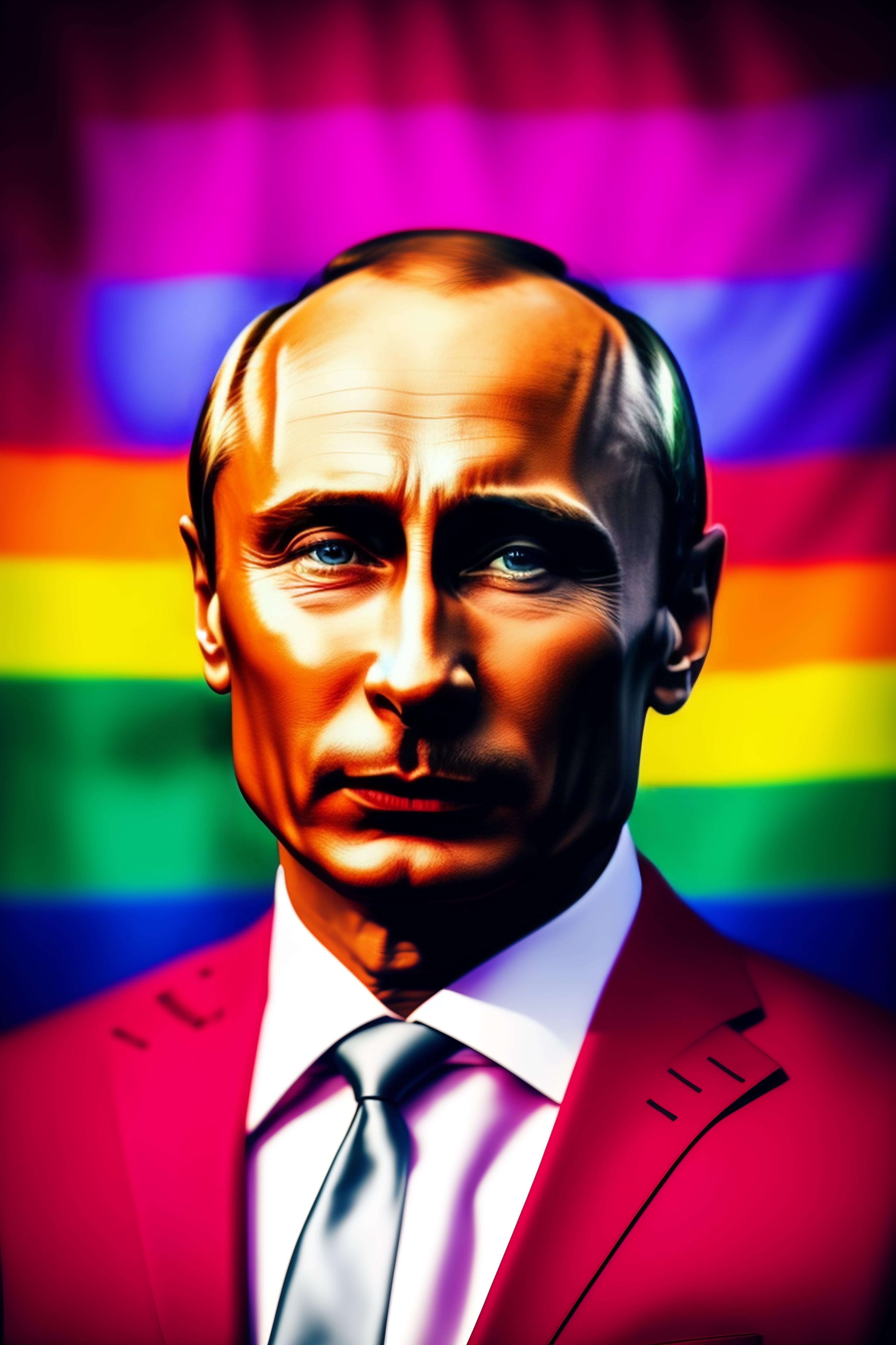 Vladimir putin portrait photo at red square gay pride parade, rainbow flags behind, surrounded by lgbt people professional photo, high sharpness