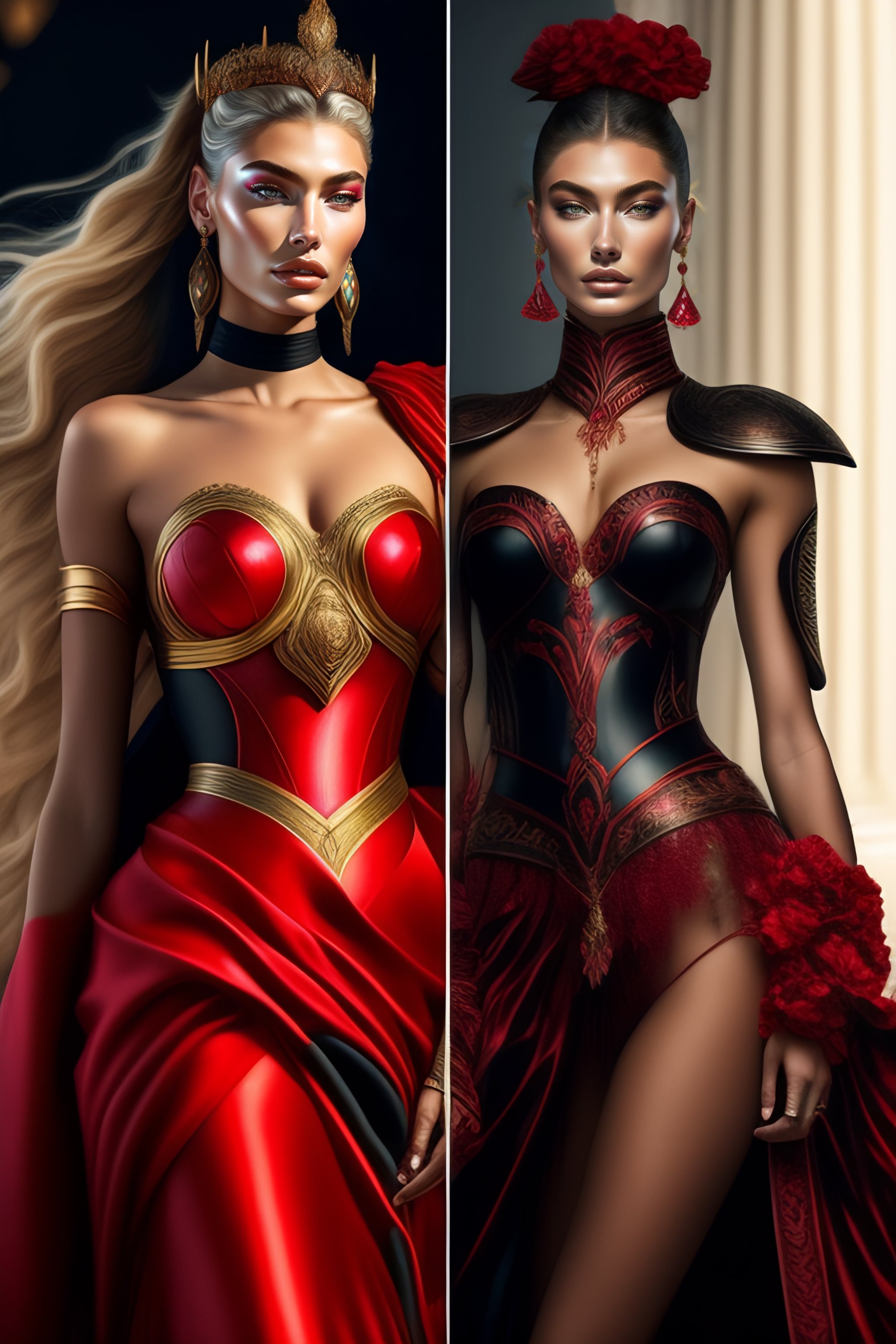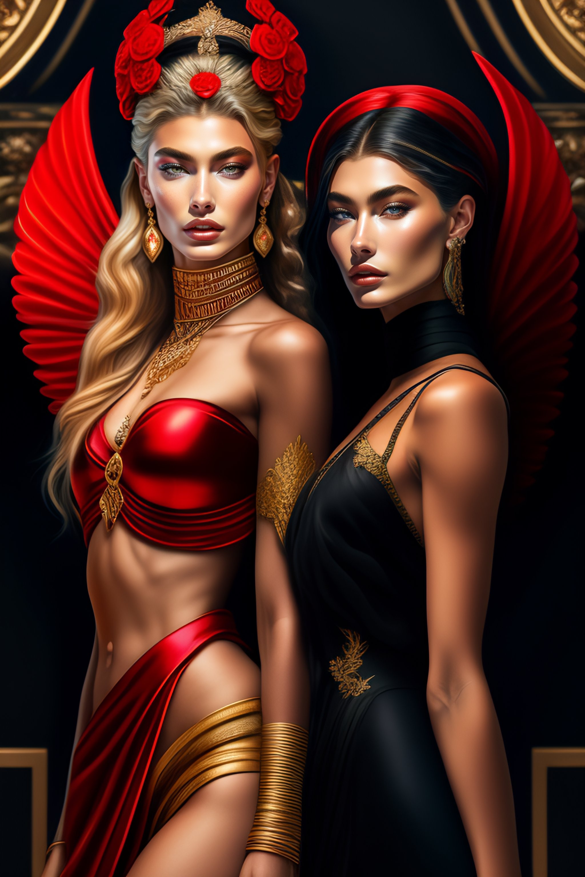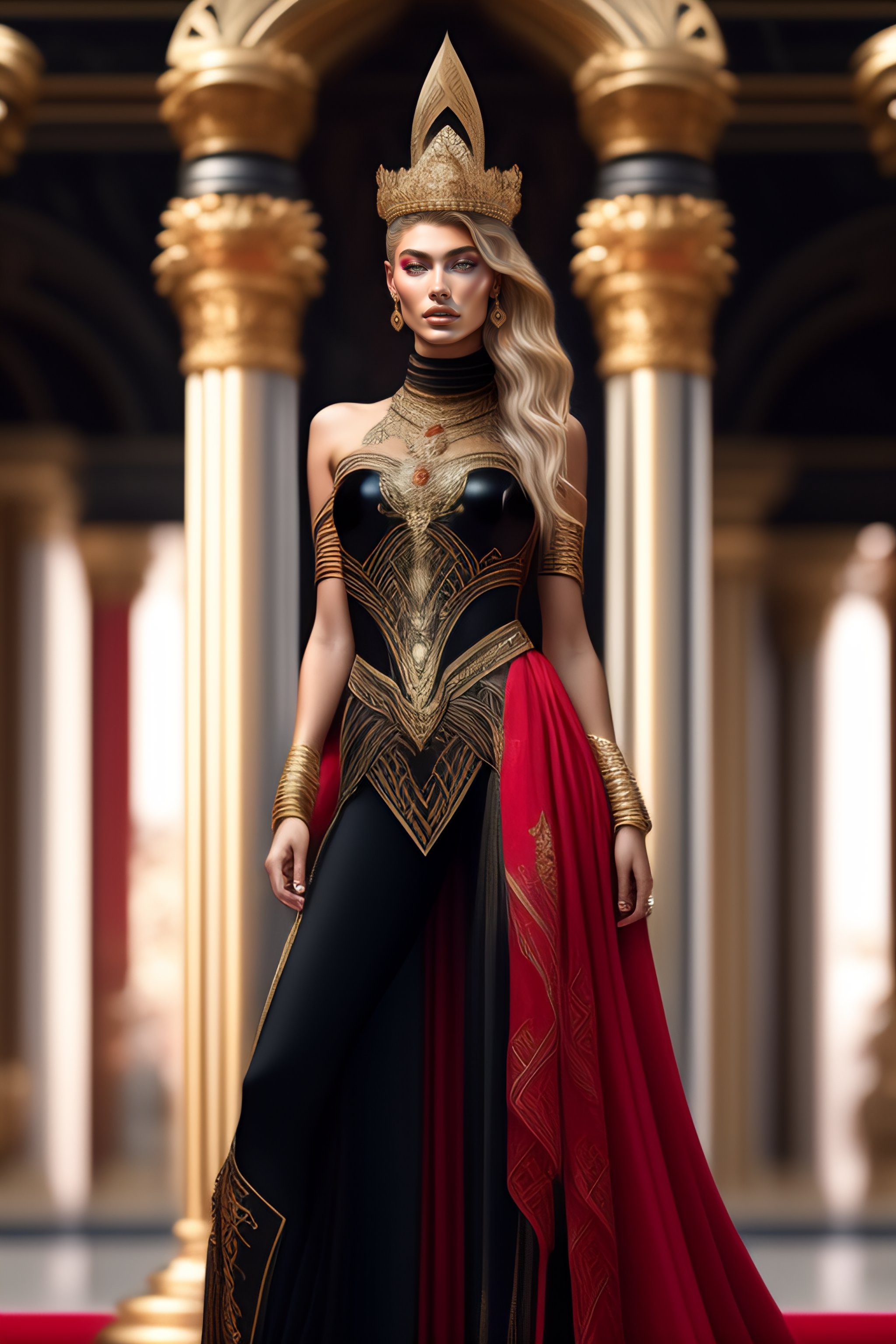 Ultra realistic illustration, a stunningly beautiful greek goddess of chaos in black and red intricate light armor played by and and hailey rhode baldwin bieber and gigi hadid in front of marble column, intricate, elegant, highly detailed, digital painting, artstation, concept art, smooth, sharp focus, illustration, art by artgerm and greg rutkowski and alphonse mucha