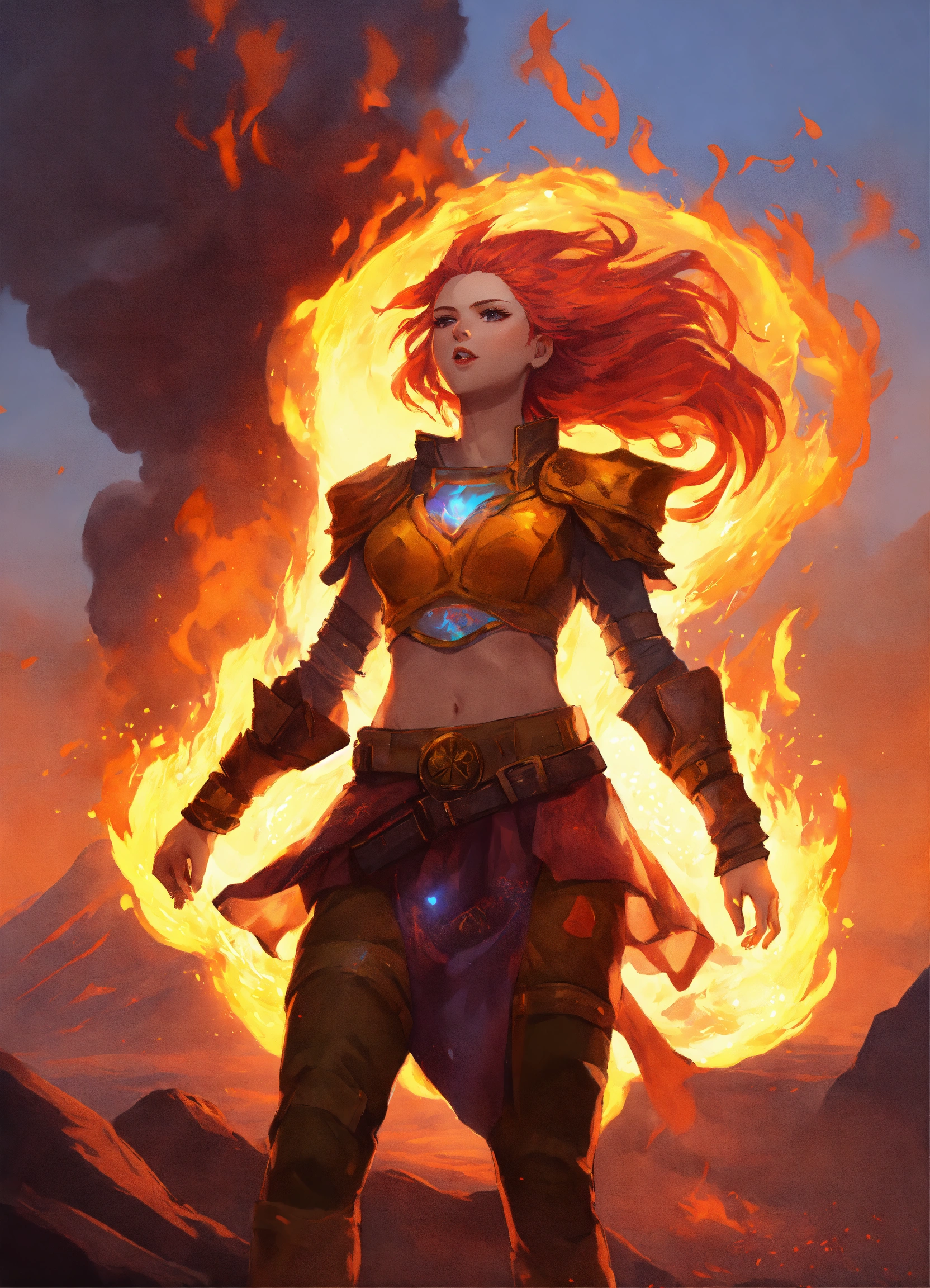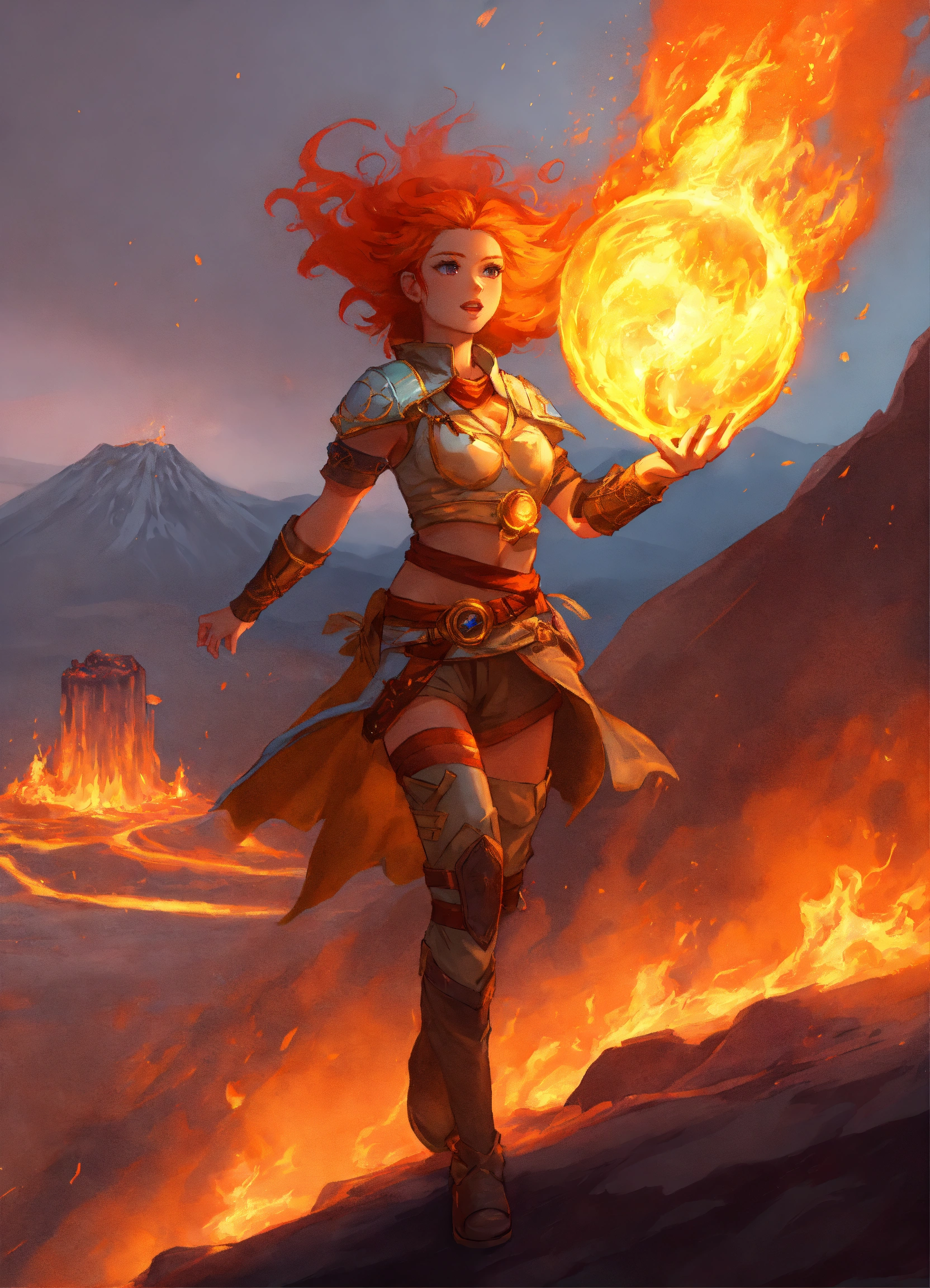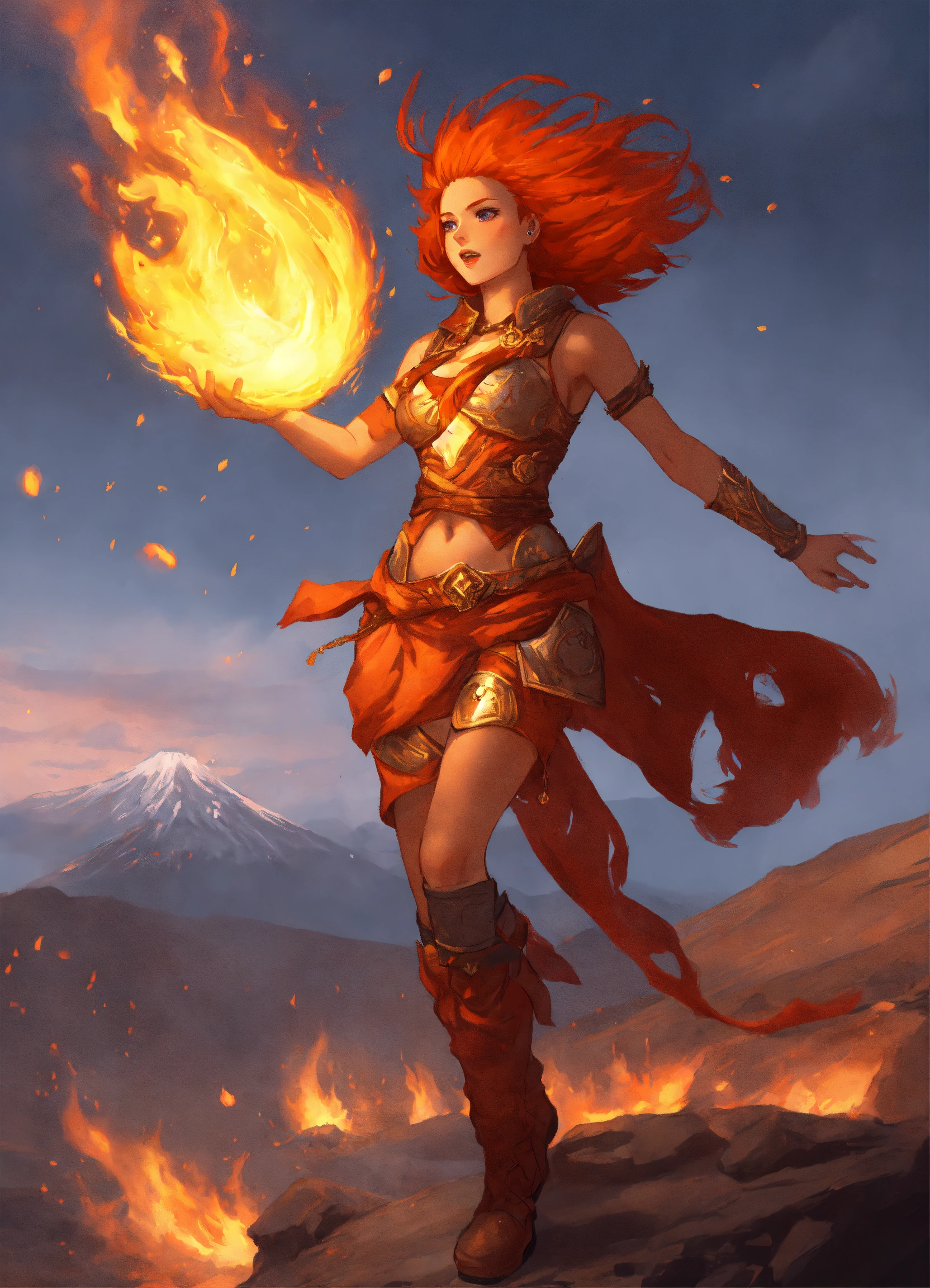 Short small female halfbreed elemental efreet with pale skin and flaming hair throwing a fireball standing on a volcano character art pathfinder