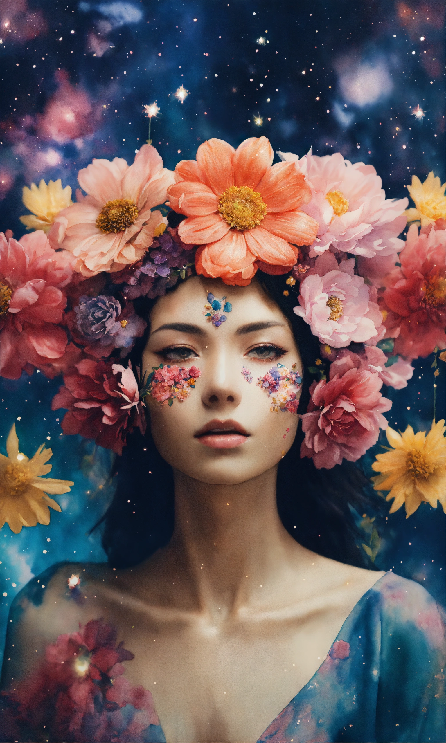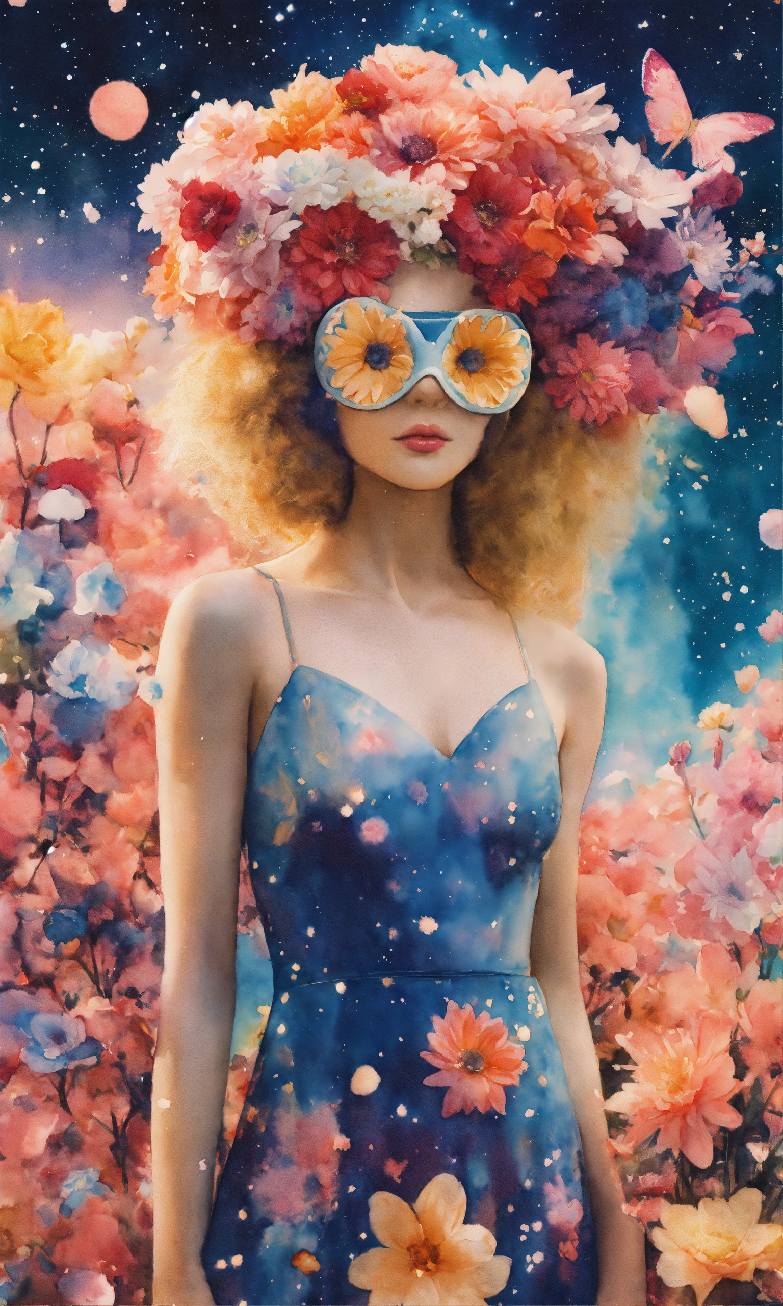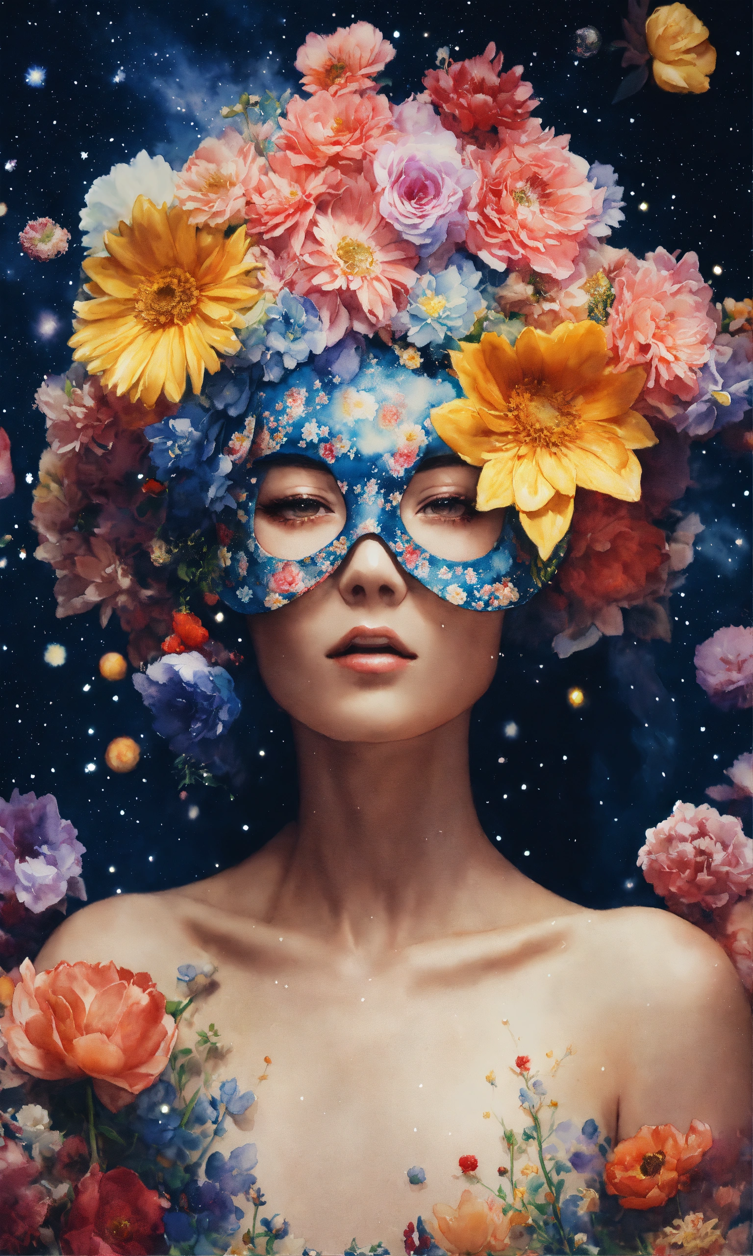 Watercolor art portraits of a woman wearing a flower mask in space surrounded but millions of stars, portra 400 high dpi film scan. fashion editorial. floral edition. millions of colorful flowers. analog fashion portrait. surrealism. 8k resolution