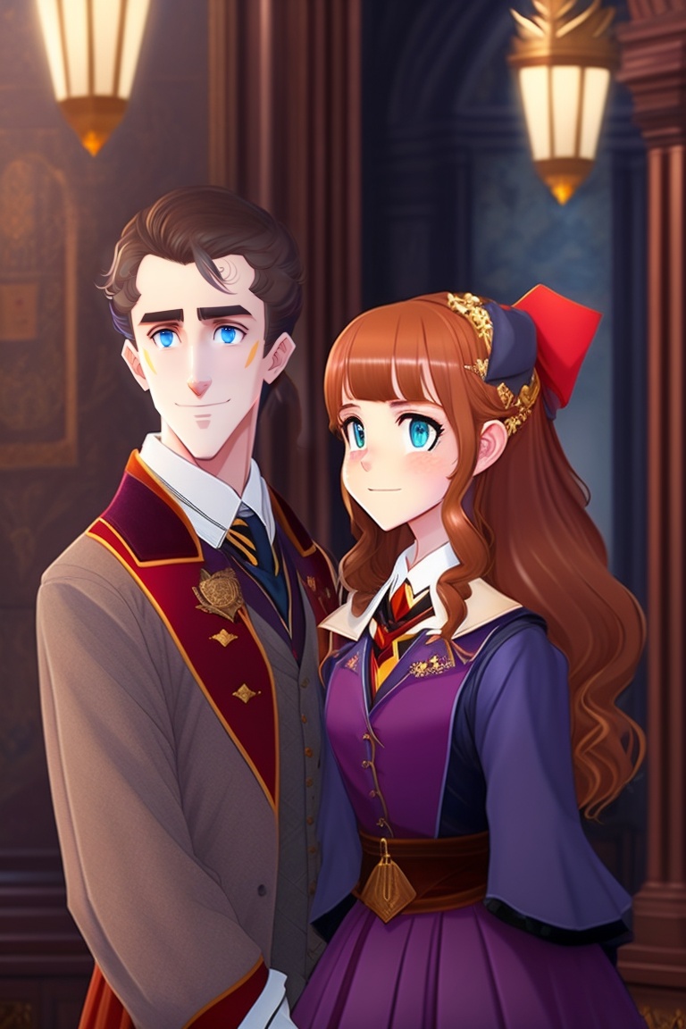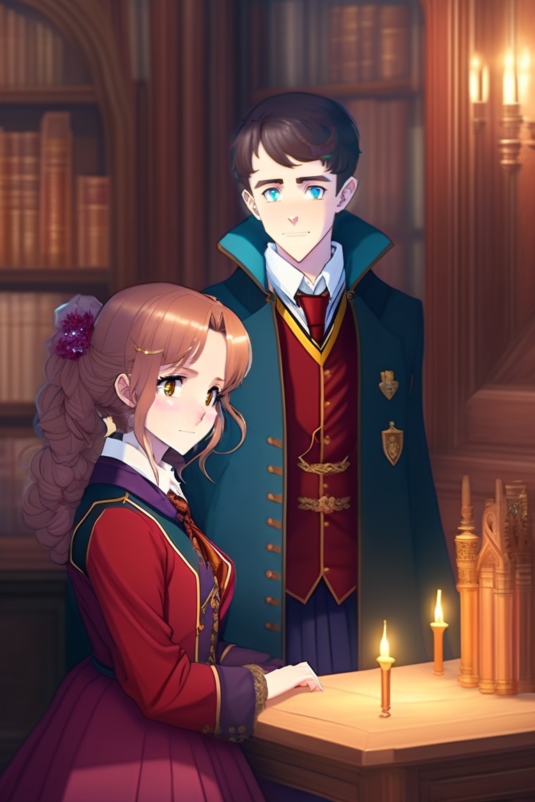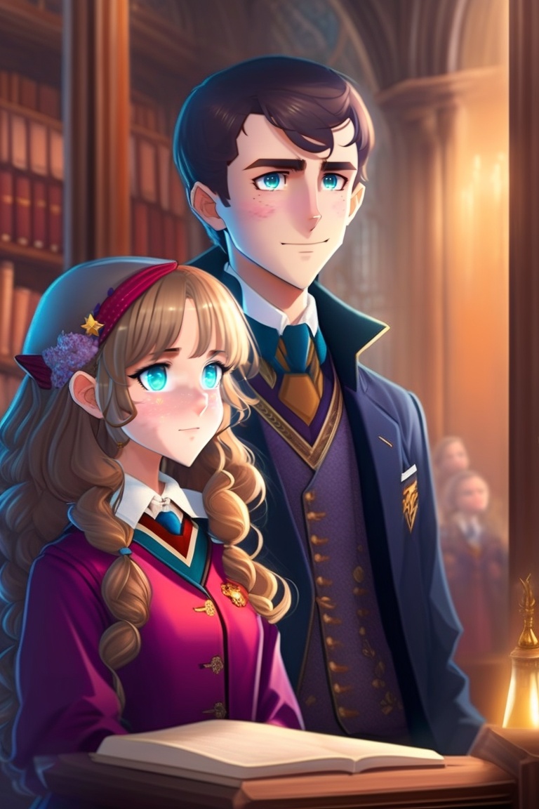 Hermione granger and neville longbottom in gryffindor common room anime style