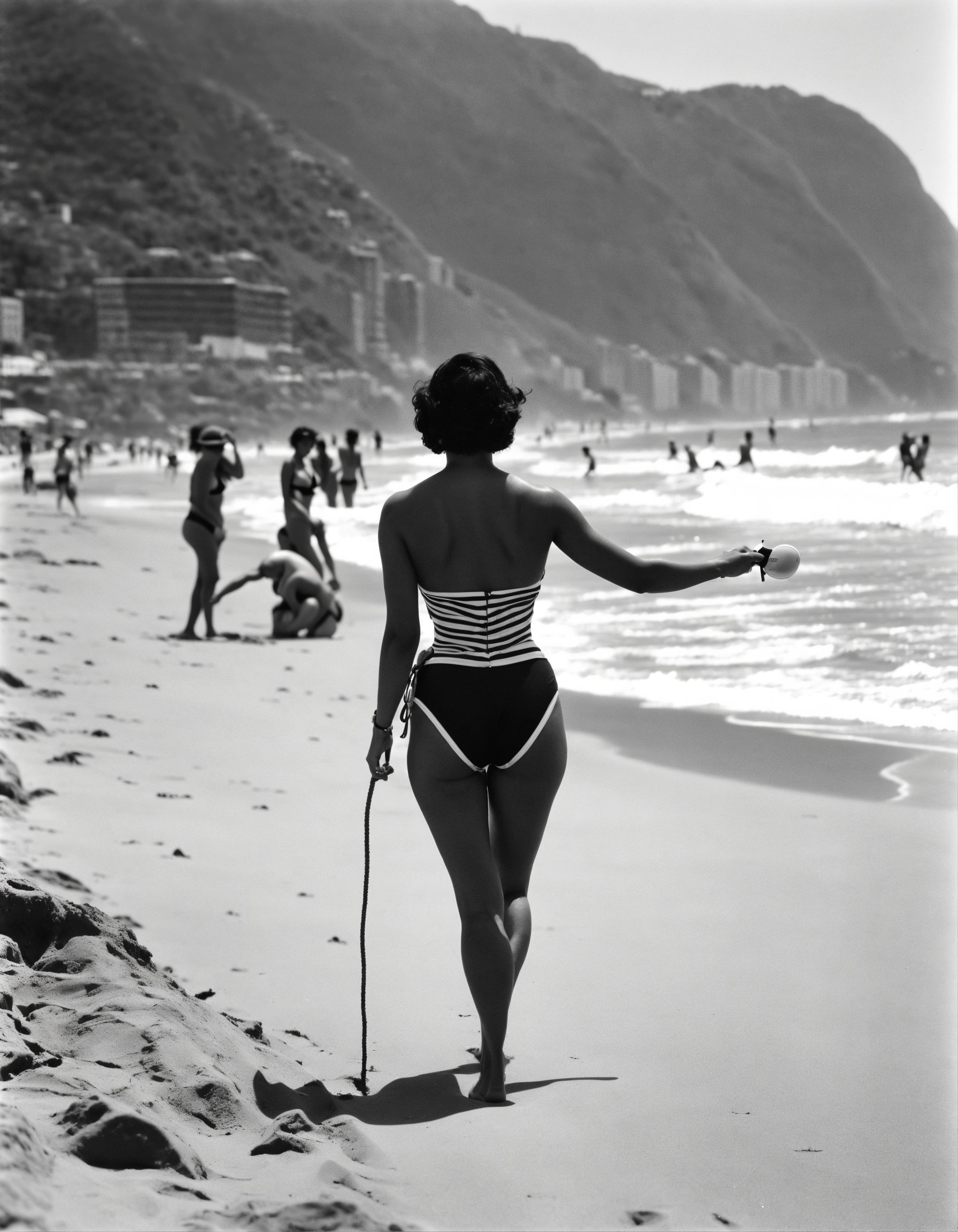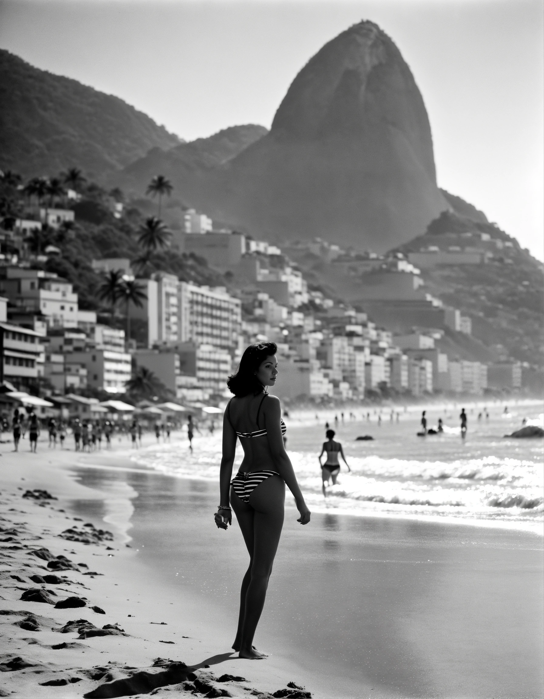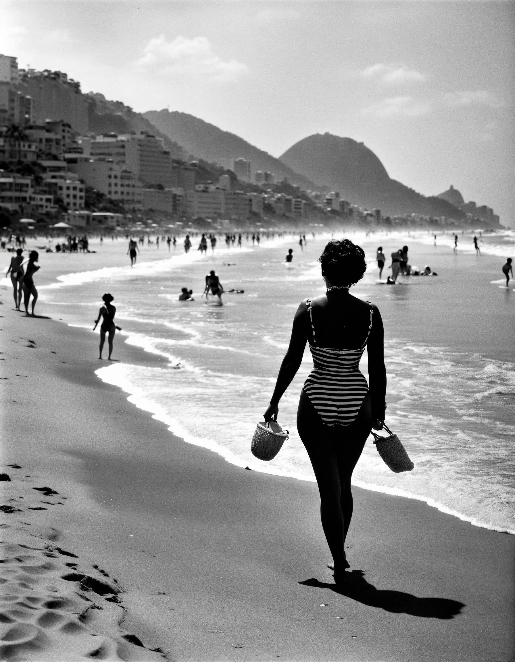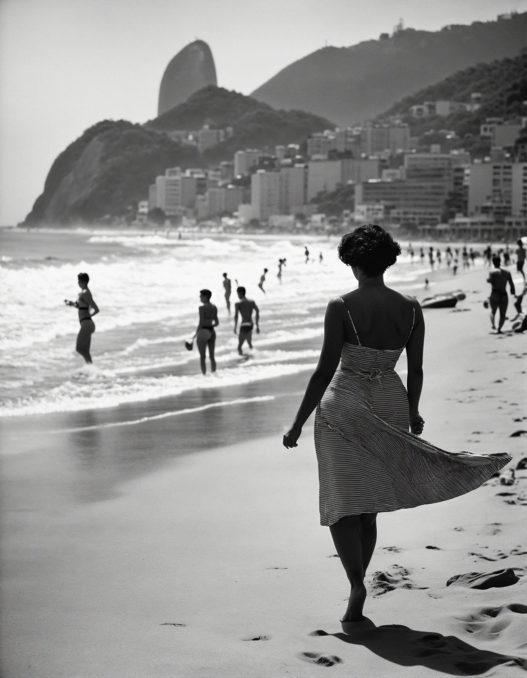 Photograph of rio de janeiro in ancient brazil, a woman leaving the beach in swimwear, high quality black and white photography, 50s, copacabana beach