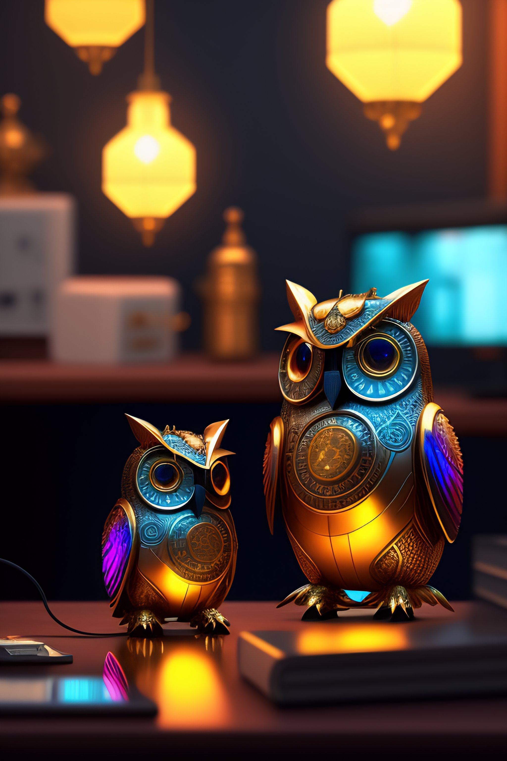 Tiny good, robot owls looking at a computer, surrounded by computer screens. steampunk, intricate, elegant, fantasy, highly detailed, digital painting, concept art, sharp focus, illustration, beautiful lighting, epic light, artstation, colorful, dramatic, highly detailed