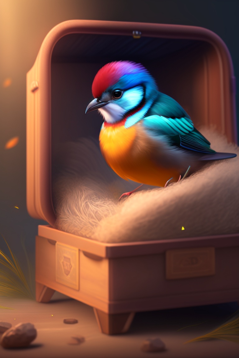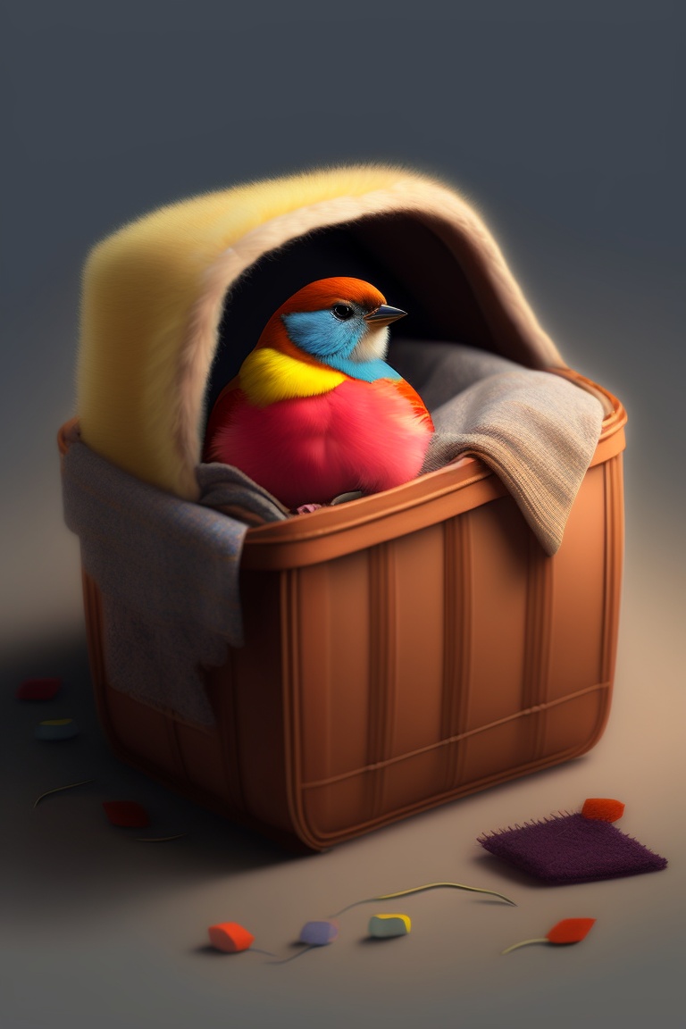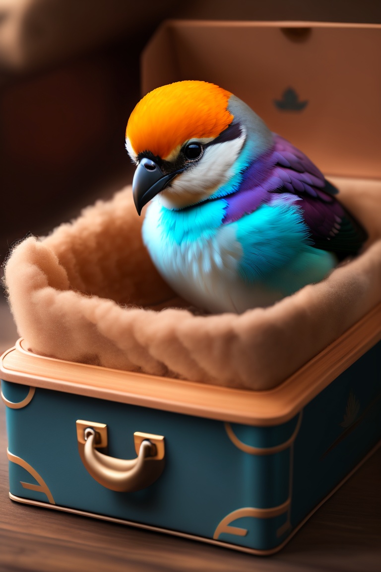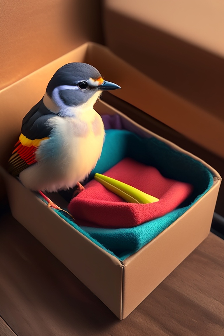 Image prompt: maya crafting a cozy nest for the injured bird inside an old shoebox, using soft pieces of cloth and straw.