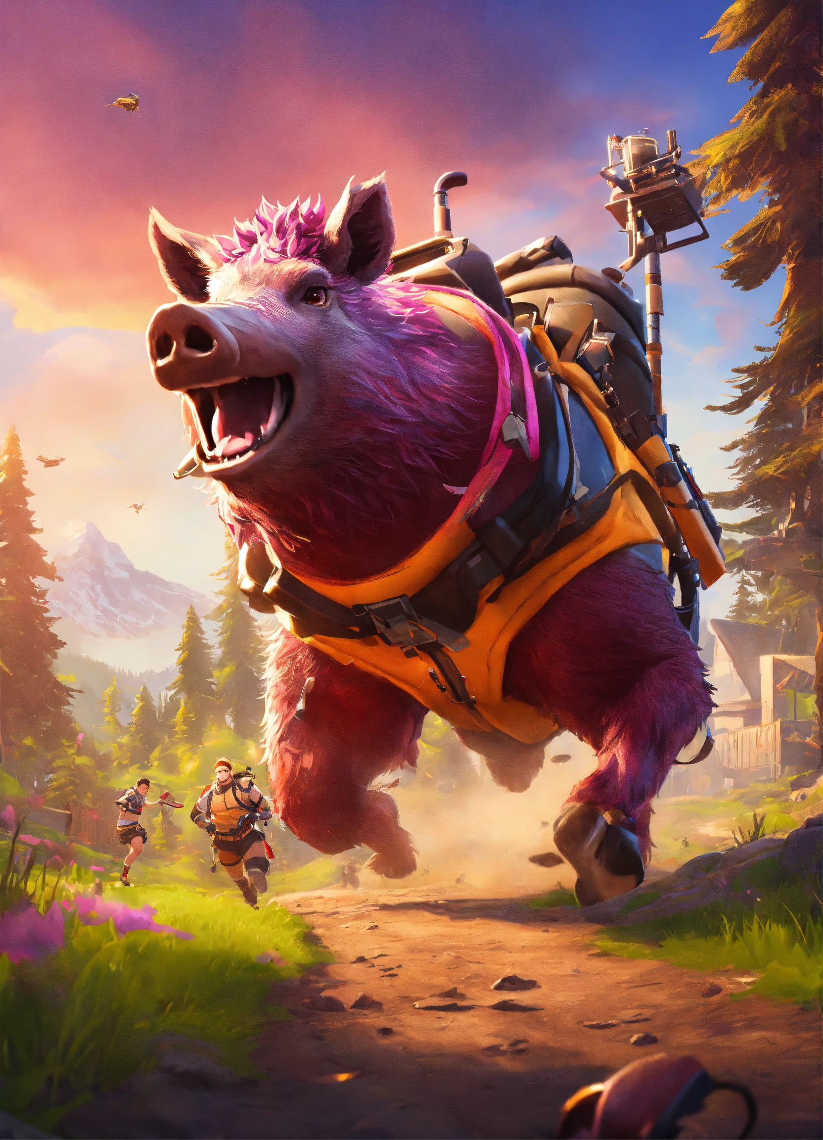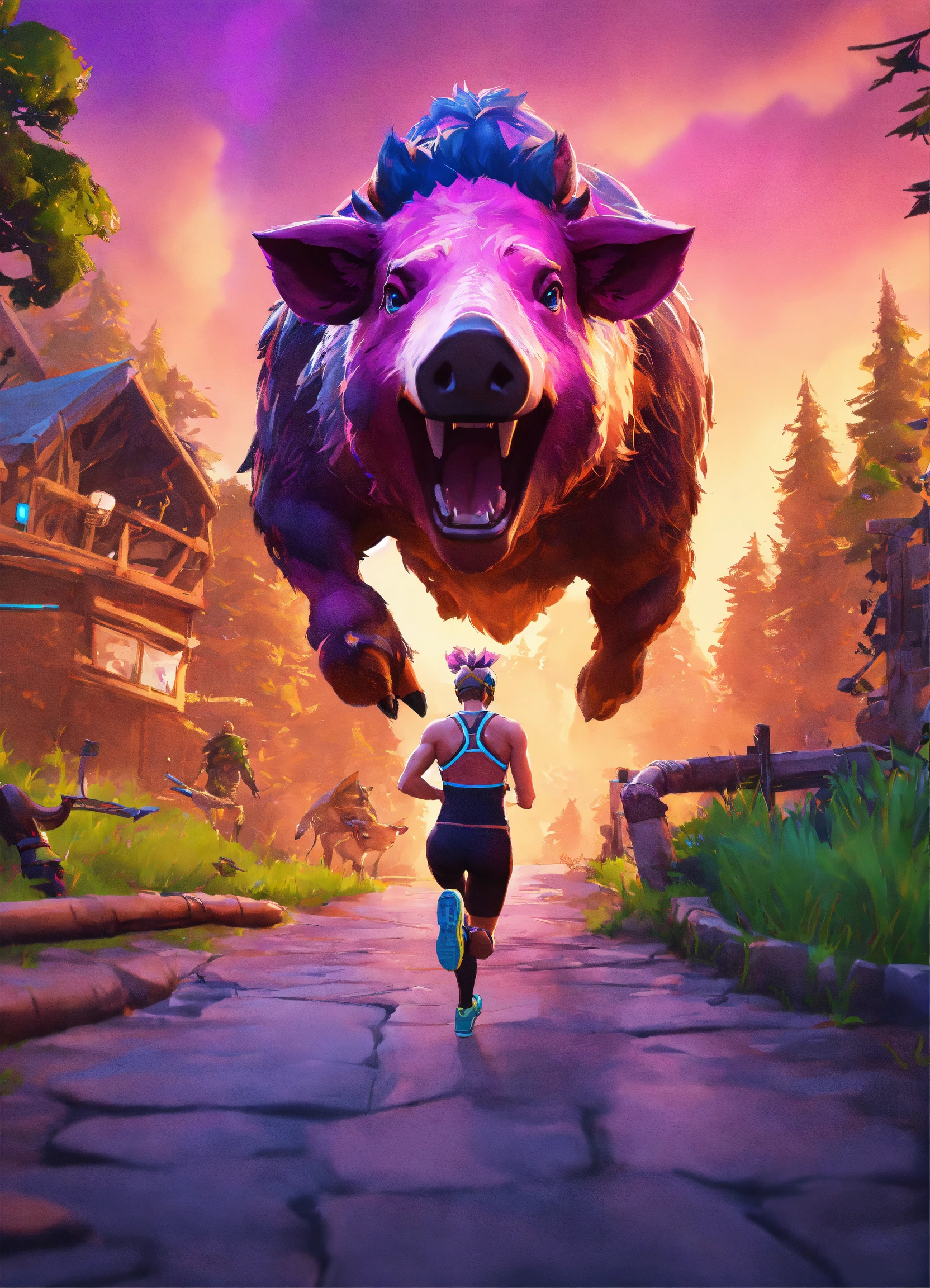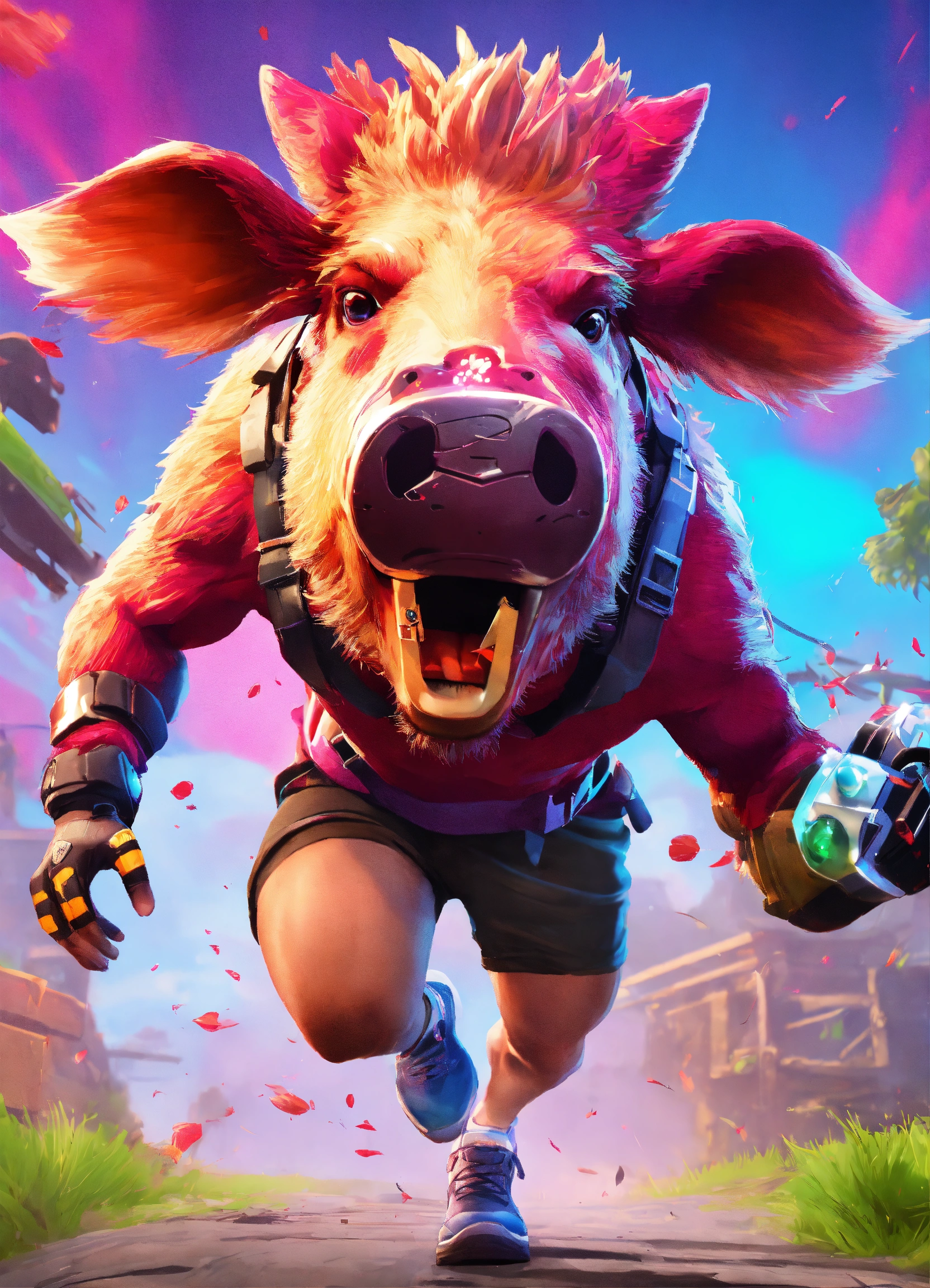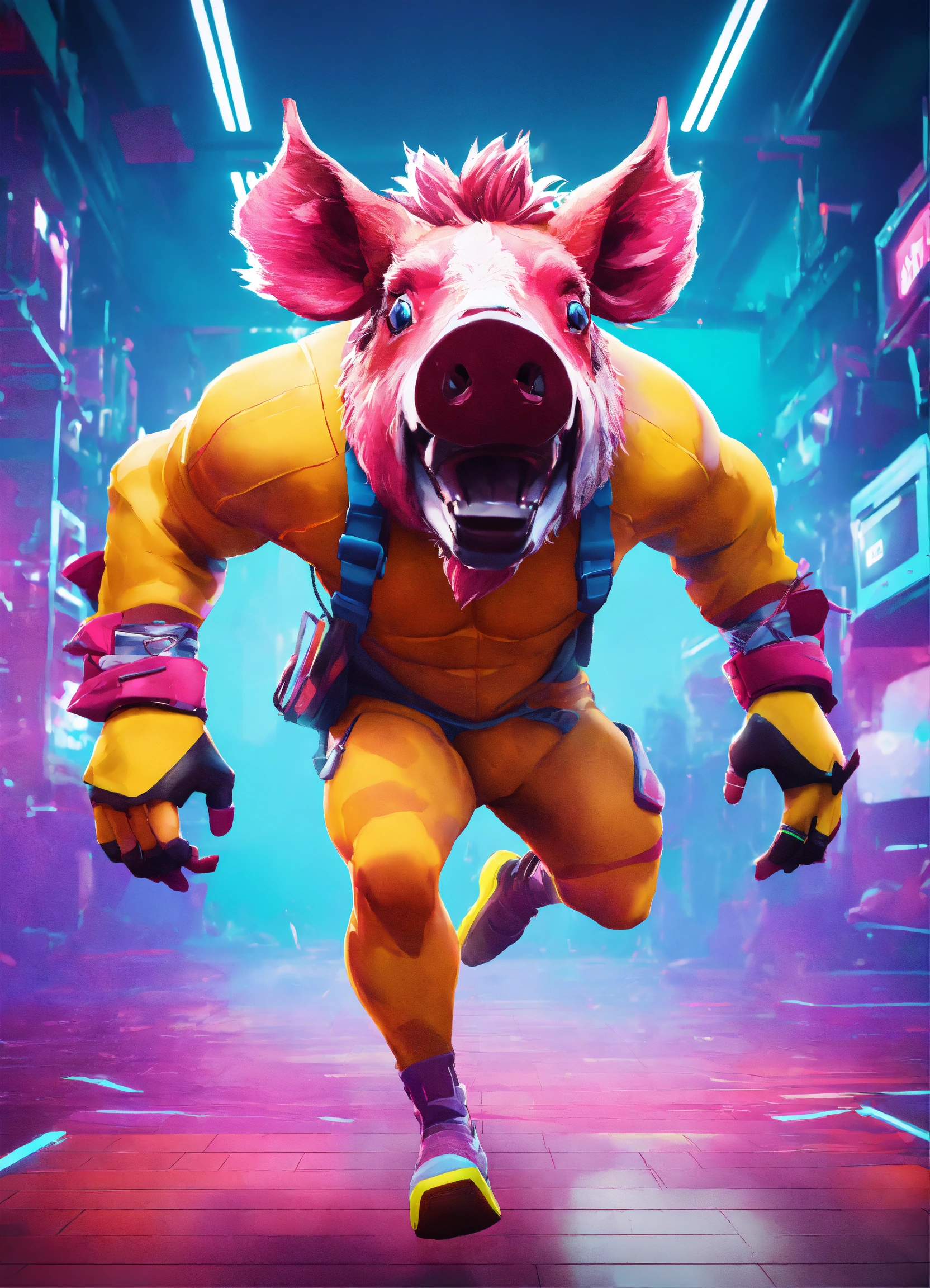 Humoristic fortnite body mixed with wild boar head running, amazing high tech fitness room digital illustration