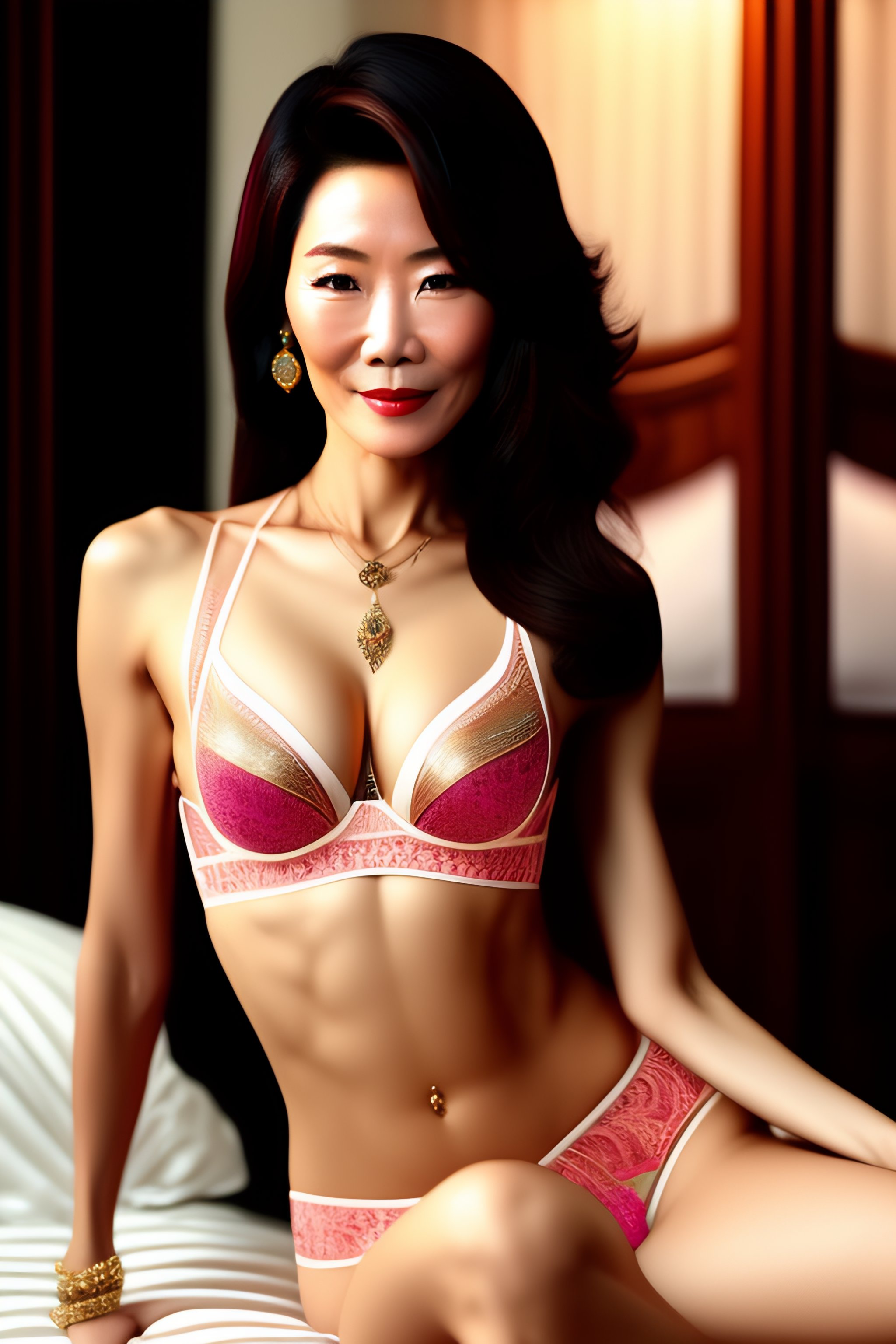Attractive sexy korean female model in her fifties, wearing revealing ornate and decorative tight victoria secret, abs showing, posing like a model, slim and slender, barber chair and bed in the background