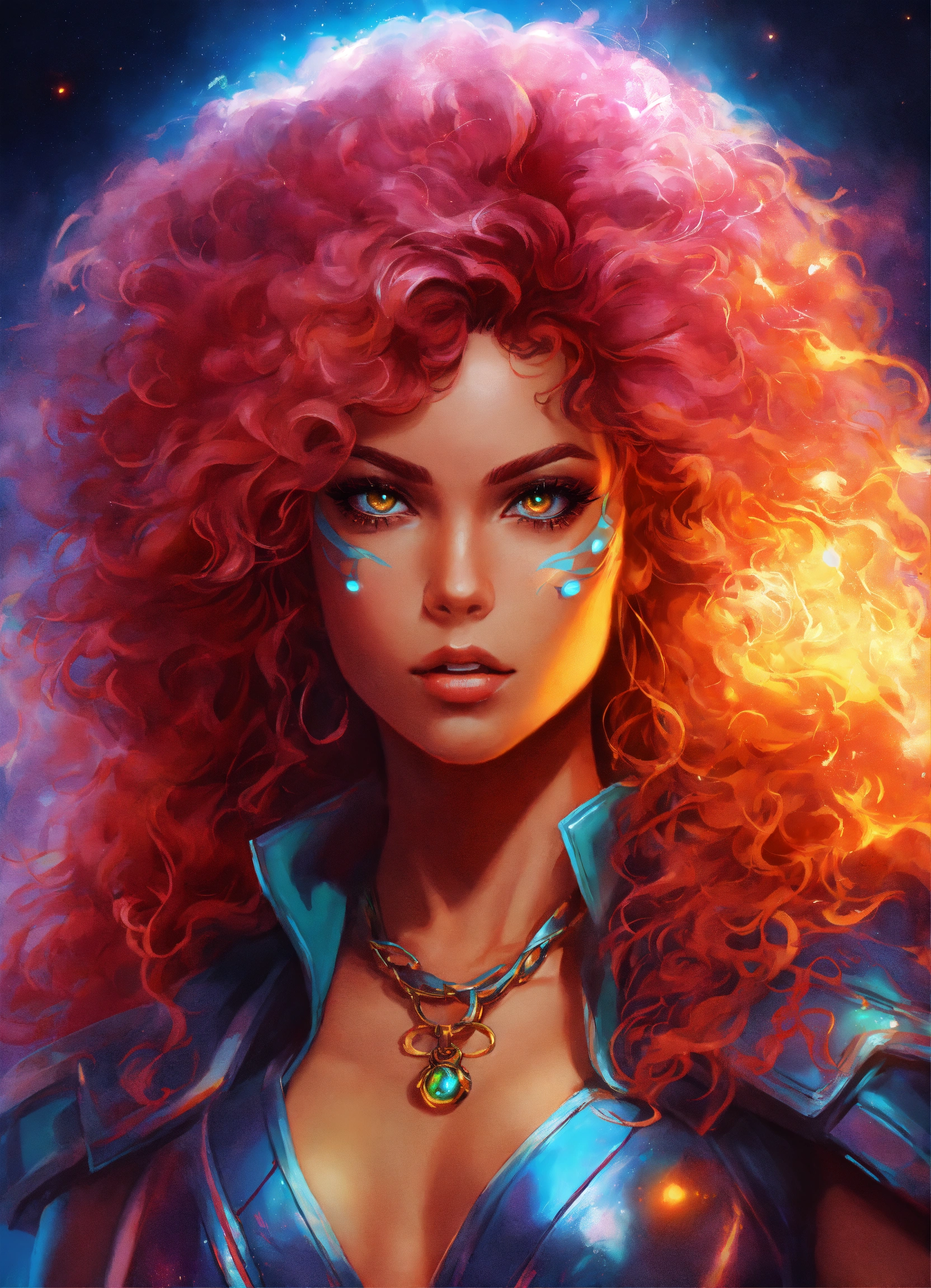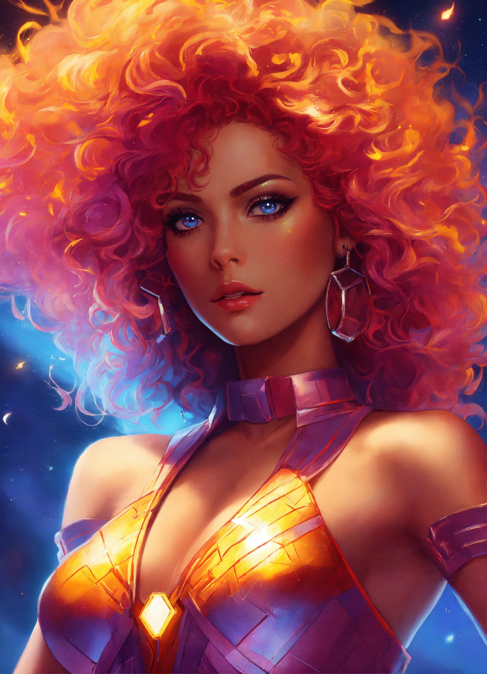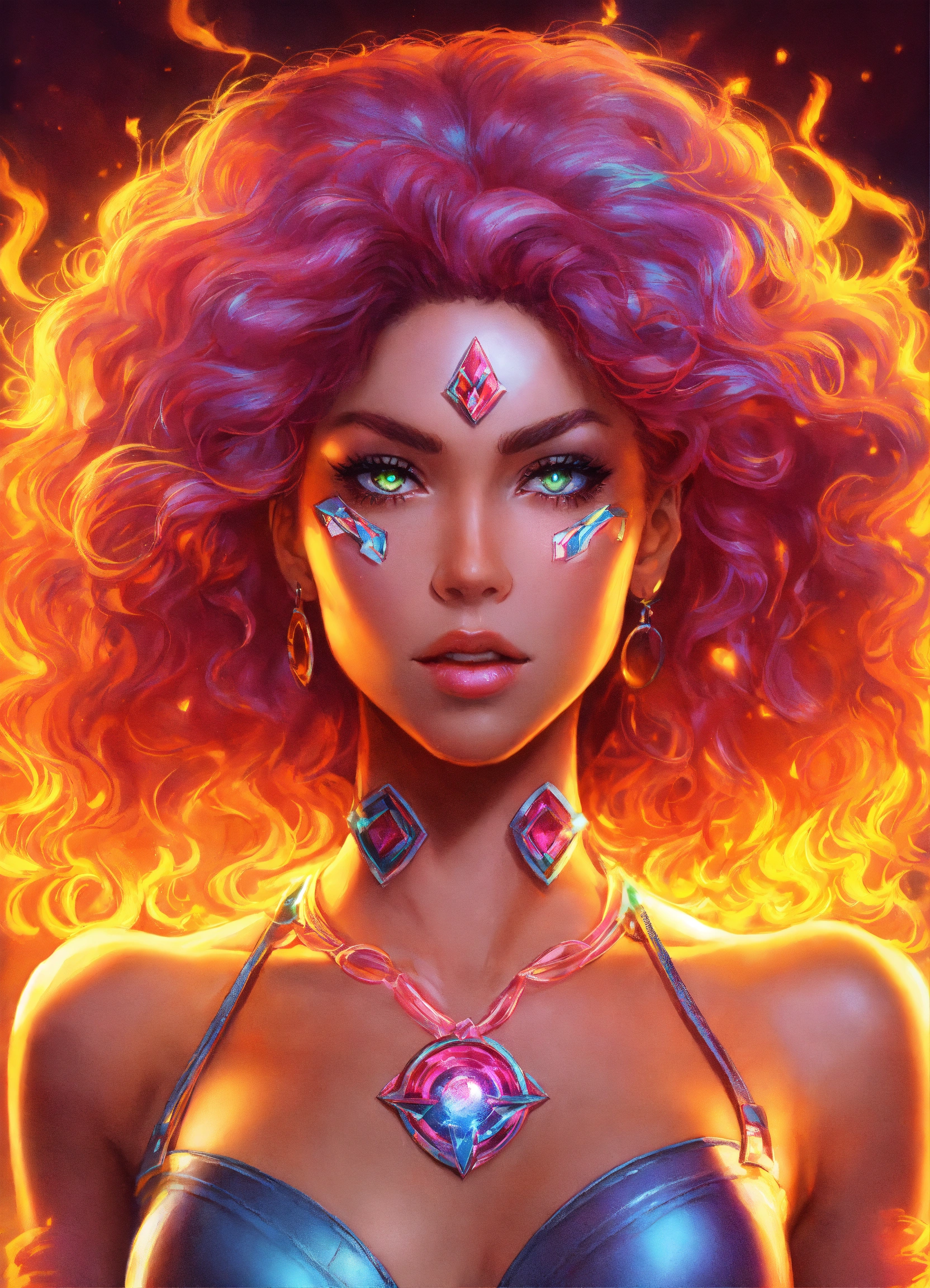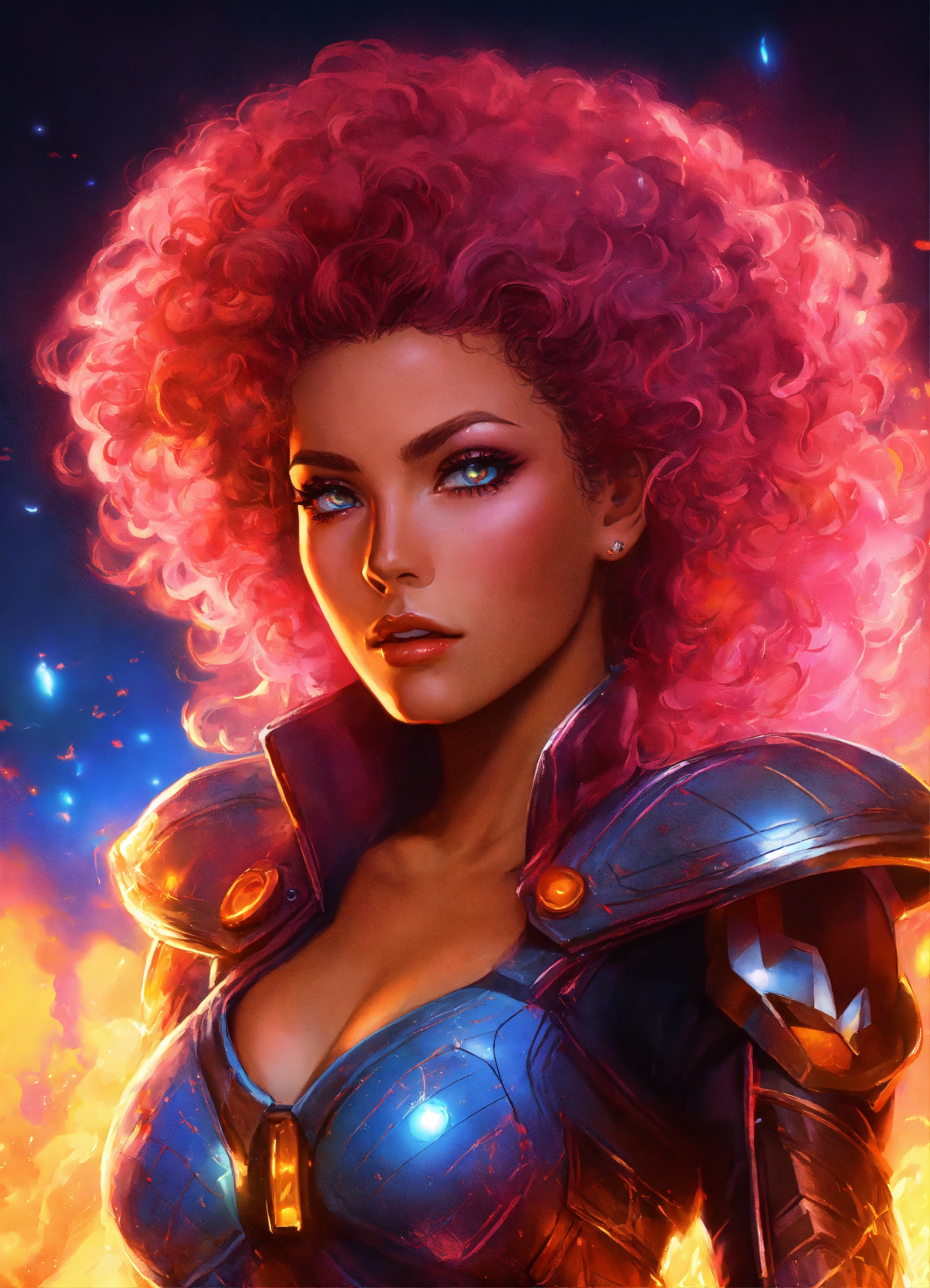 "80s starfire", big hair, light, glowing, power, magic, flames, pulsing, intricately detailed eyes, head and shoulders portrait