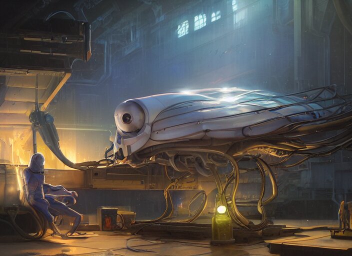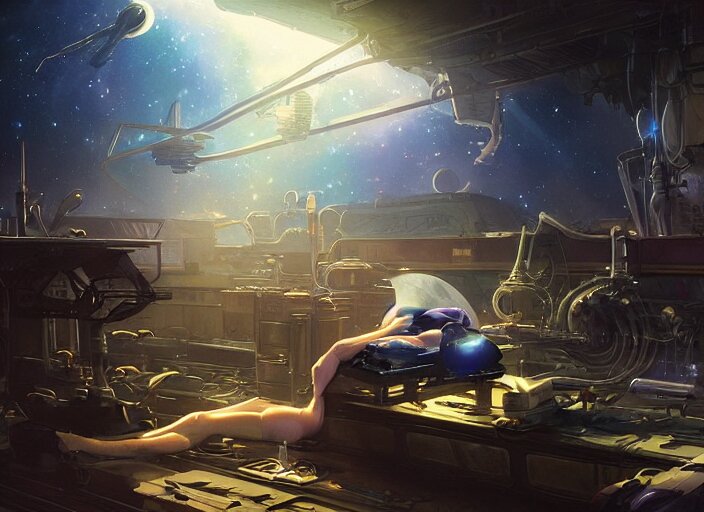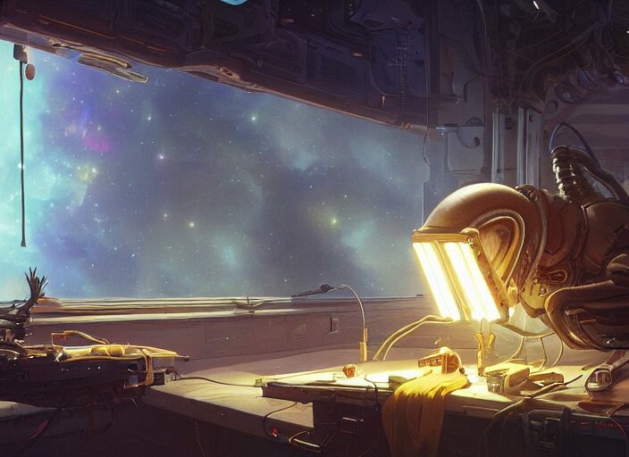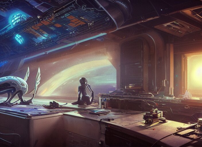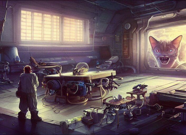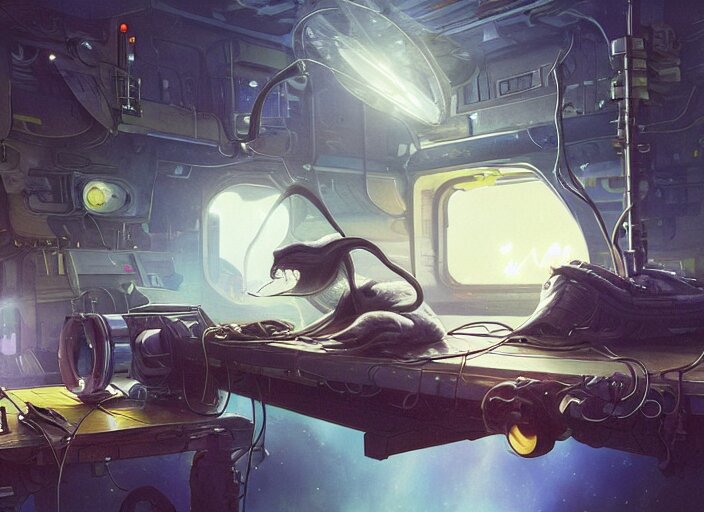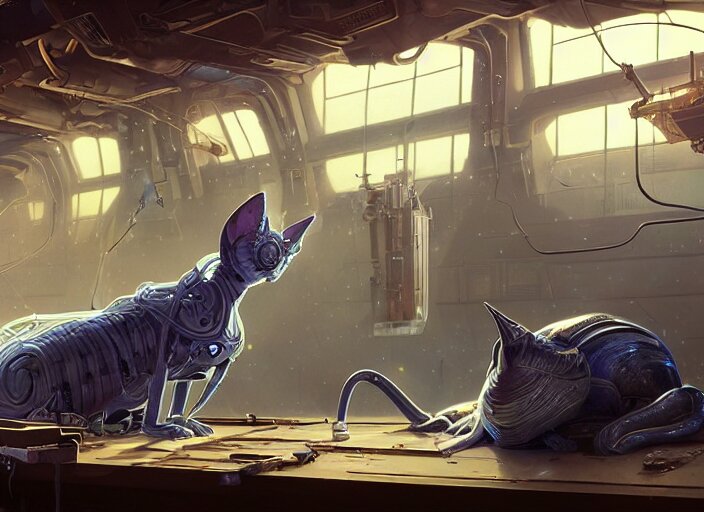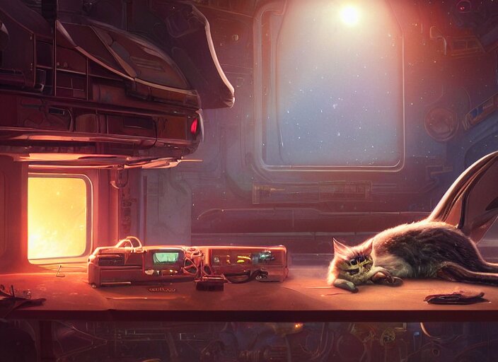 Alien space cat sleeping on a mechanics workbench while its owner repairs the ship, in a spaceport, in a space opera and cassette futurism ghibli animated film, volumetric lighting, octane render by stanley artgerm lau, greg rutkowski, thomas kindkade, alphonse mucha, loish, norman rockwel, highly detailed