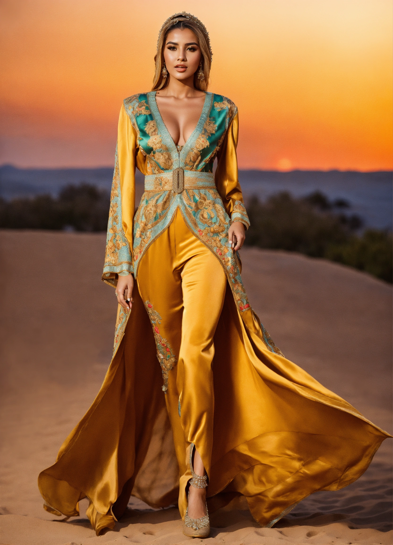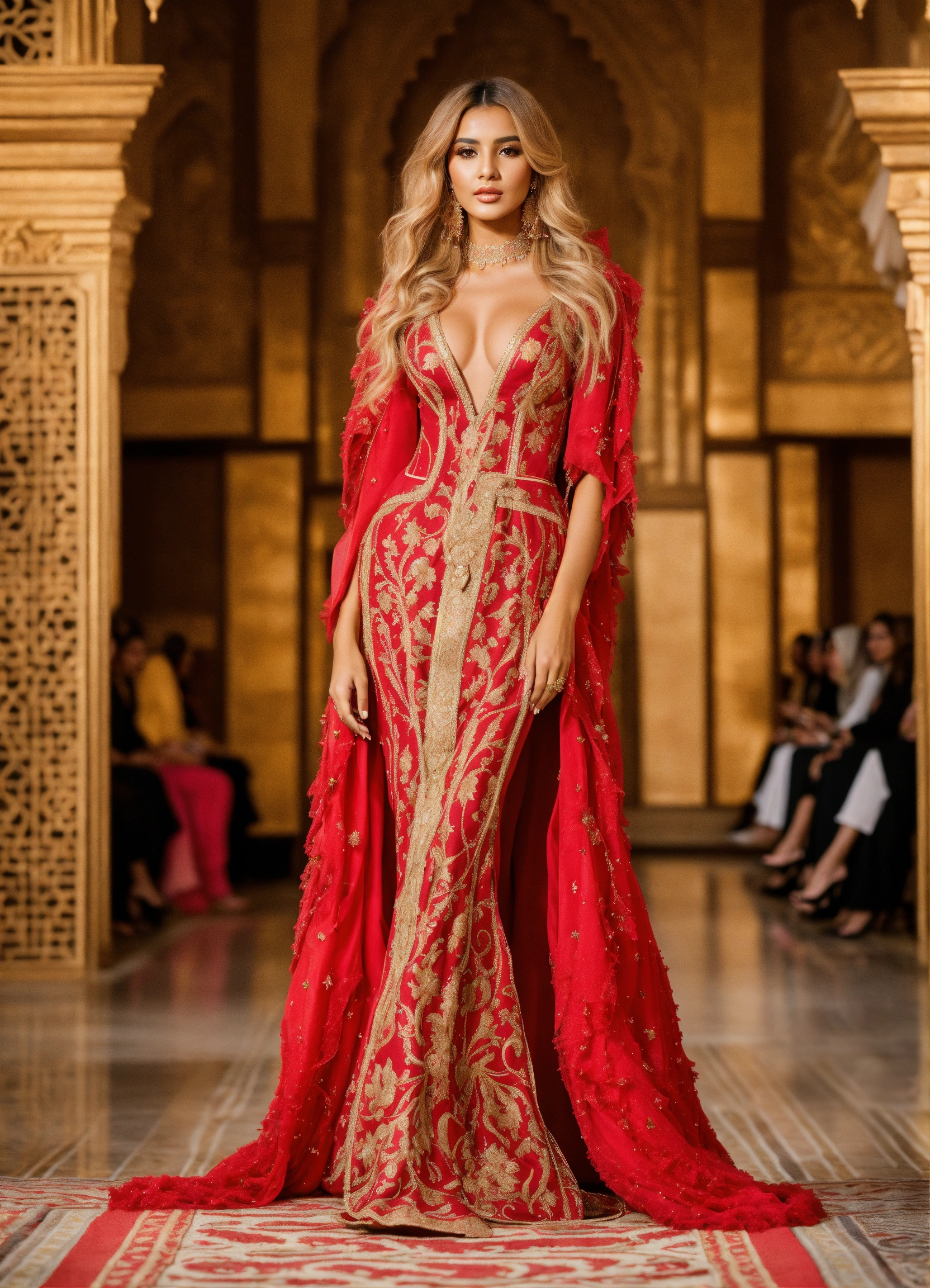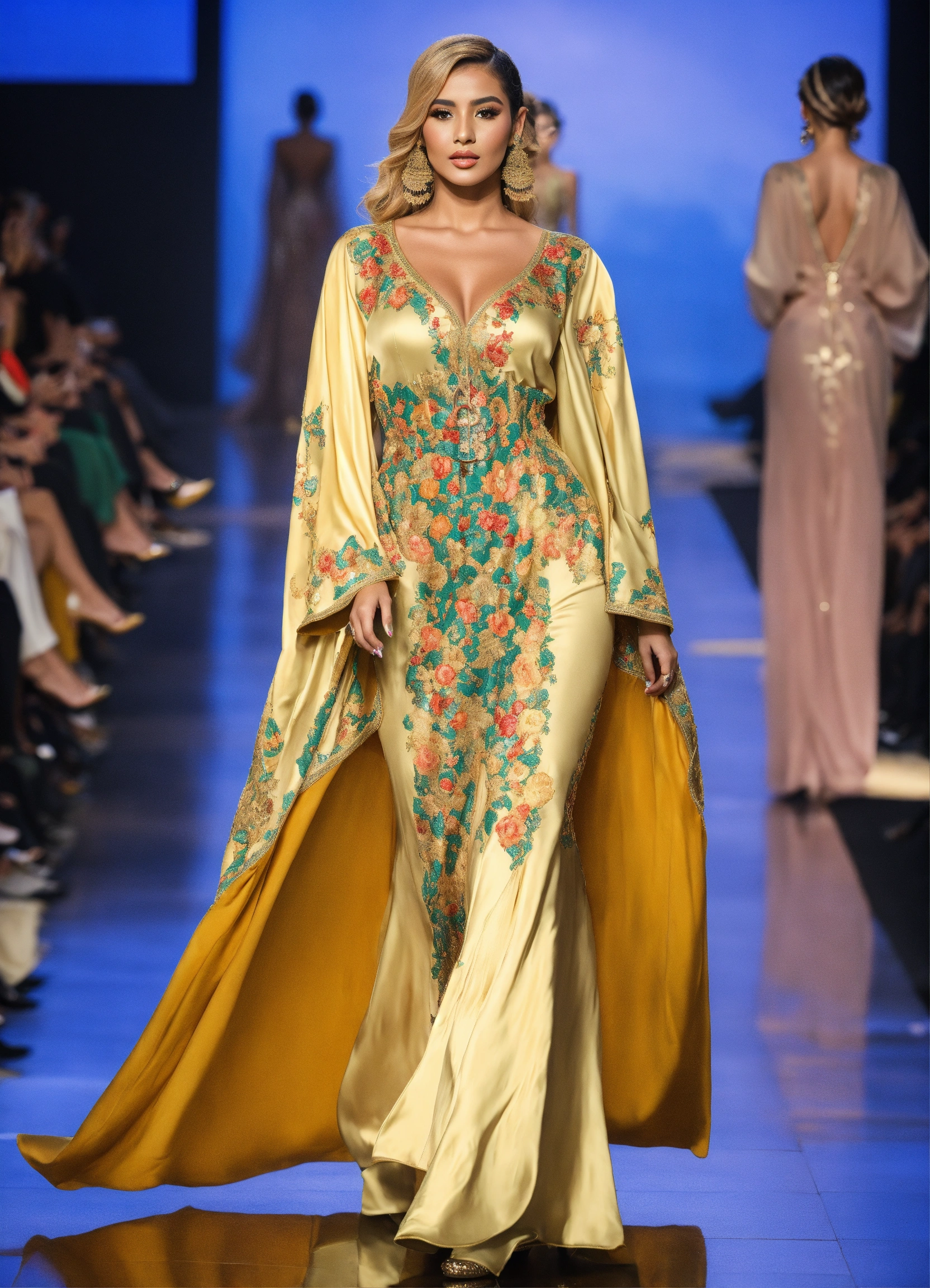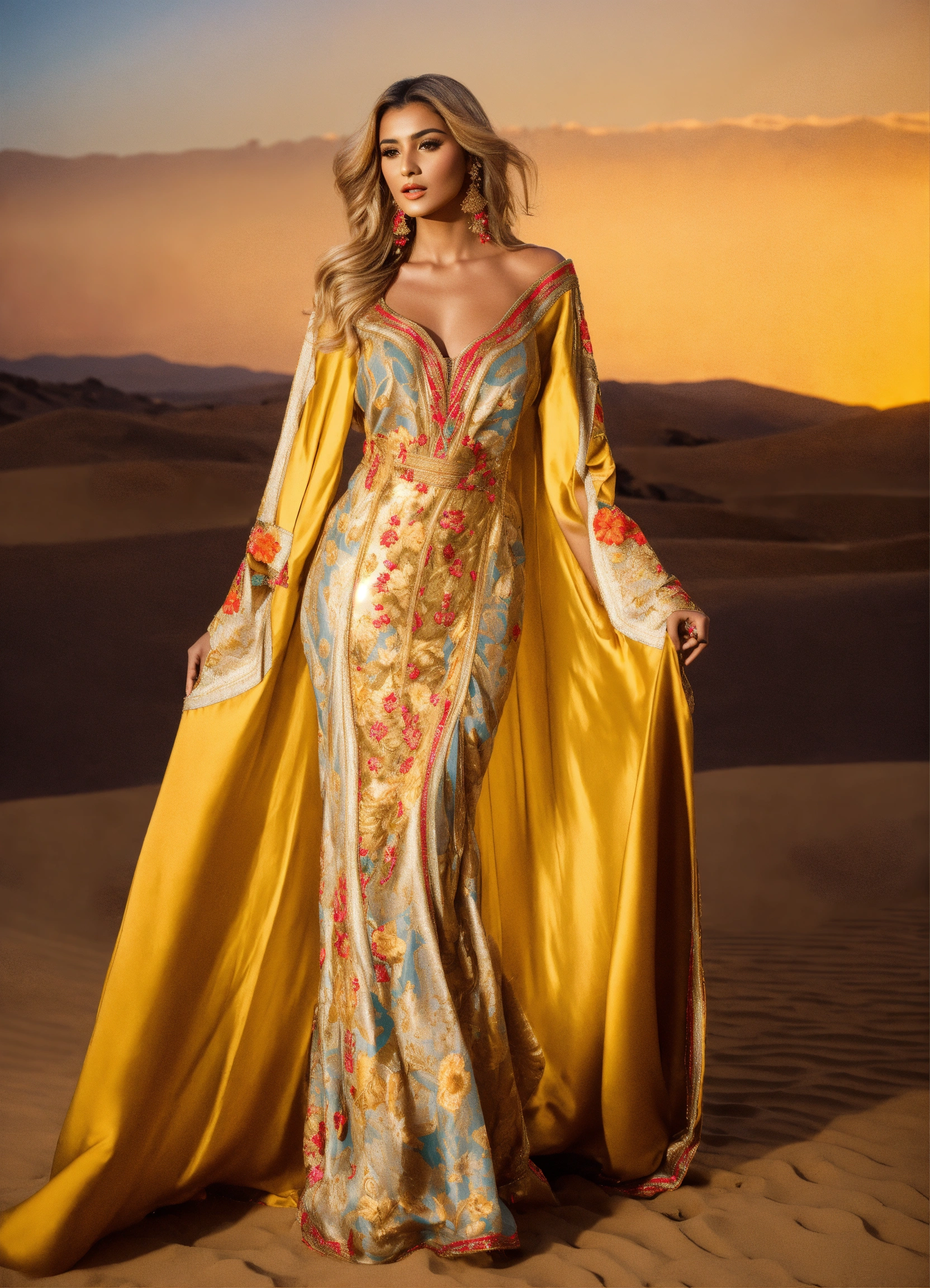 Beautiful arab women blond, wearing traditional moroccan caftan, with large corset, luxury, haute couture, fashion show runaway, haute couture, sfifa moroccan full body