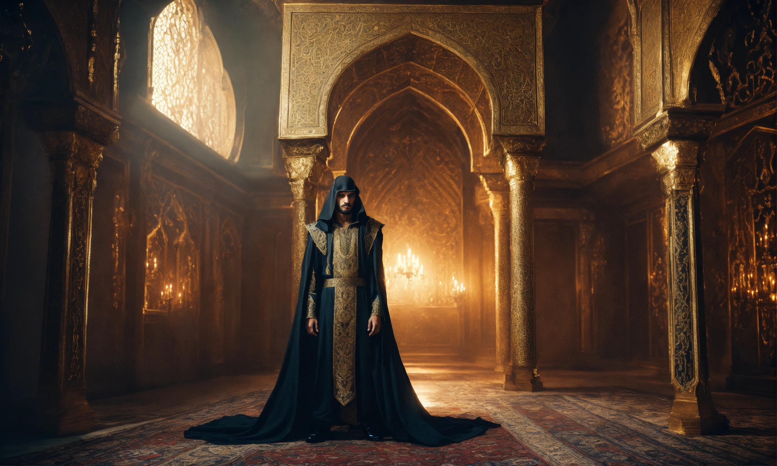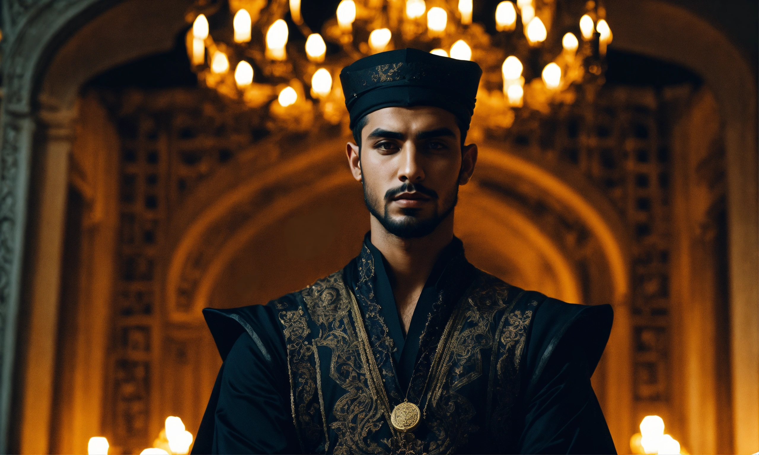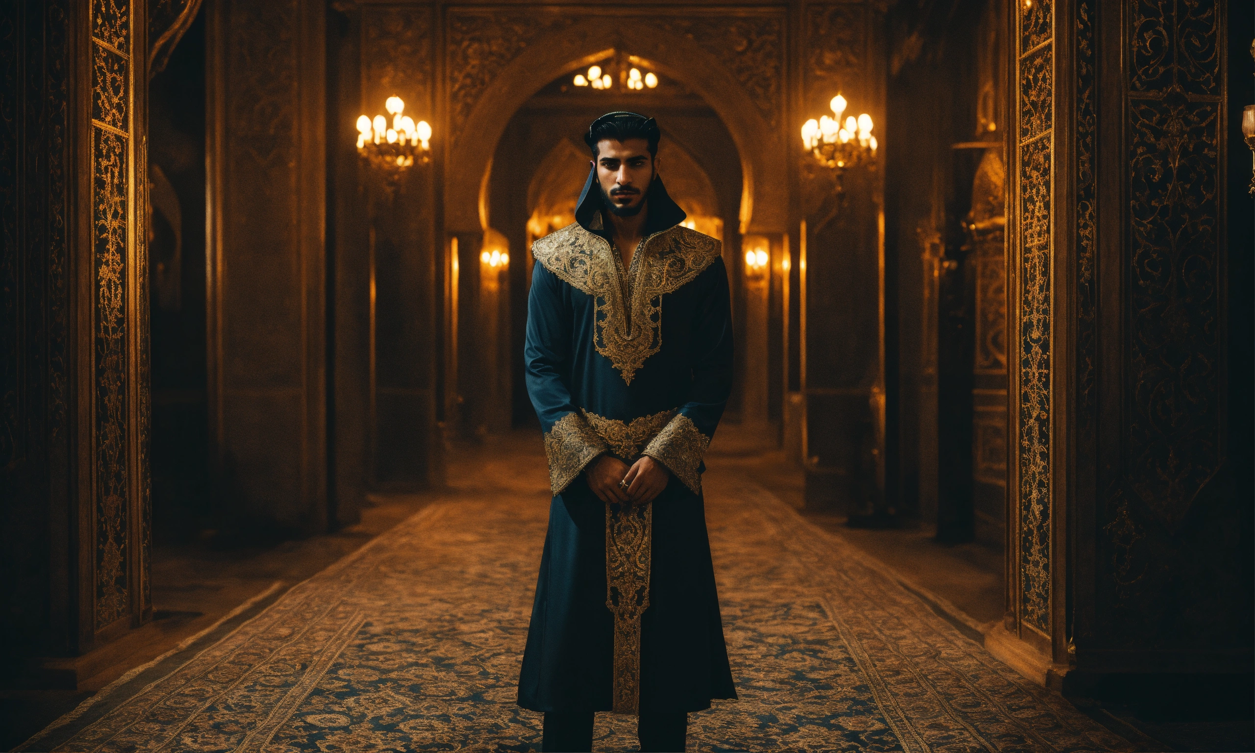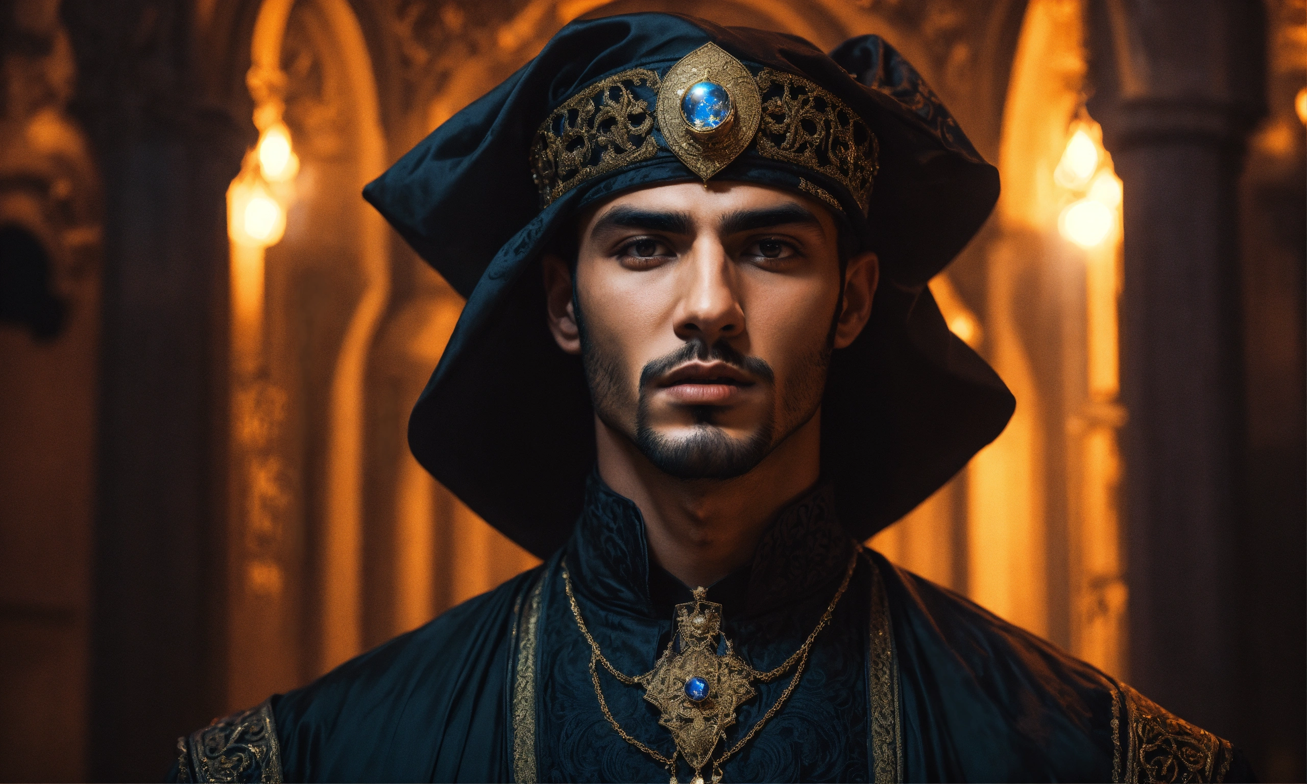 Portrait of a young handsome evil arabic sorcerer, ominous palace, ornate clothing, night, occult, eerie, magical