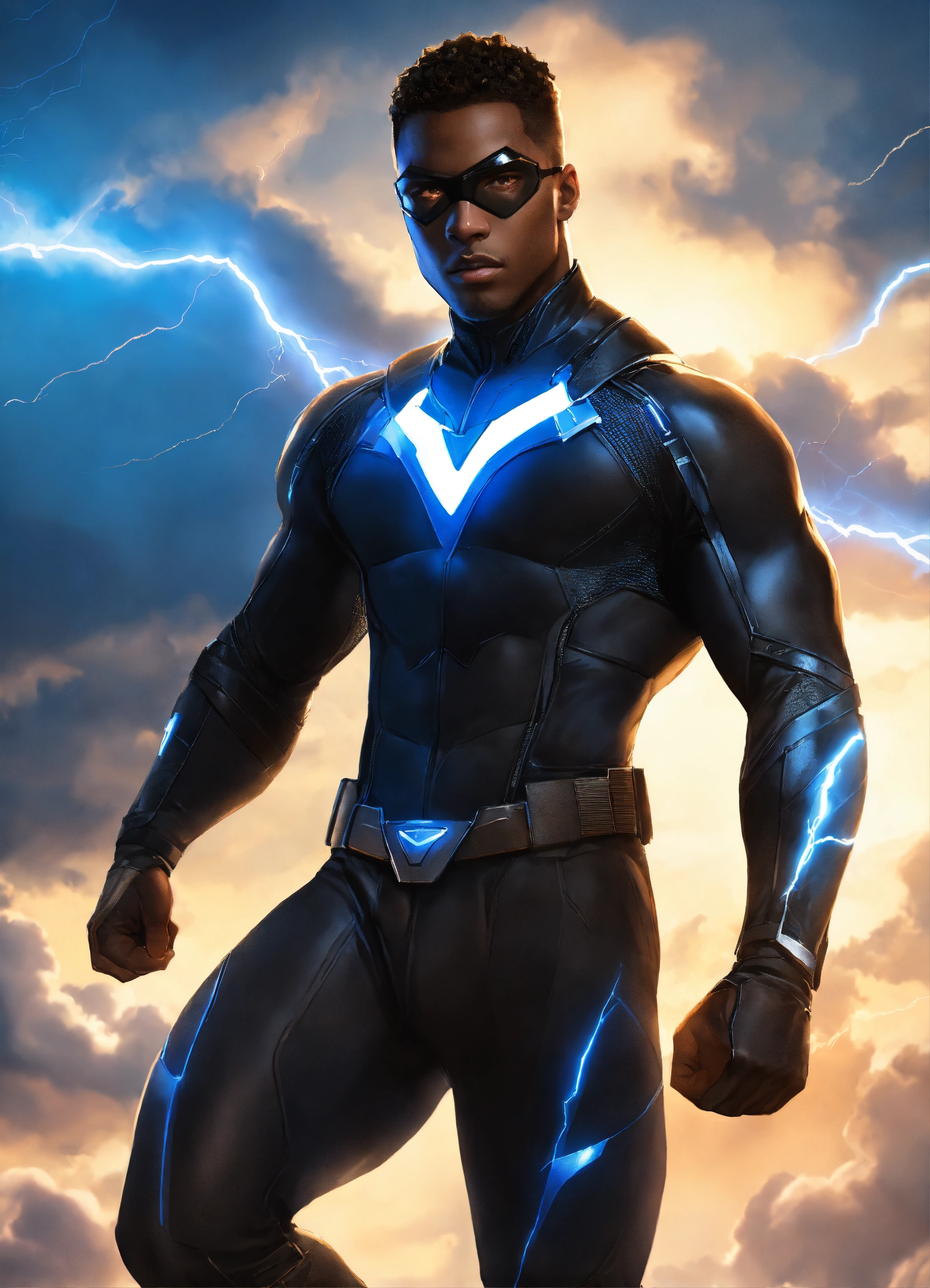Black hero, a strong handsome young black super hero man dark brown skin, handsome strong face with short hair, strong athletic build wearing a black super spy stealth suit floating in the sky with clouds and blue lightning behind him, fantasy, high detail, realistic photo, high detail, digital painting, cinematic, stunning, hyper-realistic, sharp focus, high resolution 8k, insanely detailed