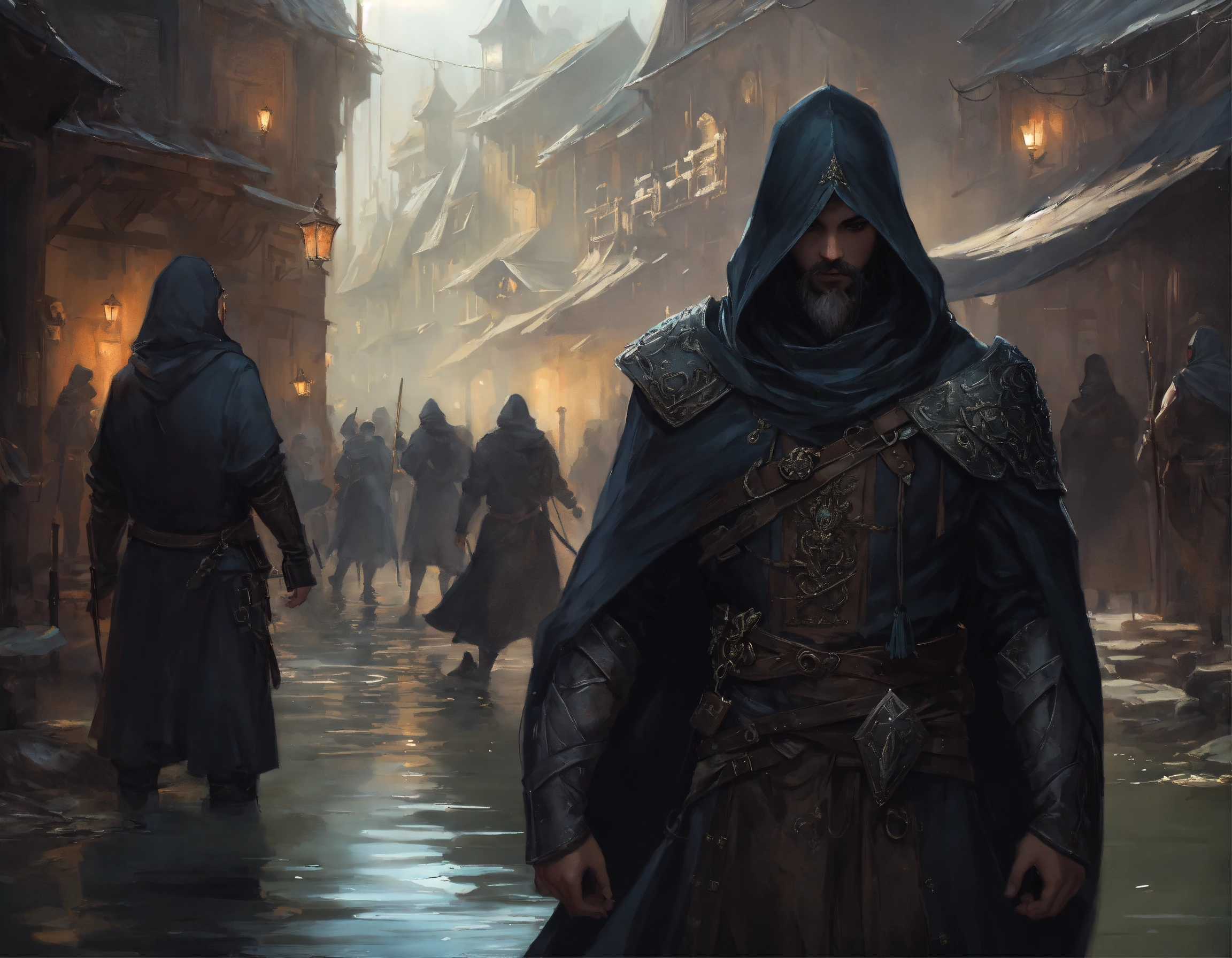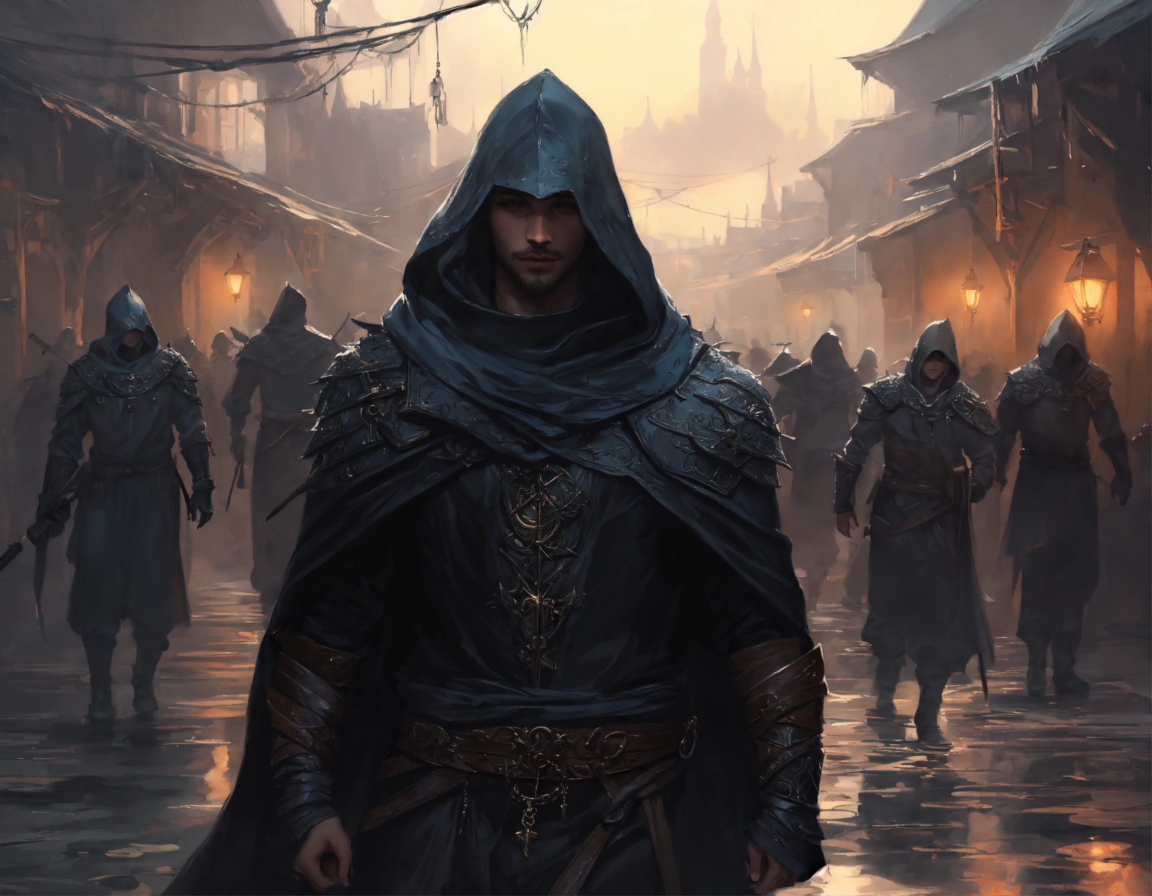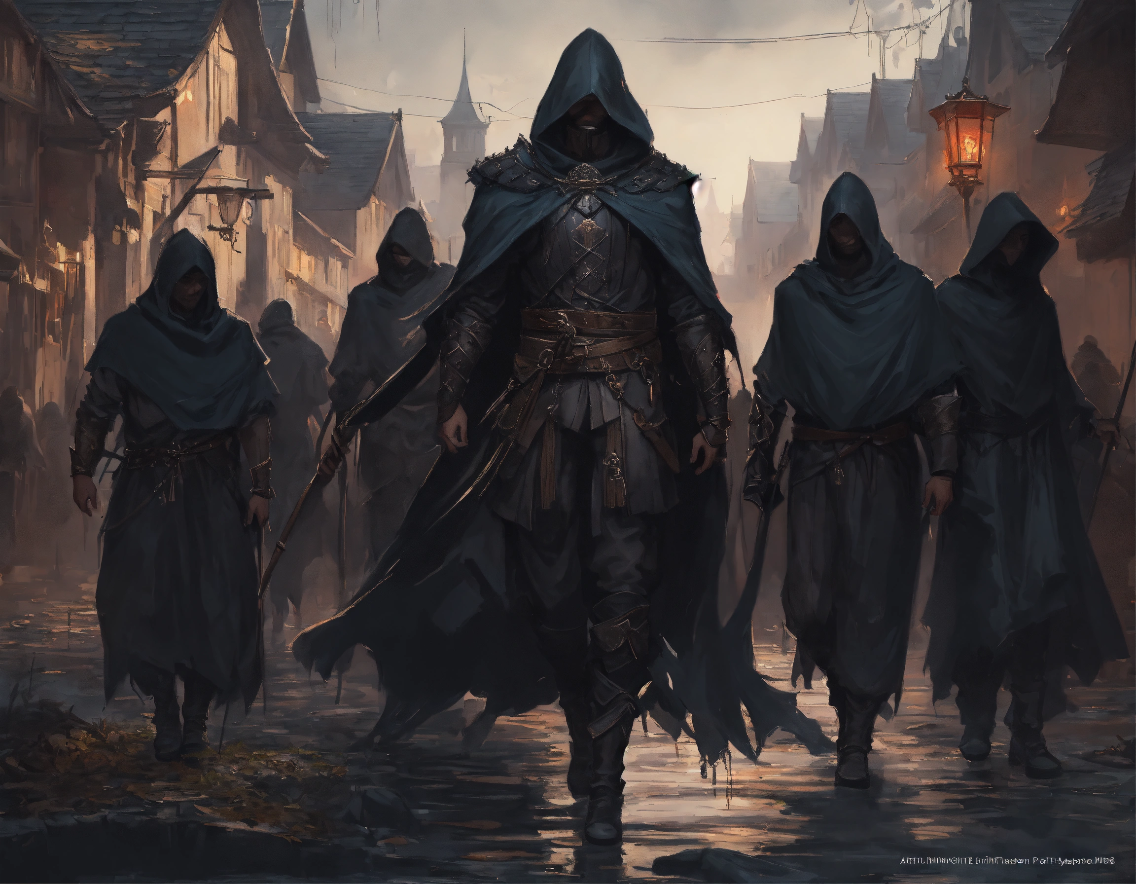 Dark fantasy painting, group of an male hangman with black compat cowl, medieval swamp city streets ., by artgerm, intricate detail, trending on artstation, 8k, fluid motion, stunning shading, by wlop
