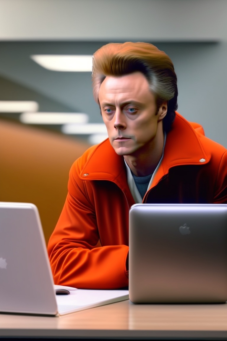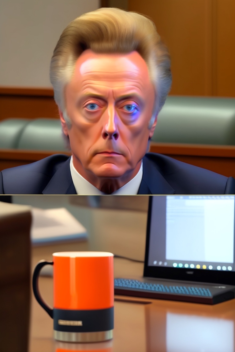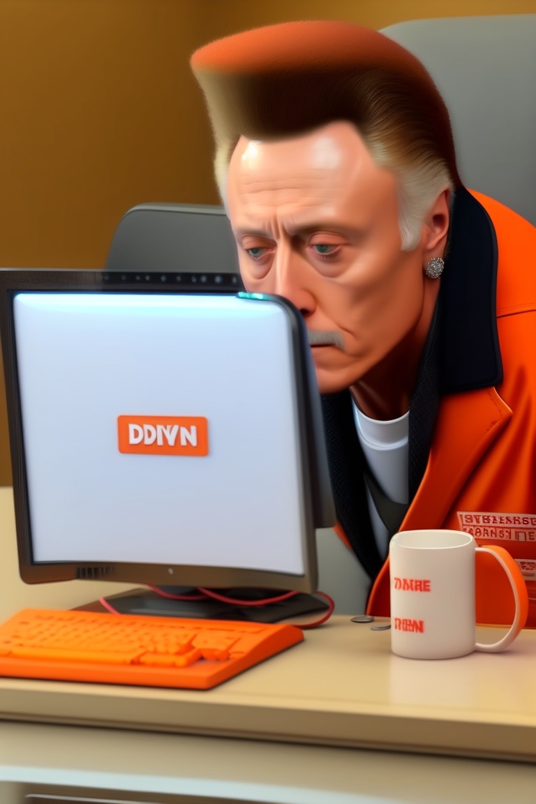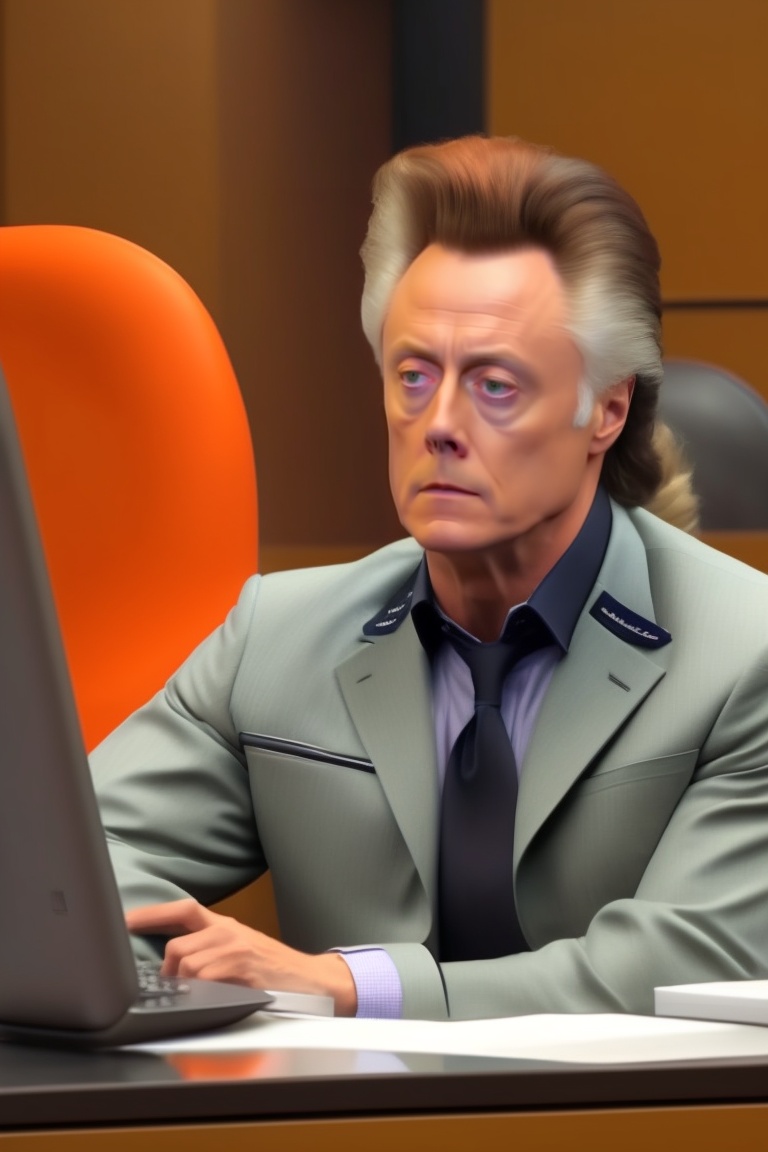 Christopher walken, orange jumpsuit, sitting at desk, computer, working at dmv, harsh lighting, mug shot, bored