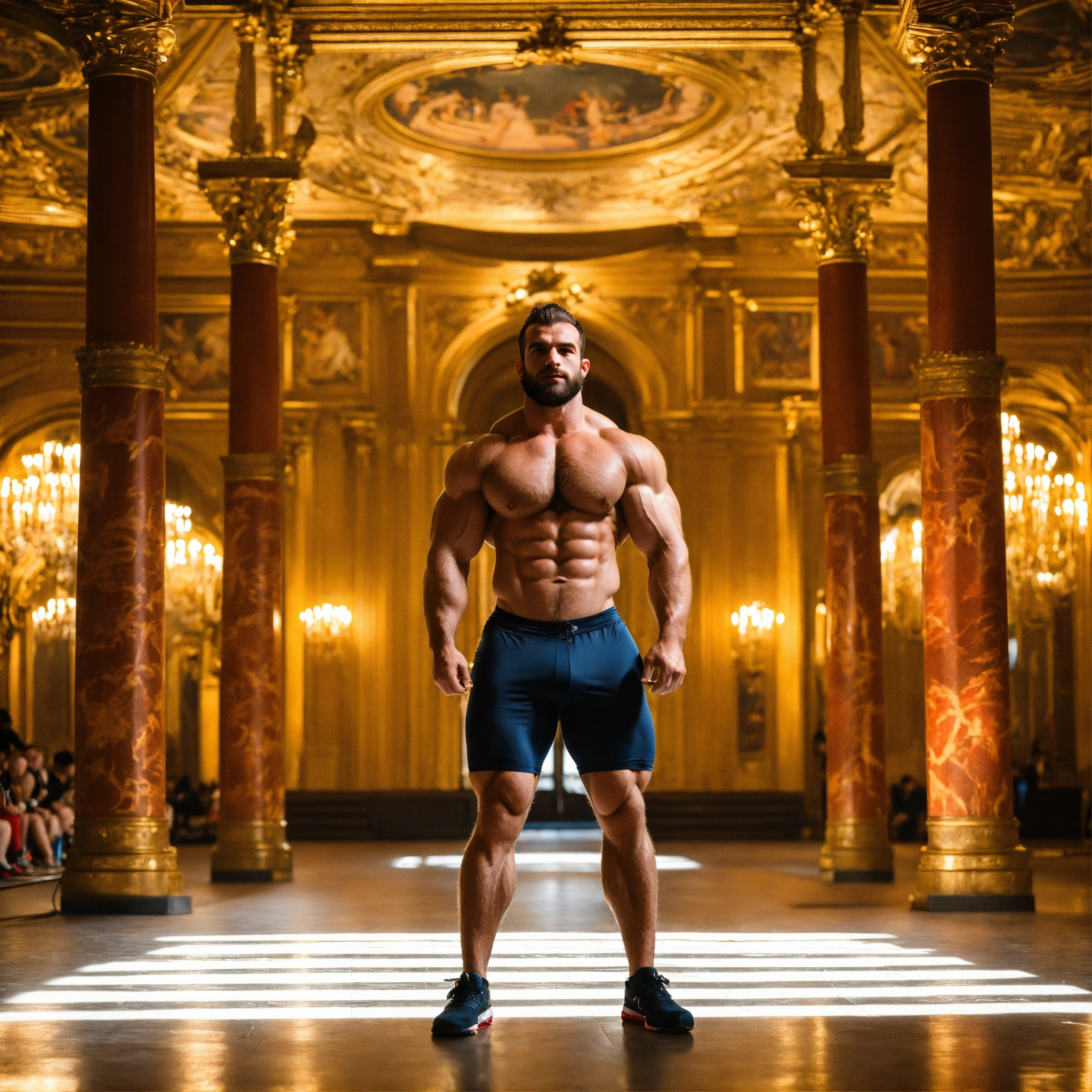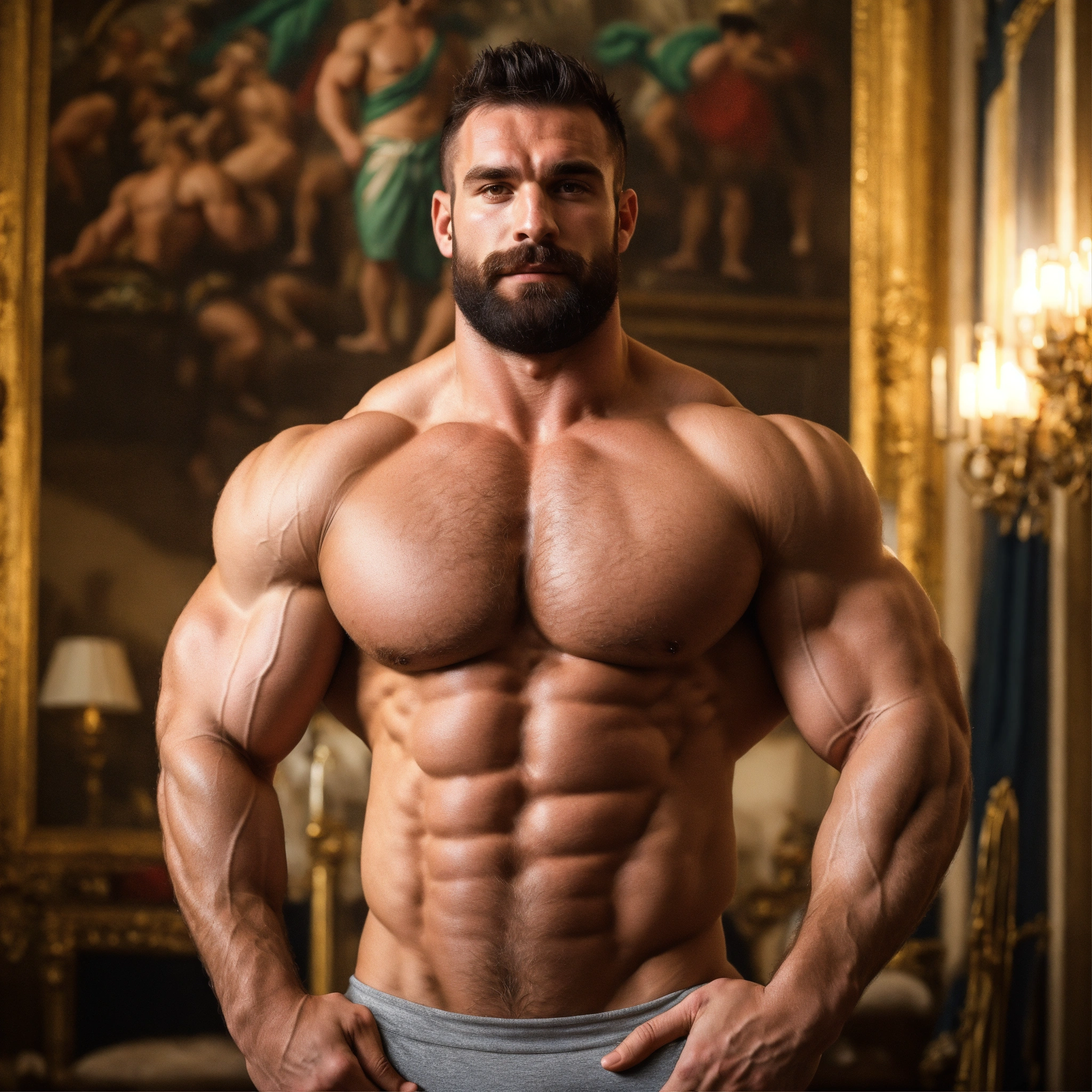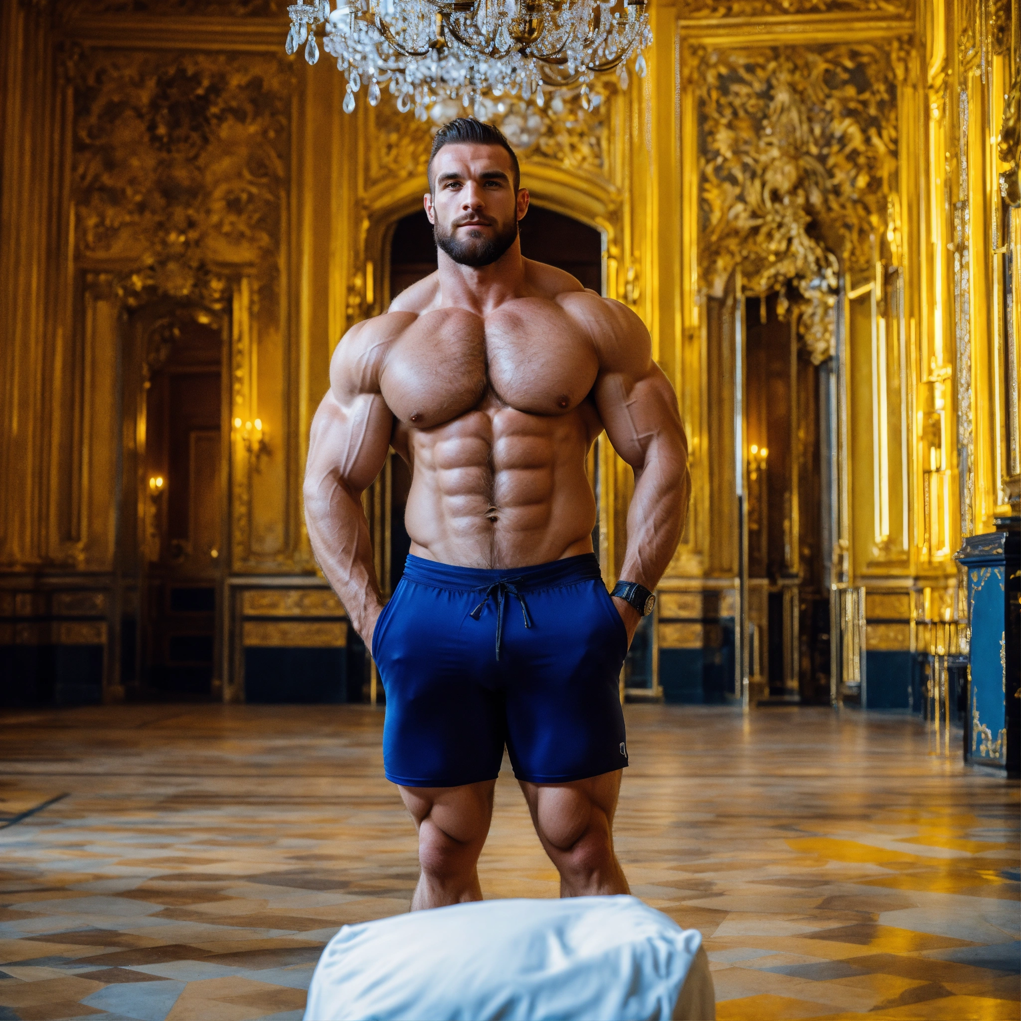 30-year-old hairy french man with big muscles, big bodybuilder, body like a wrestler, in a beautiful palace