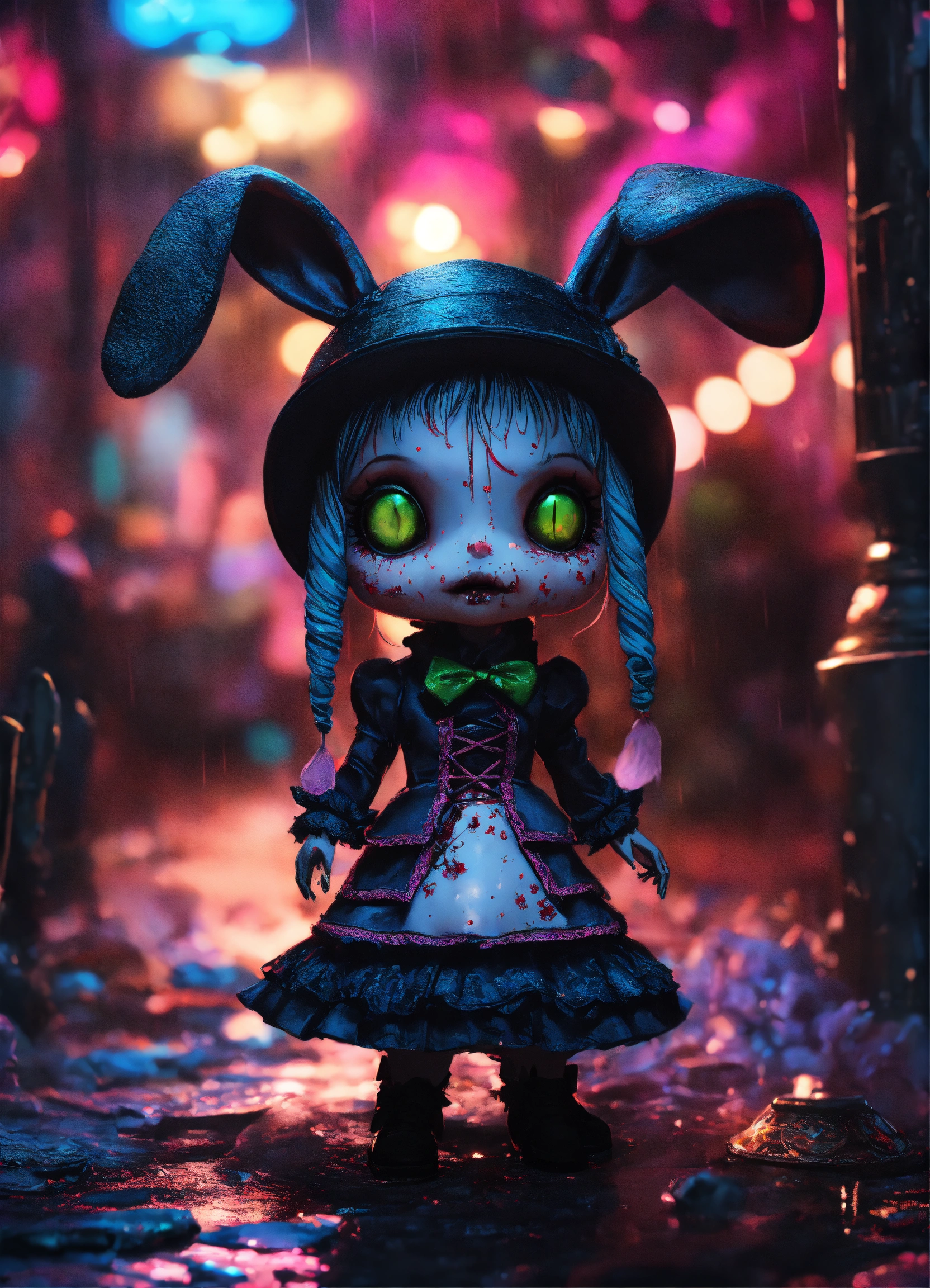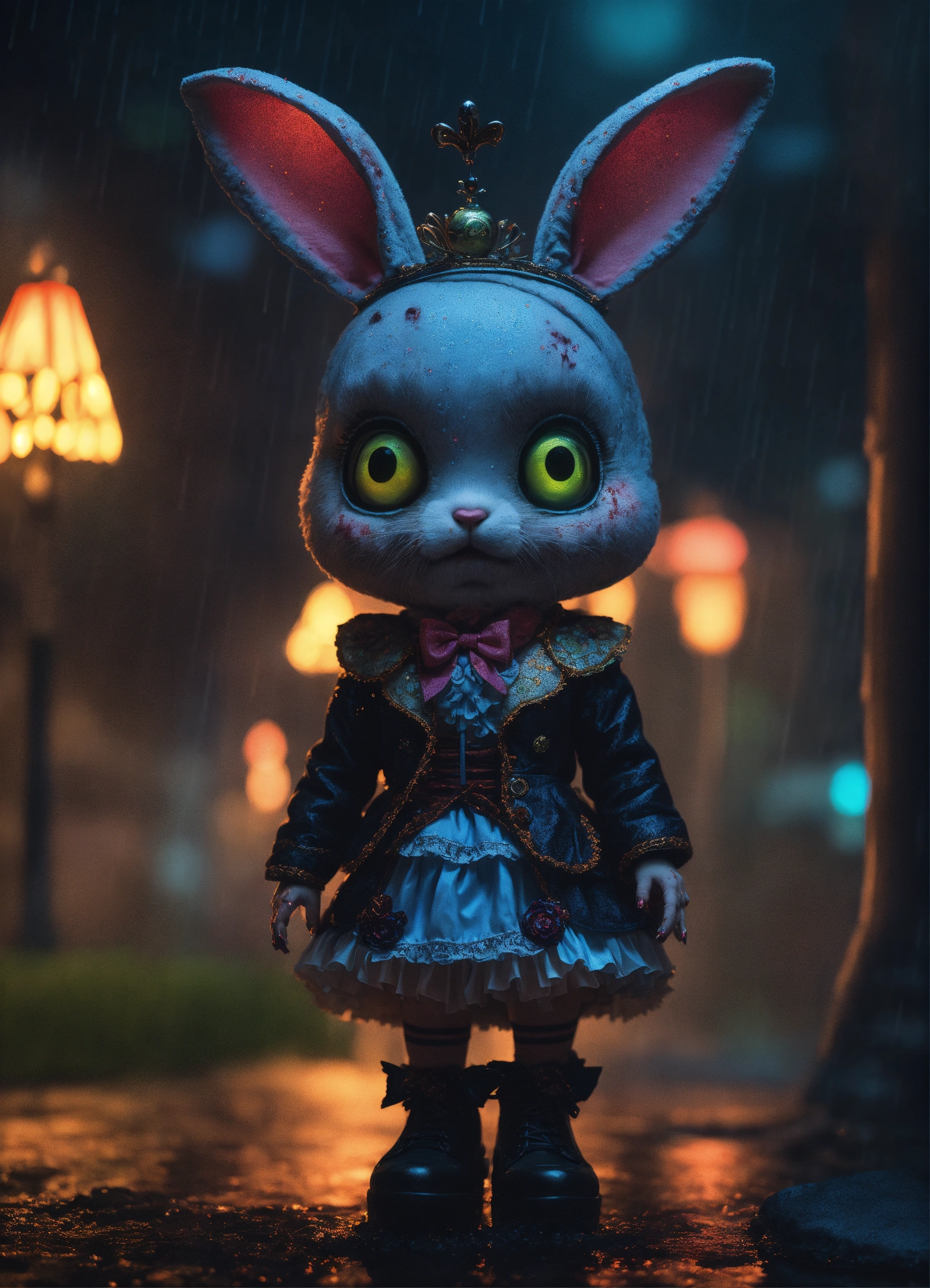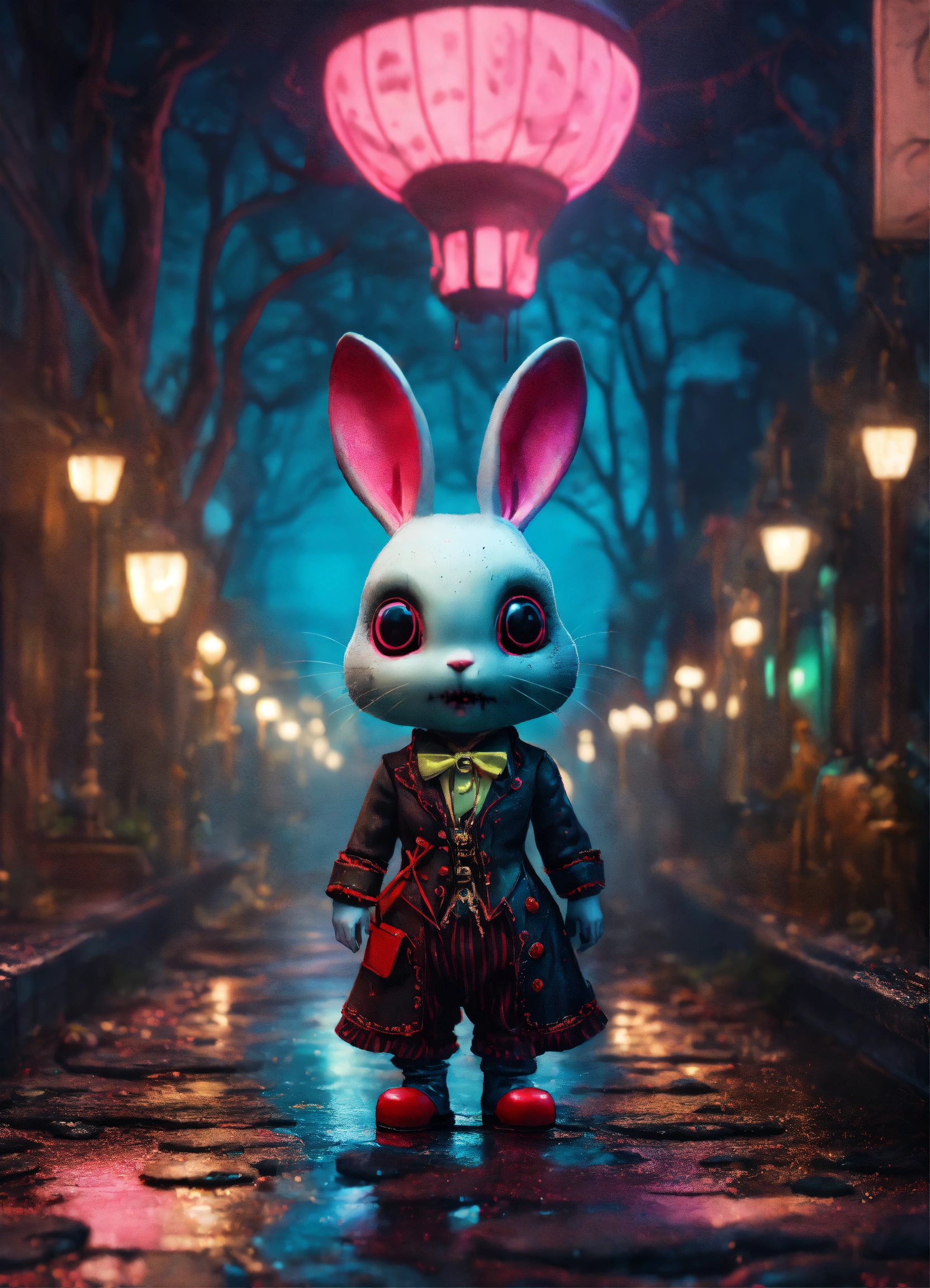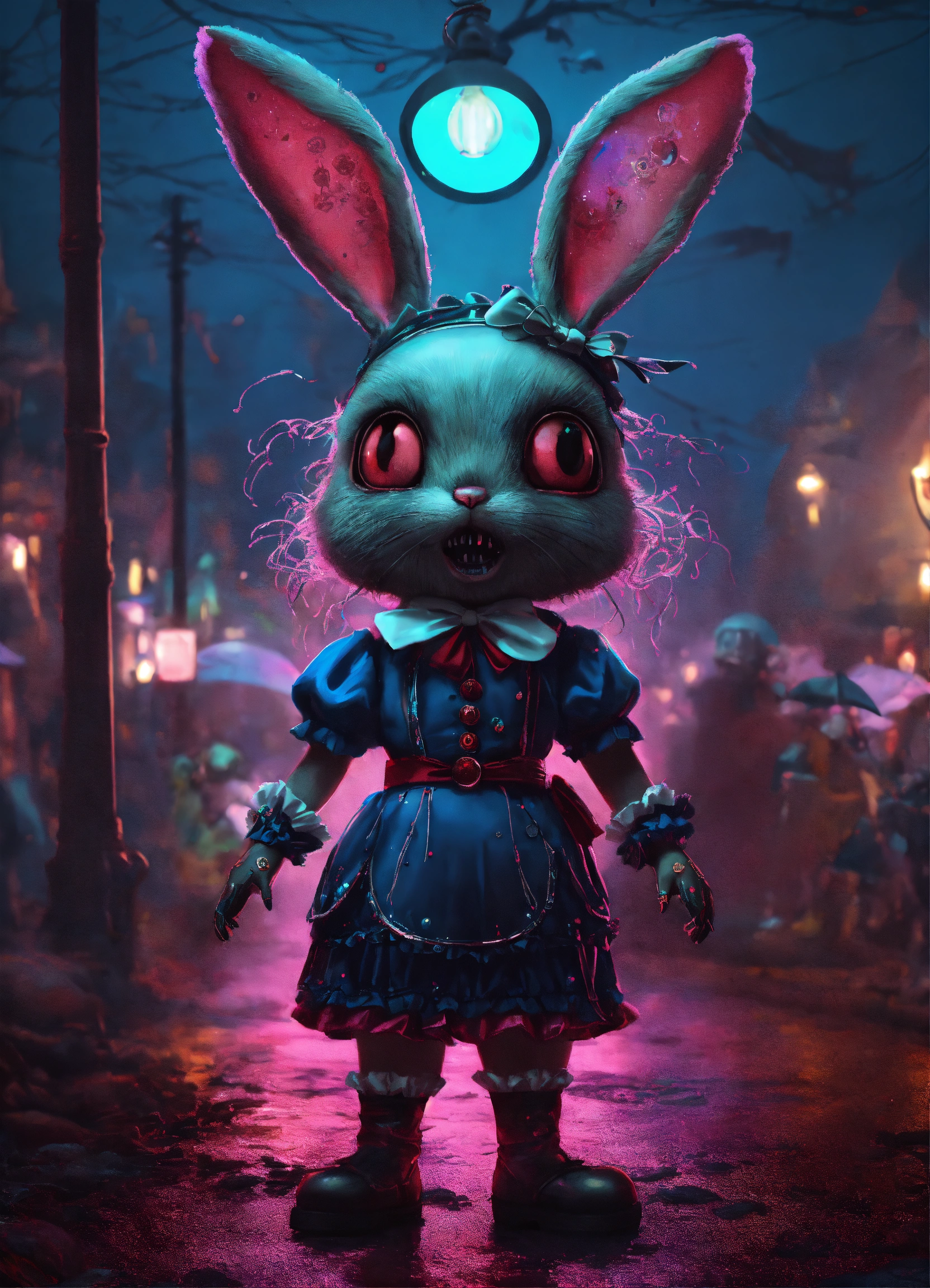 Creepy little zombie bunny alice in wonderland, l, detailed scene, black, perfect face, intricately detailed photorealism, trending on artstation, neon lights, rainy night, stunning full body anime art by mark ryden