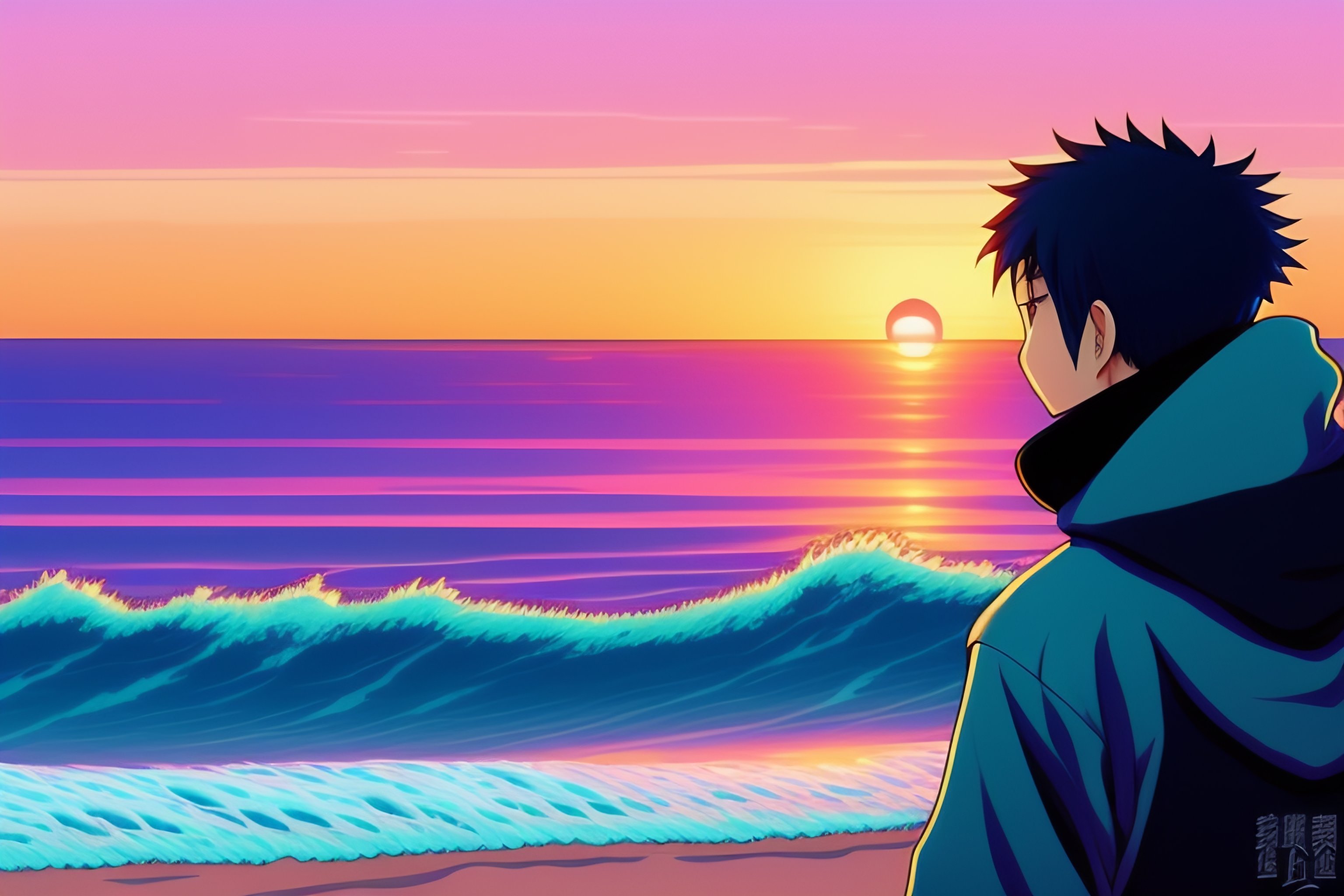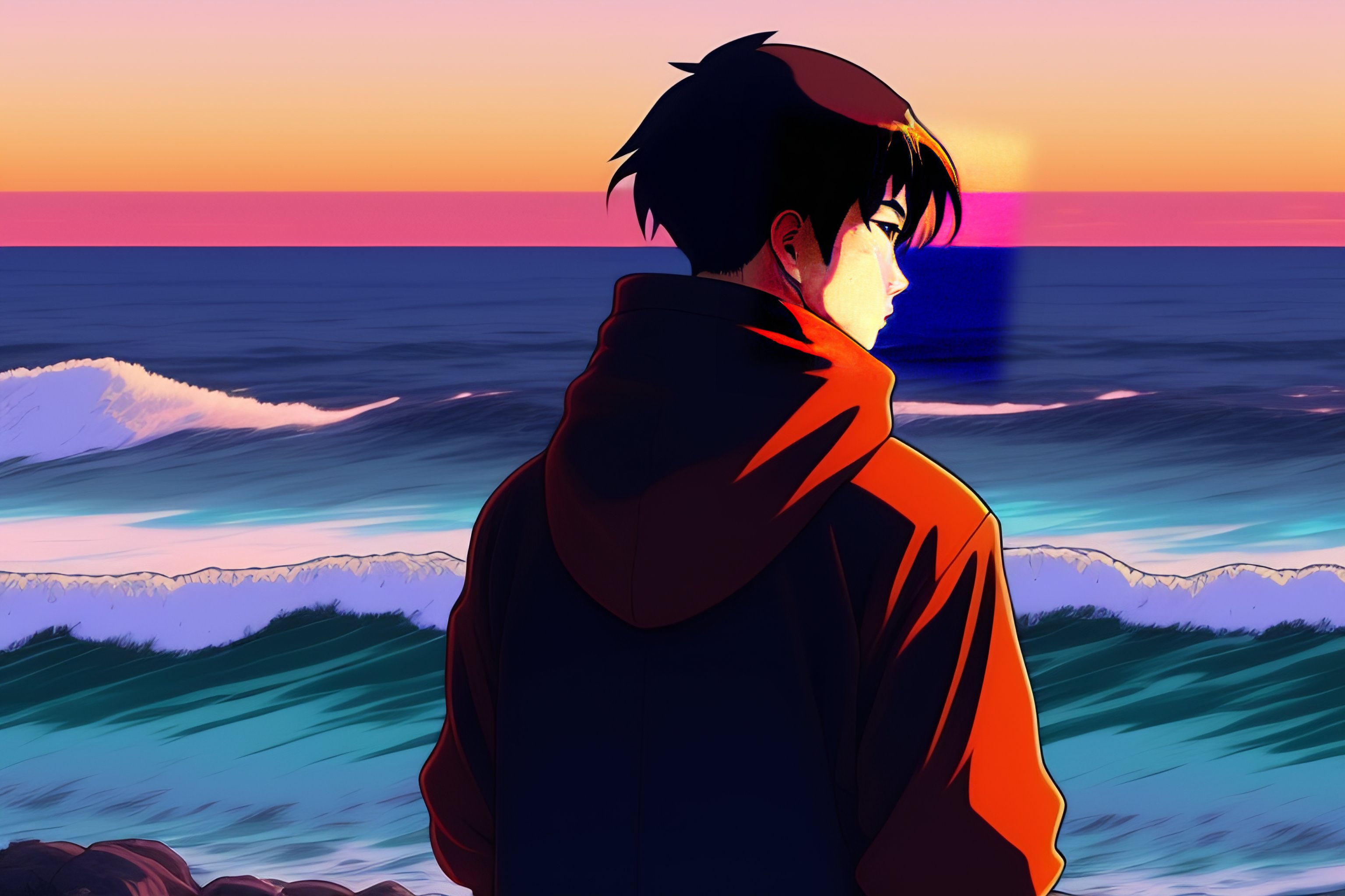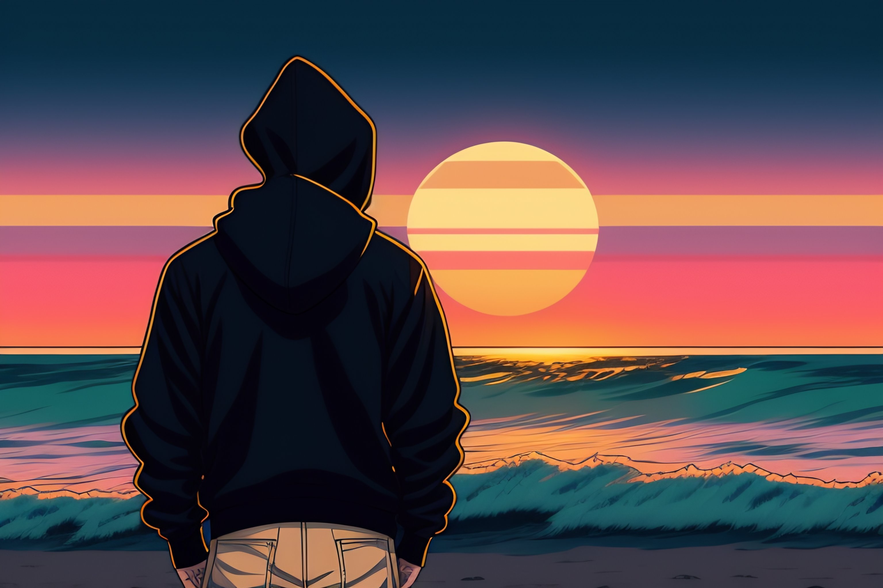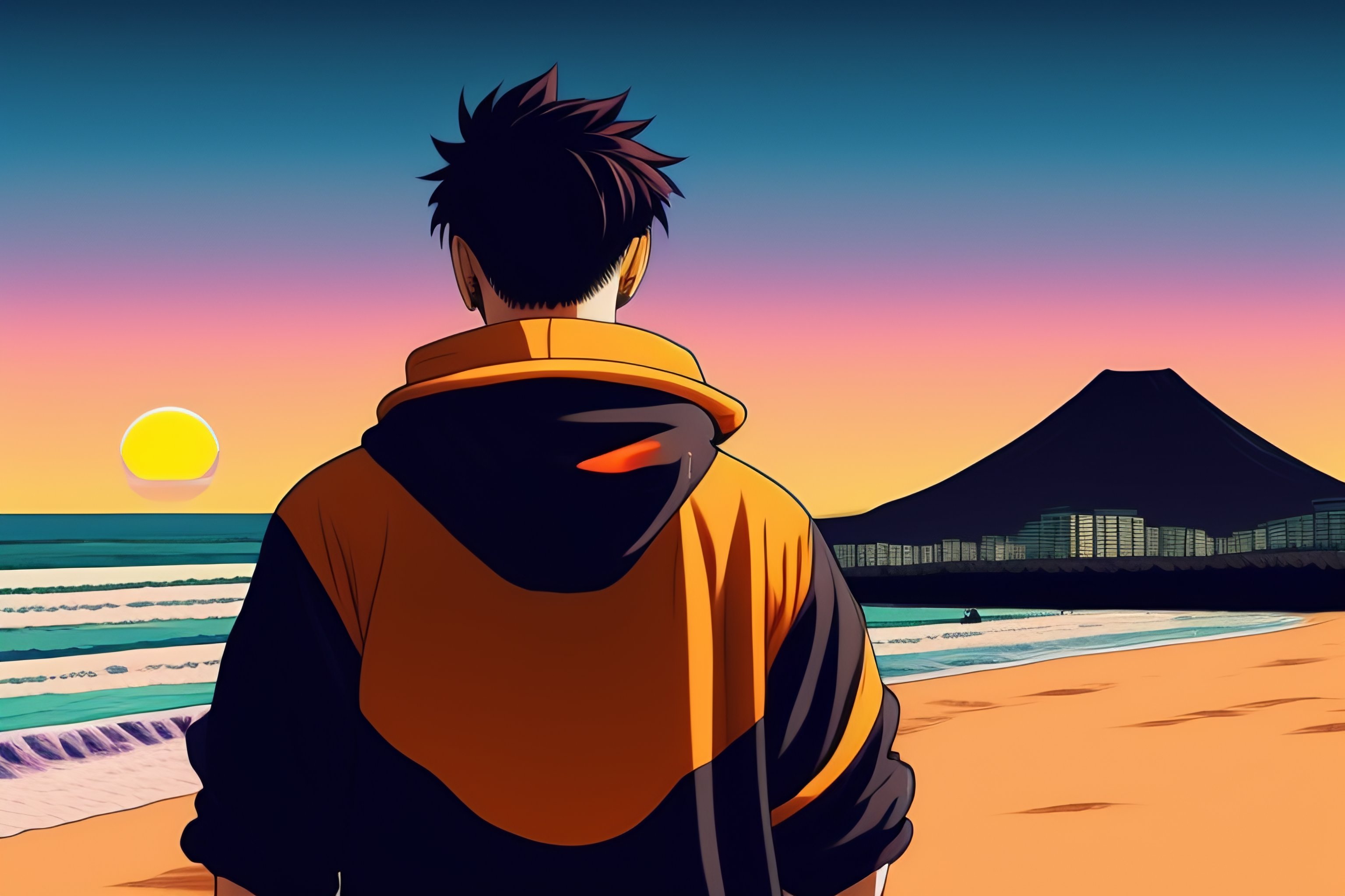 A japanese guy wearing a black hoodie but not wearing a food, standing and showing us his back, looking at the sunset over the ocean at the beach, in the style of 90's vintage anime style. detailed line art.
