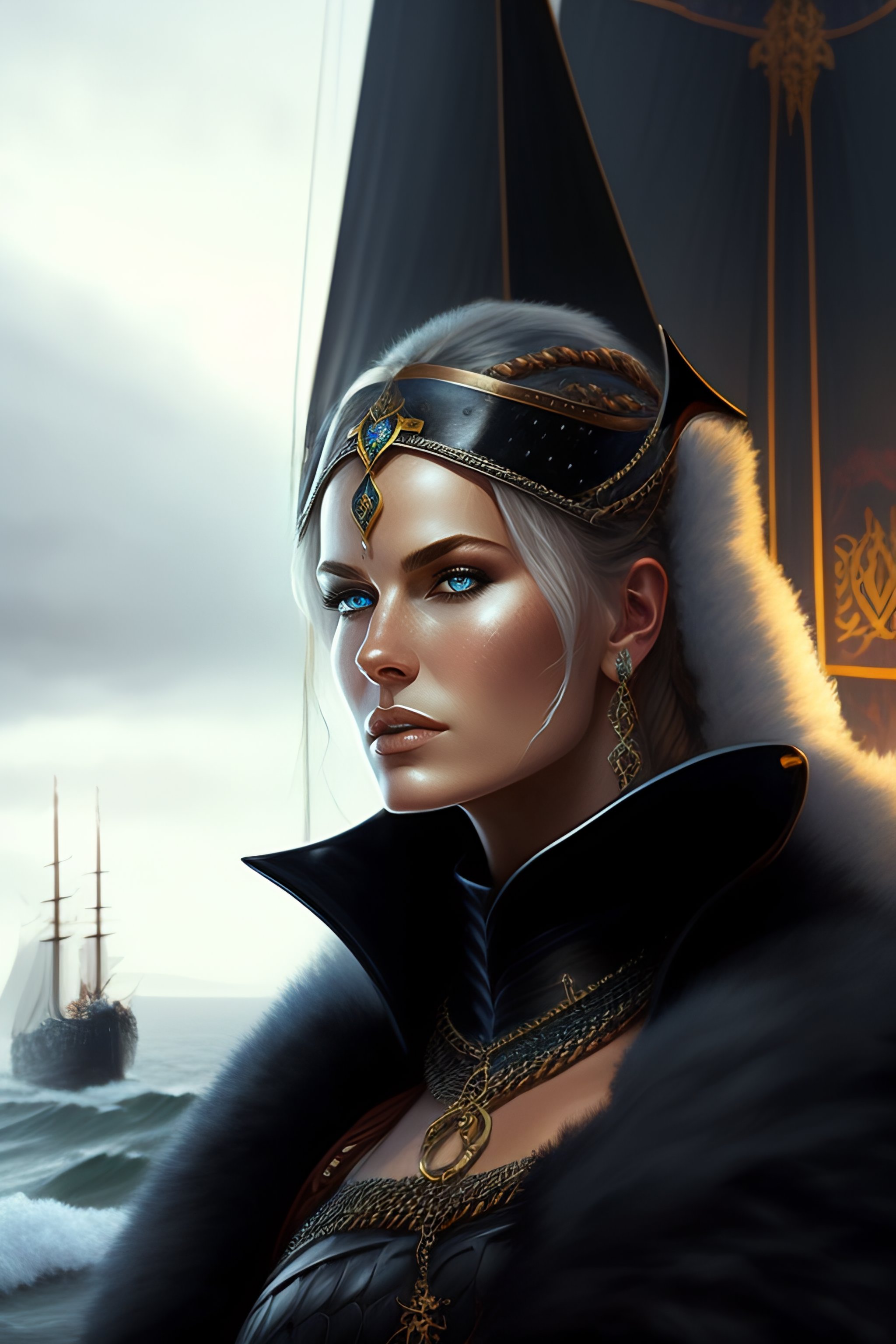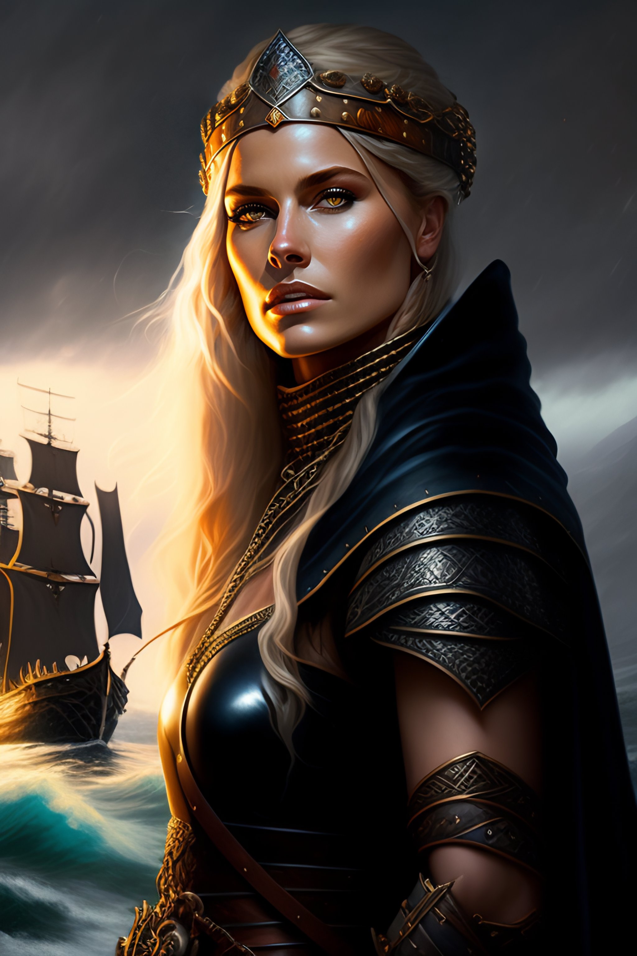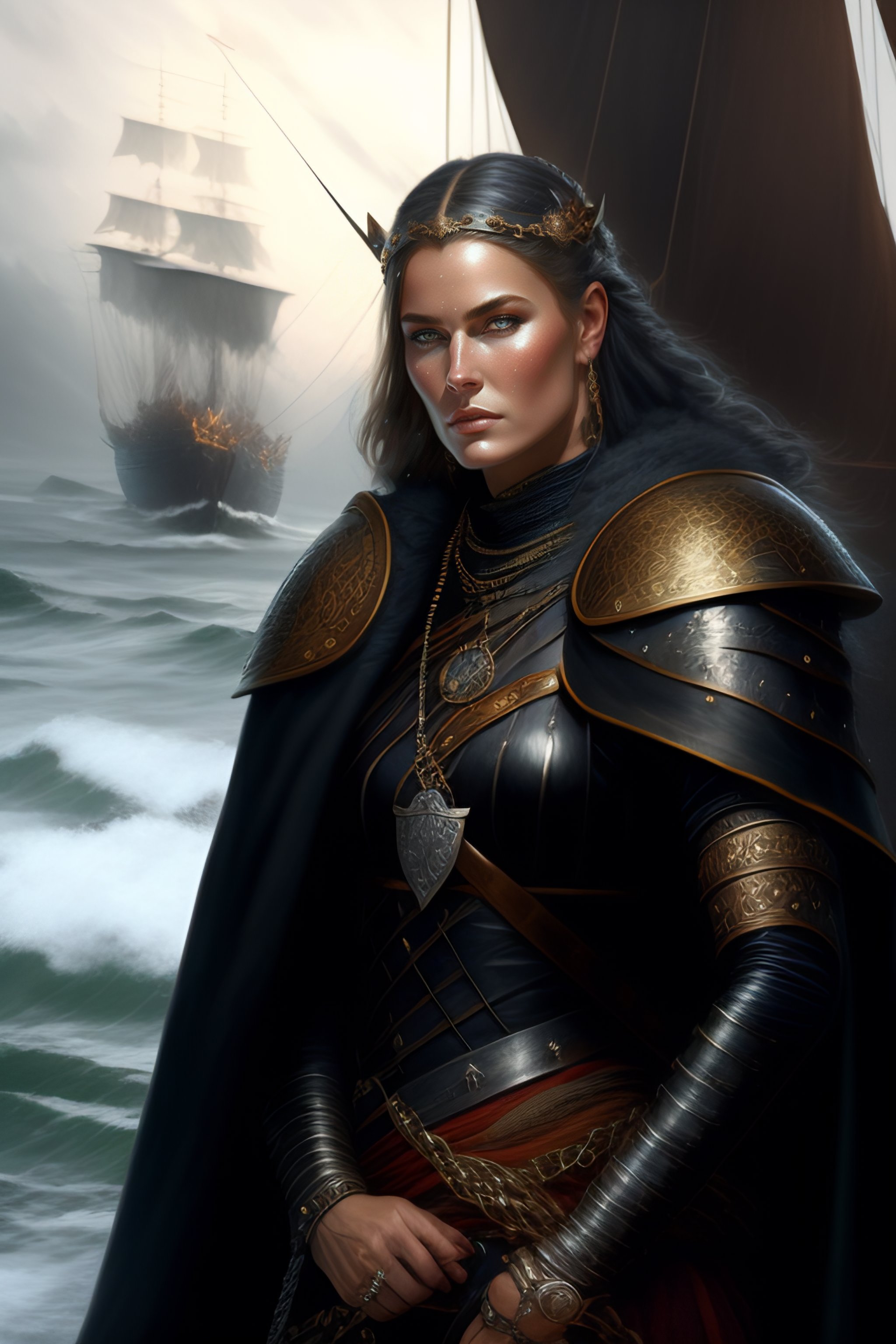 Medieval portrait of a viking warrior woman wearing black chain armor and a cloak sharp features, grim, cold stare, dark colors, volumetric lighting, baroque oil painting in ship in storm in the background by greg rutkowski, artgerm, wlop, alphonse mucha dynamic lighting hyperdetailed intricately detailed