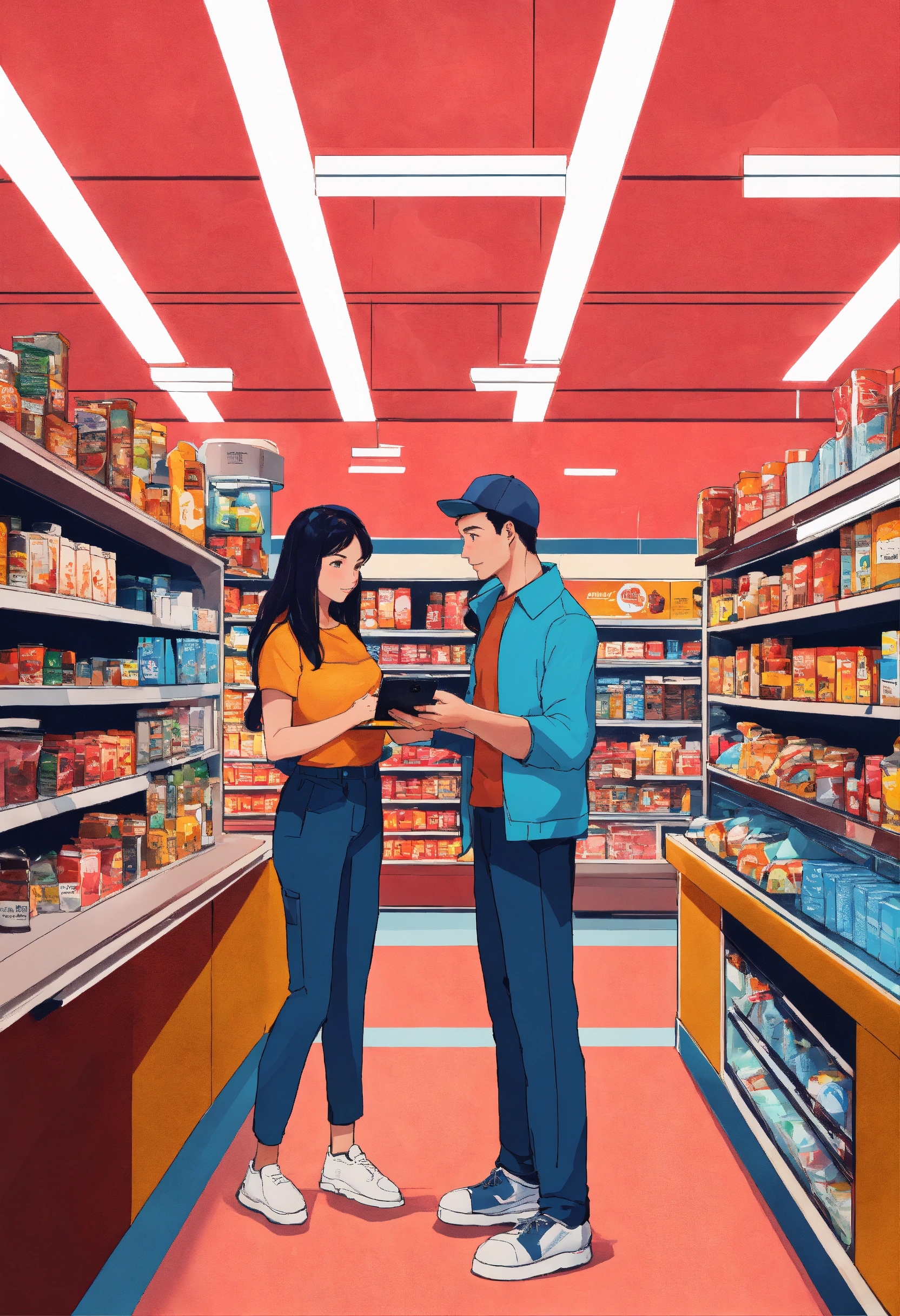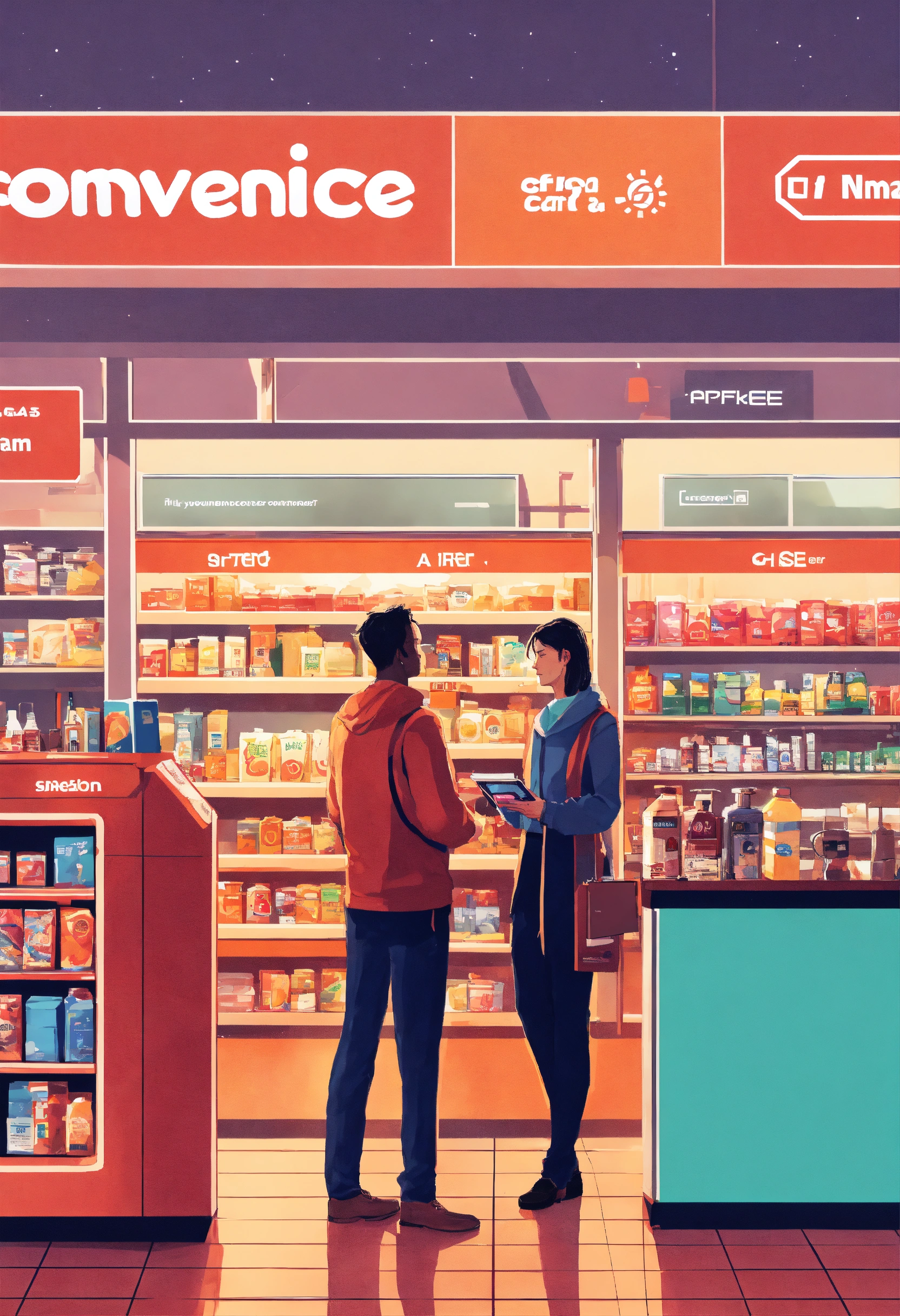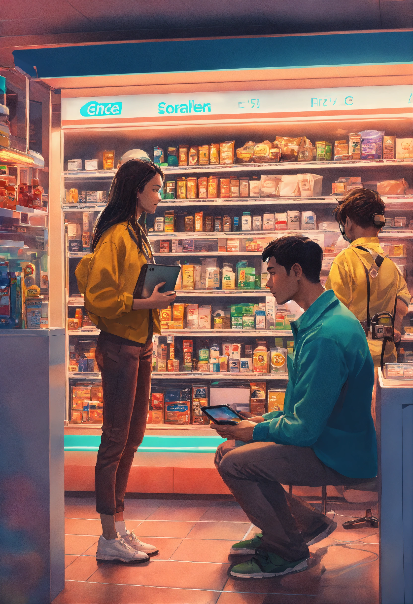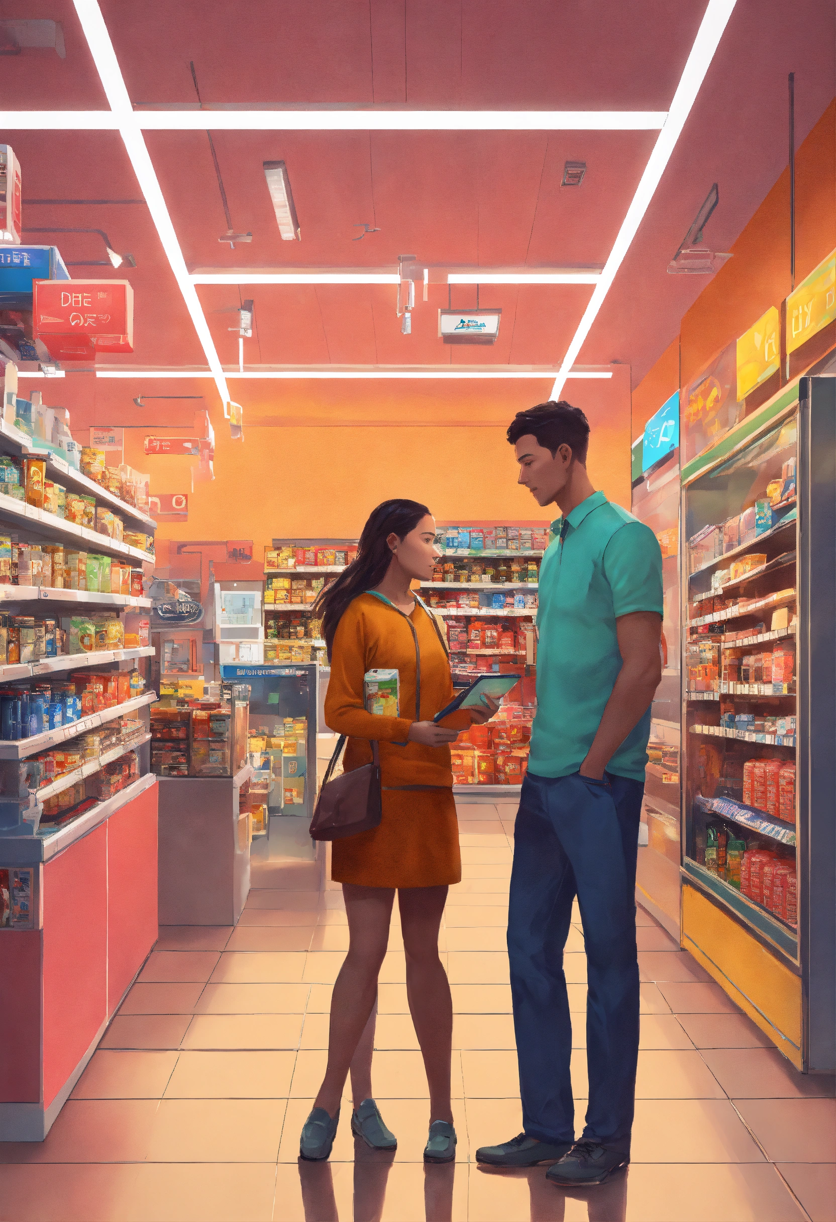 Photo of a man and a woman in a convenience store, lots of technology, data, ai, and customer care in a rather realistic style
